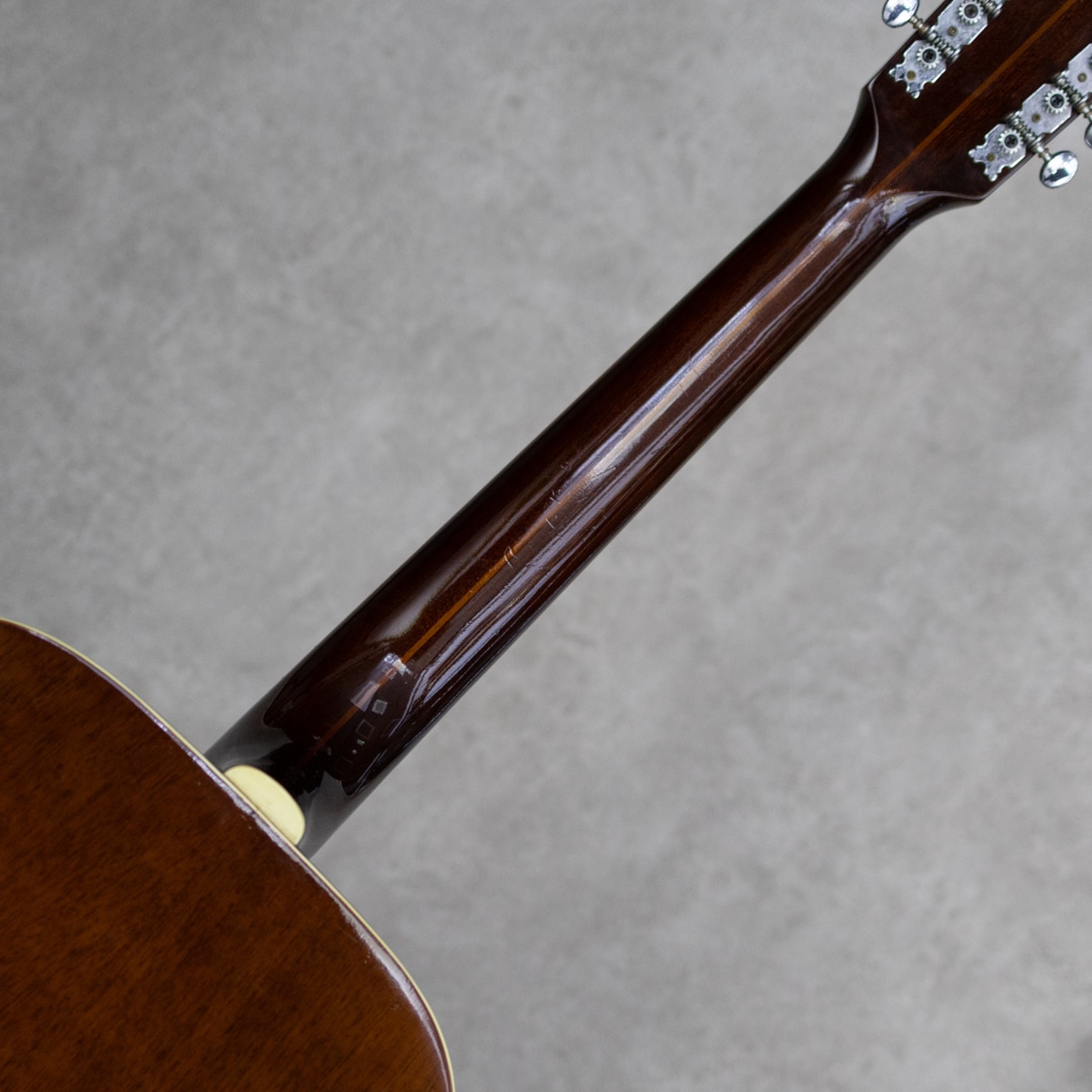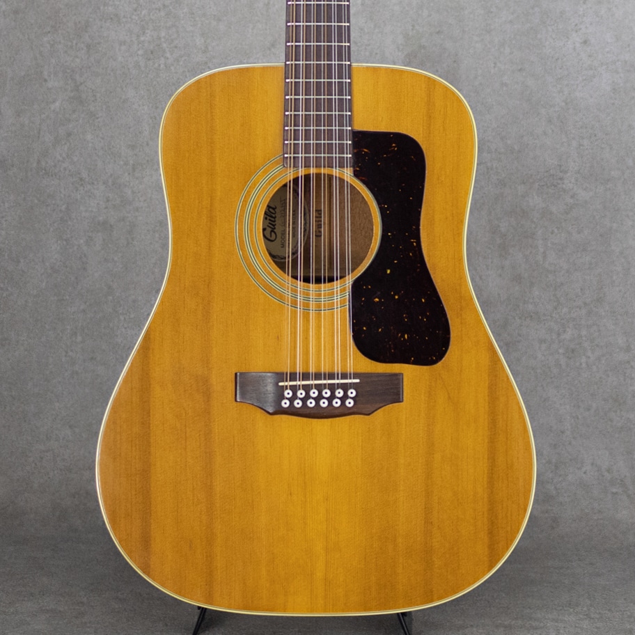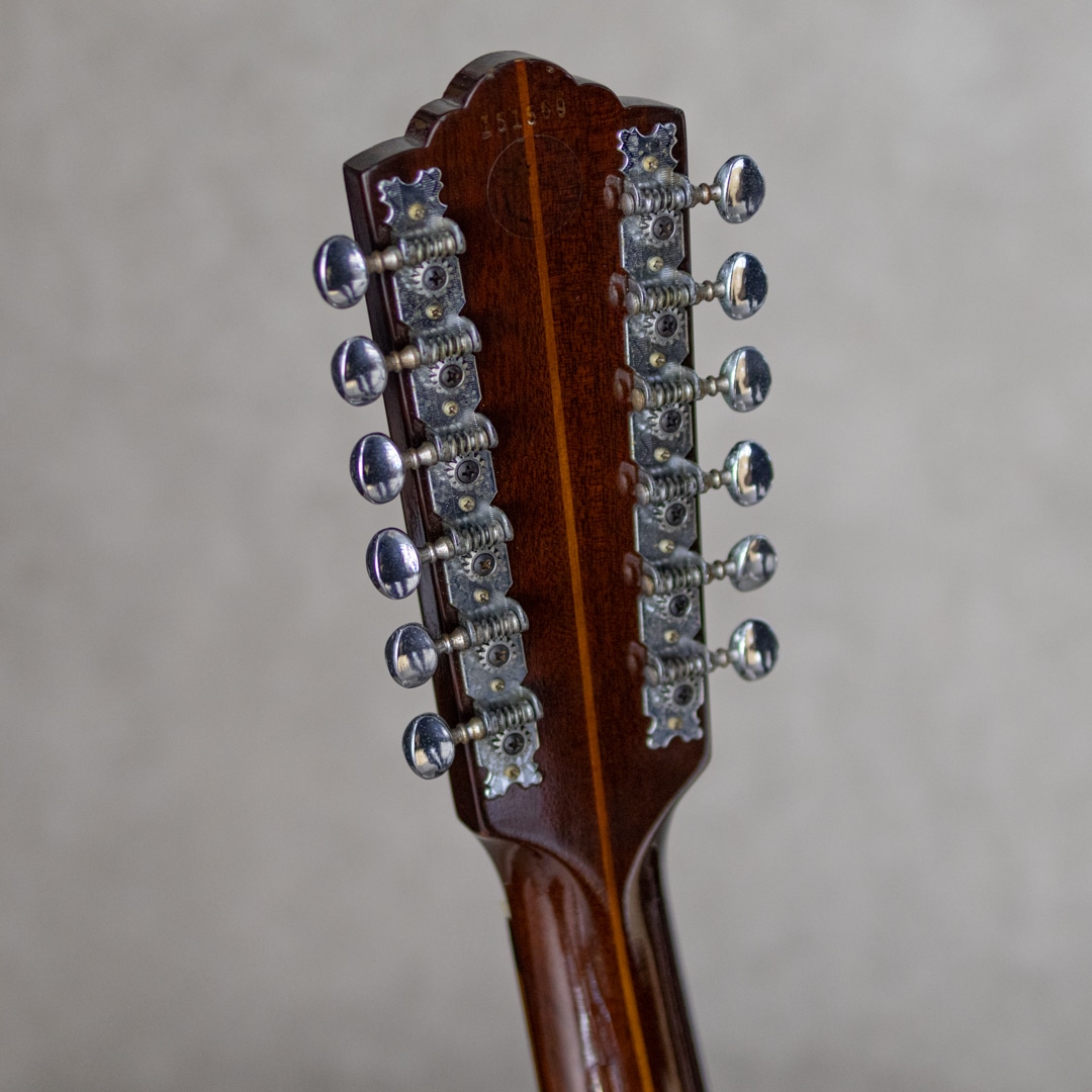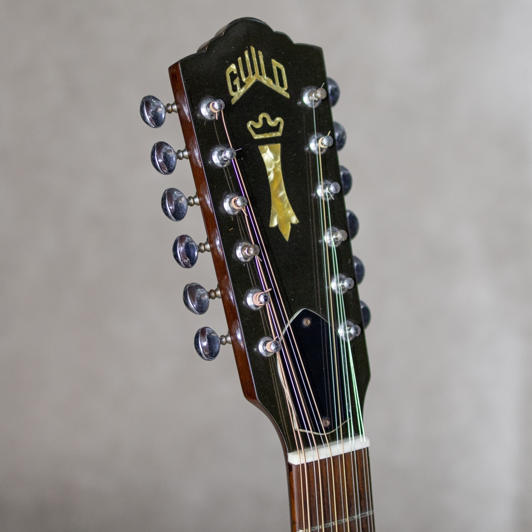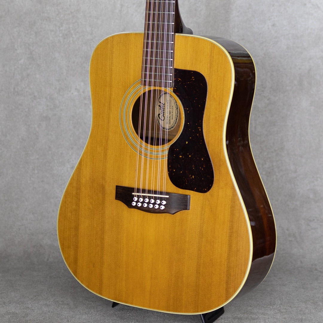 Paul SimonやJohn Denver、国内では井上陽水氏、南こうせつ氏、松山千春氏など数多のミュージシャン達が愛した"Guild (ギルド)"。古くは"Martin"、"Gibson"と並び御三家ブランドとして名を馳せていたアメリカを象徴するブランドのひとつ。本器はWesterlyファクトリー期の"G-212"。演奏性も良好な1975年製USED品。かつて"12弦と言えばギルド"と言われるほど、特に12弦モデルが高い評価を得ており、内外のミュージシャンに愛用されています。スプルーストップ、マホガニーサイド&バック、3pcマホガニーネック、ローズウッド指板&ブリッジ、6-オン-プレートペグ、べっ甲柄セルロイドピックガード。ギルドのドレッドノウトモデルならではのゴツンとした骨太なアタック感に12弦特有の広がりは期待を裏切らないサウンド。ネックコンディションも上々で弾きやすい状態です。ピックガード内側のマルチリングロゼッタの割れこそ見られますが木部のクラックはありません。ネック低音側9-10fサイドに塗装の修正がございますが丁寧な仕事で違和感は感じません。年式からすればキズなど使用感は少なく比較的キレイなコンディションをキープしています。是非お試し下さい。ハードケース付属。