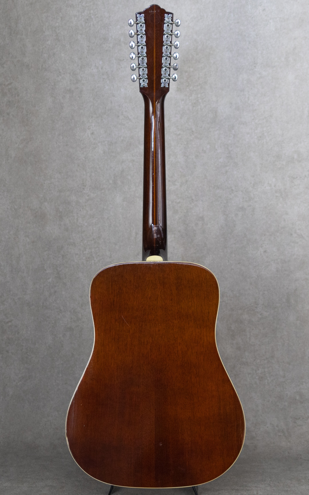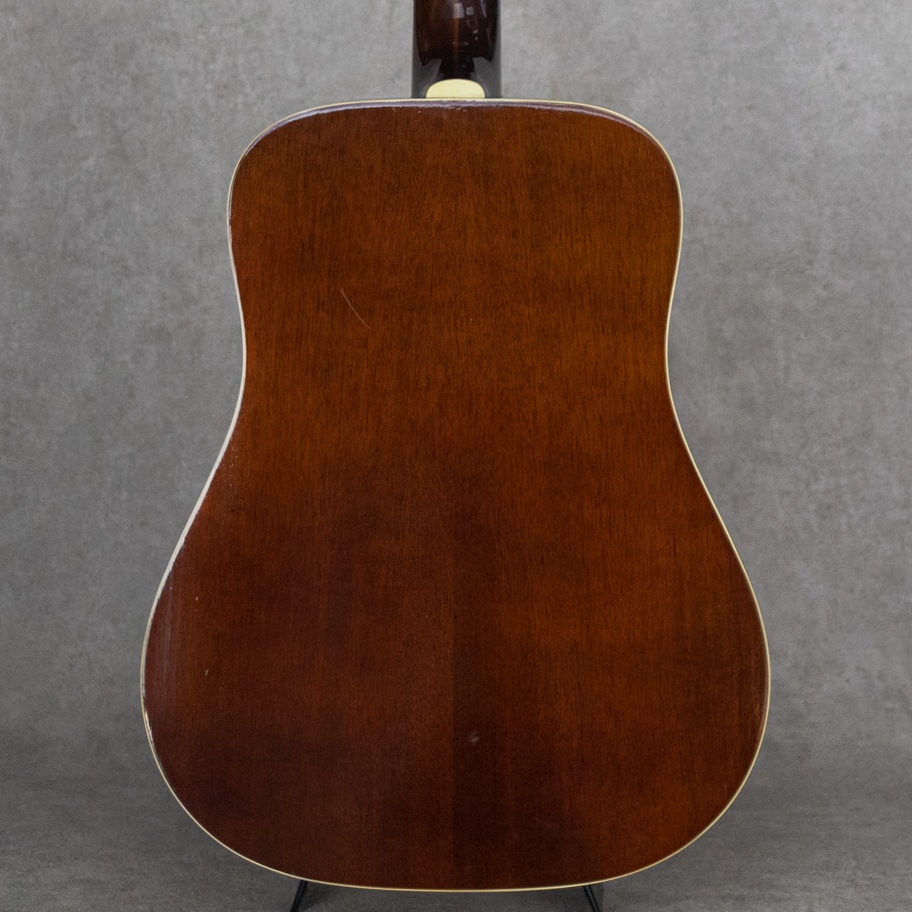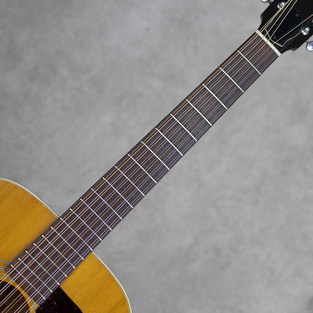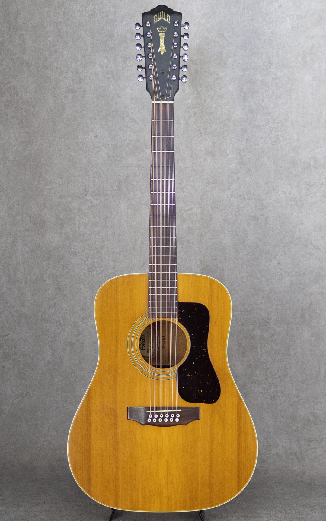 Paul SimonやJohn Denver、国内では井上陽水氏、南こうせつ氏、松山千春氏など数多のミュージシャン達が愛した"Guild (ギルド)"。古くは"Martin"、"Gibson"と並び御三家ブランドとして名を馳せていたアメリカを象徴するブランドのひとつ。本器はWesterlyファクトリー期の"G-212"。演奏性も良好な1975年製USED品。かつて"12弦と言えばギルド"と言われるほど、特に12弦モデルが高い評価を得ており、内外のミュージシャンに愛用されています。スプルーストップ、マホガニーサイド&バック、3pcマホガニーネック、ローズウッド指板&ブリッジ、6-オン-プレートペグ、べっ甲柄セルロイドピックガード。ギルドのドレッドノウトモデルならではのゴツンとした骨太なアタック感に12弦特有の広がりは期待を裏切らないサウンド。ネックコンディションも上々で弾きやすい状態です。ピックガード内側のマルチリングロゼッタの割れこそ見られますが木部のクラックはありません。ネック低音側9-10fサイドに塗装の修正がございますが丁寧な仕事で違和感は感じません。年式からすればキズなど使用感は少なく比較的キレイなコンディションをキープしています。是非お試し下さい。ハードケース付属。