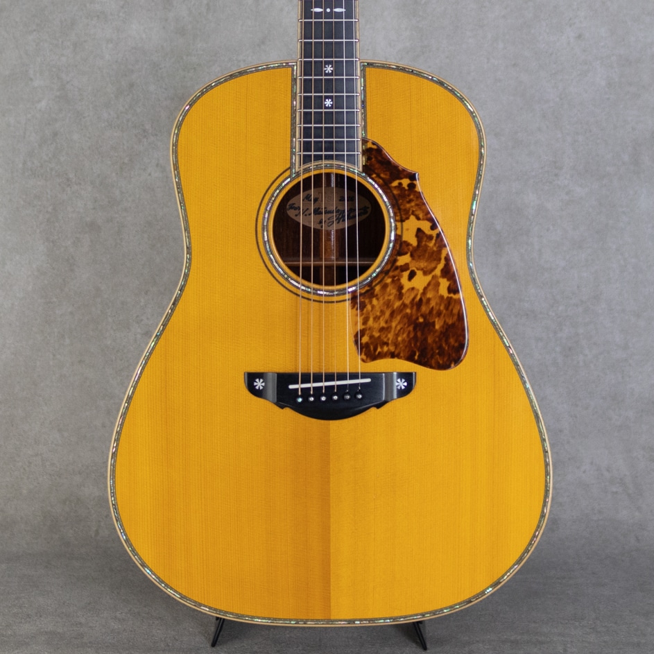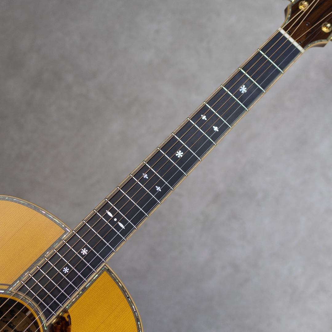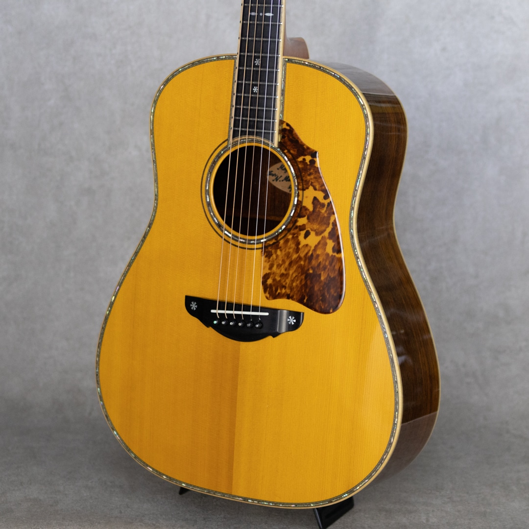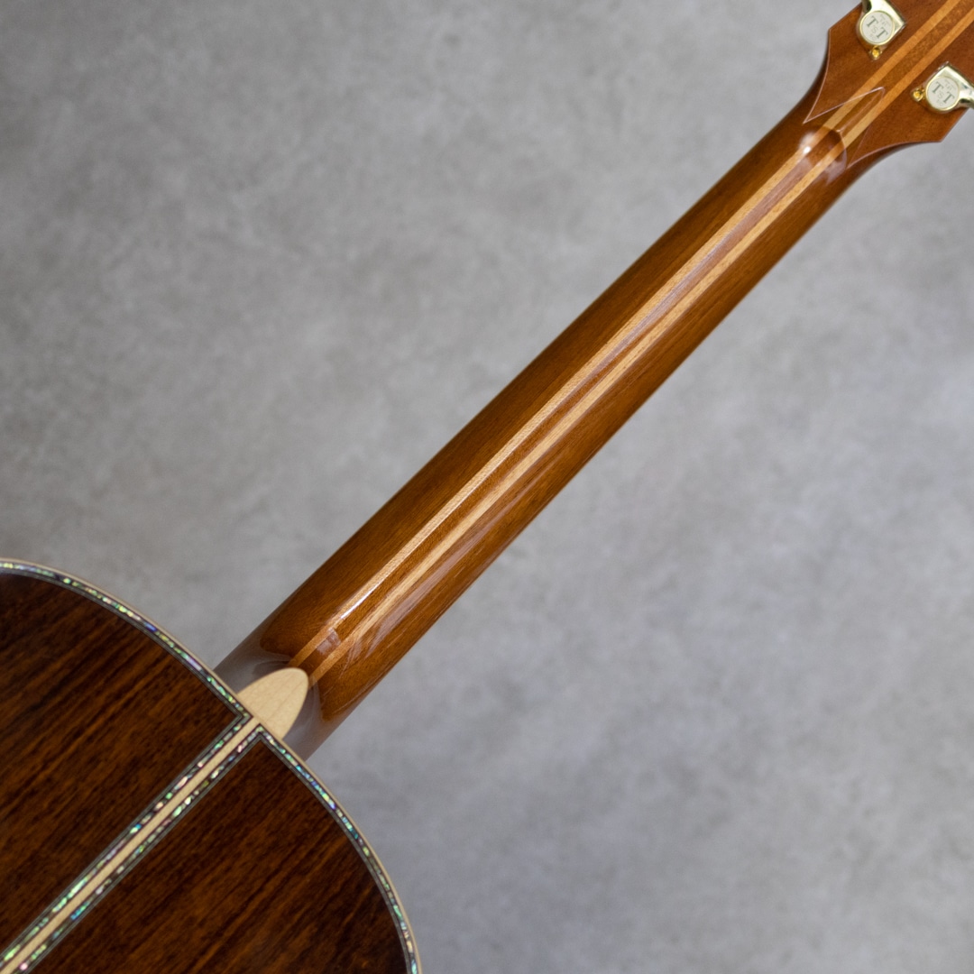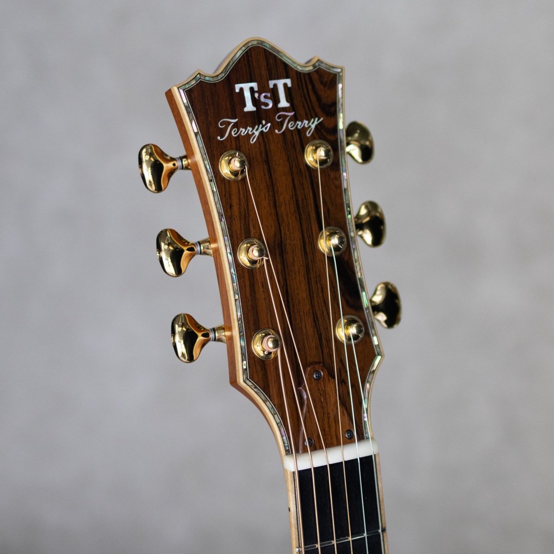数々の楽器を手がけてきた国内屈指のギターデザイナー、テリー中本氏が1990年に立ち上げた"テリーズ・テリー"。国内外のトップアーティストらをも唸らせる完成度の高さを誇る、日本国内ではもっともカリスマ性のあるメーカーのひとつ。海外製ギターにはない日本製独自のサウンドやキャラクターを持ち、また世界でもトップクラスの作り込みの高さと仕上げの美しさを持つ日本が誇るジャパニーズブランドです。本器は、ホンジュラスRWをS&Bに採用したカスタムモデル”TJ-100 Custom”。2016年製USED品。真っ直ぐに杢目が揃った極上スプルーストップ、淡いワイルドな追柾目杢が美事なホンdジュラスローズウッドサイド&バック、マホガニー&メイプル積層ネック、エボニー指板&ブリッジ、スノウフレイクス&キャッツアイアバロンインレイ、ボディトップ&バックアバロンインレイ、指板サイドアバロントリムインレイ、アバロンロゼッタ、スノウフレイクアバロンブリッジインレイ、ハカランダ天神板、ゴトー510Zゴールドペグ、本べっ甲ピックガード、メイプルバインディング、ボディ内セラック塗装、ノンスキャロップド・Xスブレイシング。テリー中本氏が創り上げた国産最高峰T'sTのカスタムモデル。骨太でガツンと芯のあるサウンド。爪弾けばキラビやかに響き渡る、しっかりと叩けばサスティンの聞いたまとまりのある響きが轟く1本。しっかりと使われてきた本器。いくらかの擦り傷・小傷や打痕は否めませんが、大きく損なう割れなどはなく良好。ネック周りも良好で弾きやすいアクションをサドルマージンをしっかりと残しながら保っています。過去にPU取付履歴が伺え、サドル下の配線穴痕、エンド部の12mm加工痕が見られます。現在エンドには12mmのコンバージョンウッドピンが装着されています。なかなか出回ることのない本家T’sT。現在はオーダーウェイティングも長く、入荷後も引く手数多。。このご機会、お見逃し内容要チェックください。オリジナルハードケース付属