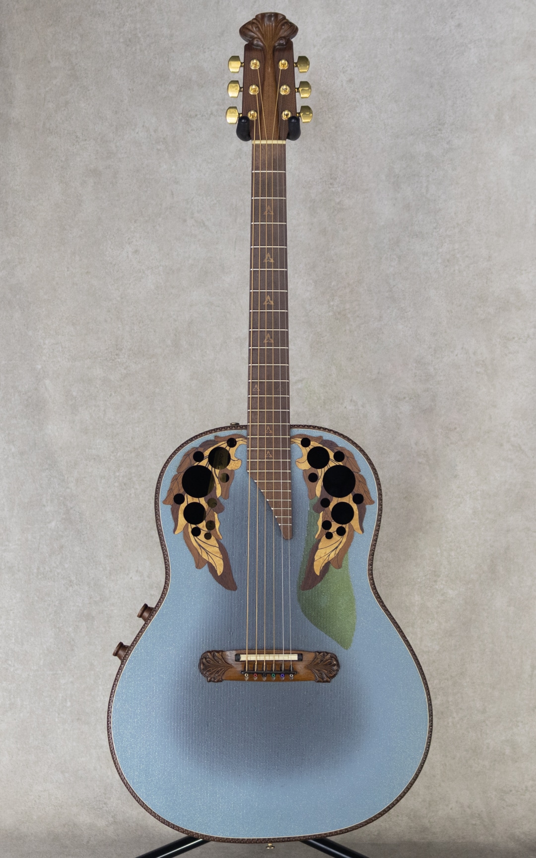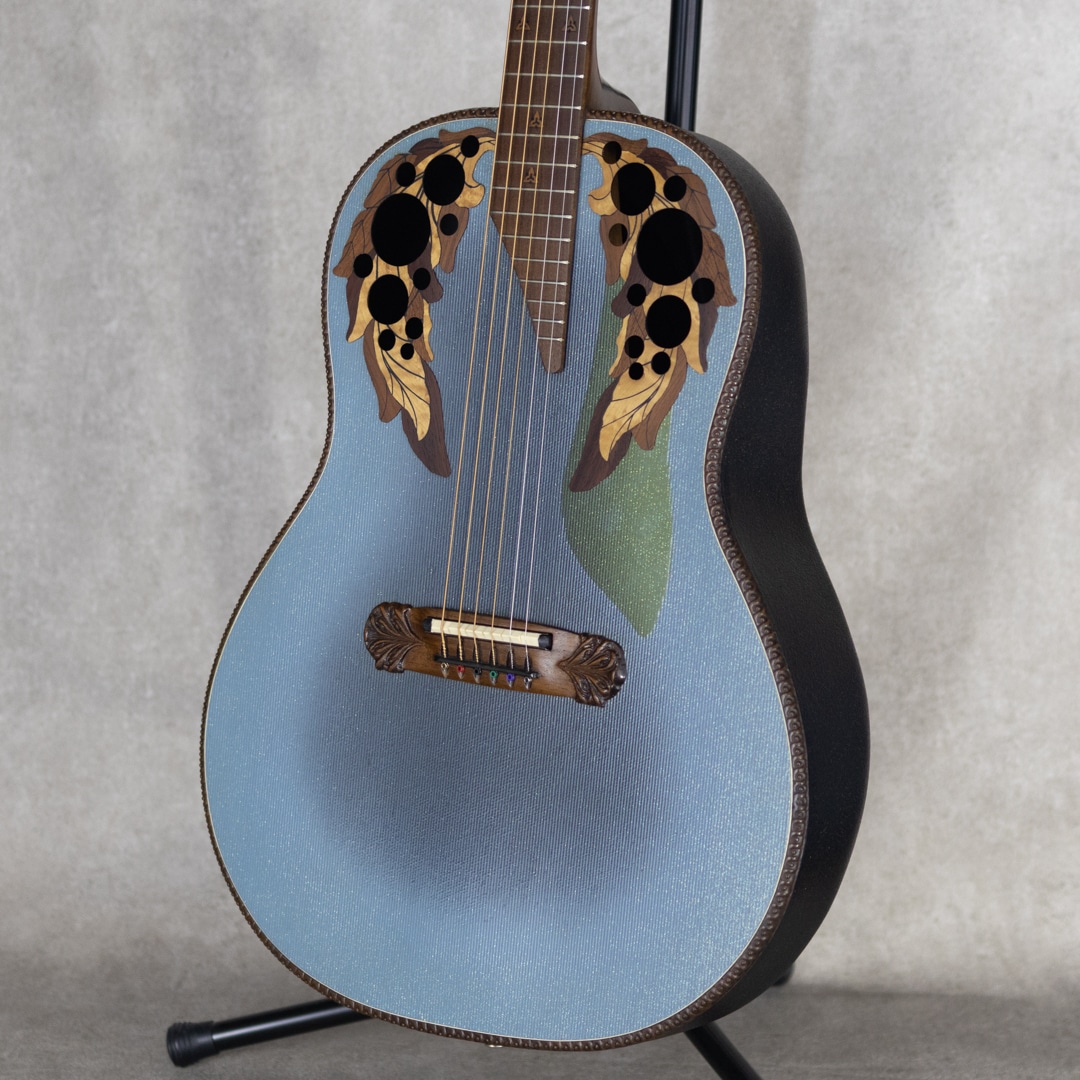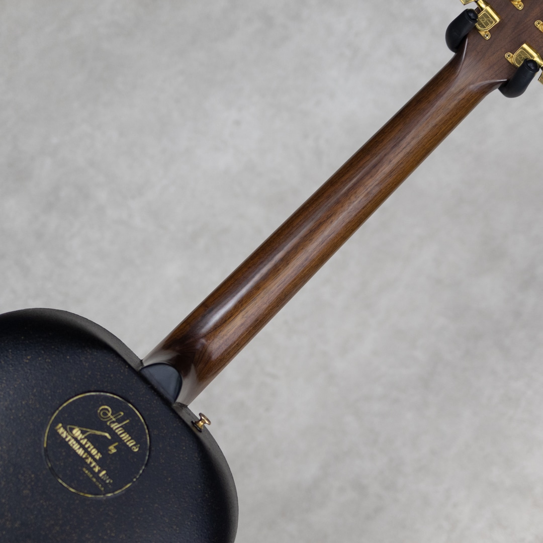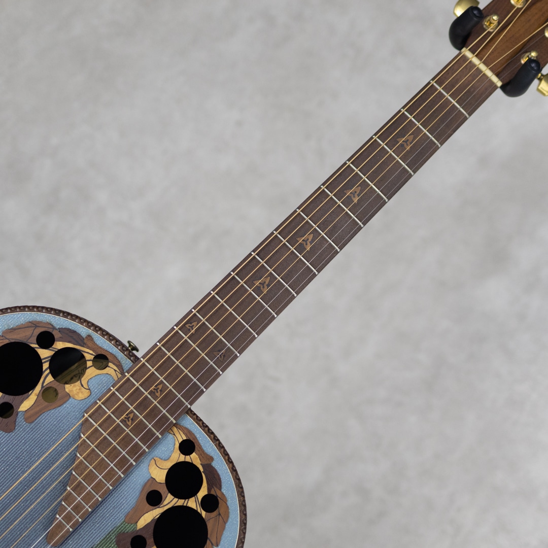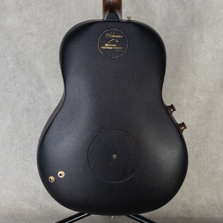 1966年、ヘリコプターの製造会社の社長であり、有名なギタリストでもあったチャールズ・カーマンによって設立されたオベーションは航空機の技術をギターに活かしたエレクトリックアコースティックギターを発売。保守的なミュージシャンにも受け入れられ、エレアコの代名詞的ブランドへと成長します。オべーション創始者チャーリー・カマンの生音へのさらなる探究心から1976年に誕生したアダマス。1976-77年にプロトタイプを多く生産し、1978年頃から今も残るスタイルのモデルを製造してきました。本器はブルーカラーの"1687-8”。2ノブ/ステレオアウトの初期仕様。1982年製極上USED品。ウッドトップの約3分の1の薄さでも十分な強度を得られるアダマス独自のカーボングラファイトトップ、リラコード樹脂ディープボウル、ウォルナットネック、ウォルナット指板&ブリッジ、ゴールドシャーラーペグ、ウッド指板インレイ、マルチプルエポーレットサウンドホール、ステレオアウト仕様。ウッドの指板ポジションやエポーレット、艶艶したヘッドと駒の彫刻等、この頃ならではともいえる精巧な仕上げの本器。ディープボウルのアダマスならではの奥深いサウンド。歯切れが良く、コンプがかったレスポンスは弾きやすくアグレッシブにプレイできます。メロウなプレイからファンキーなカッティング、ダイナミックなストロークまで、あらゆるプレイスタイルを網羅するバーサタイルなスタイルは、多くのプレイヤーによってそのサウンドを残してきました。シンプルな回路からは現行品には無い、線の太いラインサウンドも魅力です。とてもコンディションが良い本器。トップ・ボウルバックのラメも多く美しい佇まいでゴージャスな外観。トップの変形もほとんどなく、またエポーレットウッドの剥がれも見られません。目立つ外傷も見られず、ネック周りも良好で弾きやすいアクションをしっかりと保っています。エクセレントコンディションの初期ものアダマス。コレクターズピースの1本です。オリジナルブラウンカラーハードケース付属