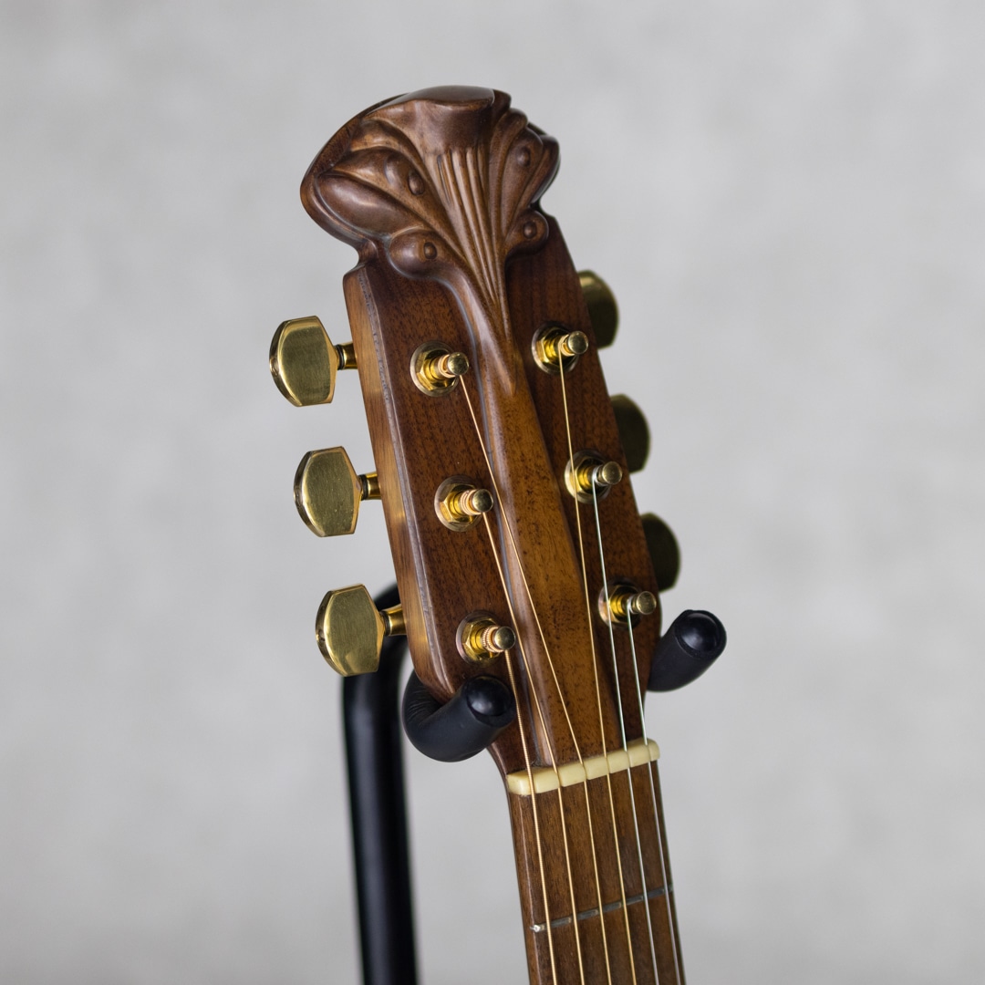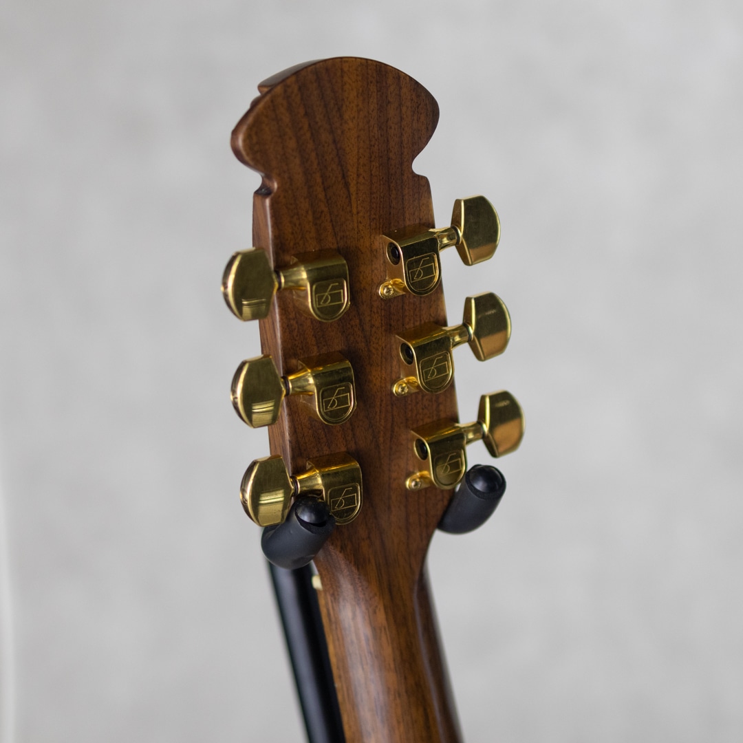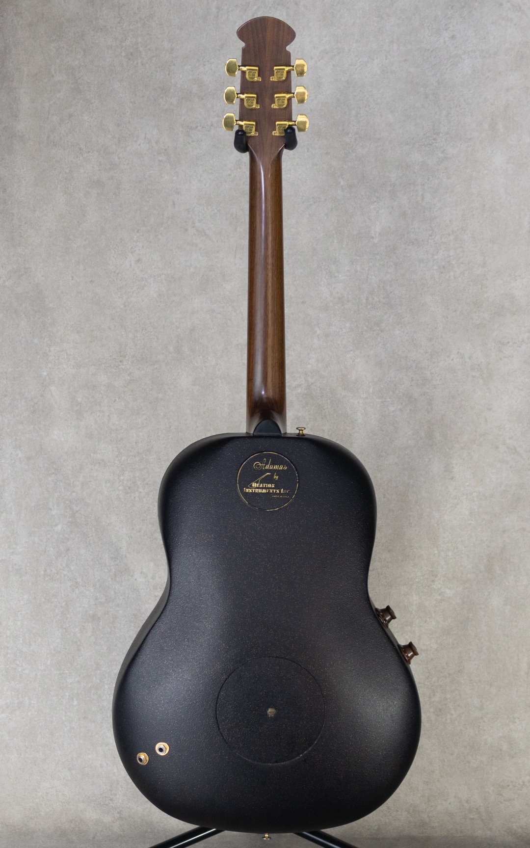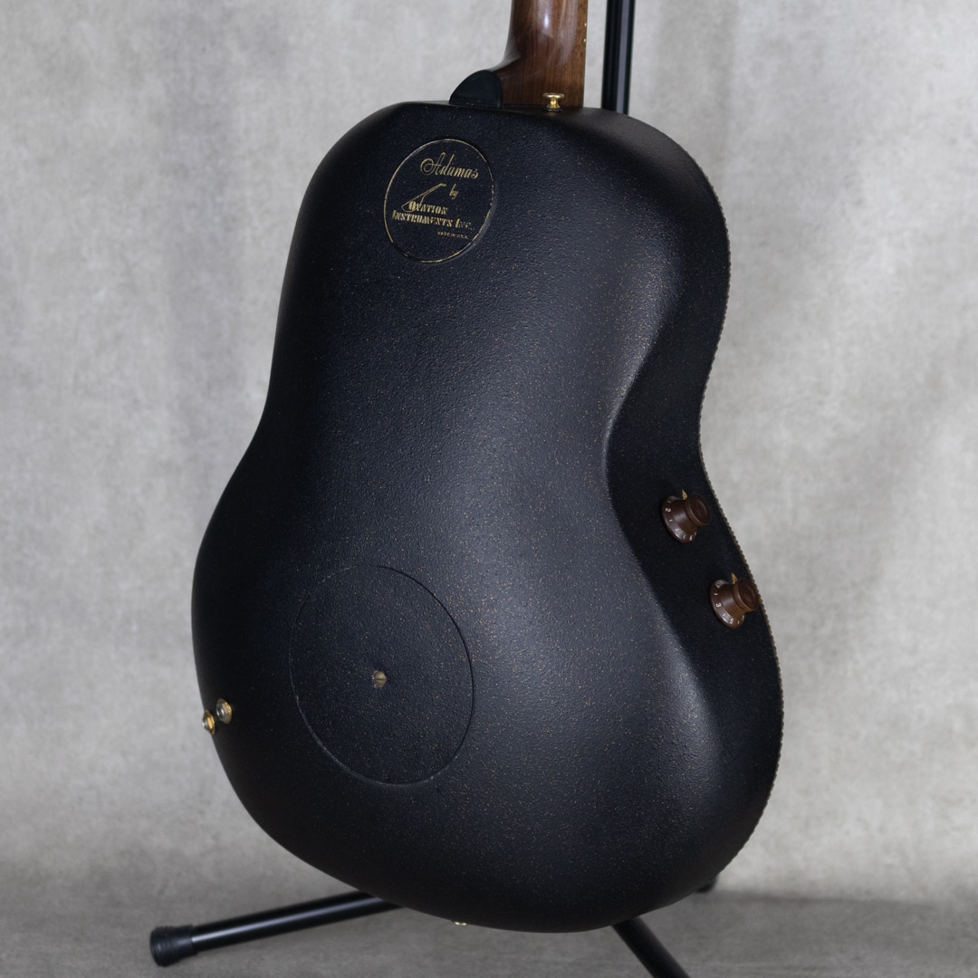 1966年、ヘリコプターの製造会社の社長であり、有名なギタリストでもあったチャールズ・カーマンによって設立されたオベーションは航空機の技術をギターに活かしたエレクトリックアコースティックギターを発売。保守的なミュージシャンにも受け入れられ、エレアコの代名詞的ブランドへと成長します。オべーション創始者チャーリー・カマンの生音へのさらなる探究心から1976年に誕生したアダマス。1976-77年にプロトタイプを多く生産し、1978年頃から今も残るスタイルのモデルを製造してきました。本器はブルーカラーの"1687-8”。2ノブ/ステレオアウトの初期仕様。1982年製極上USED品。ウッドトップの約3分の1の薄さでも十分な強度を得られるアダマス独自のカーボングラファイトトップ、リラコード樹脂ディープボウル、ウォルナットネック、ウォルナット指板&ブリッジ、ゴールドシャーラーペグ、ウッド指板インレイ、マルチプルエポーレットサウンドホール、ステレオアウト仕様。ウッドの指板ポジションやエポーレット、艶艶したヘッドと駒の彫刻等、この頃ならではともいえる精巧な仕上げの本器。ディープボウルのアダマスならではの奥深いサウンド。歯切れが良く、コンプがかったレスポンスは弾きやすくアグレッシブにプレイできます。メロウなプレイからファンキーなカッティング、ダイナミックなストロークまで、あらゆるプレイスタイルを網羅するバーサタイルなスタイルは、多くのプレイヤーによってそのサウンドを残してきました。シンプルな回路からは現行品には無い、線の太いラインサウンドも魅力です。とてもコンディションが良い本器。トップ・ボウルバックのラメも多く美しい佇まいでゴージャスな外観。トップの変形もほとんどなく、またエポーレットウッドの剥がれも見られません。目立つ外傷も見られず、ネック周りも良好で弾きやすいアクションをしっかりと保っています。エクセレントコンディションの初期ものアダマス。コレクターズピースの1本です。オリジナルブラウンカラーハードケース付属