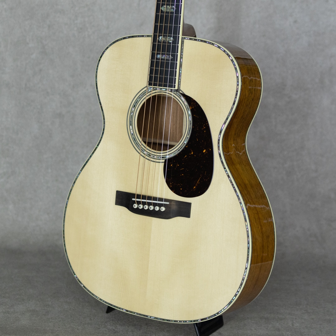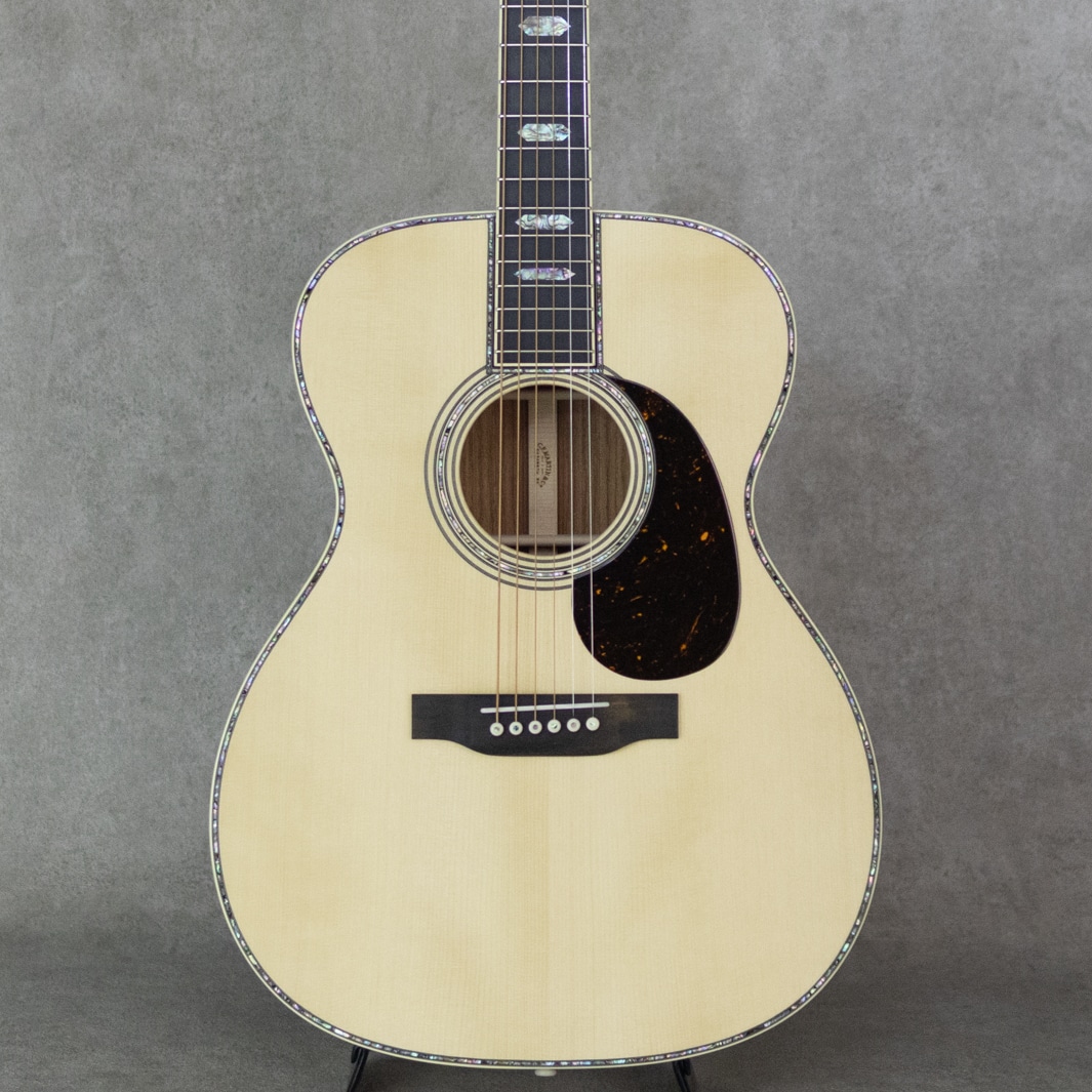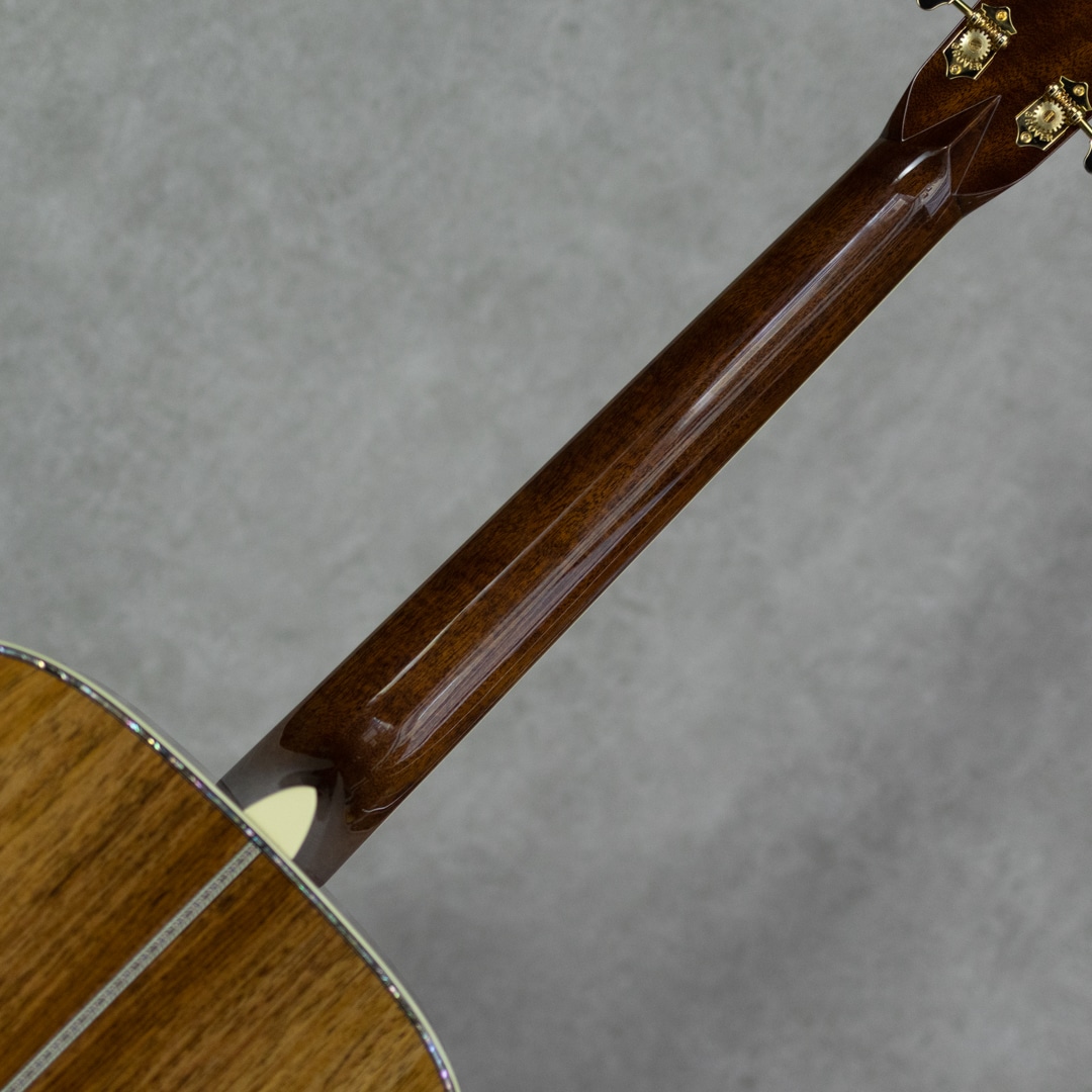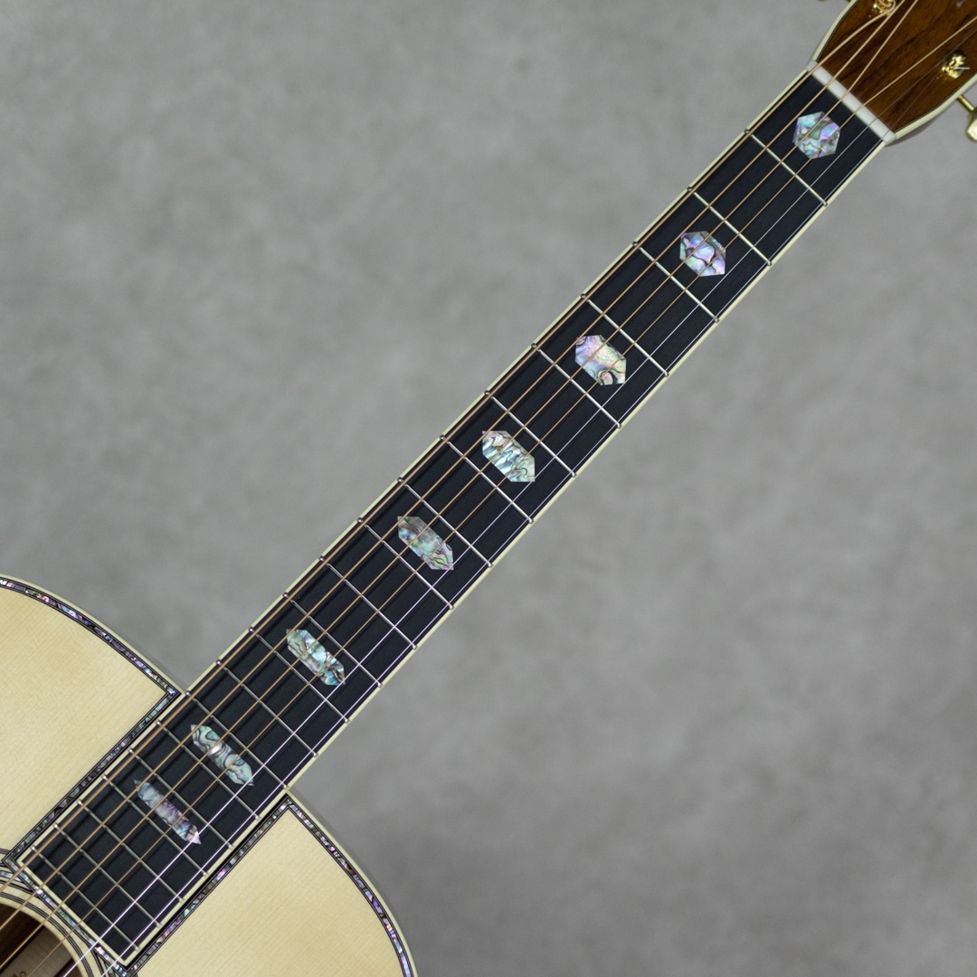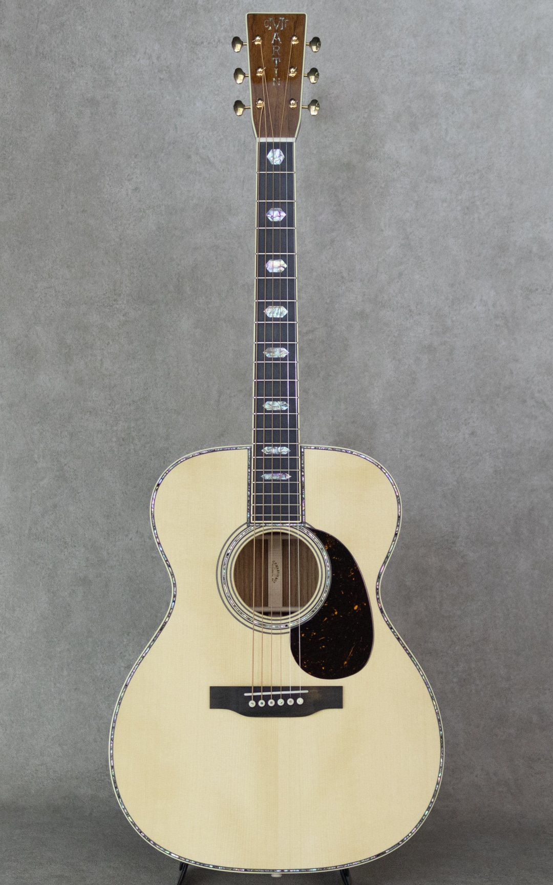 Martin社において"D-45"はすべての面において最高の材料と技術で作られる最高峰のモデル。"45"という番号は最高の材料と技術を使って作ったという証。本器は、極上マテリアルを使用したカスタムモデル、”CTM OOO-45 Premium Adirondack Spruce / Guatemalan Rosewood”。2023年製極上USED品。目幅の狭い真っ直ぐな杢目のプレミアムアディロンダックスプルーストップ、明るい色味の柾目で取られたグアテマラローズウッドサイド&バック、モディファイドロウオーバルネックシェイプ、ブラックエボニー指板&ブリッジ、オープンバックバタービンノブペグ、ベッコウ柄ピックガード、セレクトアバロンロゼッタ&トリム、アンティークホワイトバインディング&ウッドパーフリング、セレクトアバロンヘキサゴン指板インレイ、モザイクバックストリップ、GEスタイルバーチカルヘッドロゴインレイ、2wayアジャスタブルロッド、スキャロップドXブレイシング。カスタムショップの技術を凝らした作り込みがなされており、しっかりとしたボリューム感のある倍音と、太く立ち上がる音像を持ち合わせる1本。フィンガータッチでも奥深く重厚に響き渡り、澄んだ高音と甘い倍音が折り重なるまさに”45”サウンド。"45”らしい華やかさを持ちながら、伸びやかでサスティナブルな響きを放ちます。定番ながら端正で美しい外観、これぞマーチンの魅力満載の1本に仕上がっている1本です。大きく目立つ傷はおろか、使用感さえ伺いにくい極上コンディション。ネックまわりもパーフェクト、しっかりとサドルマージンを残し弾きやすいアクションです。小細工なしの極上サウンドと安定感のある外観。弾いてよし、眺めてよし、愛でてよし。憧れの”45”モデルにふさわしい極上の1本です。お見逃しなく。。オリジナルハードケース付属