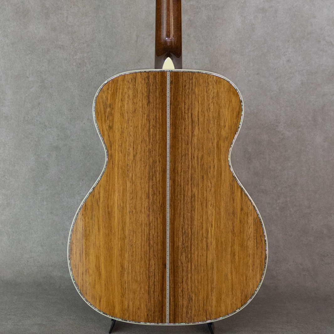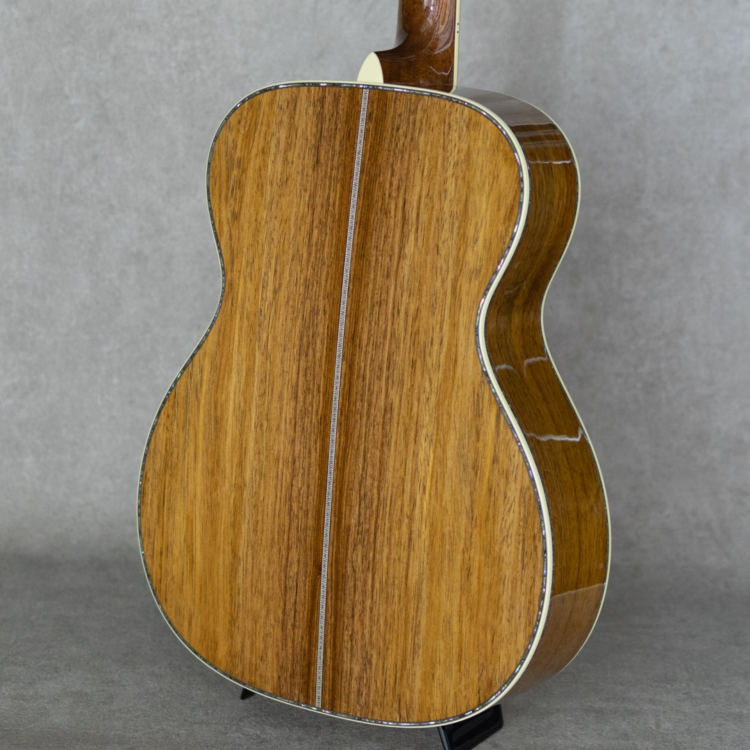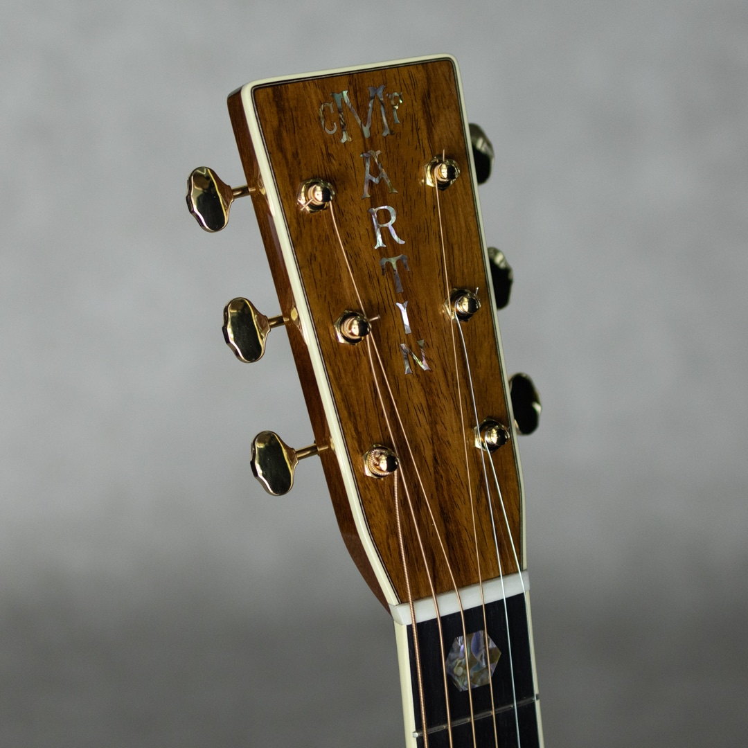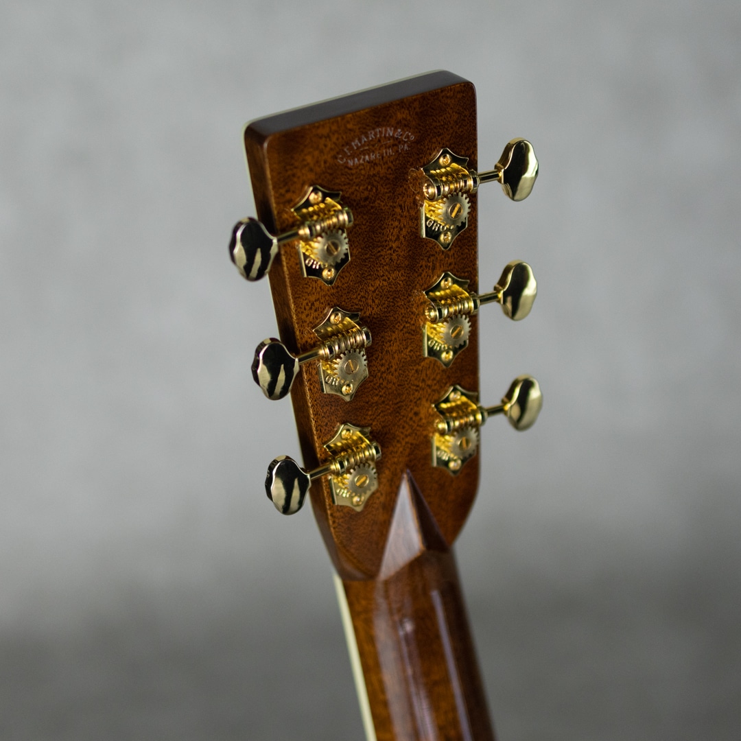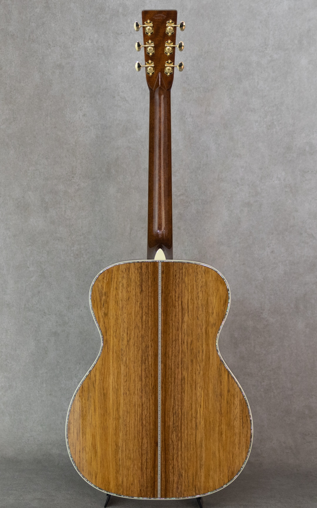 Martin社において"D-45"はすべての面において最高の材料と技術で作られる最高峰のモデル。"45"という番号は最高の材料と技術を使って作ったという証。本器は、極上マテリアルを使用したカスタムモデル、”CTM OOO-45 Premium Adirondack Spruce / Guatemalan Rosewood”。2023年製極上USED品。目幅の狭い真っ直ぐな杢目のプレミアムアディロンダックスプルーストップ、明るい色味の柾目で取られたグアテマラローズウッドサイド&バック、モディファイドロウオーバルネックシェイプ、ブラックエボニー指板&ブリッジ、オープンバックバタービンノブペグ、ベッコウ柄ピックガード、セレクトアバロンロゼッタ&トリム、アンティークホワイトバインディング&ウッドパーフリング、セレクトアバロンヘキサゴン指板インレイ、モザイクバックストリップ、GEスタイルバーチカルヘッドロゴインレイ、2wayアジャスタブルロッド、スキャロップドXブレイシング。カスタムショップの技術を凝らした作り込みがなされており、しっかりとしたボリューム感のある倍音と、太く立ち上がる音像を持ち合わせる1本。フィンガータッチでも奥深く重厚に響き渡り、澄んだ高音と甘い倍音が折り重なるまさに”45”サウンド。"45”らしい華やかさを持ちながら、伸びやかでサスティナブルな響きを放ちます。定番ながら端正で美しい外観、これぞマーチンの魅力満載の1本に仕上がっている1本です。大きく目立つ傷はおろか、使用感さえ伺いにくい極上コンディション。ネックまわりもパーフェクト、しっかりとサドルマージンを残し弾きやすいアクションです。小細工なしの極上サウンドと安定感のある外観。弾いてよし、眺めてよし、愛でてよし。憧れの”45”モデルにふさわしい極上の1本です。お見逃しなく。。オリジナルハードケース付属