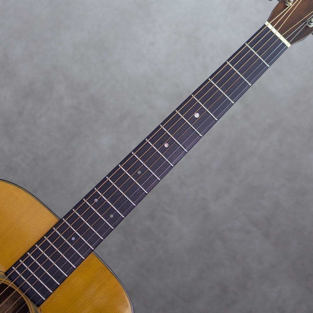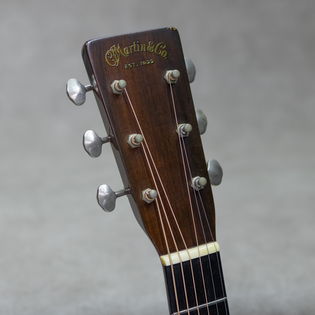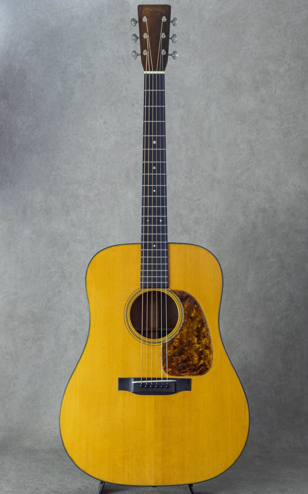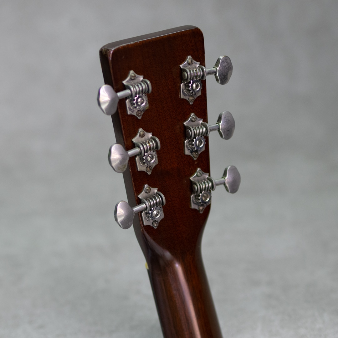 マホガニーボディのドレッドノウトモデル、Martin”D-18”。”D-28”と同じ歴史を持ち、1934年に14fジョイントモデルとして進化し、マホガニーモデルのワールドスタンダードとして今なお君臨し続けるモデル。本器は、オリジナルスキャロップの1939年製Vintage品。フォワードシフテッドXブレイシングからリアワードXブレイシングに変更され、44.5mmのワイドネックから42.9mmのナロウネックへと移行された直後の1本です。アディロンダックスプルーストップ、マホガニーサイド&バック、マホガニーネック、エボニー指板&ブリッジ、ハカランダ天神板、グローバーG98バタービーンペグ、指板ドットインレイ、べっ甲柄セルロイドバインディング、Tバーネックトラスロッド、リアワードスキャロップドXブレイシング。プリウォースキャロップならではのガラン・ドスンと響くスキャロップドレッドサウンド。ドライでいながら、しっかりと満ちた倍音が溢れるサウンドで、質量感と迫力のある1本。経年感はしっかりと味わえながらもくたびれた印象を受けにくく、ピックプレイはもちろん、フィンガーでもサスティンの効いた粒立ちの良いサウンドを轟かせてくれます。しっかりと弾かれながら良い経年を経た本器。全体的なオーバースプレイが見られますが、少し古い時期に施されたと思われ、重たい印象やフレッシュな印象は受けません。外観もウェザーチェックが出ており、貫禄十分です。ピックガードがTOR-TIS製ガードに交換されており、PGまわりのマーチンクラック補修も見られますが、しっかりと補修されており懸念は覚えません。ブリッジプレートは弦玉負けの補修がされています。いくらかの補修は見られますが、経年を考えると手入れしながら丁寧に扱われてきた印象を受ける本器。ネックまわりも良好で、弾きやすいアクションをしっかりとサドルマージンを残しながら保ってくれいています。年々価値も価格も高騰し続けるMartinプリウォードレッド。しかしながら、この迫力と音の密度、そして音ヌケを体感すると納得せざるを得ないオリジナルスキャロップならではのサウンド。是非、このご機会にお手元でご体感ください。ハードケース付属。その他修理履歴など詳細はお問い合わせください。