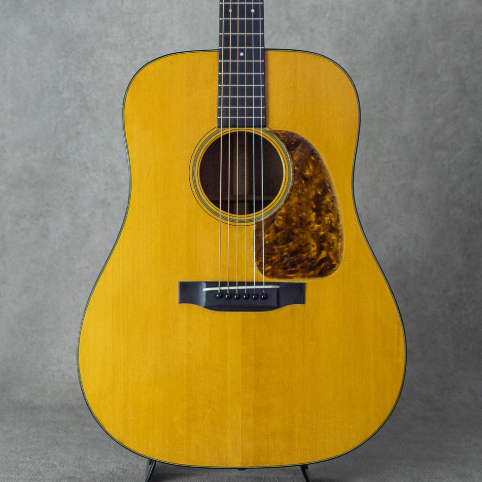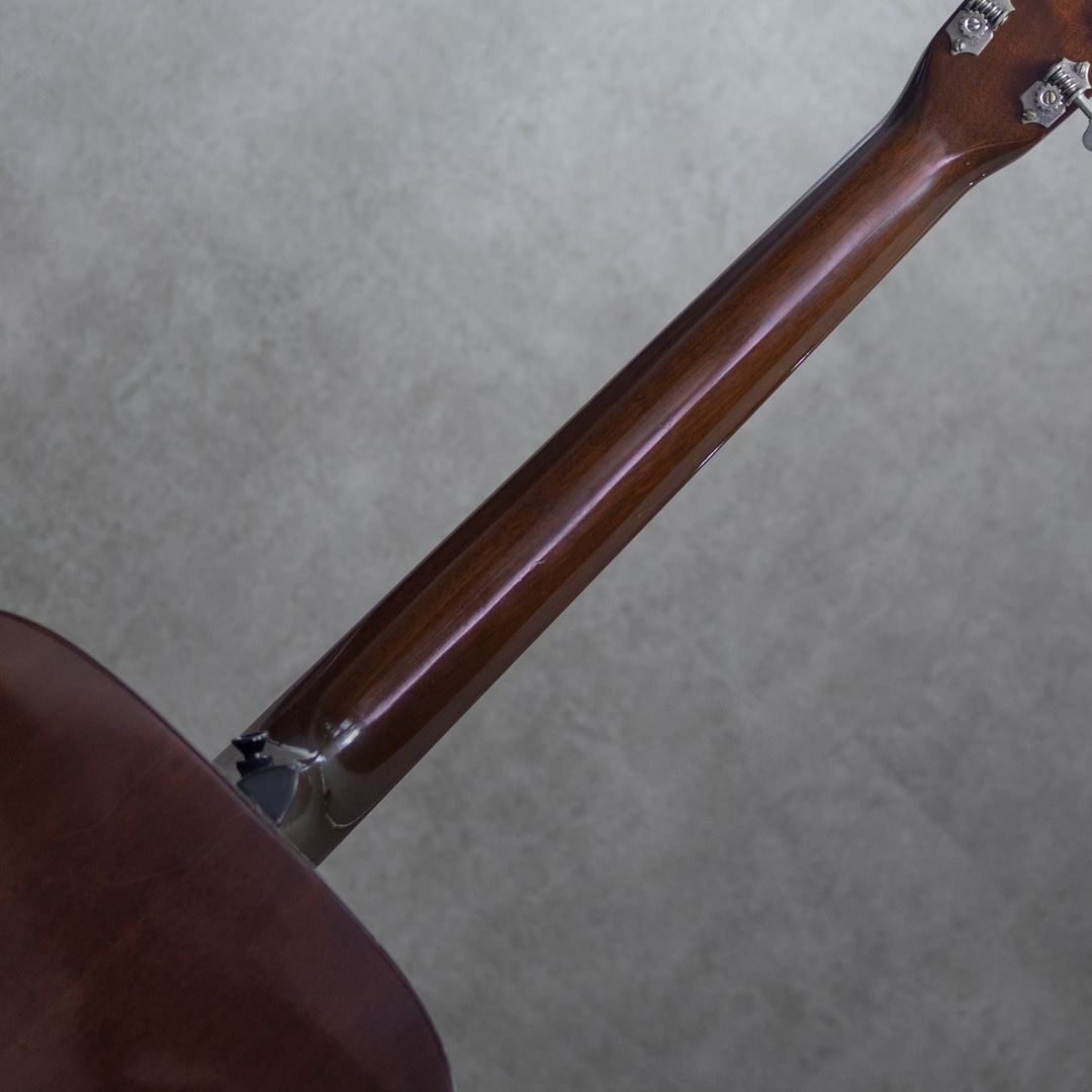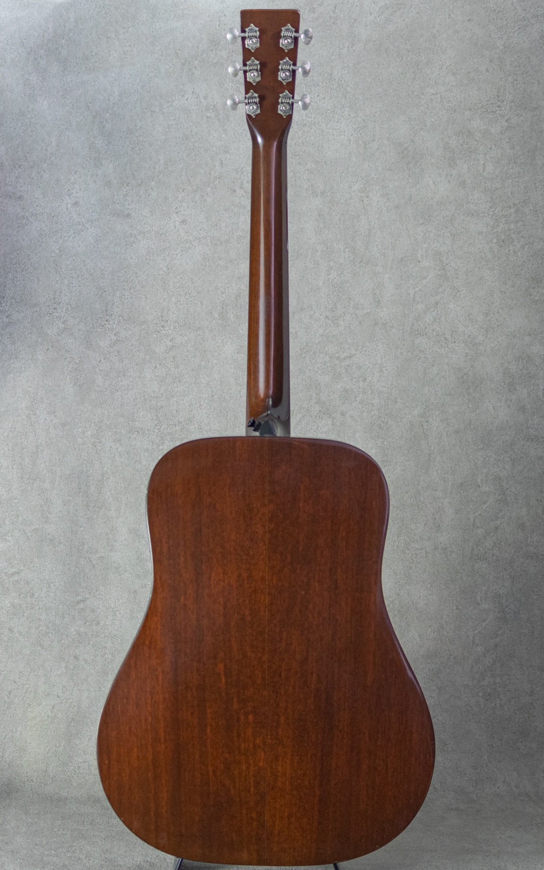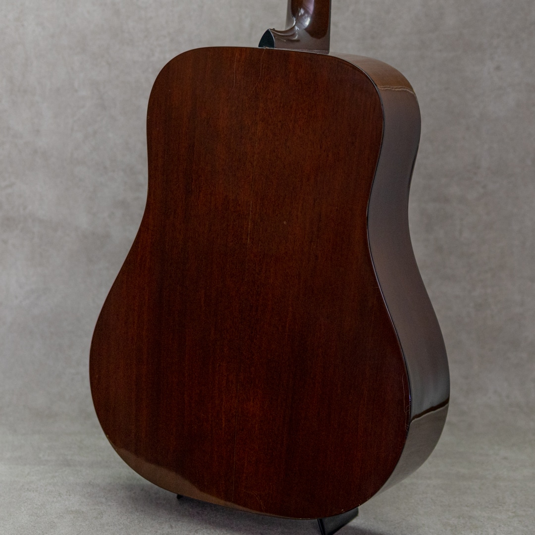 マホガニーボディのドレッドノウトモデル、Martin”D-18”。”D-28”と同じ歴史を持ち、1934年に14fジョイントモデルとして進化し、マホガニーモデルのワールドスタンダードとして今なお君臨し続けるモデル。本器は、オリジナルスキャロップの1939年製Vintage品。フォワードシフテッドXブレイシングからリアワードXブレイシングに変更され、44.5mmのワイドネックから42.9mmのナロウネックへと移行された直後の1本です。アディロンダックスプルーストップ、マホガニーサイド&バック、マホガニーネック、エボニー指板&ブリッジ、ハカランダ天神板、グローバーG98バタービーンペグ、指板ドットインレイ、べっ甲柄セルロイドバインディング、Tバーネックトラスロッド、リアワードスキャロップドXブレイシング。プリウォースキャロップならではのガラン・ドスンと響くスキャロップドレッドサウンド。ドライでいながら、しっかりと満ちた倍音が溢れるサウンドで、質量感と迫力のある1本。経年感はしっかりと味わえながらもくたびれた印象を受けにくく、ピックプレイはもちろん、フィンガーでもサスティンの効いた粒立ちの良いサウンドを轟かせてくれます。しっかりと弾かれながら良い経年を経た本器。全体的なオーバースプレイが見られますが、少し古い時期に施されたと思われ、重たい印象やフレッシュな印象は受けません。外観もウェザーチェックが出ており、貫禄十分です。ピックガードがTOR-TIS製ガードに交換されており、PGまわりのマーチンクラック補修も見られますが、しっかりと補修されており懸念は覚えません。ブリッジプレートは弦玉負けの補修がされています。いくらかの補修は見られますが、経年を考えると手入れしながら丁寧に扱われてきた印象を受ける本器。ネックまわりも良好で、弾きやすいアクションをしっかりとサドルマージンを残しながら保ってくれいています。年々価値も価格も高騰し続けるMartinプリウォードレッド。しかしながら、この迫力と音の密度、そして音ヌケを体感すると納得せざるを得ないオリジナルスキャロップならではのサウンド。是非、このご機会にお手元でご体感ください。ハードケース付属。その他修理履歴など詳細はお問い合わせください。