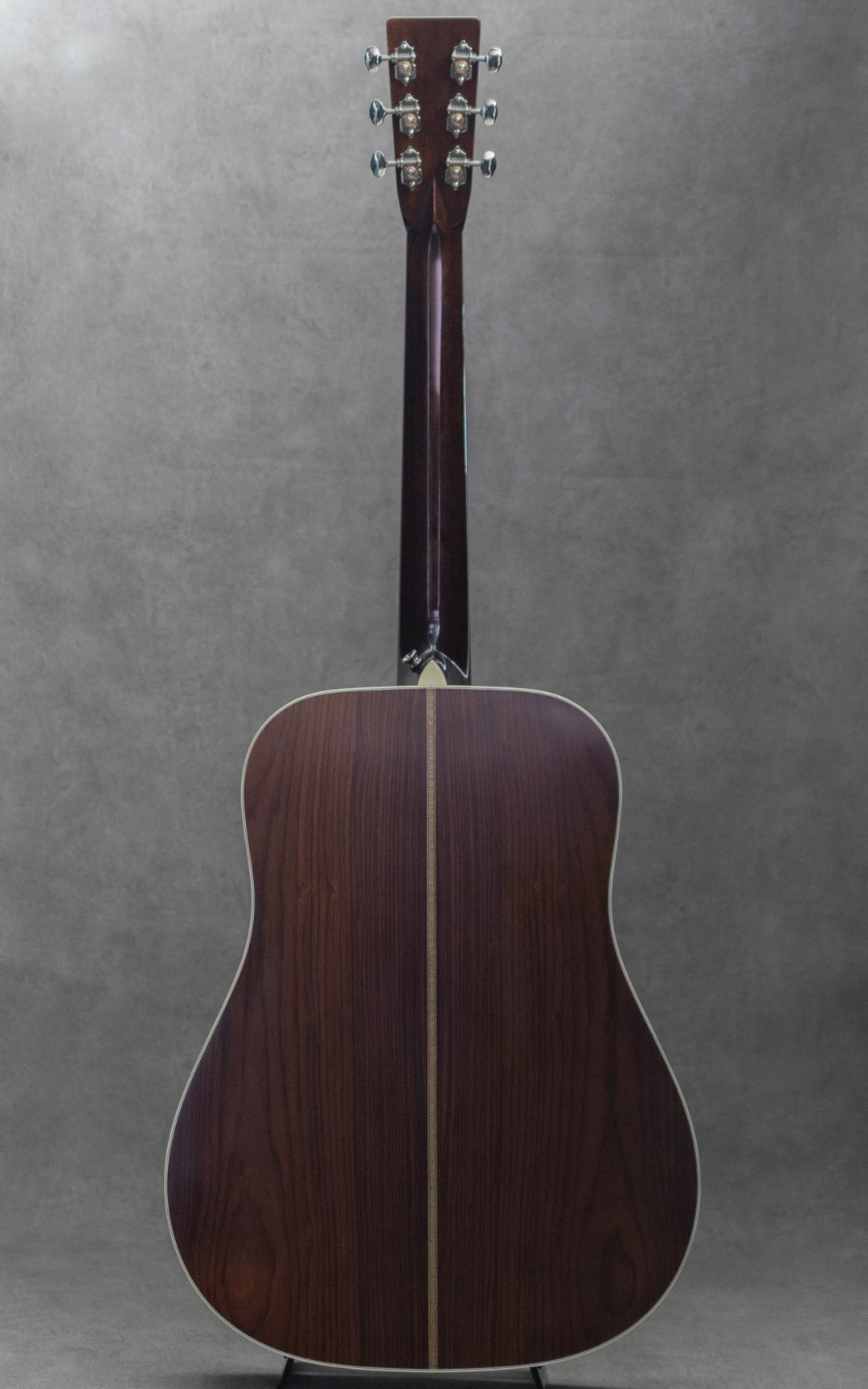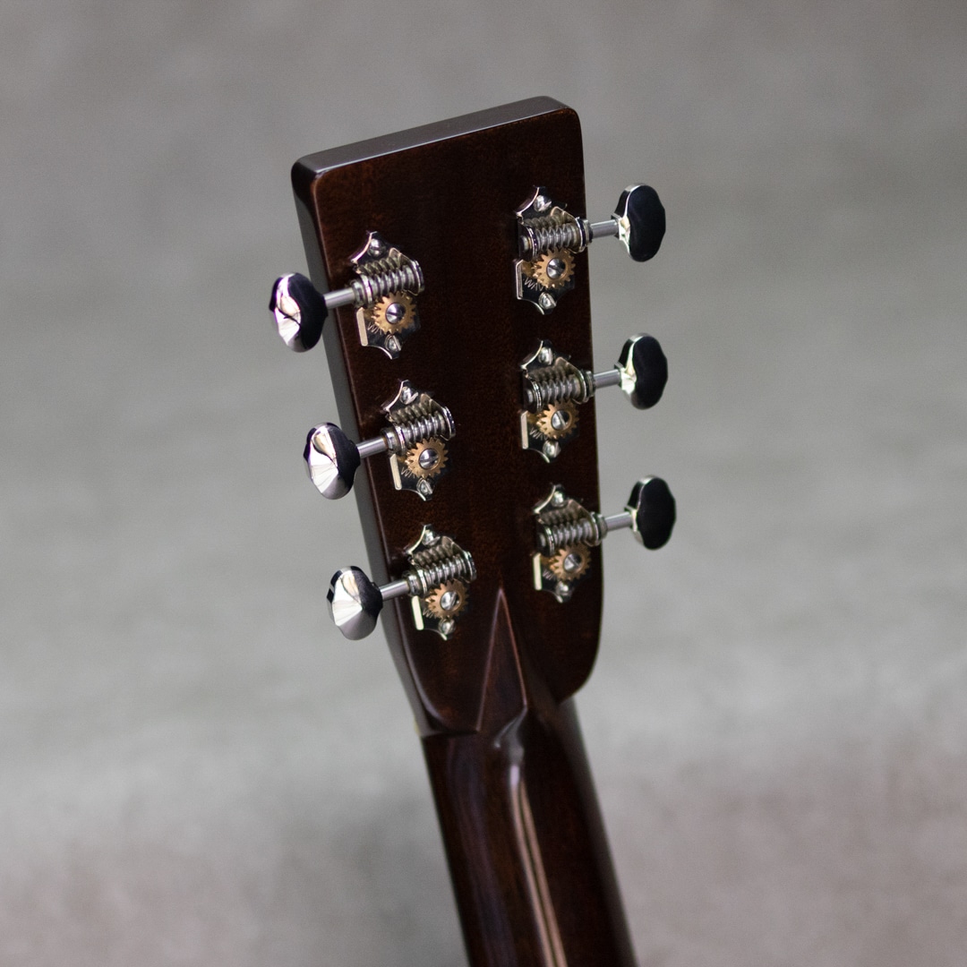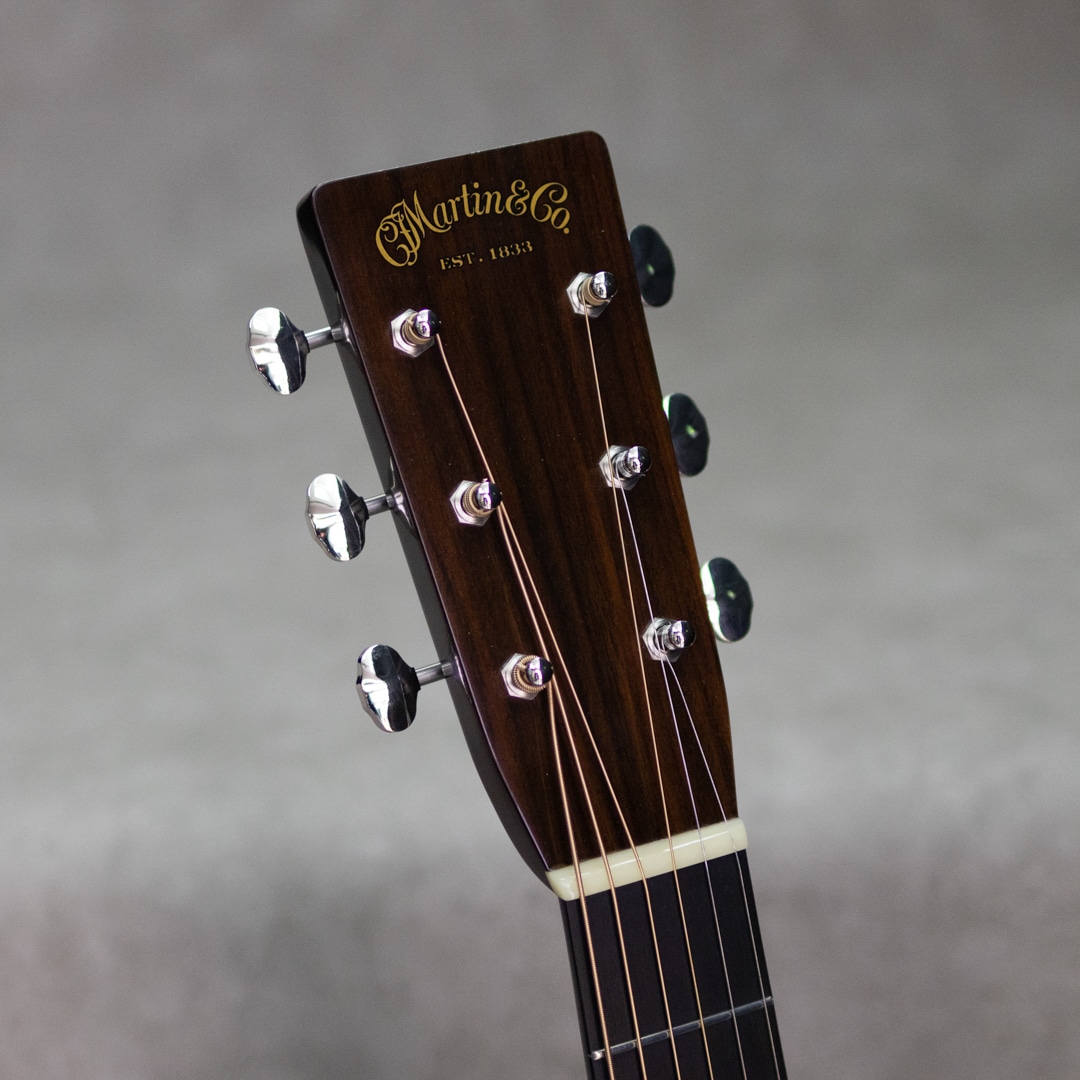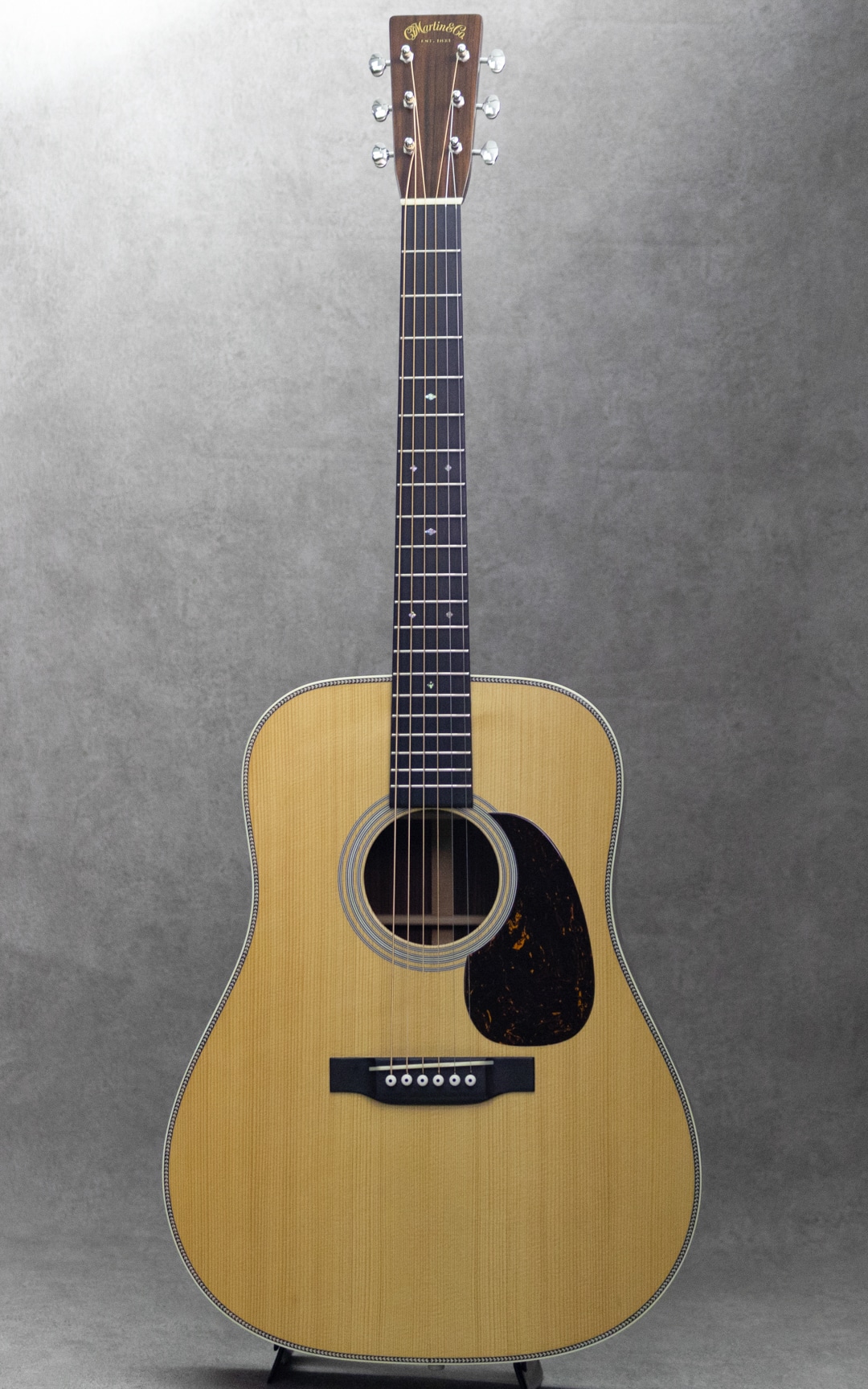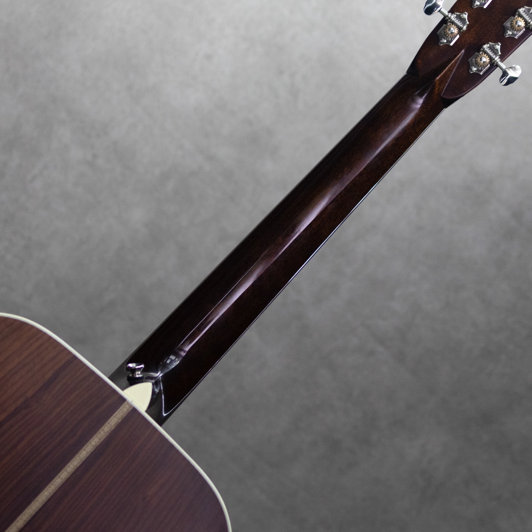 いつの時代も変らない憧れ『Martin Guitar』。今なおヴィンテージギターとして愛され続けるマーティンギターは、近年の優れた技術により数々のモデルが復刻されてきました。その中でも抜群の完成度を誇り近年注目を集めるのが『Authentic Series』。本器は、1937年製の"D-28"を忠実に復刻した"D-28 Authentic 1937 Guatemalan (2022)"。ヴィンテージマニアの中で"D-28"の完成系と称される1937年製をフィーチャーした本モデルは、ワイドネック&フォーワードシフテッドXブレイス最終期の14fジョイント仕様。2022年にさらなる完成度を求めボディアウトラインがリニューアルされ、さらにオリジナルに迫った仕上がりの1本。2023年製極上USED品。VTS加工がされた美しい色味のアディロンダックスプルーストップ、ワイルドで濃淡の出たガテマラローズウッドサイド&バック、ジニュインマホガニーネック、エボニー指板&ブリッジ、バタービーンウェバリーオープンバックペグ、ガテマラローズウッド化粧板、スロッテッドダイアモンド指板インレイ、塗り込みデルマーピックガード、ヘリンボーントリム、アイボロイドバインディング、ジグザグバックストリップ、スチールTバーロッド、ニカワ接着、トップ構造は1937年式のフォワードシフテッドスキャロップドXブレイシング。ヘッドの厚みやバックストリップ、指板の厚み、側板の割れ止め、指板エンドとブリッジ形状など、細部に渡るまでが忠実に復刻されています。シリアルスタンプも当時そっくりにデザインされたマニアックなリメイクギター。S&BマテリアルにガテマラRWが採用され、以前にもまして芯とパンチのあるサウンドになっています。ストローク時のスッキリと分離が良い立ち上がりと奥からモリモリと持ち上げる箱鳴り感。6弦までしっかりと輪郭を帯びながら、硬さを感じさせない完成度の高い響きです。ネックヒールストラップピン増設や若干の使用感は伺えますが、打痕など目立つ傷は見られないグッドコンディションの本器。ネック周りも良好で弾きやすいアクションをしっかりと保っています。マーチンギターのさらなる進歩を分かりやすく堪能できる完成度の高い1本。オールドスタイルのニッパチをお探しの方は、是非この機会に。オリジナルハードケース付属