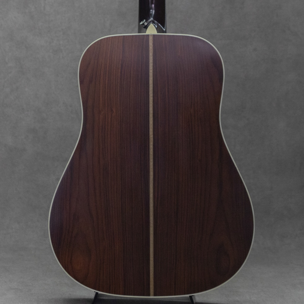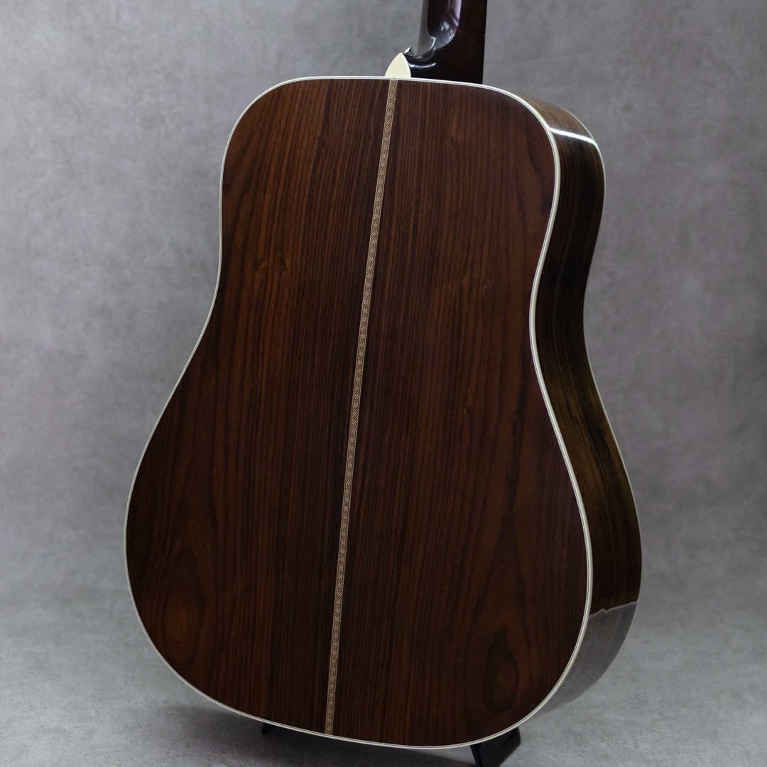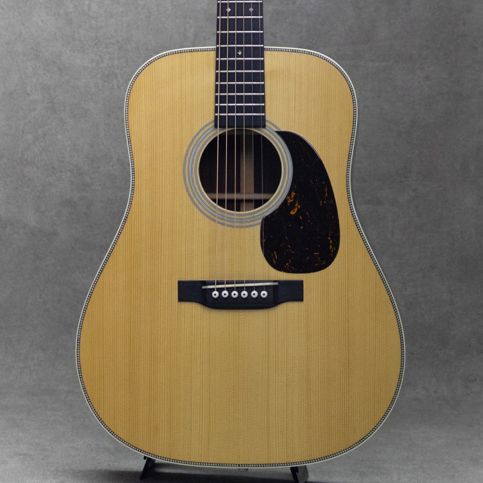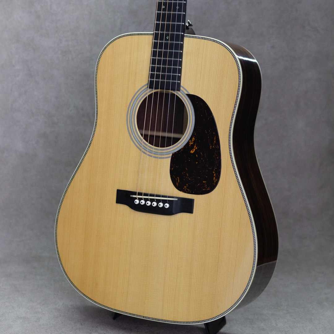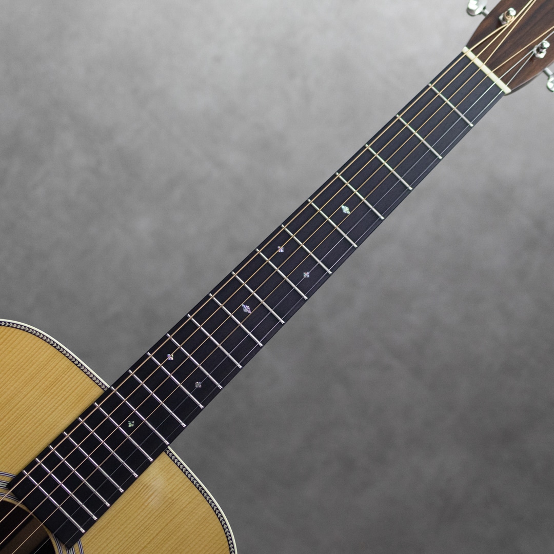 いつの時代も変らない憧れ『Martin Guitar』。今なおヴィンテージギターとして愛され続けるマーティンギターは、近年の優れた技術により数々のモデルが復刻されてきました。その中でも抜群の完成度を誇り近年注目を集めるのが『Authentic Series』。本器は、1937年製の"D-28"を忠実に復刻した"D-28 Authentic 1937 Guatemalan (2022)"。ヴィンテージマニアの中で"D-28"の完成系と称される1937年製をフィーチャーした本モデルは、ワイドネック&フォーワードシフテッドXブレイス最終期の14fジョイント仕様。2022年にさらなる完成度を求めボディアウトラインがリニューアルされ、さらにオリジナルに迫った仕上がりの1本。2023年製極上USED品。VTS加工がされた美しい色味のアディロンダックスプルーストップ、ワイルドで濃淡の出たガテマラローズウッドサイド&バック、ジニュインマホガニーネック、エボニー指板&ブリッジ、バタービーンウェバリーオープンバックペグ、ガテマラローズウッド化粧板、スロッテッドダイアモンド指板インレイ、塗り込みデルマーピックガード、ヘリンボーントリム、アイボロイドバインディング、ジグザグバックストリップ、スチールTバーロッド、ニカワ接着、トップ構造は1937年式のフォワードシフテッドスキャロップドXブレイシング。ヘッドの厚みやバックストリップ、指板の厚み、側板の割れ止め、指板エンドとブリッジ形状など、細部に渡るまでが忠実に復刻されています。シリアルスタンプも当時そっくりにデザインされたマニアックなリメイクギター。S&BマテリアルにガテマラRWが採用され、以前にもまして芯とパンチのあるサウンドになっています。ストローク時のスッキリと分離が良い立ち上がりと奥からモリモリと持ち上げる箱鳴り感。6弦までしっかりと輪郭を帯びながら、硬さを感じさせない完成度の高い響きです。ネックヒールストラップピン増設や若干の使用感は伺えますが、打痕など目立つ傷は見られないグッドコンディションの本器。ネック周りも良好で弾きやすいアクションをしっかりと保っています。マーチンギターのさらなる進歩を分かりやすく堪能できる完成度の高い1本。オールドスタイルのニッパチをお探しの方は、是非この機会に。オリジナルハードケース付属