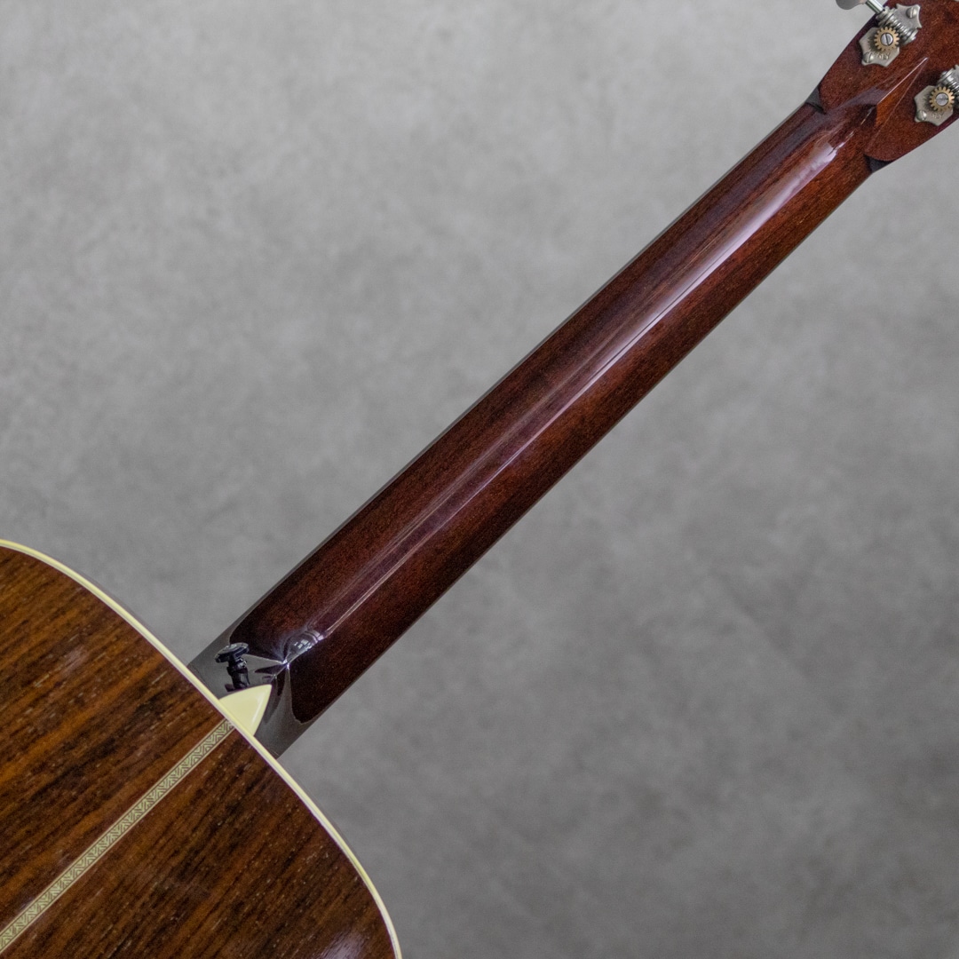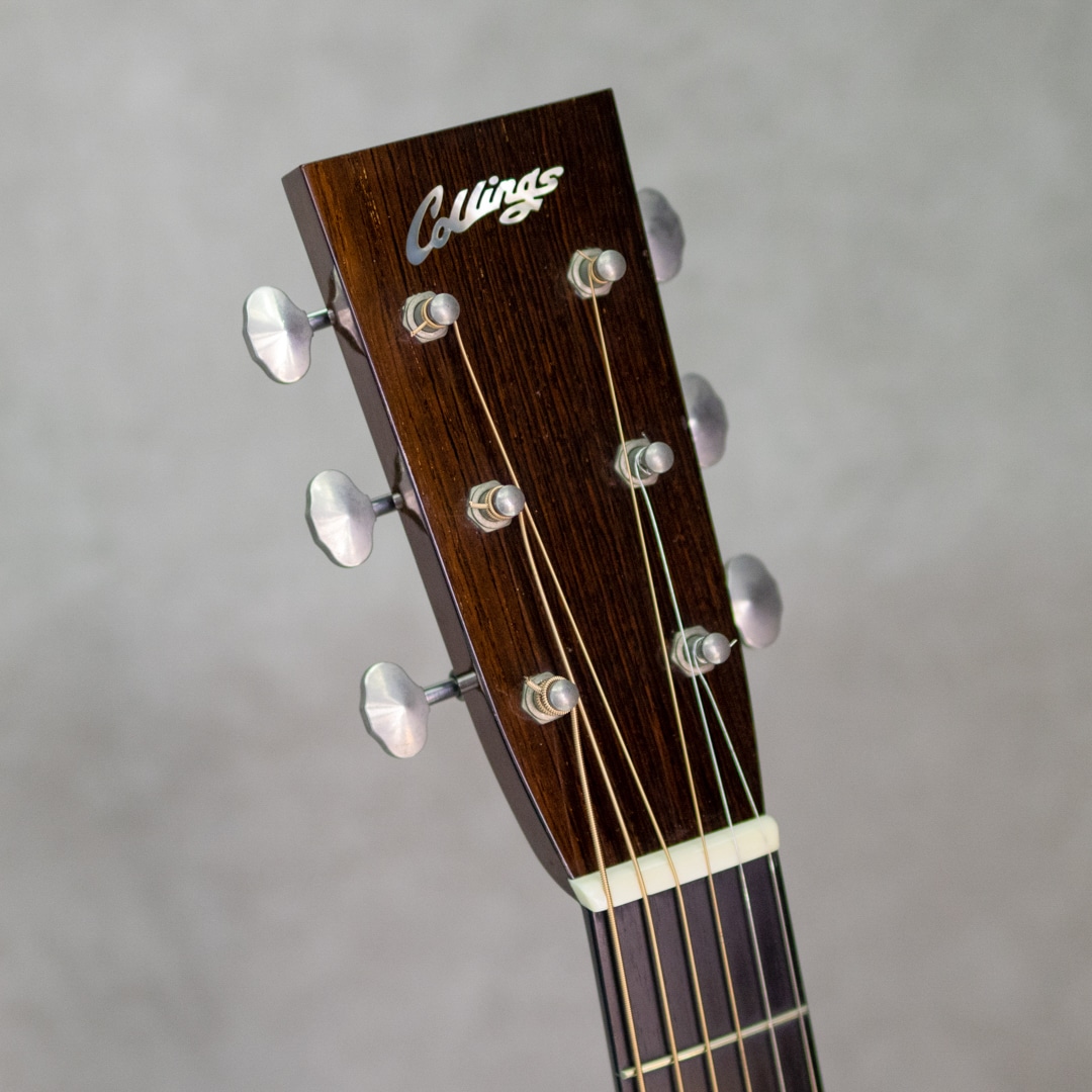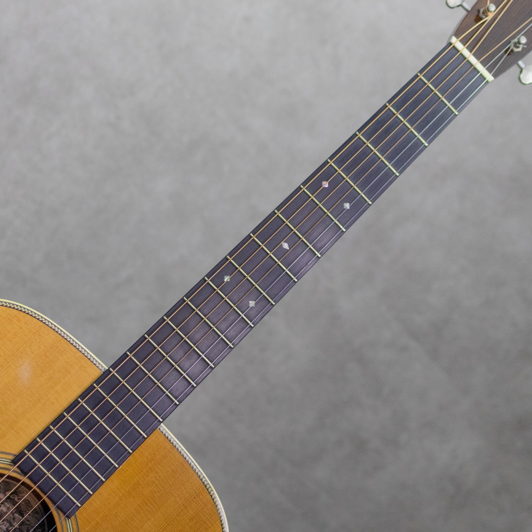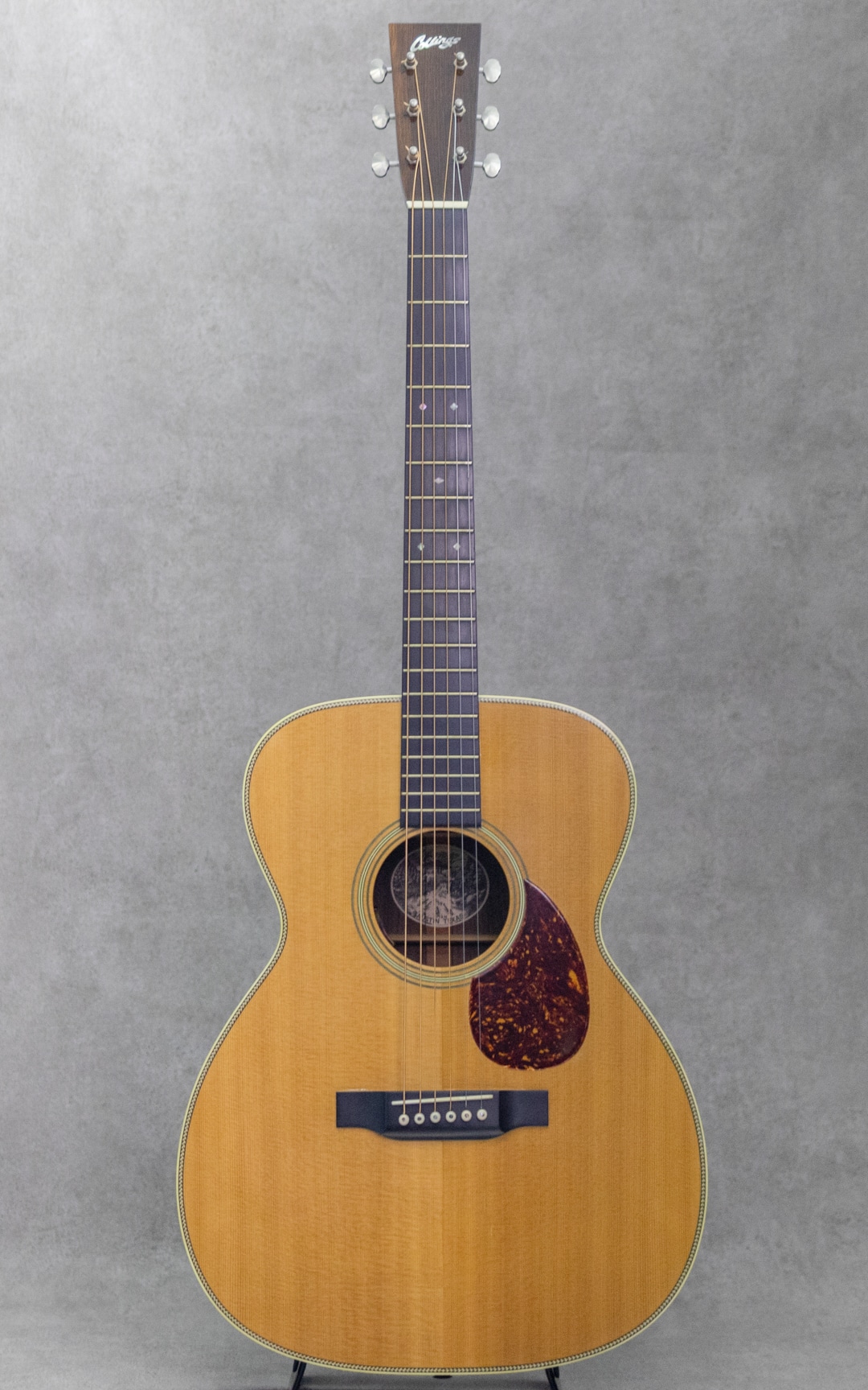 世界的にもっとも高い評価を得ているブランドの一つであるコリングスギター。コリングスの高く保たれたその完成度は、プレイヤーがその楽器を手に持つだけで見惚れてしまう美しさを持ち、音を出せば納得する響きを放ちます。本器はコリングスの中でも人気の高い”OM2H”。定番仕様ながらラッカー塗装最終期に作られた1本。1998年製USED品。目幅の狭い柾目杢が浮き出る極上スプルースントップ、目幅の狭い柾目杢のインディアンローズウッドサイド&バック、ホンジュラスマホガニーネック、エボニー指板、エボニーブリッジ、ウェバリーオープンバックペグ、べっ甲柄ピックガード、ヘリンボーントリムパーフリング、ジグザグバックストリップ、アイボロイドバインディング、トップ構造は戦前マーチンの問題点を考慮したオリジナルスキャロップブレイシング、ラッカーフィニッシュ。後付けでL.R.Baggs Lryicピックアップが搭載されています。しっかりと経年し音抜けと分離がよくなっている本器。ドライなテイストを感じさせながら、重厚な倍音感も併せ持ち、ローズモデルらしい力強い響きを楽しませてくれます。使用に伴う若干の小傷や打痕は見られますが、30年経過してることを考えると大切に弾かれてきたことが伺えます。1,2弦ブリッジ下あたりに少し目立つ引っ掻き傷が見られますが、割れなどはなく良好。ネックまわりのコンディションは言わずもがな。パーフェクトなコンディションで弾き心地とも抜群です。ネックヒールストラップピン取付あり。経年による良い顔つきをした本器”OM2H”。まだまだバリバリ安心して弾いていただける実践派向けの1本。要チェックください。オリジナルハードケース付属