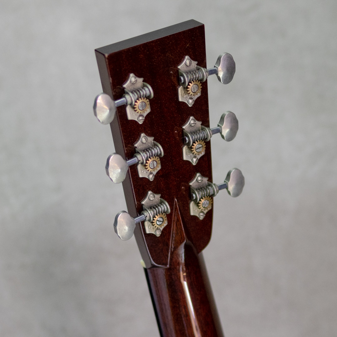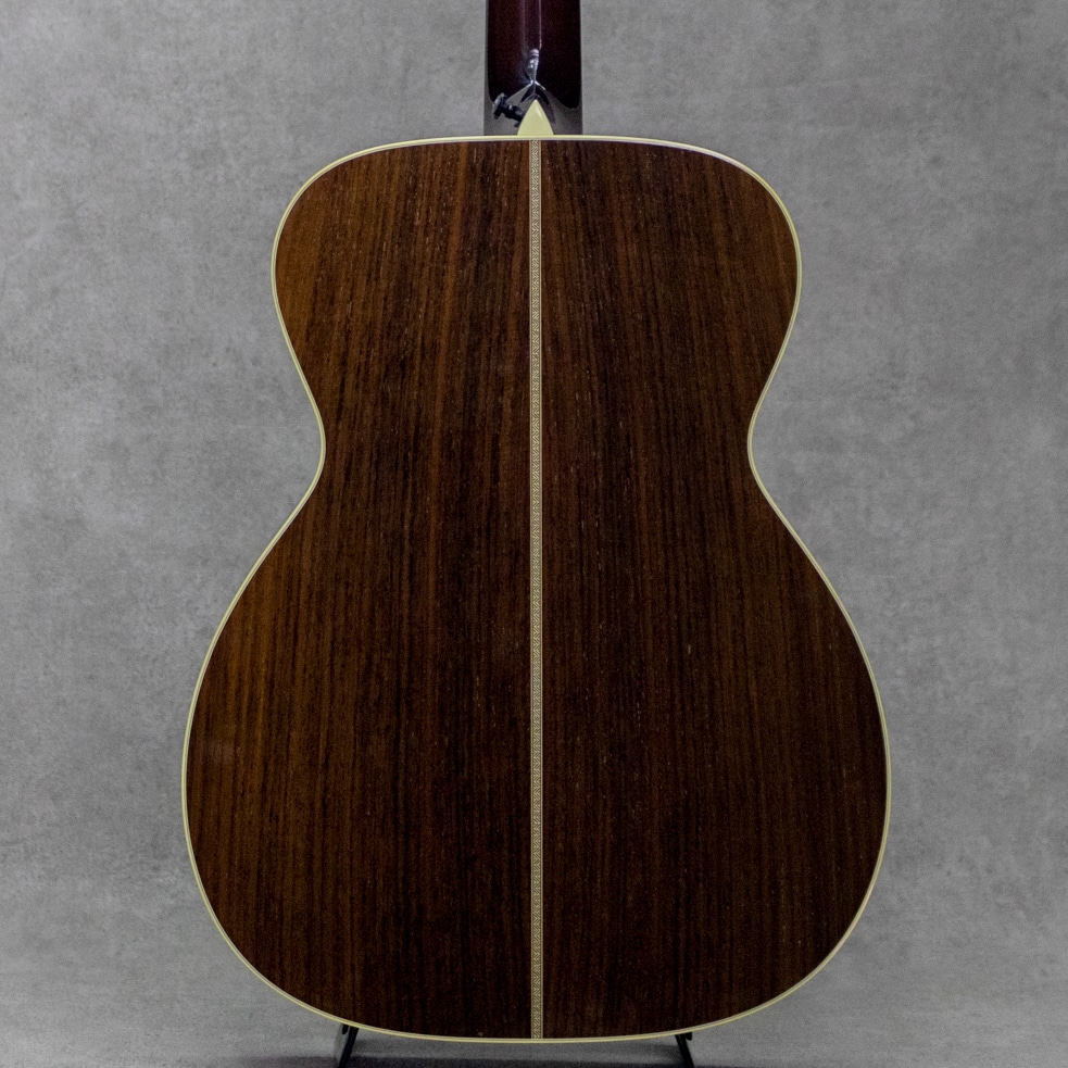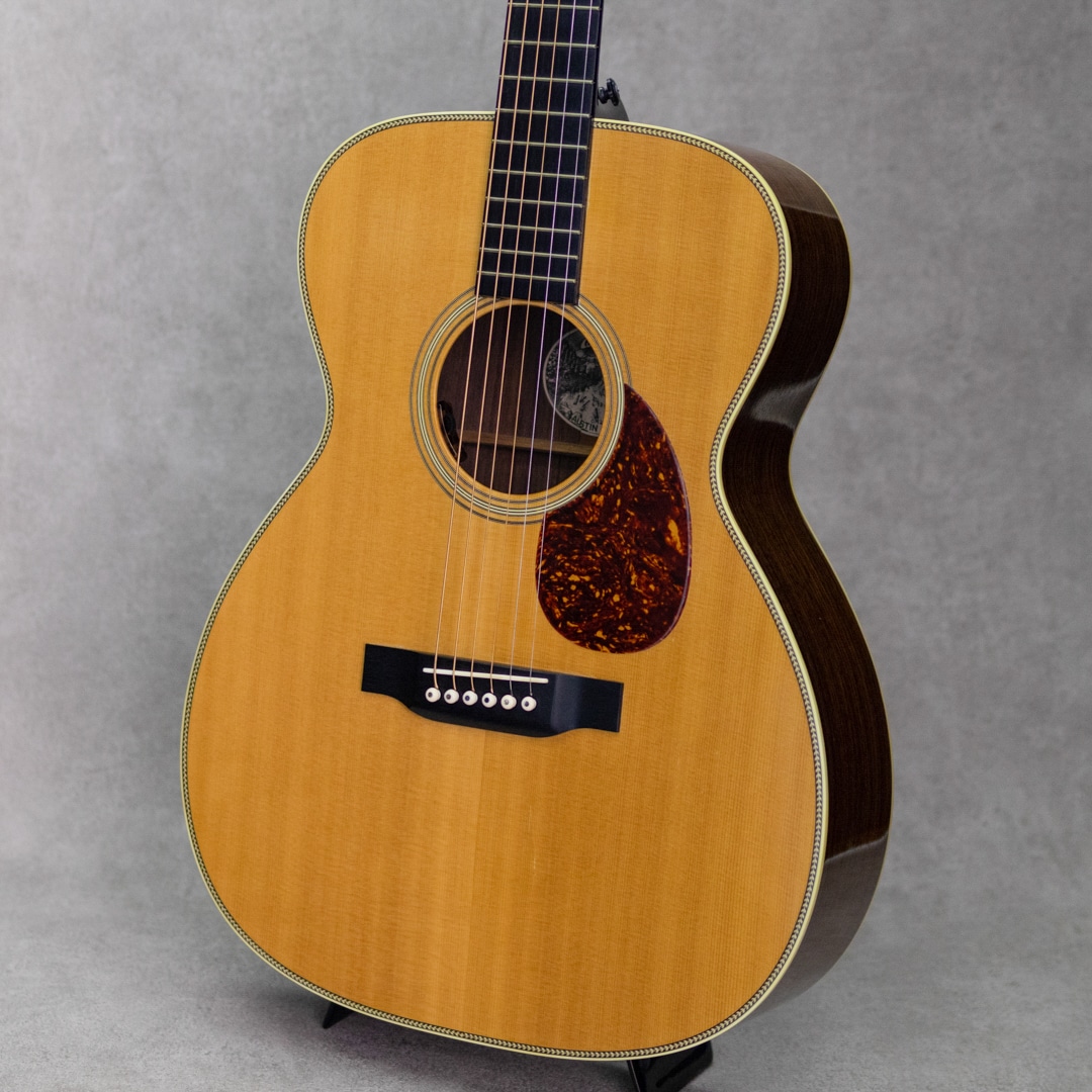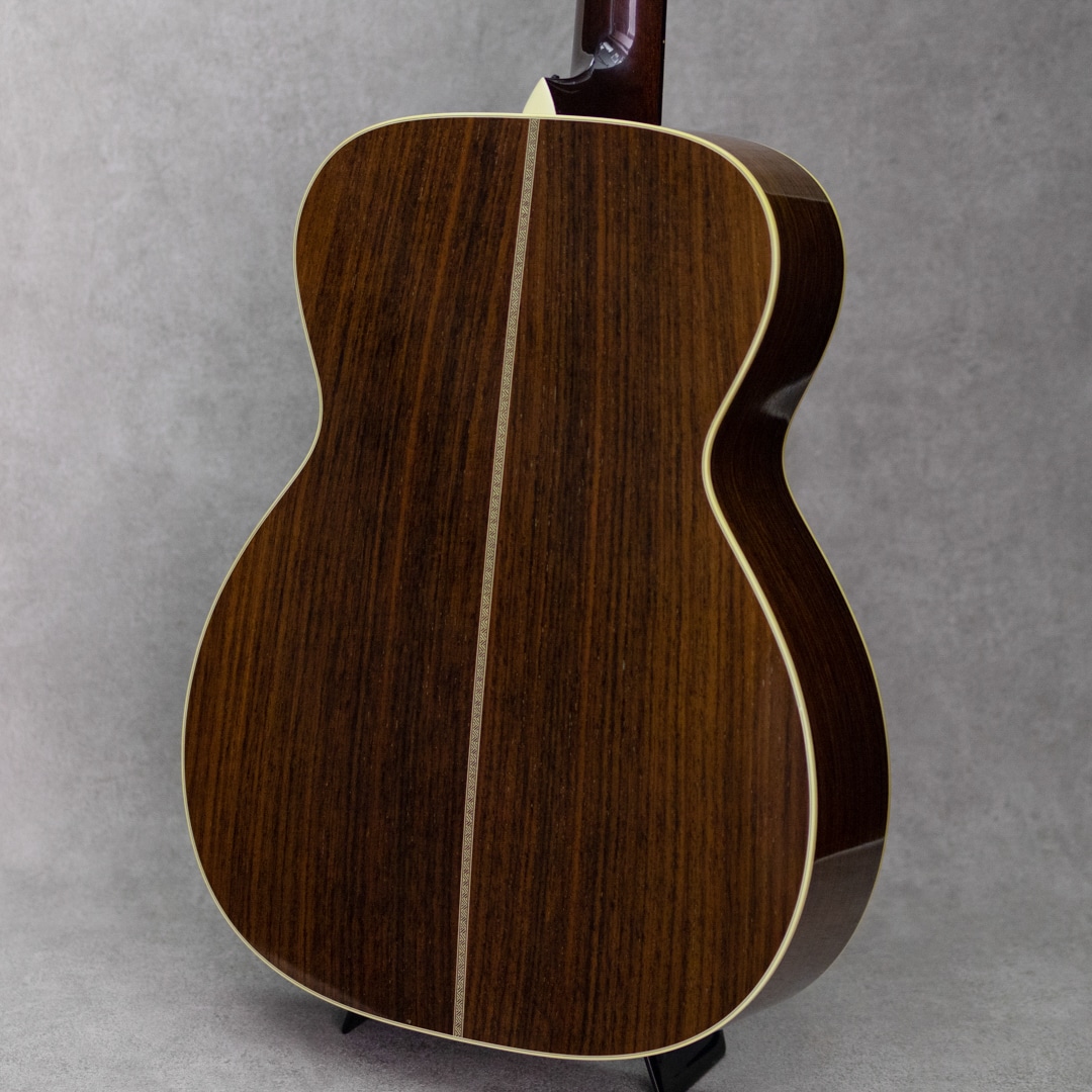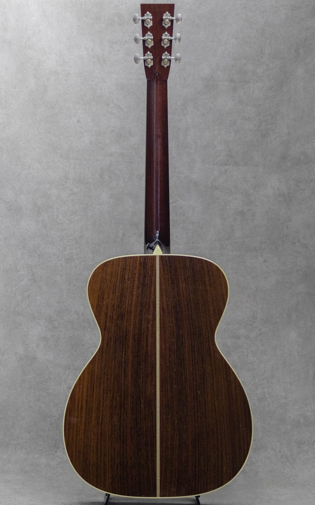 世界的にもっとも高い評価を得ているブランドの一つであるコリングスギター。コリングスの高く保たれたその完成度は、プレイヤーがその楽器を手に持つだけで見惚れてしまう美しさを持ち、音を出せば納得する響きを放ちます。本器はコリングスの中でも人気の高い”OM2H”。定番仕様ながらラッカー塗装最終期に作られた1本。1998年製USED品。目幅の狭い柾目杢が浮き出る極上スプルースントップ、目幅の狭い柾目杢のインディアンローズウッドサイド&バック、ホンジュラスマホガニーネック、エボニー指板、エボニーブリッジ、ウェバリーオープンバックペグ、べっ甲柄ピックガード、ヘリンボーントリムパーフリング、ジグザグバックストリップ、アイボロイドバインディング、トップ構造は戦前マーチンの問題点を考慮したオリジナルスキャロップブレイシング、ラッカーフィニッシュ。後付けでL.R.Baggs Lryicピックアップが搭載されています。しっかりと経年し音抜けと分離がよくなっている本器。ドライなテイストを感じさせながら、重厚な倍音感も併せ持ち、ローズモデルらしい力強い響きを楽しませてくれます。使用に伴う若干の小傷や打痕は見られますが、30年経過してることを考えると大切に弾かれてきたことが伺えます。1,2弦ブリッジ下あたりに少し目立つ引っ掻き傷が見られますが、割れなどはなく良好。ネックまわりのコンディションは言わずもがな。パーフェクトなコンディションで弾き心地とも抜群です。ネックヒールストラップピン取付あり。経年による良い顔つきをした本器”OM2H”。まだまだバリバリ安心して弾いていただける実践派向けの1本。要チェックください。オリジナルハードケース付属