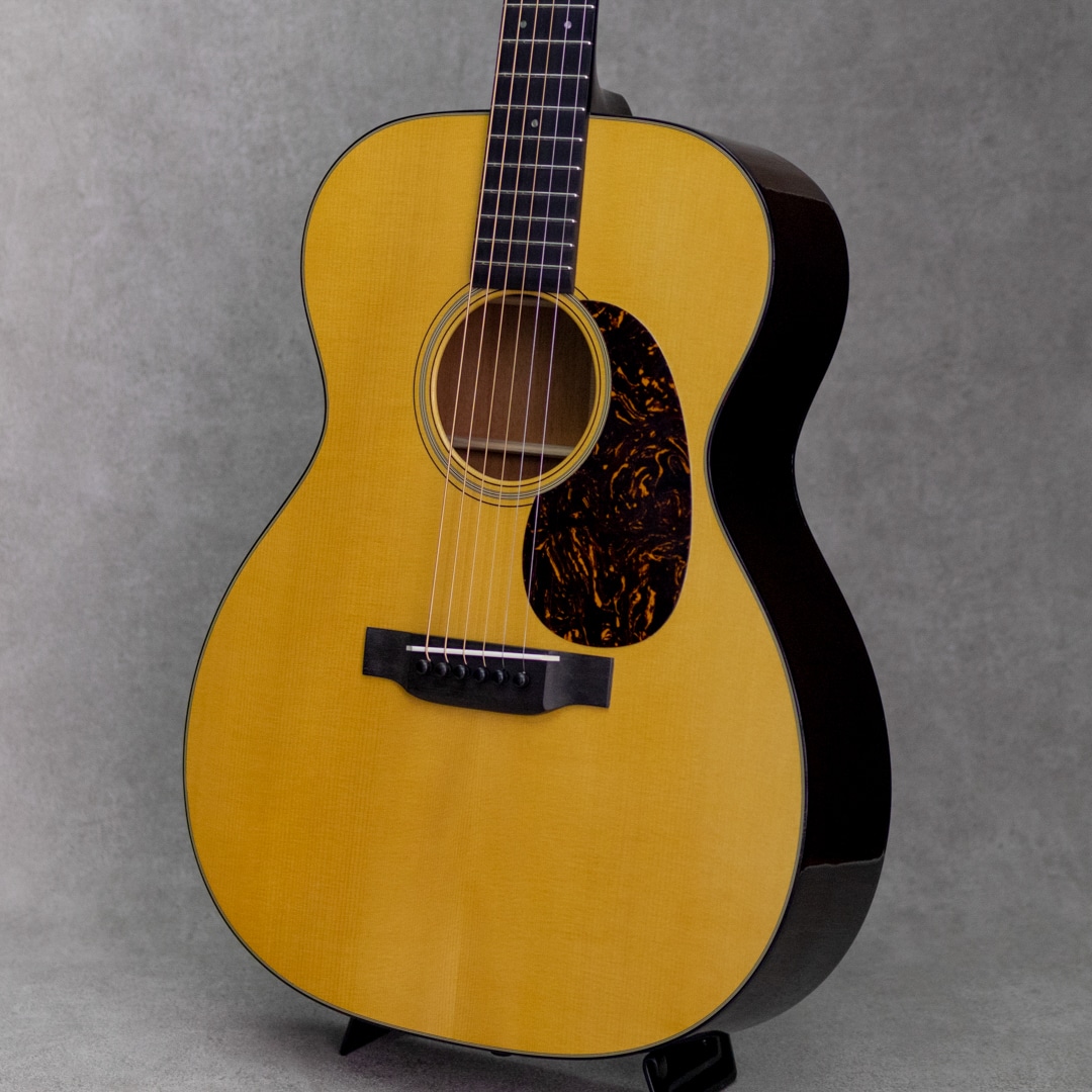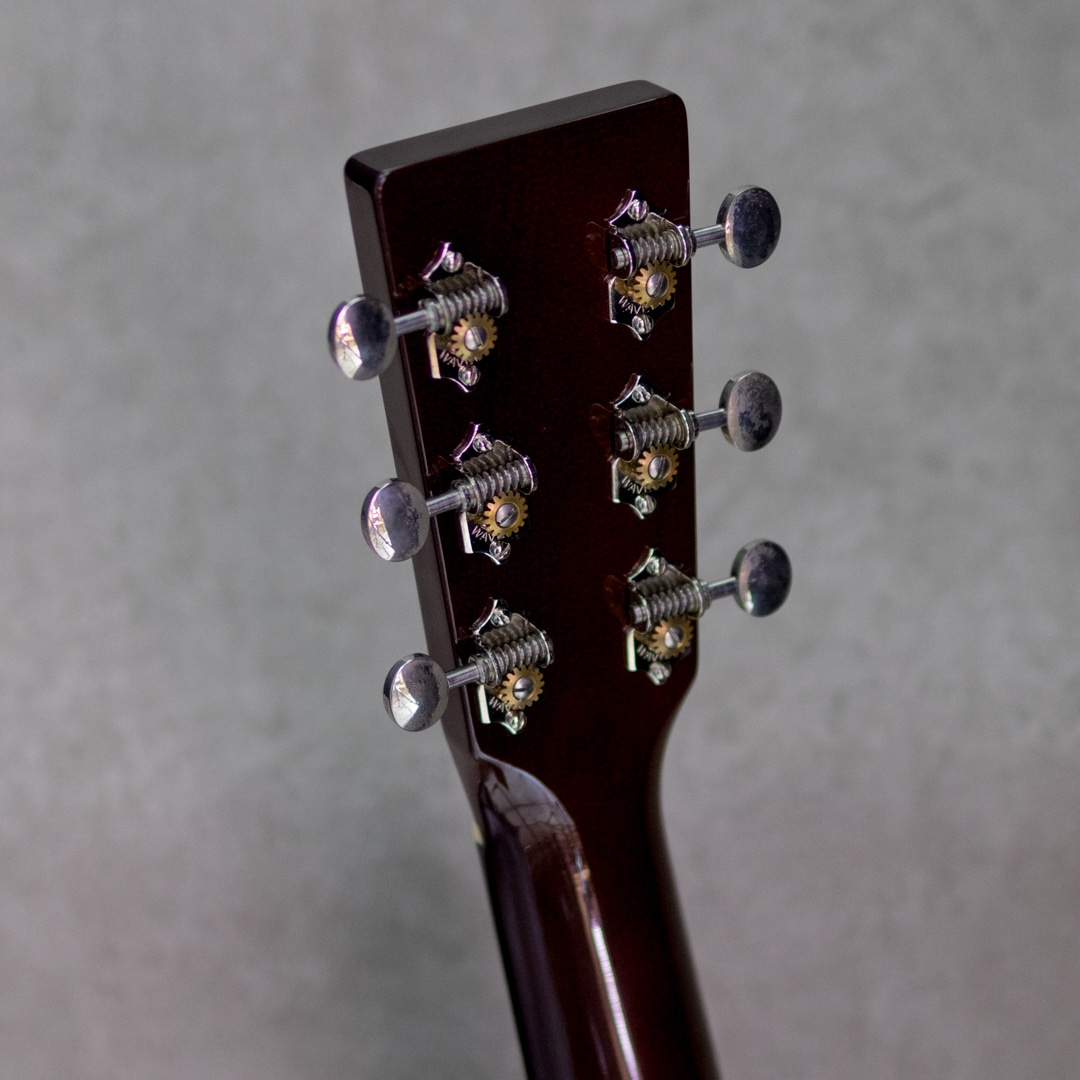 いつの時代も変らない憧れ『Martin Guitar』。今なおヴィンテージギターとして愛され続けるマーティンギターは、近年の優れた技術により数々のモデルが復刻されてきました。その中でも抜群の完成度を誇り近年注目を集めるのが『Authentic Series』。本器は、1937年製の”OOO-18"を忠実に復刻した”OOO-18 Authentic 1937"。ヴィンテージマニアの中でも人気の高い1937年製をフィーチャーした本モデルは、ワイドネック最終期の14fジョイント仕様。人気の高い初期製作モデル、2007年製極上USED品。目幅の揃った美しいアディロンダックスプルーストップ、リボン杢がうっすら浮き出る美しいジニュインマホガニーサイド&バック、ジニュインマホガニーネック、エボニー指板&ブリッジ、ウェバリーオープンバックペグ、ハカランダ化粧板、ドット指板インレイ、塗り込みデルマーピックガード、べっ甲柄セルロイドバインディング、スチールTバーロッド、ニカワ接着、トップ構造は1937年式のスキャロップドXブレイシング。ヘッドの厚みやバックストリップ、指板の厚み、側板の割れ止め、指板エンドとブリッジ形状など、細部に渡るまでが忠実に復刻されています。シリアルスタンプも当時そっくりにデザインされたマニアックなリメイクギター。重量も軽くまさにタイムトリップする1本です。空気をしっかりと含むガランと響くサウンド。ブライトで音抜けもよく、追いかけてくる倍音が心地よい至極の1本。衣擦れ程度の若干の使用感は伺えますが、打痕など目立つ傷は見られないグッドコンディションの本器。ネック周りも良好で弾きやすいアクションをしっかりと保っています。当時の製造工程を研究し、完全な手作りで再現したギター。。近年モデルの中でもコレクタブルな1本です。お見逃しなく。。ブラウンカラーのオリジナルハードケースが付属します。
