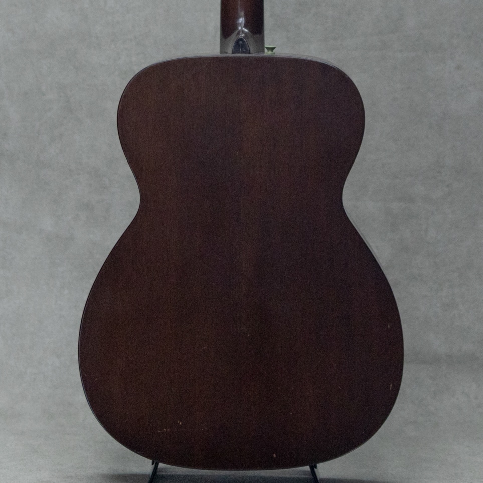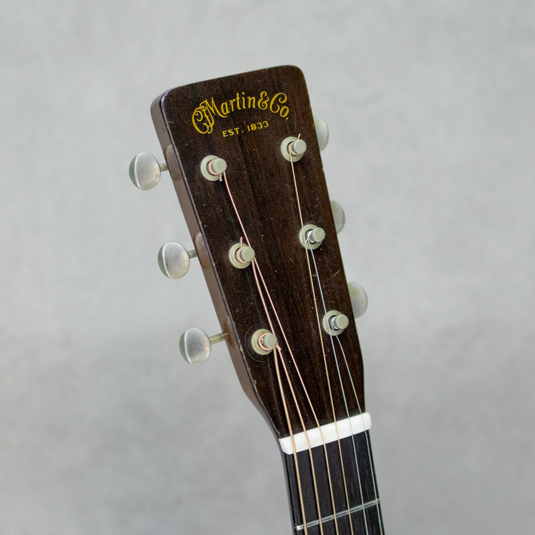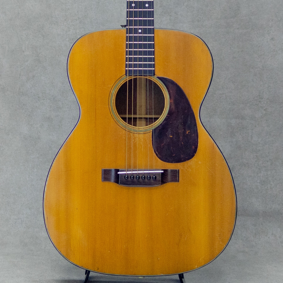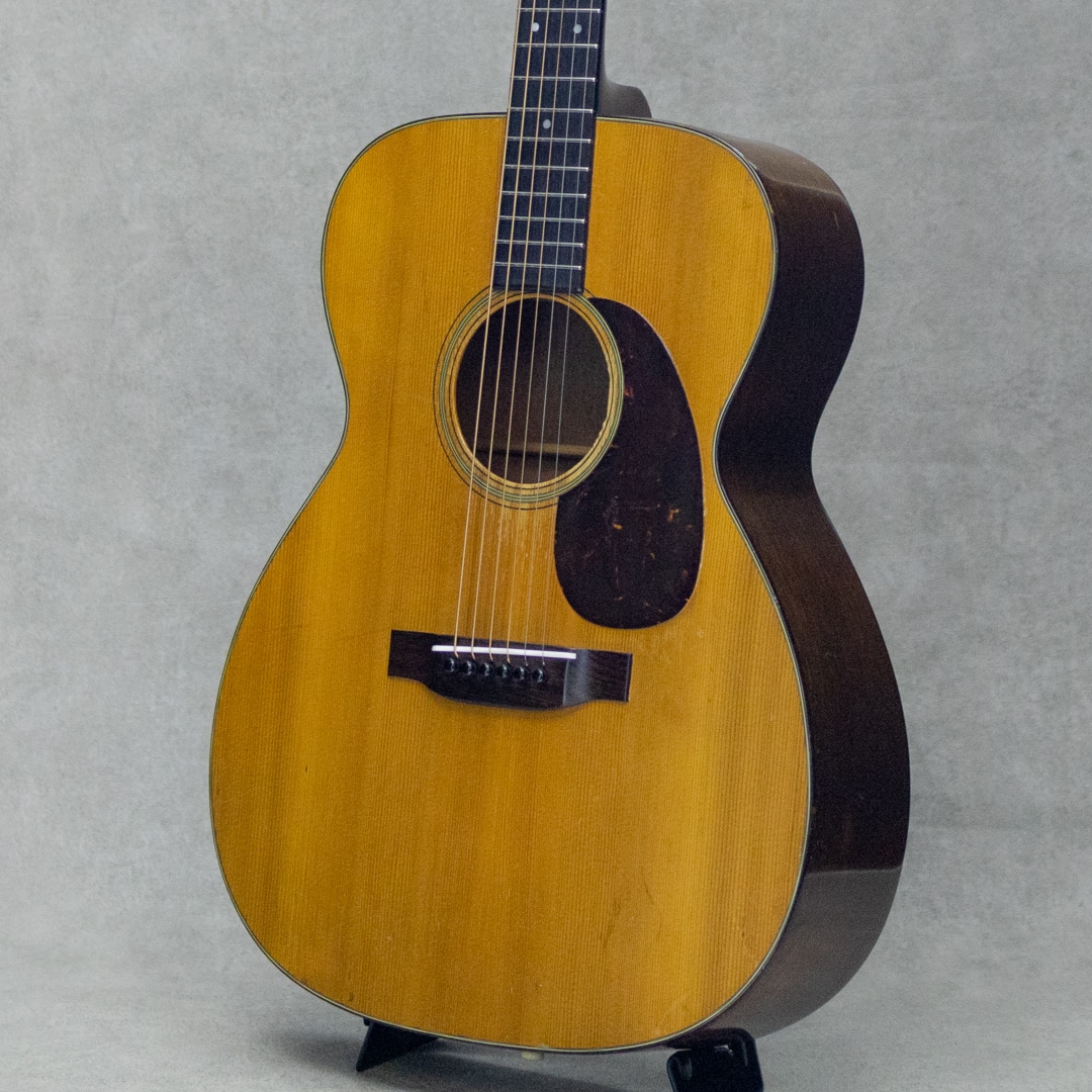 50sマーチン、”OOO-18”。小ぶりで抱えやすく、実用性の高いアイテムとして人気の高いモデルで、ビンテージマーチンでも”D”モデルと並び同社を代表するモデルとして長きにわたり製造され続けています。本器は、1952年製Vintage品。良い雰囲気と骨太な音色を魅せるクールな1本。良い色味に焼けたスプルーストップ、美しい杢目のマホガニーサイド&バック、マホガニーネック、スチールTバーネックロッド、ハカランダ天神板、ハカランダ指板&ブリッジ、べっ甲柄セルロイドピックガード、クルーソンオープンバックペグ、べっ甲柄セルロイドバインディング、ノンスキャロップドXブレイシング。枯れた味わい深いサウンドの本器。程よいレンジ感とコシのあるノンスキャサウンド。とても味わい深く魅せてくれる倍音としっかりと喰いつくサスティンは、この年代ならではの響き。フィンガーでもピックでも、フォーキーでもロックでも、それぞれに味を添えてくれるニクイ1本です。サウンドホールまわりのピッキングウェアや使用に伴う小傷は見られますが、大きく損なうようなものはなく板割れもないグッドコンディション。ブリッジリプレイスがされていますが、良い材で雰囲気の良い仕上げです。ネックまわりもとても良好で、弾きやすいアクションをしっかりと保っています。6弦側サイドにストラップピン増設。見た目・雰囲気・サウンド、ともに及第点のビンテージマーチン”OOO-18”。是非要チェックください。ハードケース付属。