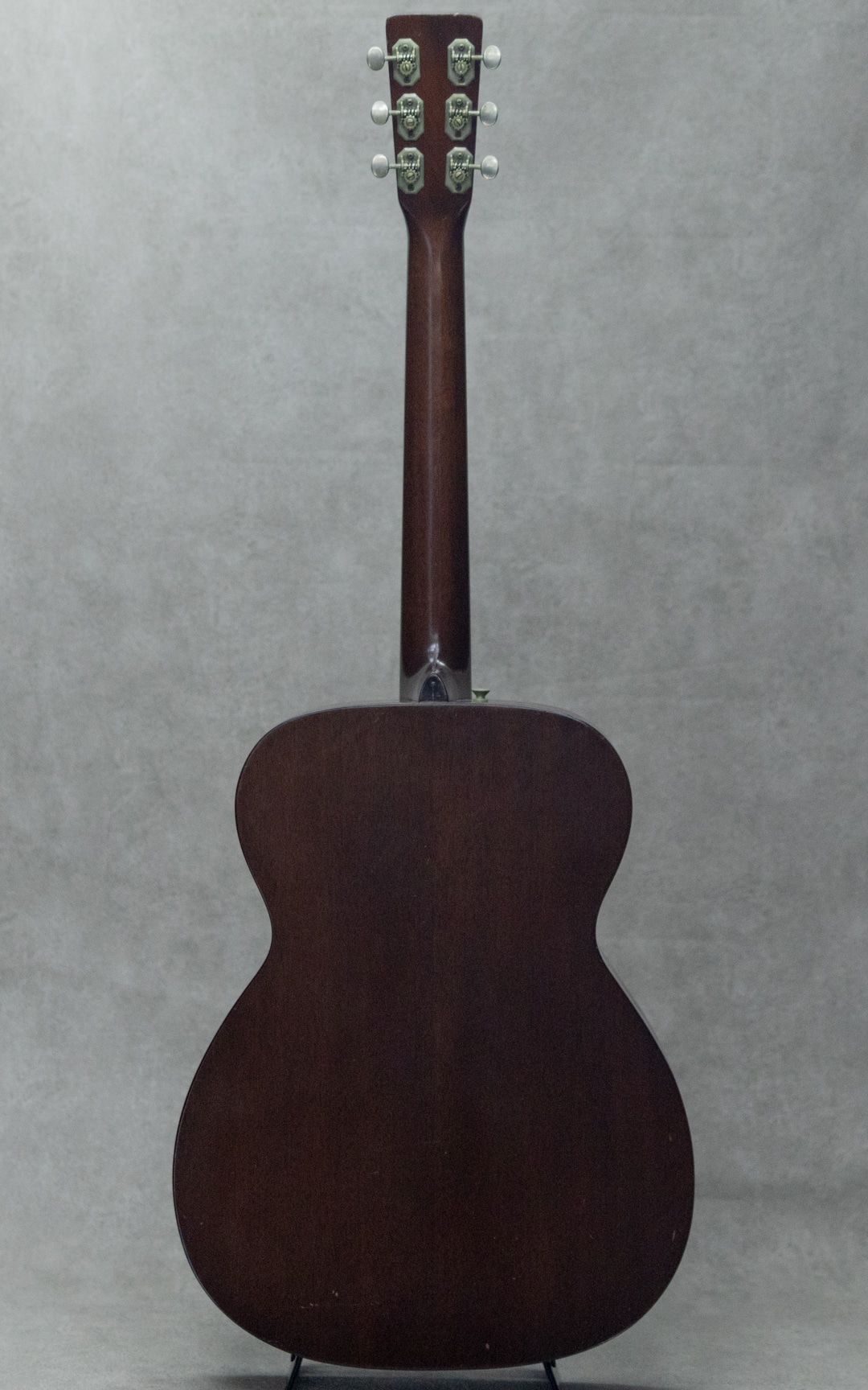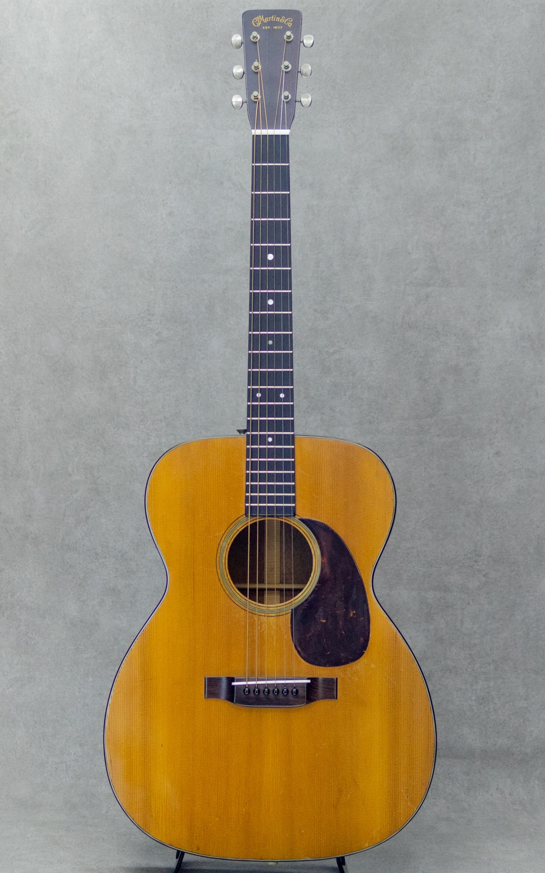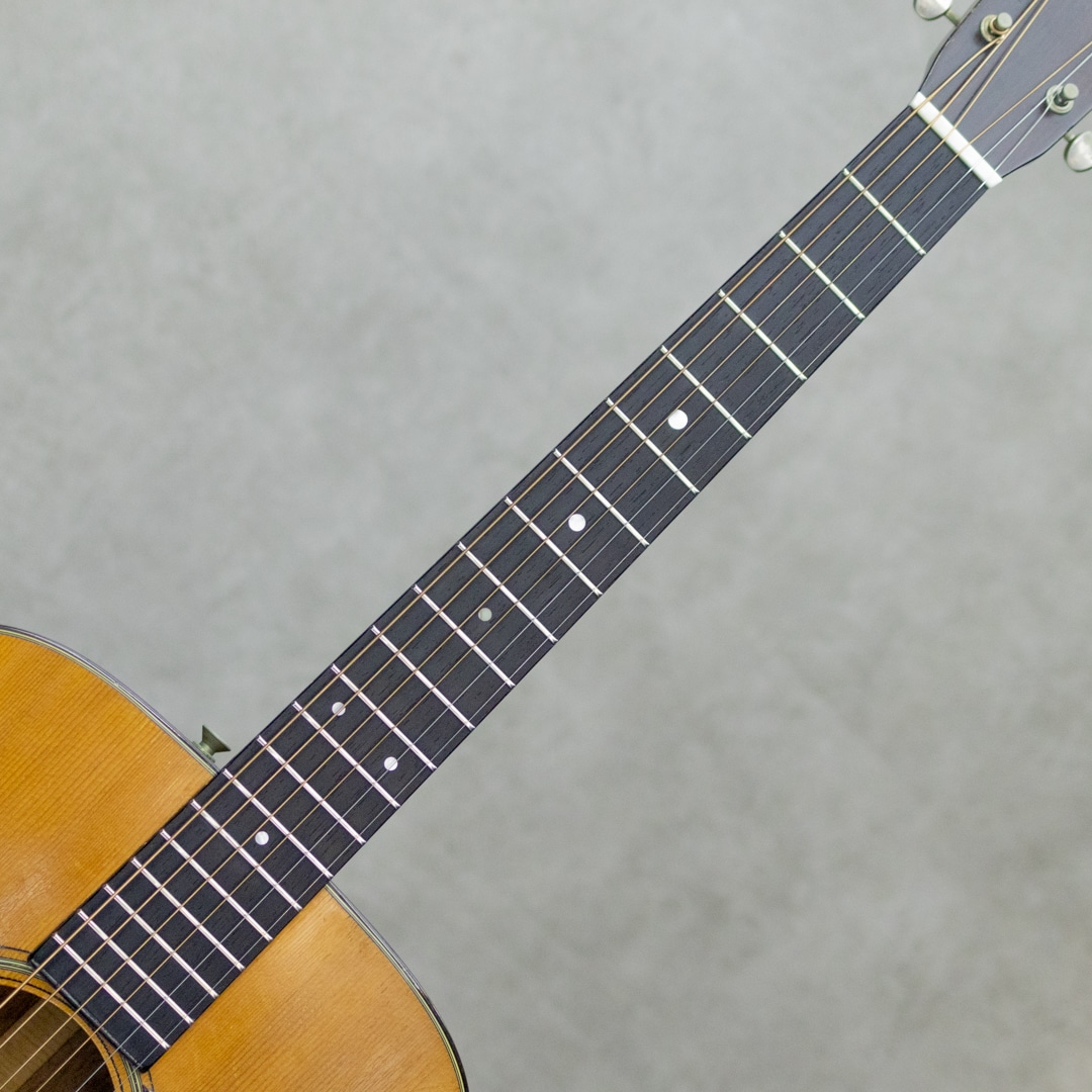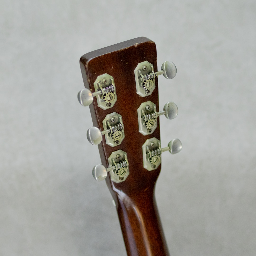 50sマーチン、”OOO-18”。小ぶりで抱えやすく、実用性の高いアイテムとして人気の高いモデルで、ビンテージマーチンでも”D”モデルと並び同社を代表するモデルとして長きにわたり製造され続けています。本器は、1952年製Vintage品。良い雰囲気と骨太な音色を魅せるクールな1本。良い色味に焼けたスプルーストップ、美しい杢目のマホガニーサイド&バック、マホガニーネック、スチールTバーネックロッド、ハカランダ天神板、ハカランダ指板&ブリッジ、べっ甲柄セルロイドピックガード、クルーソンオープンバックペグ、べっ甲柄セルロイドバインディング、ノンスキャロップドXブレイシング。枯れた味わい深いサウンドの本器。程よいレンジ感とコシのあるノンスキャサウンド。とても味わい深く魅せてくれる倍音としっかりと喰いつくサスティンは、この年代ならではの響き。フィンガーでもピックでも、フォーキーでもロックでも、それぞれに味を添えてくれるニクイ1本です。サウンドホールまわりのピッキングウェアや使用に伴う小傷は見られますが、大きく損なうようなものはなく板割れもないグッドコンディション。ブリッジリプレイスがされていますが、良い材で雰囲気の良い仕上げです。ネックまわりもとても良好で、弾きやすいアクションをしっかりと保っています。6弦側サイドにストラップピン増設。見た目・雰囲気・サウンド、ともに及第点のビンテージマーチン”OOO-18”。是非要チェックください。ハードケース付属。