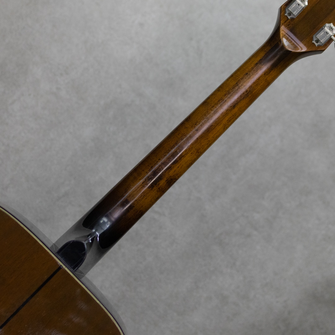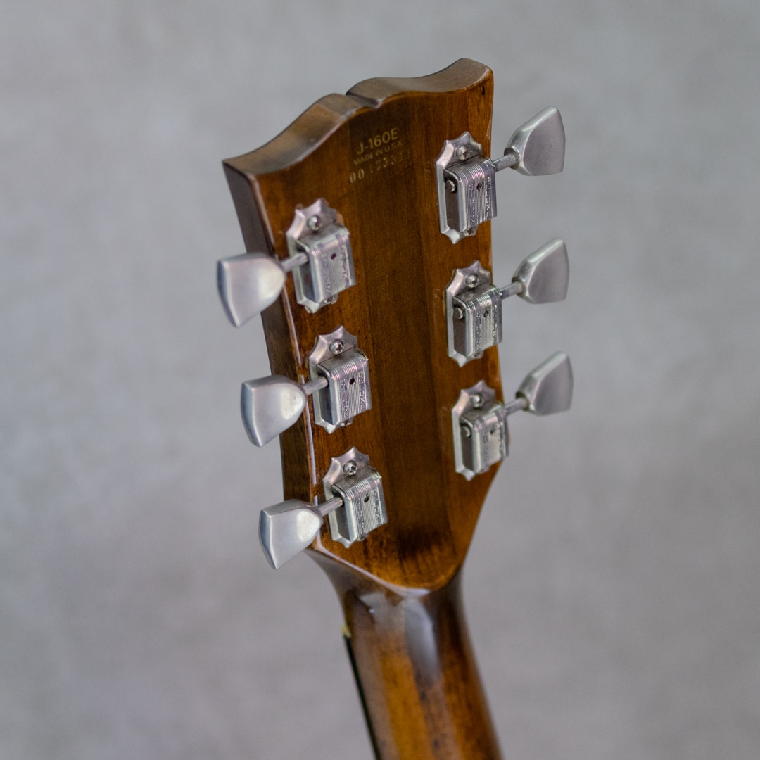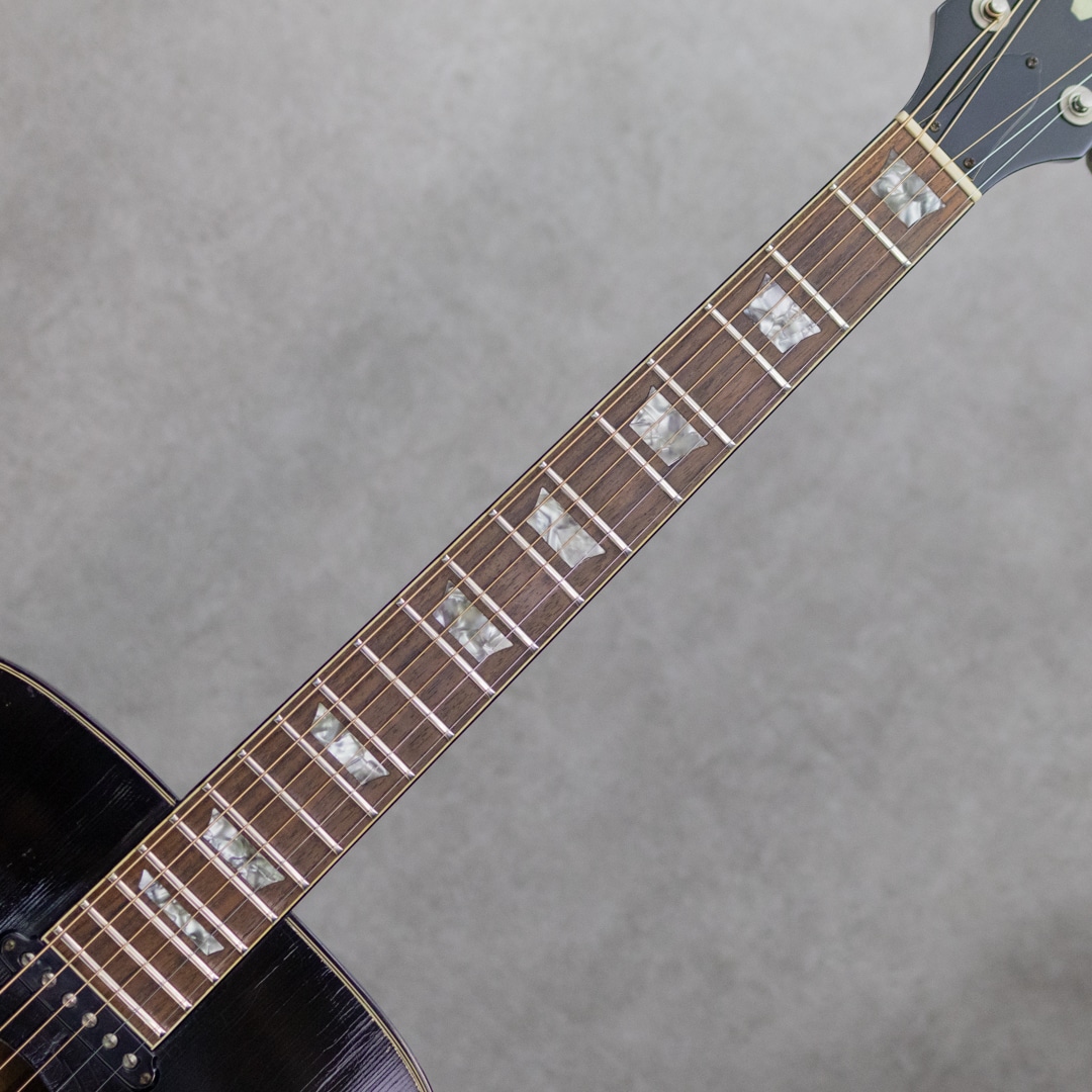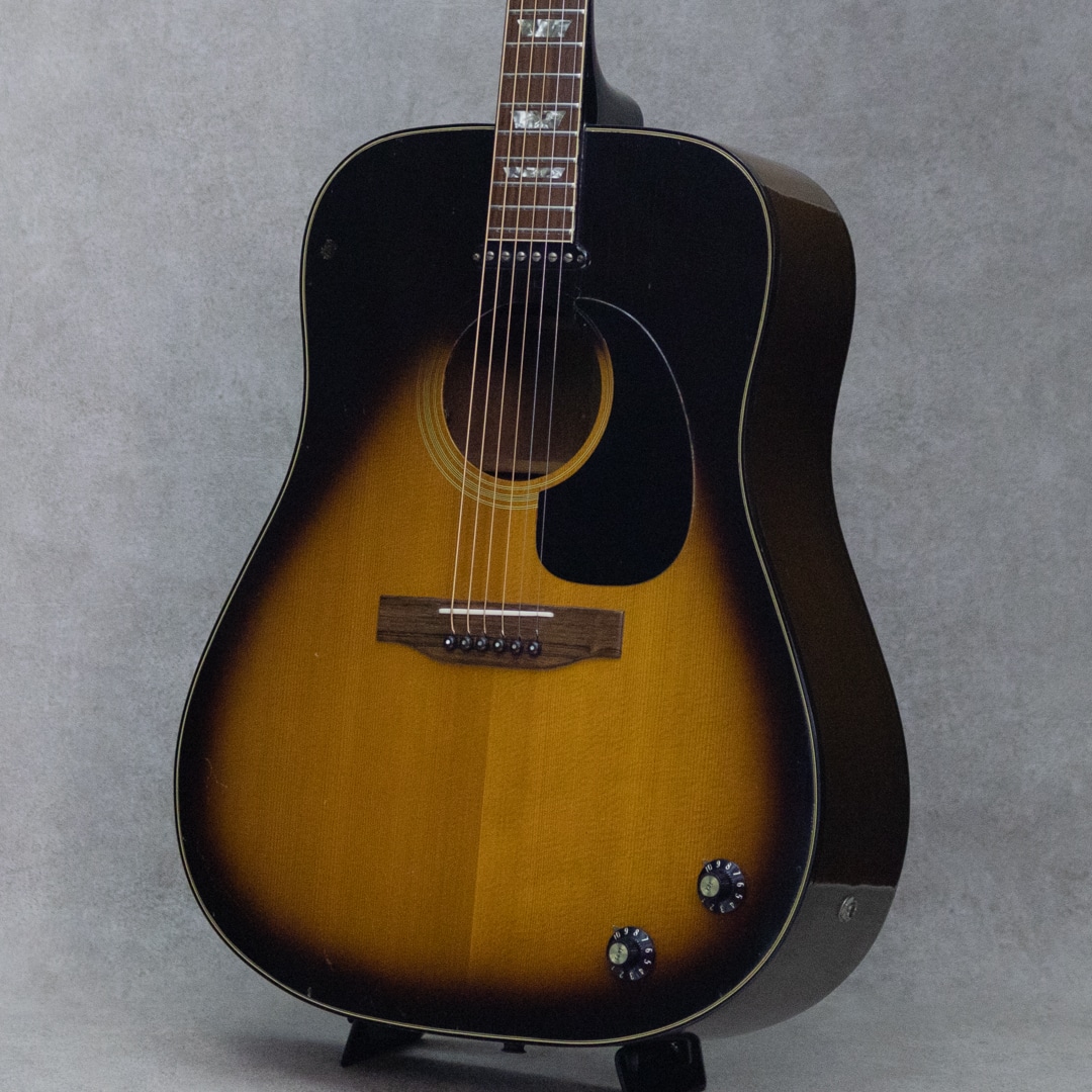 ジョン・レノンとジョージ・ハリスンがお揃いで入手したギター、ビートルズギアとしてあまりにも有名な機種である"J-160E"。1951年にアンサンブルの中でも音量で負けない様にと発表された世界で始めてピックアップが搭載されたフラットトップ"CF-100"。その基本コンセプトを受け継いだ"J-160E"は1954年に発表されました。70年代に入りスクエアショルダーに変更され、スモールガードに変更されルックスもイメージも変わりロックになった1本。本器は、イカリ肩のロックなフェイスを持つ70s”J-160E”。1976年製USED品。スプルーストップ、マホガニーサイド&バック、メイプル3ピースネック、ローズウッド指板&ブリッジ、オリジナル"クルーソンデラックス"ペグ、クラウンヘッドロゴインレイ、ディッシュパーロイド指板インレイ、オリジナルスモールピックガード、ローズウッドバインディング。15フレットジョイント、ワンボリュームワントーンのP-90、ナット幅約42.9mm、渋いタバコサンバースト。他のギブソンモデル同様にボディシェイプが変更され、ダブルXブレイシング構造とオールソリッドマテリアルを採用された本器。ゴシャっとした荒々しくワイルドなサウンドとルックス。掻き鳴らせばロックが止まらないがクールな1本。若干の小傷や一部タッチアップ補修が見られますが、全体的に美しいコンディションを保たれた本器。ネックコンディションも良好で弾きやすいアクションを保っています。後付けでL.R.Baggs i-Beam Activeが搭載されており、ボディサイドのジャックからはオリジナルP-90サウンドを、エンドジャックからはi-Beamサウンドをお楽しみいただけます。このルックスに惹かれる方も多い70s160E。グッドコンディションの1本、是非要チェックください。オリジナルハードケース付属。