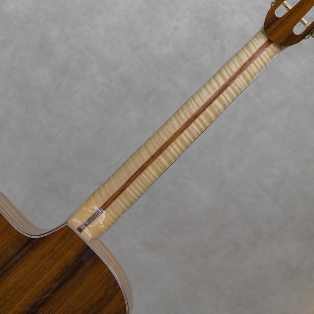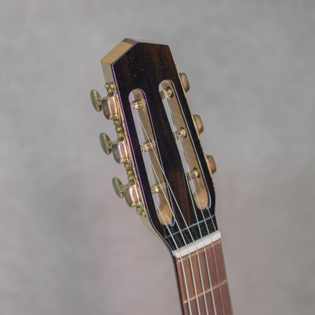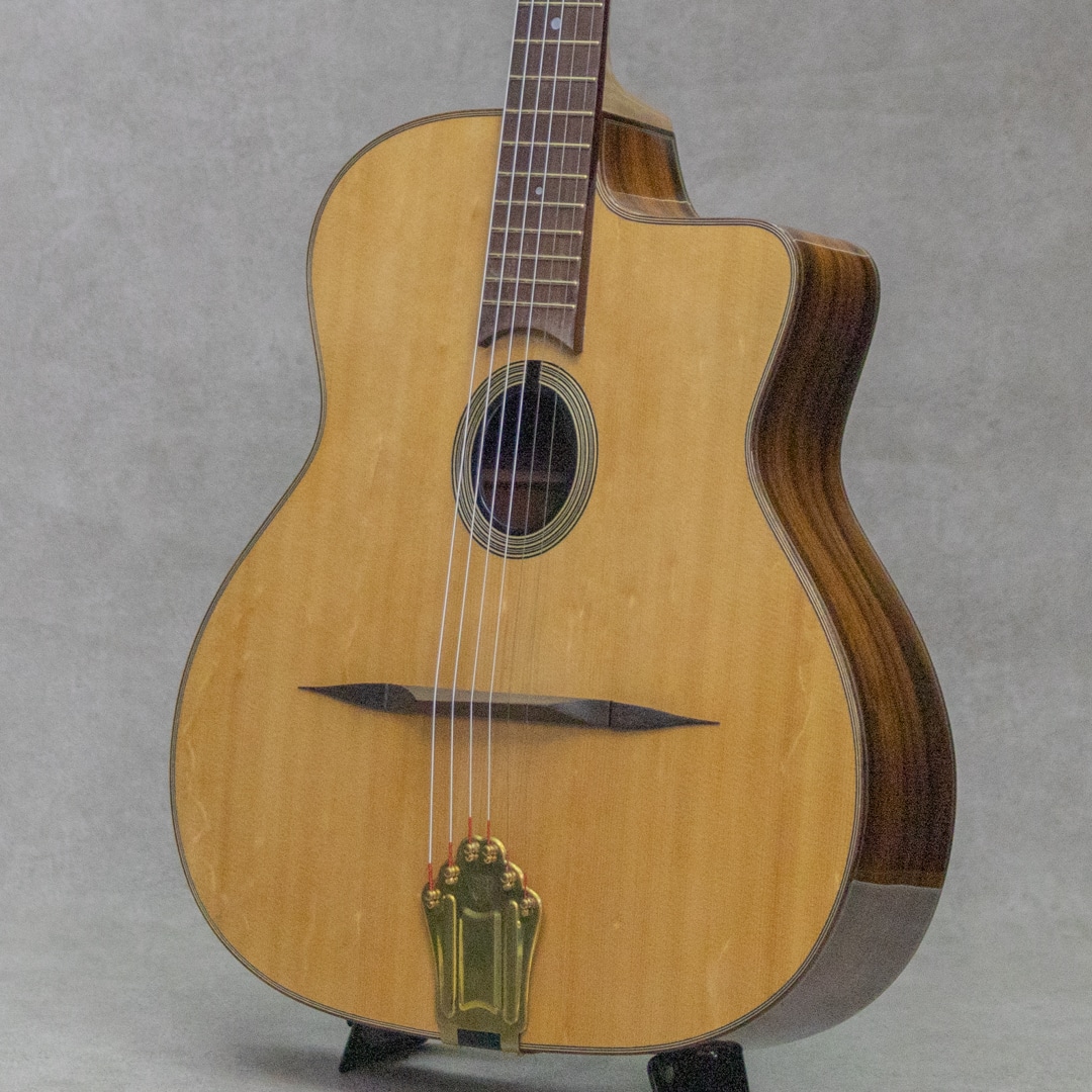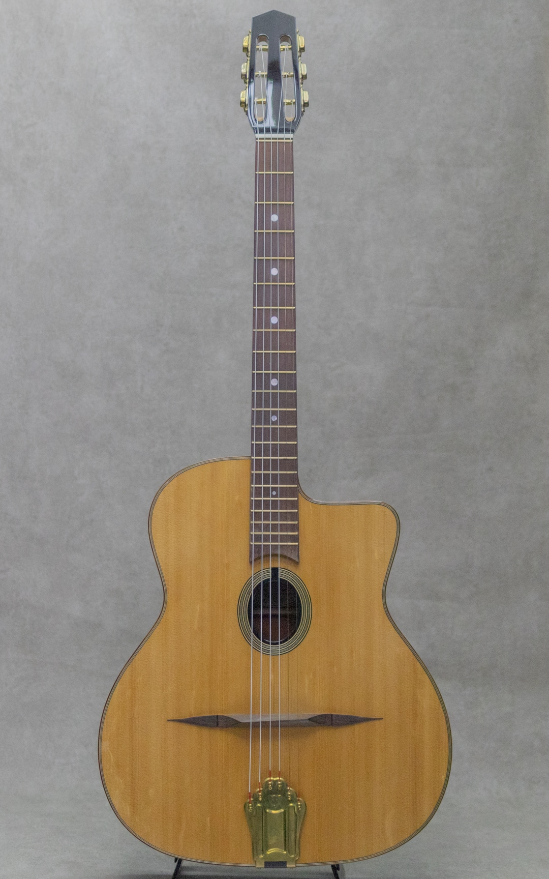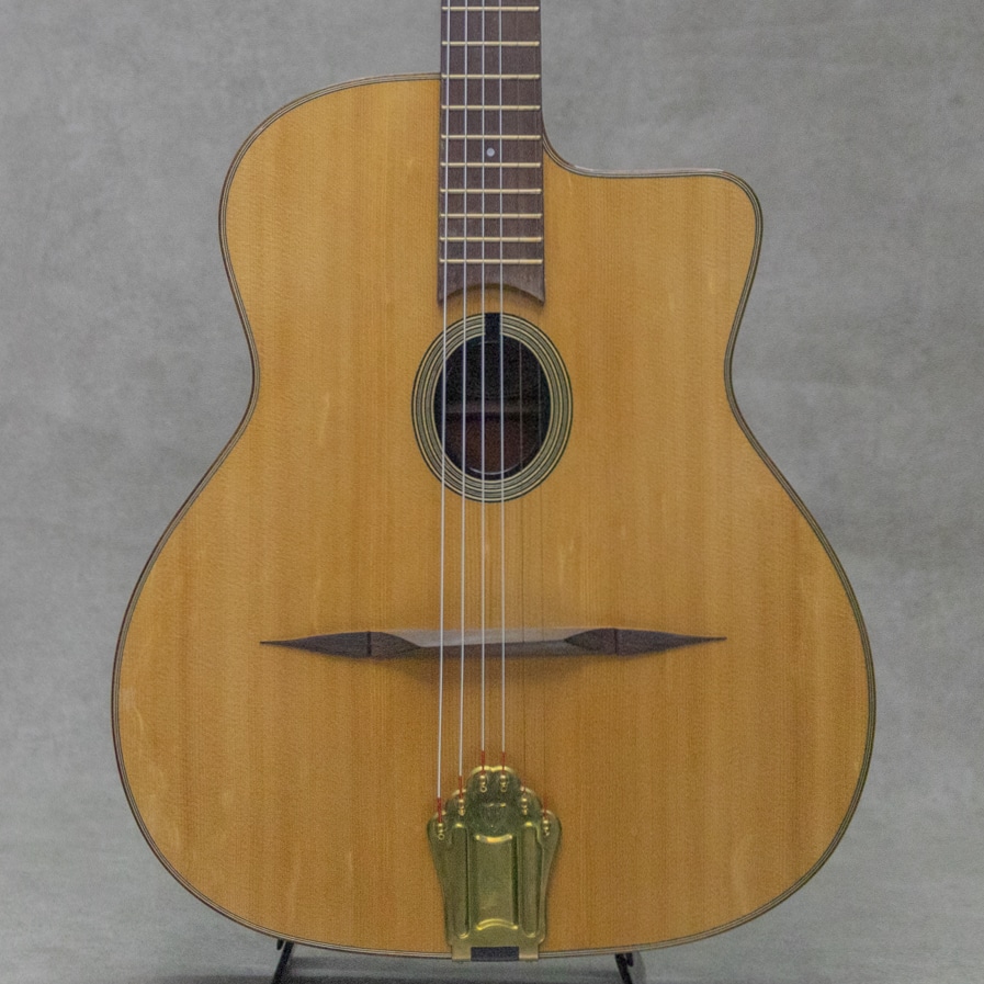 カナダはケベック州モントリオールにて製作する”Martin Tremblay(マーチン・トレンブレイ)”。1997年に初めてギター製作を行い、ジャズギターの修学と並行して製作を学びながらルシアーへの道への情熱を育みました。2002年に独立後は、同じカナダの大家である"Mario Beauregard(マリオ・ボーラガー)”の元でのアシスタント経験など、多くの経験を学びながら技術を磨き上げて来ました。現在はアーチトップ、フラットトップに加えマヌーシュジャズで使用されるセルマー/マカフェリタイプのギター製作も手掛けています。また、セルマー・マカフェリタイプのギターレストアにおいては北米でトップクラスの呼び声が高く、その技術は日々磨かれています。本器は、そんなMatinが敬愛するBusatoのモデルを踏襲した”Grand Mod?le-Busato Style”。サルベージシトカスプルーストップ、濃淡美しいパフェローをラミネイトで使用するサイド&アーチバック、マッカーサーエボニーを挟んだ美しいフレイム杢がびっしりと浮き出たシルバーメイプルネック、ホンジュラスローズウッド指板、ブサトリプロダクションタイルピース&ペグ。ブサトスタイルのピックガードも作製されており、ケース内に付属します。クリアで素早い立ち上がり。しっかりと肉付きする倍音。それでいてもたつきを感じさせないキレ。程よくドライなテイストのトーンは、くっきりはっきりと、そのタッチを大音量で再生してくれます。またハイフレットに行くにつれ大きくなるように錯覚する発音。リードプレイで物足りなさを感じさせないとても高いポテンシャルを秘めた1本です。数多くのレストアを経験するMartinだからこそ出来る完成度。Martin自身もプレイヤーなこともあり、彼が経験の中で好きだった特徴やスペックを盛り込んだ本格モデルの1本。是非、その完成度に触れてみてください。。TKL製ツイードハードケースが付属します。