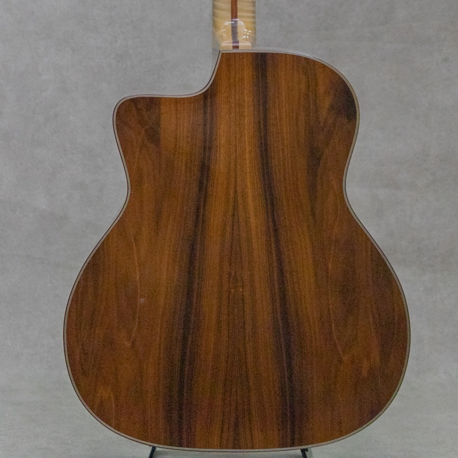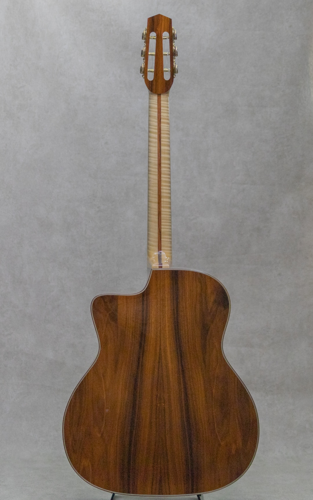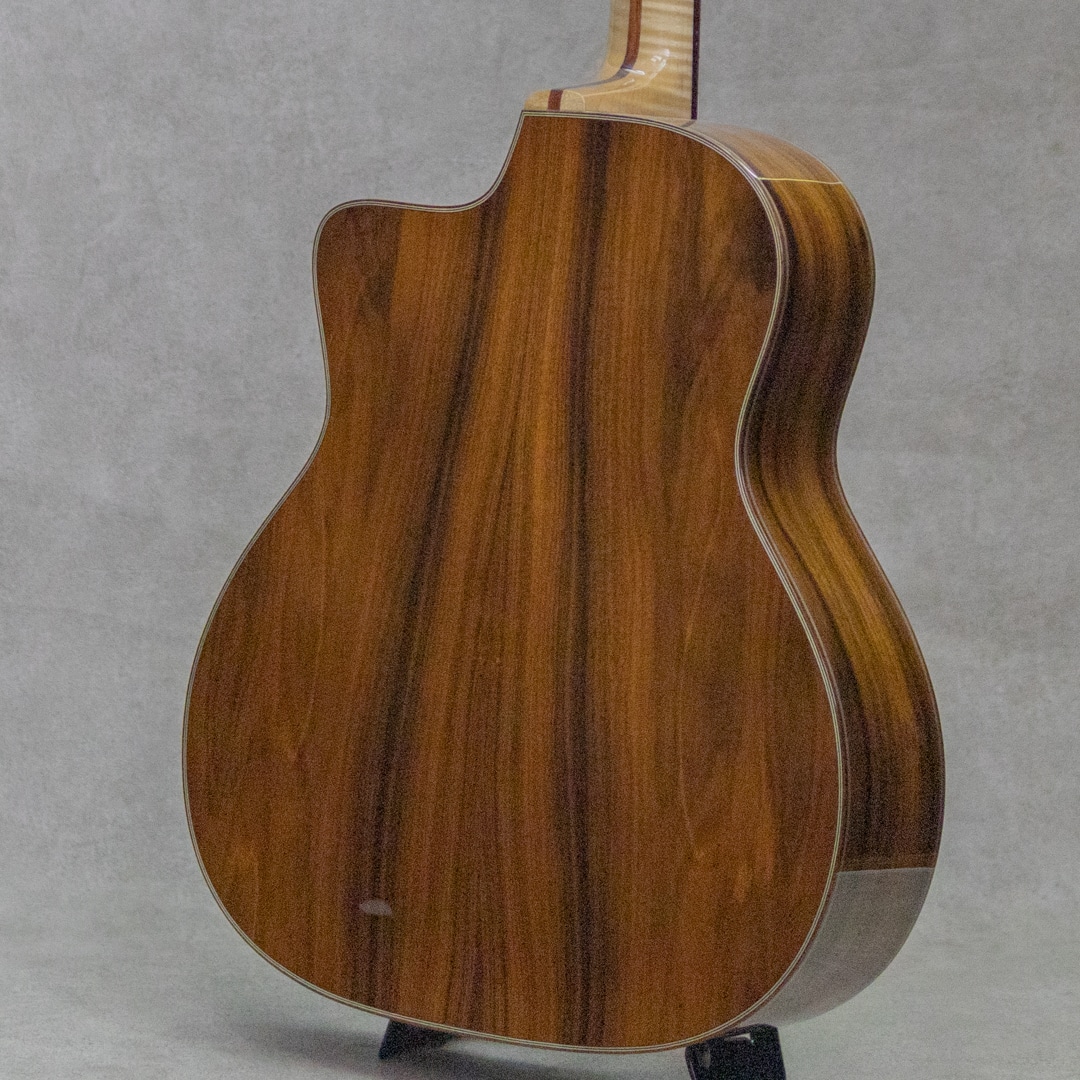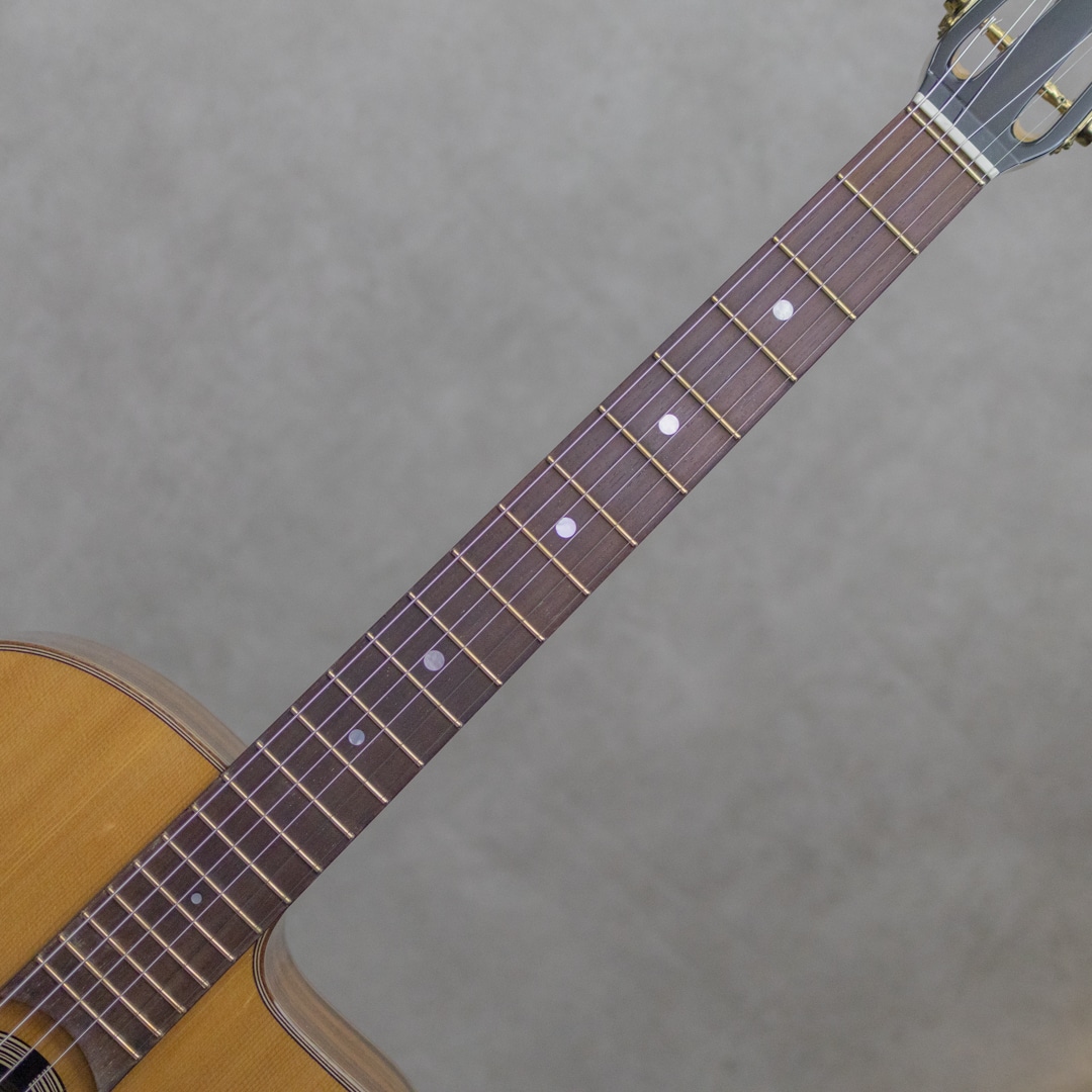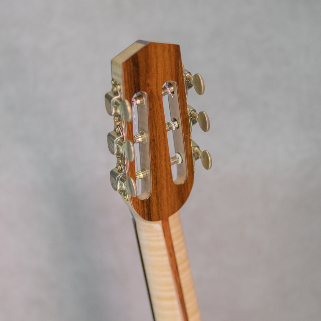 カナダはケベック州モントリオールにて製作する”Martin Tremblay(マーチン・トレンブレイ)”。1997年に初めてギター製作を行い、ジャズギターの修学と並行して製作を学びながらルシアーへの道への情熱を育みました。2002年に独立後は、同じカナダの大家である"Mario Beauregard(マリオ・ボーラガー)”の元でのアシスタント経験など、多くの経験を学びながら技術を磨き上げて来ました。現在はアーチトップ、フラットトップに加えマヌーシュジャズで使用されるセルマー/マカフェリタイプのギター製作も手掛けています。また、セルマー・マカフェリタイプのギターレストアにおいては北米でトップクラスの呼び声が高く、その技術は日々磨かれています。本器は、そんなMatinが敬愛するBusatoのモデルを踏襲した”Grand Mod?le-Busato Style”。サルベージシトカスプルーストップ、濃淡美しいパフェローをラミネイトで使用するサイド&アーチバック、マッカーサーエボニーを挟んだ美しいフレイム杢がびっしりと浮き出たシルバーメイプルネック、ホンジュラスローズウッド指板、ブサトリプロダクションタイルピース&ペグ。ブサトスタイルのピックガードも作製されており、ケース内に付属します。クリアで素早い立ち上がり。しっかりと肉付きする倍音。それでいてもたつきを感じさせないキレ。程よくドライなテイストのトーンは、くっきりはっきりと、そのタッチを大音量で再生してくれます。またハイフレットに行くにつれ大きくなるように錯覚する発音。リードプレイで物足りなさを感じさせないとても高いポテンシャルを秘めた1本です。数多くのレストアを経験するMartinだからこそ出来る完成度。Martin自身もプレイヤーなこともあり、彼が経験の中で好きだった特徴やスペックを盛り込んだ本格モデルの1本。是非、その完成度に触れてみてください。。TKL製ツイードハードケースが付属します。