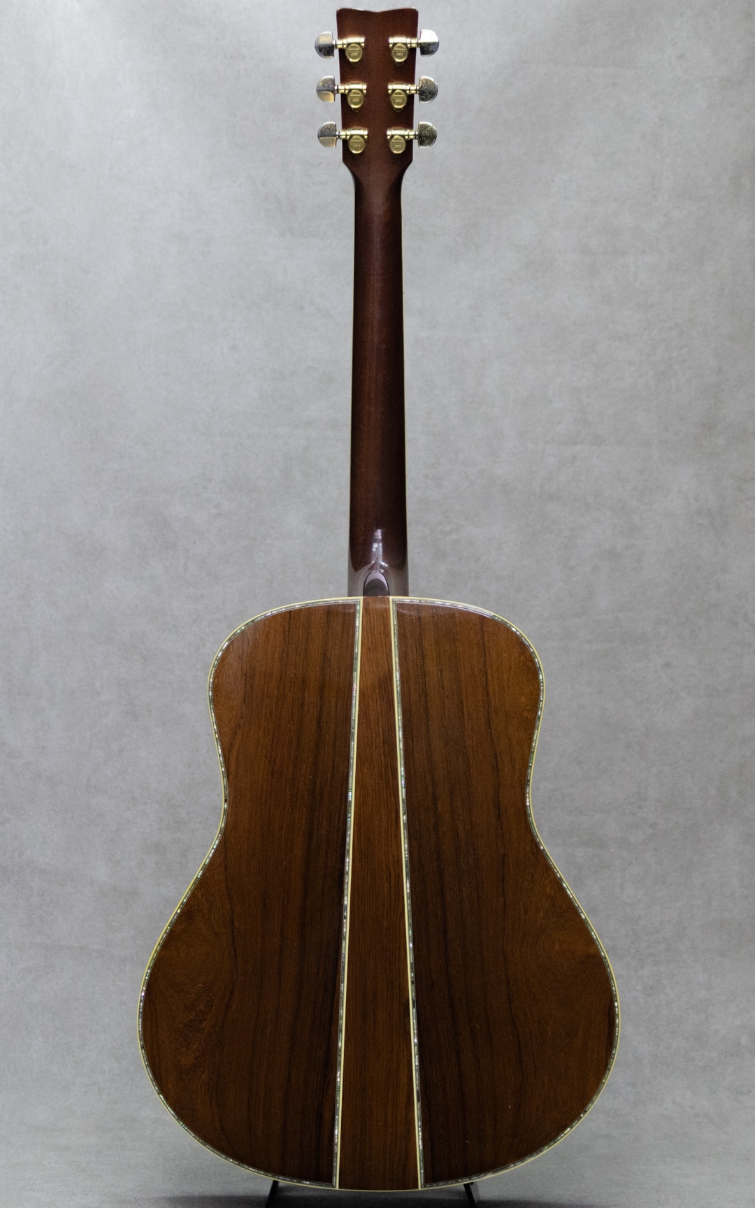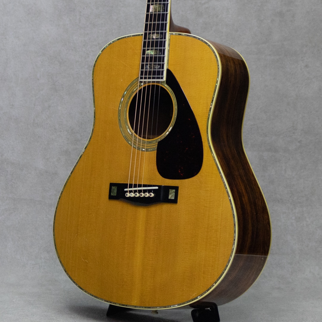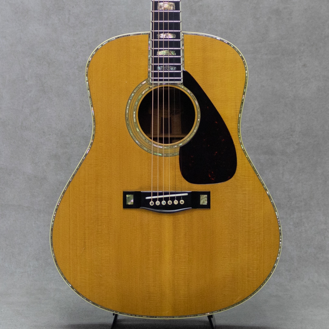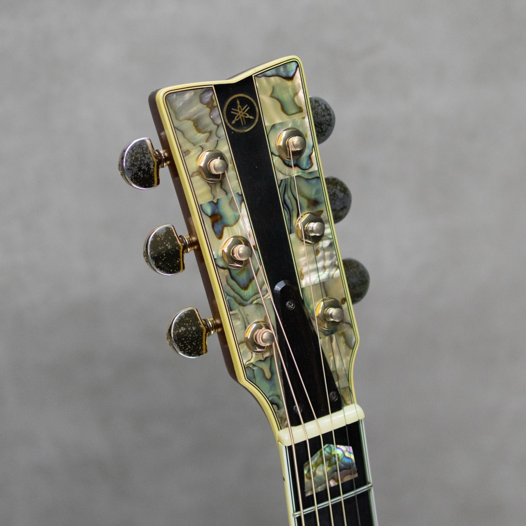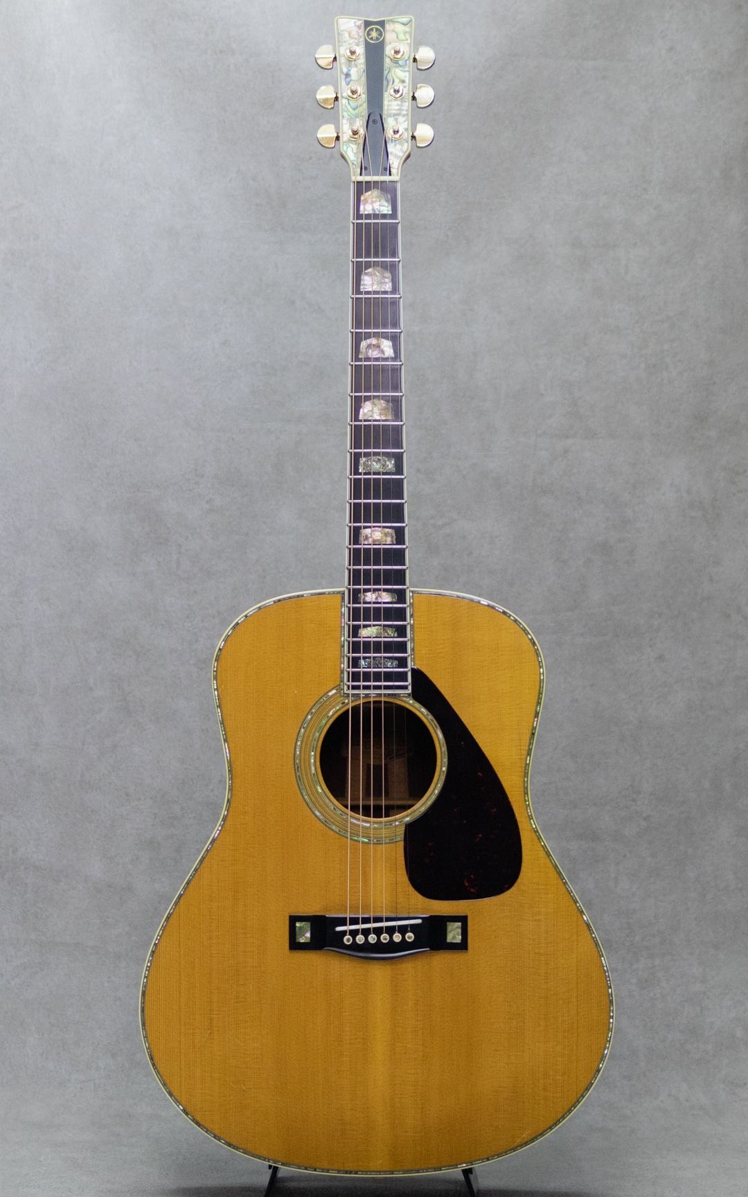 現在に至るまでその血脈を残すヤマハを代表するギターとして、数多くの一流アーティストをはじめ、多くのギターファンに愛されてきたLシリーズ。その歴史は遡ること50年前に端を発し、1974年に発売された”L-31”にてヤマハカスタムモデルが幕開けします。それまでに発売されていた高級モデル”FG”シリーズ”FG-1500”・“FG-2000”の上位機種として開発され、"L=Luxury(豪華)"を冠にした本シリーズは、時代のミュージックシーンを彩り、数多くのアーティストやギターファンに愛され、日本の音楽シーンを支えてきました。1975年に発売されたL四天王"L-51”・"L-52”・"L-53”・"L-54”はその中でも、数多くのミュージシャンを魅了しカスタムモデルのベースにもなった、”L”を語る上では外せないカスタムモデルです。本器は"L-53 Custom Jacaranda”、1981年製の1本。L四天王の純血を注ぐ後継器で、当時の音楽環境へよりマッチングするようにリデザインされ、1980年よりモデルチェンジしラインナップされました。柾目杢眩い高級エゾ松トップ、大きく柾目に配された高級ハカランダをサイド&バックに使用、バックはハカランダの3ピース構造です。マホガニーネック、黒檀指板&ブリッジ、メキシコアワビ貝を贅沢に配したヘッド装飾、メキシコアワビ貝指板&ブリッジインレイ、TM-30Gペグ、べっ甲柄ピックガード、メキシコ貝インレイトリム&ロゼッタ。四天王”L-53”の目を引く華やかなシェルインレイデザインを大きく引き継ぎながら、そのサウンドは新たにデザインされた後期”L-53”。アグレッシブで真っ直ぐと突き抜けるヤマハLサウンド。よりクリアーで遠逹するトーンは、芯がありきらびやかで、”L"らしいゴージャスな響き。少しクローズドレンジにリデザインされ、より濃密に、パワフルに、真っ直ぐに、響いてくれます。時に甘く艶やかに、時に轟々しく骨太に、プレイヤーのタッチを豊富なポテンシャルで表現してくれます。米国産ギターでは決して味わえないダイナミクスレンジに富んだ表情豊かな響きを魅せ、ジャパニーズサウンドここにありと芯から感じさせる1本です。使用に伴うピッキングウェアや幾らかの小傷は見られますが、ノンクラック&オリジナルフィニッシュを保った極上サウンドの本器。TM-30Gもしっかりと光沢を保っており美しい外観を助長しています。ネック周りのコンディションも素晴らしく、弾きやすいアクションをしっかりと保っています。愛でるもよし、かき鳴らすもよし、共に呑むもよし。憧れのテリー中本氏のサイン入り期のヤマハハカランダモデル、是非要チェックください。オリジナルカスタムハードケース付属