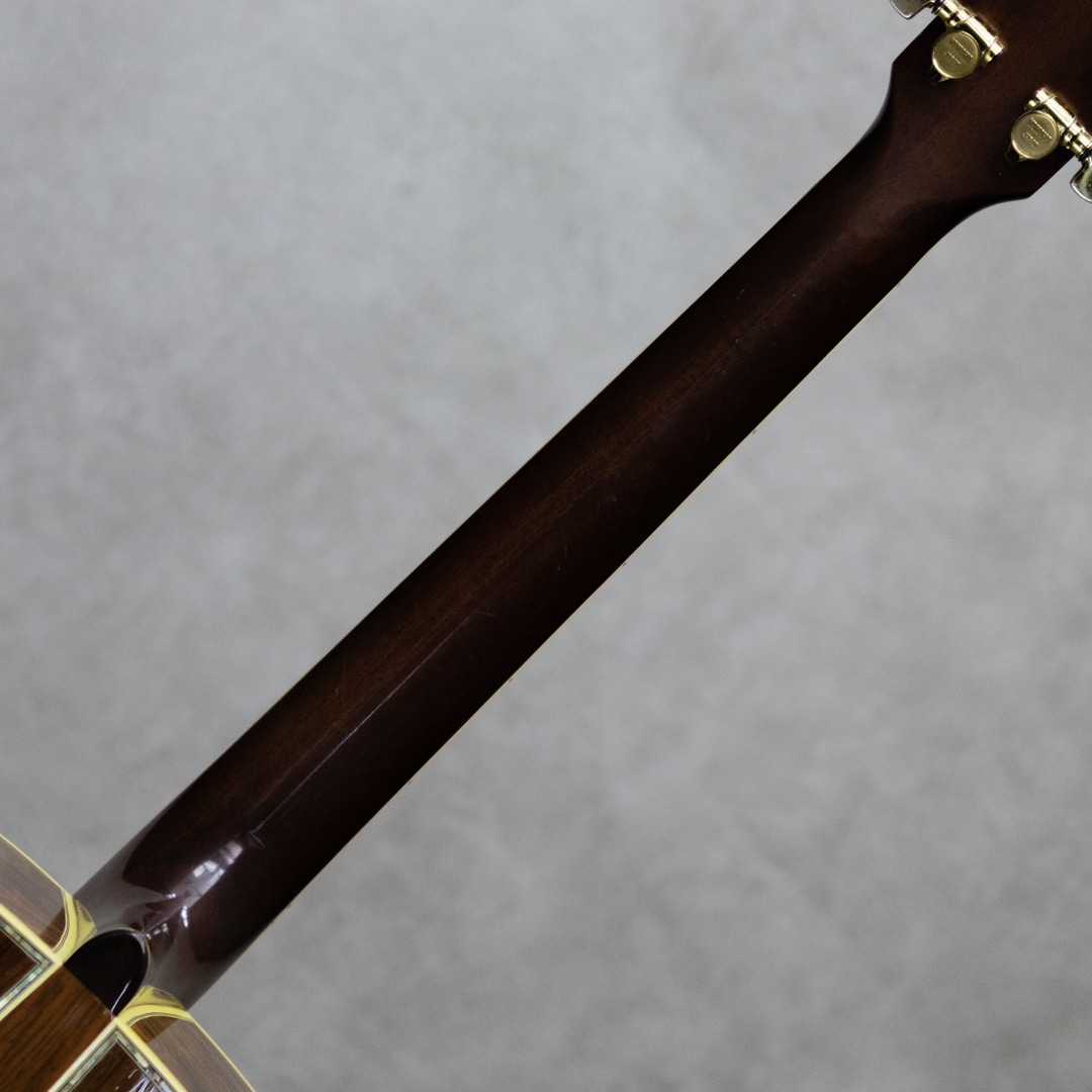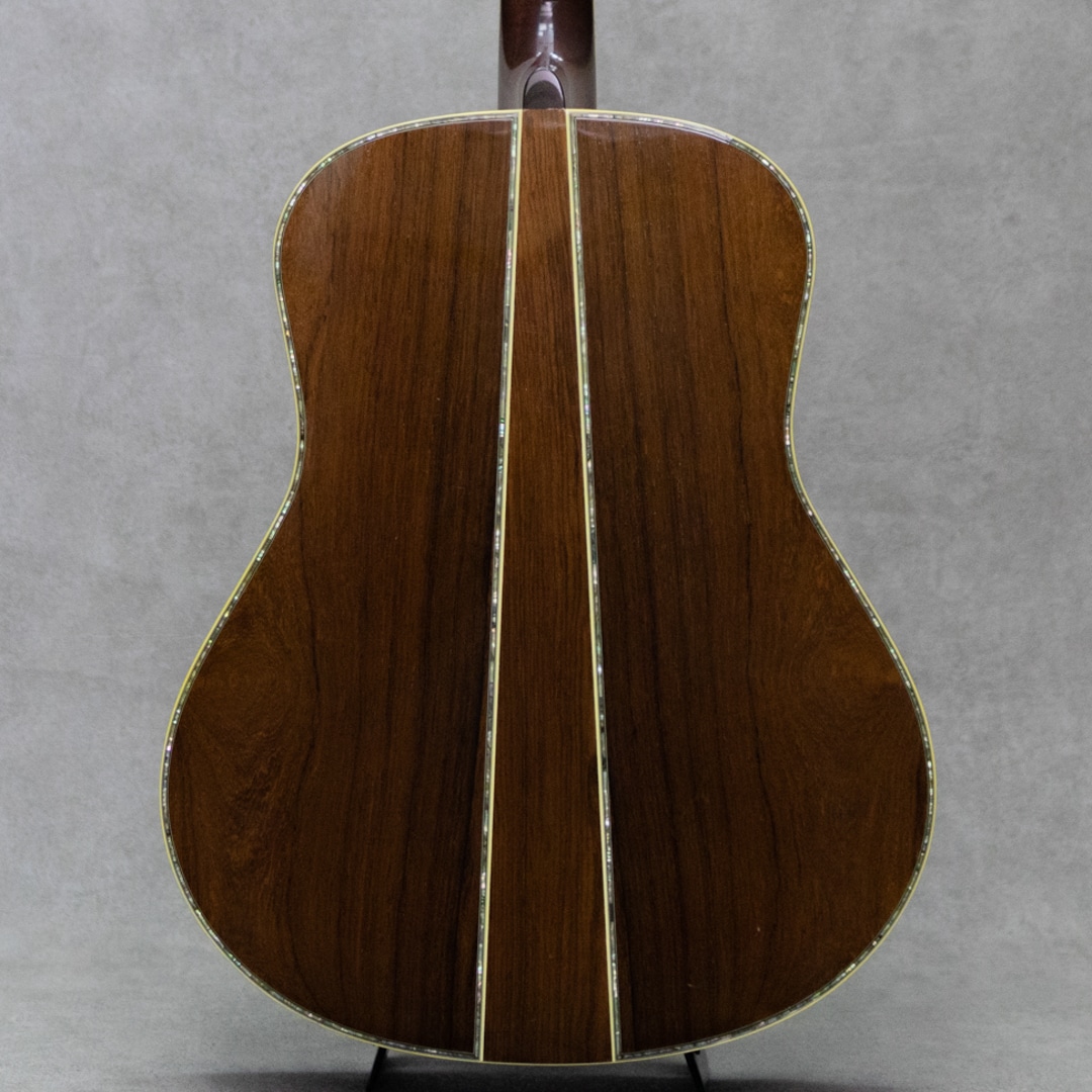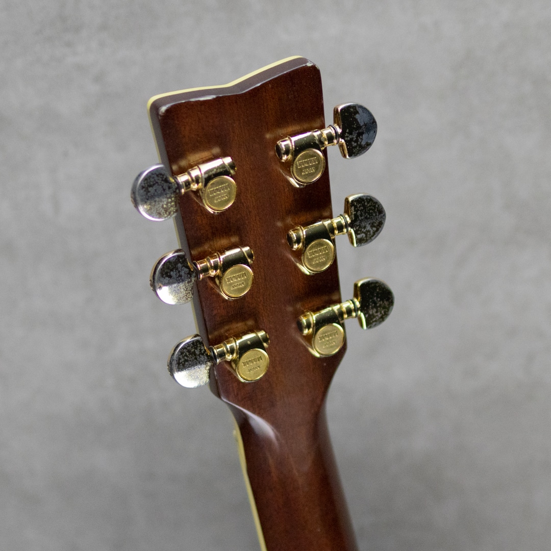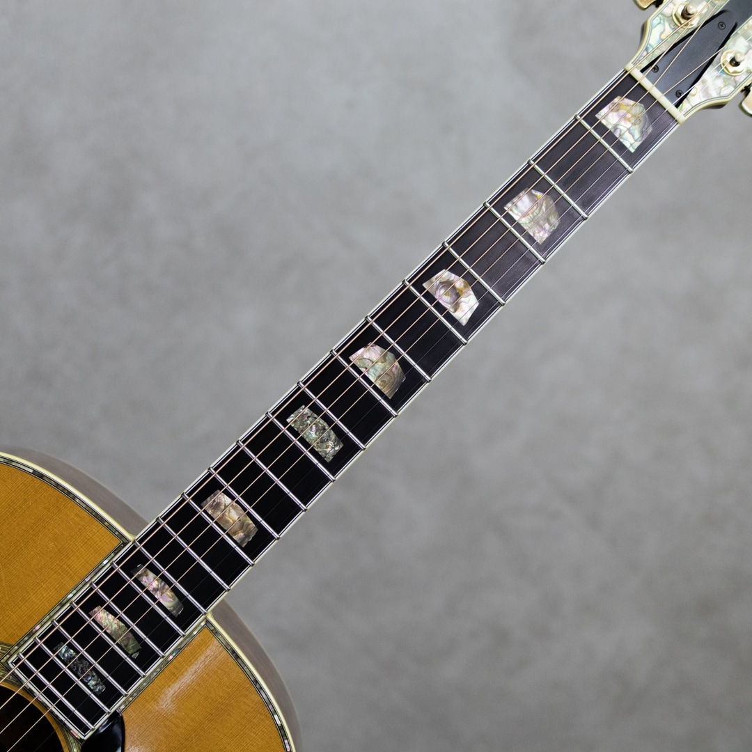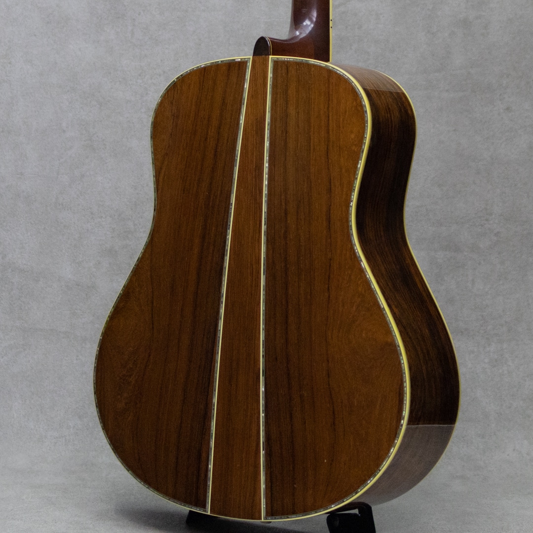現在に至るまでその血脈を残すヤマハを代表するギターとして、数多くの一流アーティストをはじめ、多くのギターファンに愛されてきたLシリーズ。その歴史は遡ること50年前に端を発し、1974年に発売された”L-31”にてヤマハカスタムモデルが幕開けします。それまでに発売されていた高級モデル”FG”シリーズ”FG-1500”・“FG-2000”の上位機種として開発され、"L=Luxury(豪華)"を冠にした本シリーズは、時代のミュージックシーンを彩り、数多くのアーティストやギターファンに愛され、日本の音楽シーンを支えてきました。1975年に発売されたL四天王"L-51”・"L-52”・"L-53”・"L-54”はその中でも、数多くのミュージシャンを魅了しカスタムモデルのベースにもなった、”L”を語る上では外せないカスタムモデルです。本器は"L-53 Custom Jacaranda”、1981年製の1本。L四天王の純血を注ぐ後継器で、当時の音楽環境へよりマッチングするようにリデザインされ、1980年よりモデルチェンジしラインナップされました。柾目杢眩い高級エゾ松トップ、大きく柾目に配された高級ハカランダをサイド&バックに使用、バックはハカランダの3ピース構造です。マホガニーネック、黒檀指板&ブリッジ、メキシコアワビ貝を贅沢に配したヘッド装飾、メキシコアワビ貝指板&ブリッジインレイ、TM-30Gペグ、べっ甲柄ピックガード、メキシコ貝インレイトリム&ロゼッタ。四天王”L-53”の目を引く華やかなシェルインレイデザインを大きく引き継ぎながら、そのサウンドは新たにデザインされた後期”L-53”。アグレッシブで真っ直ぐと突き抜けるヤマハLサウンド。よりクリアーで遠逹するトーンは、芯がありきらびやかで、”L"らしいゴージャスな響き。少しクローズドレンジにリデザインされ、より濃密に、パワフルに、真っ直ぐに、響いてくれます。時に甘く艶やかに、時に轟々しく骨太に、プレイヤーのタッチを豊富なポテンシャルで表現してくれます。米国産ギターでは決して味わえないダイナミクスレンジに富んだ表情豊かな響きを魅せ、ジャパニーズサウンドここにありと芯から感じさせる1本です。使用に伴うピッキングウェアや幾らかの小傷は見られますが、ノンクラック&オリジナルフィニッシュを保った極上サウンドの本器。TM-30Gもしっかりと光沢を保っており美しい外観を助長しています。ネック周りのコンディションも素晴らしく、弾きやすいアクションをしっかりと保っています。愛でるもよし、かき鳴らすもよし、共に呑むもよし。憧れのテリー中本氏のサイン入り期のヤマハハカランダモデル、是非要チェックください。オリジナルカスタムハードケース付属