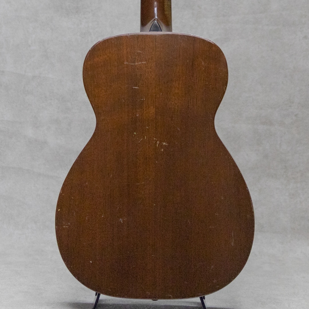 オールマホガニーボディの"O-17"。オールマホガニーならではの独特なトーンは、枯れたニュアンスが特徴的で、小柄ながらにしっかりとした音量と甘く分離の良い快活なサウンドは、多くのプレイヤーを魅了する人気なスタイルの1本。本器は1936年製Vintage品。オールマホガニーボディ、14Fジョイント、マホガニーネック、スチールTバーネックロッド、ハカランダ指板&ブリッジ、べっ甲柄セルロイドピックガード、グローバークリップドエンドG93ペグ、スキャロップドXブレイシング。小振りながら音量感ある1本。Oならではの少し深胴のボディからは、しっかりと低音まで響くサウンドを放ってくれます。倍音感溢れる甘くファットな響きで、特有のレンジ感とプリウォーマーチンならではのレスポンスを存分に楽しんでいただける本器。マホガニートップならではの短めのサスティンは、味わい深いノスタルジックな響きを味わせてくれます。表面的な小傷やヘッド部の軽微なタッチアップなどは見られますが、ノンクラック&オリジナルフィニッシュのグッドコンディションを保った1本。ネック周りもとても良好で、弾きやすいアクションをしっかりと保っています。価格高騰と共にますます出回りの少なくなるプリウォーモデル、グッドコンディションの1本。是非要チェックください。ハードケース付属。