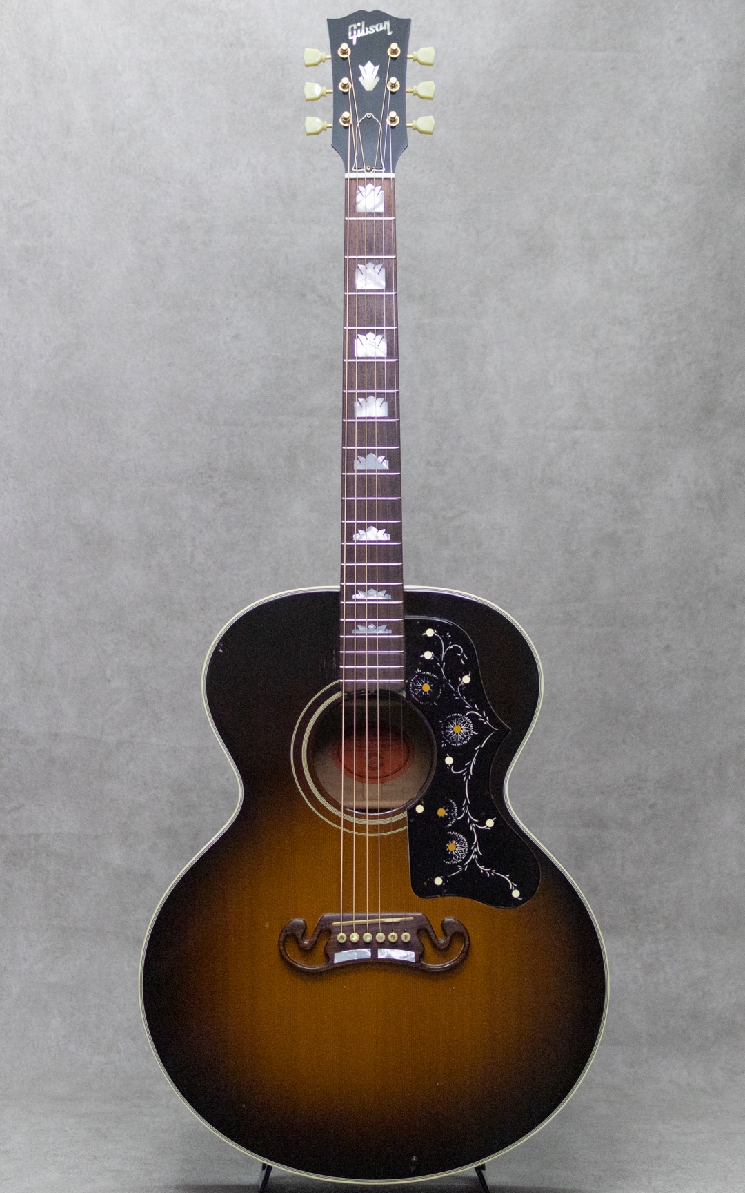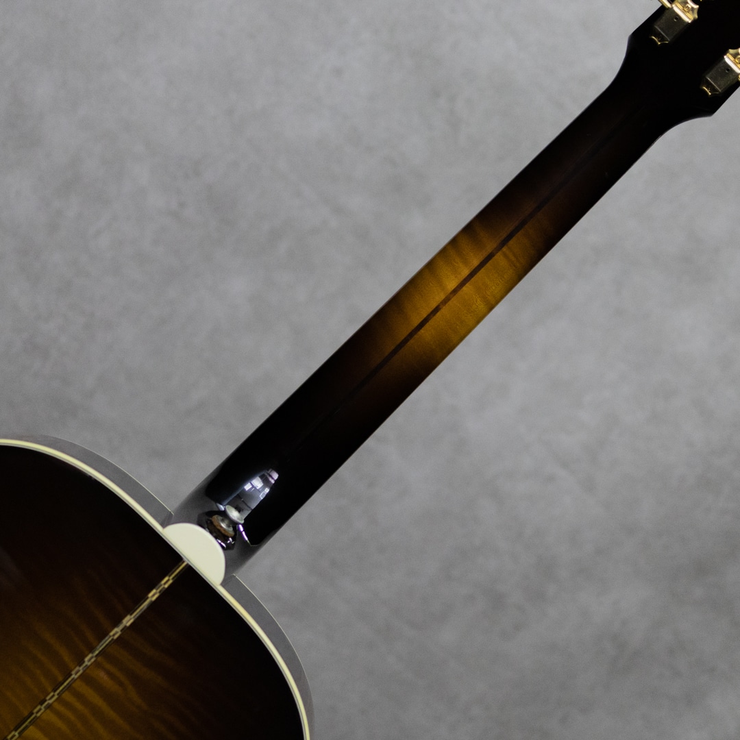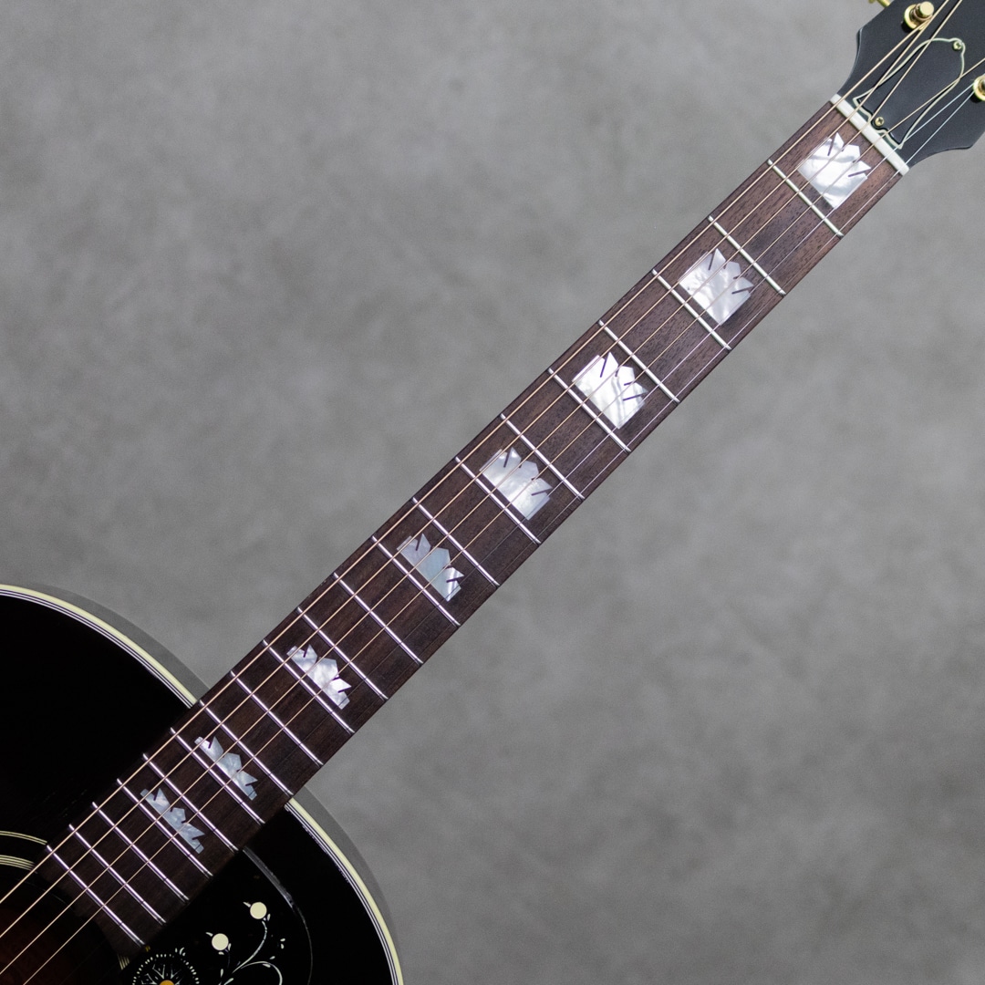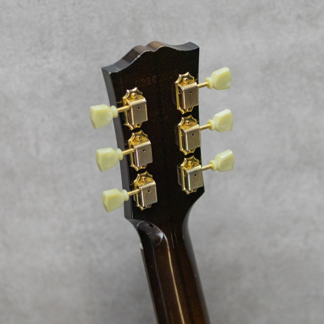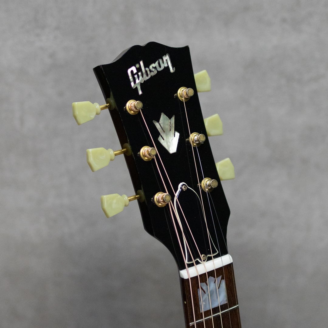 1991年に登場して以来、その愛らしくも豪華なルックスに魅了されたプレイヤーも多いJ-200Junior。絶大な人気を誇り、キング・オブ・フラットトップとまで言われるスーパージャンボモデルJ-200の絢爛な作りを、J-185と同じ16インチのボディまで縮小させた仕様のモデル。ソリッドシトカスプルーストップ、メイプルサイド&バック、美しくフレイムの映えるメイプルネック、ローズウッド指板&ムスタッシュブリッジ、クラウンパール指板インレイ&ヘッドロゴ、クルーソンペグ。ジャンボボディのJ-200を小ぶりにしたサイズの本器。17インチのJ-200よりも音の立ち上がりや反応性に優れ、低音から高音までのトーンバランスが整った特性を持ちます。J-200譲りの音の迫力や豊かなボリュームも持ち合わせたパワフルなサウンド。重厚さを感じられる低音域にキラキラと伸びやかな高音域、見た目通りのゴージャスさとギブソンらしい無骨さが同居した魅力を持つギター。J-200に比べ抱えやすいのも大きな魅力の一つです。こちらトップにはポツポツと小さな打痕、弾き傷等多少あるものの顕著に外観を損ねるものはございません。板の割れも無く良好なマテリアルコンディション。ロッドの調整を含めネックも良い状態で気持ちよくプレイしていただけます。現在では製造されていない為、見かけることが少なくなったモデル。お探しだった方はお早めにご検討下さい。オリジナルハードケース付属。