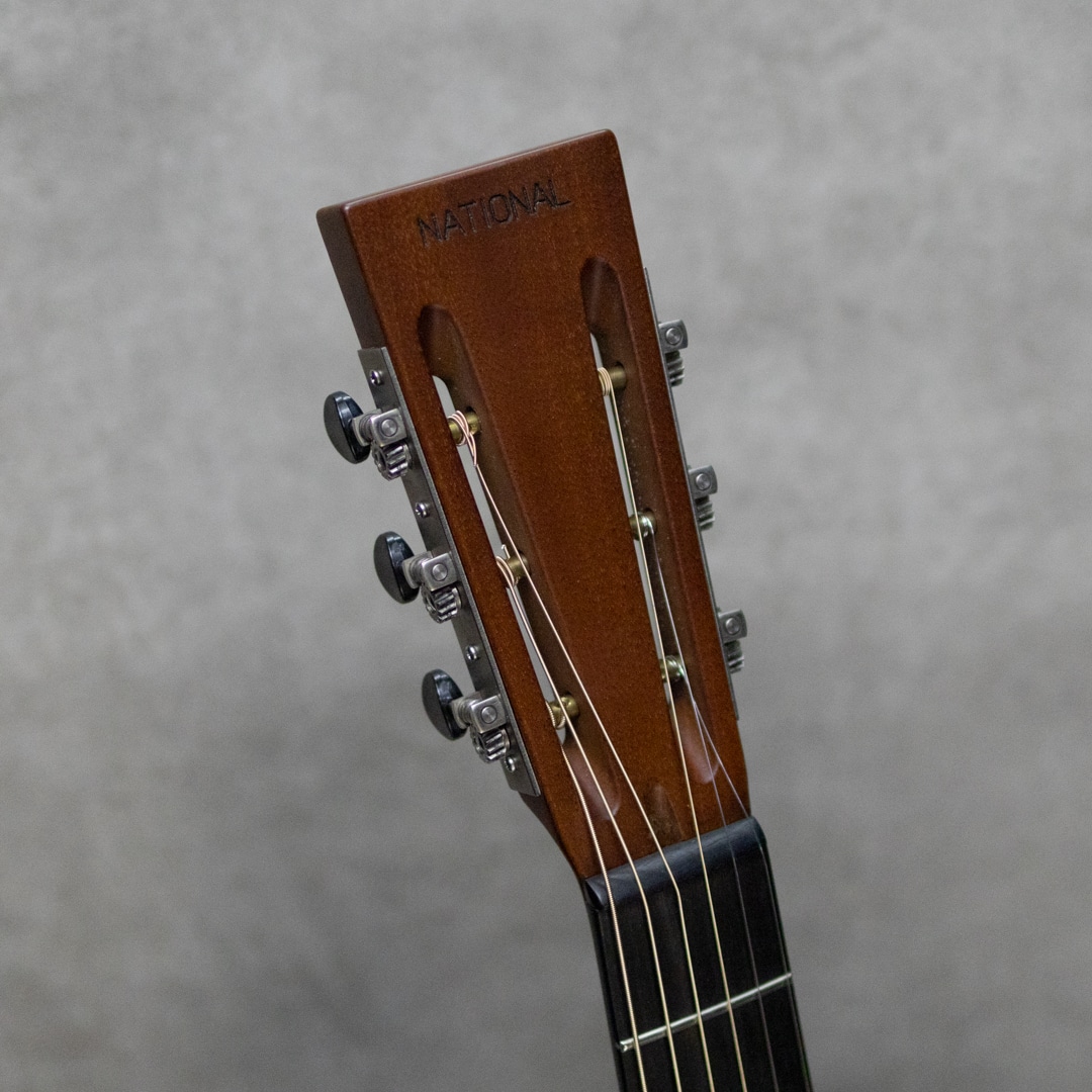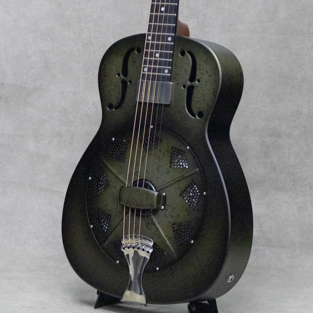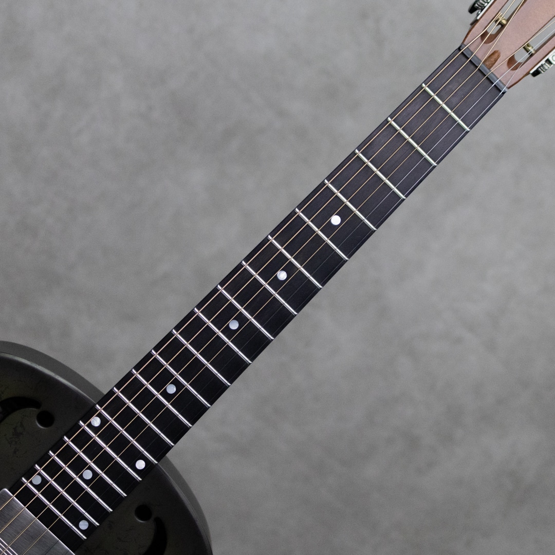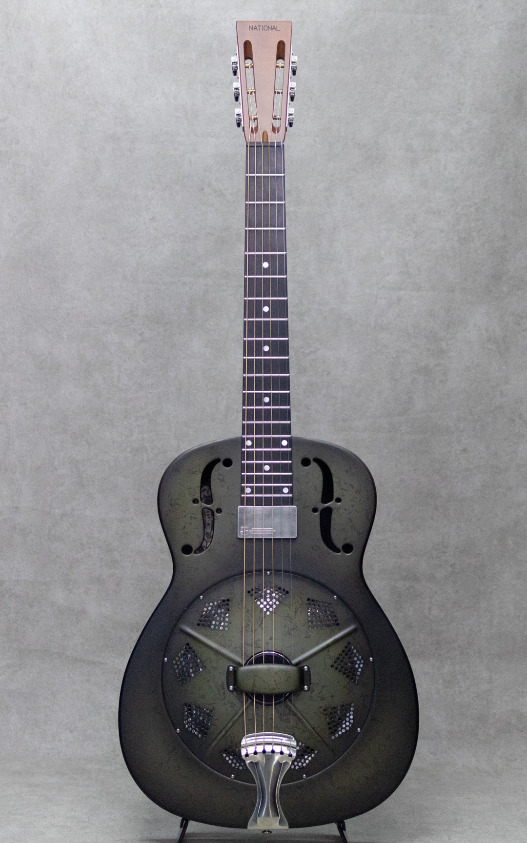 1932年設立のリゾネーターギターの雄ナショナル。管楽器やピアノの音量に負けないギターを目指し開発された"リゾネーターギター"は、その後のエレキギター台頭により影を薄めるものの、ブルース、カントリー、ハワイアン、ブルーグラス等のジャンルにおいては、古き良きアメリカの郷愁を誘うルックスとサウンドが永く支持をされ続けています。ナショナルギター社は四十年代に一度倒産してしまいましたが、1988年にナショナル・リゾフォニック・ギターズ(National Reso-Phonic Guitars, Inc)として復活し、今も現代品に触れることができます。本器NRPは、ボディトップに1つの共鳴板を持つ構造"シングルコーン"タイプ。1930年に登場したベーシック機種"Duolian"を復刻したモデル。スロテッドヘッド、マホガニーネック、エボニー指板、スチール製ボディ。スチール製のボディは無骨でアーミーな印象もある"Black Rust"カラーにて現代的ルックスに。また本器は、オプションでNational Slimlineピックアップを搭載、アンプ等への出力も容易の為ライブギア等としても即戦力です。ボンっと野太いアタックの効いた単音単音はメタルボディによる独特にミドルの効いたラウドなトーンを持ち、無骨に響く音量感をもって泥臭くブルージーに"あの音"を存分に楽しめる一本。クリアな出力のピックアップによって本体のキャラクターを十二分にアンプから出力も可能。こちら極細かな擦れ等はあるものの、ほとんど使用感を感じさせない程の美品コンディション。ネックの調整を含め各所コンディションも良好で、新品同様の演奏性でお楽しみいただけます。国内での取扱数も少なく、なかなか手にできる機会も少ないナショナル。ぜひお見逃しなく。オリジナルハードケースが付属。