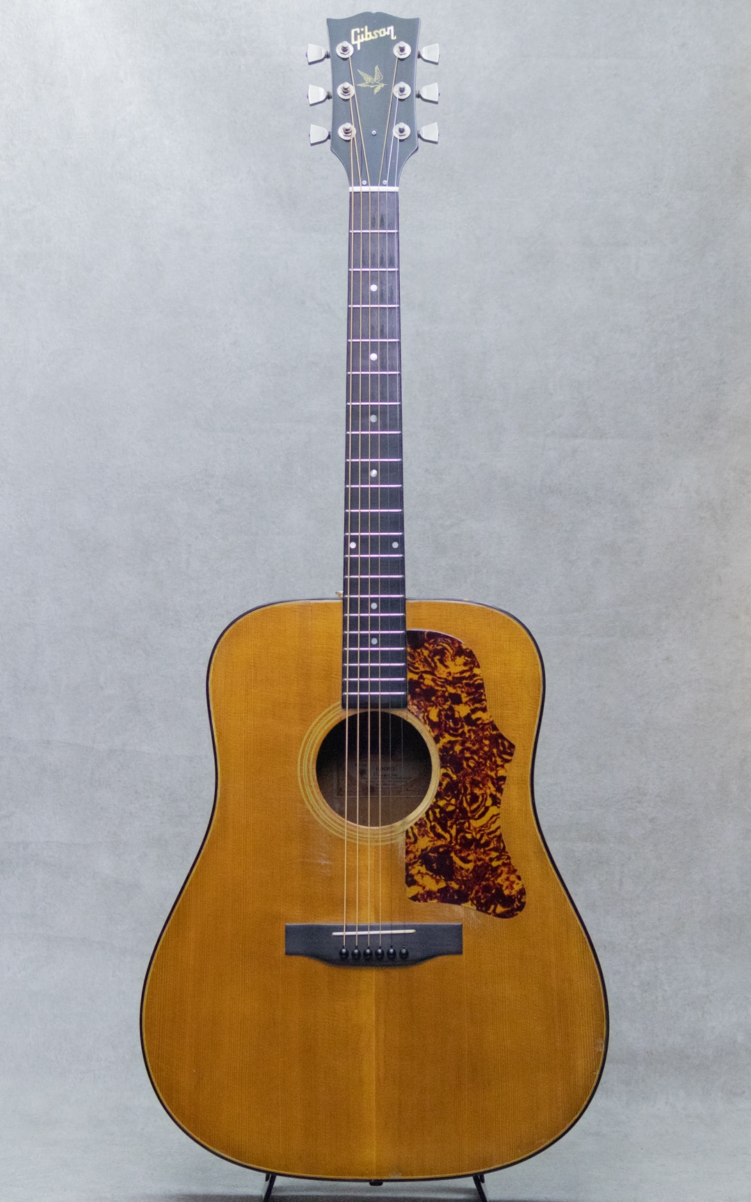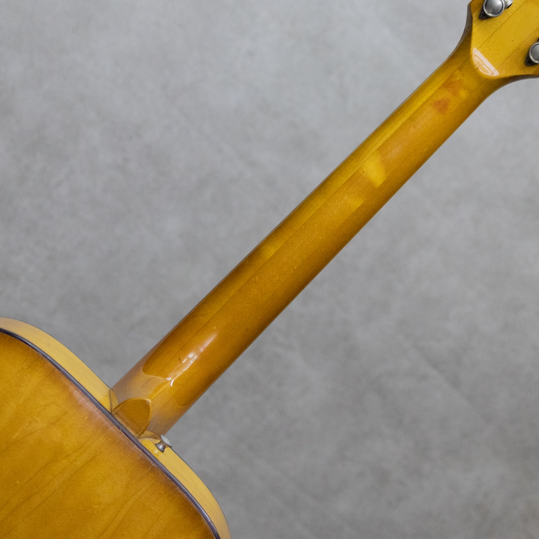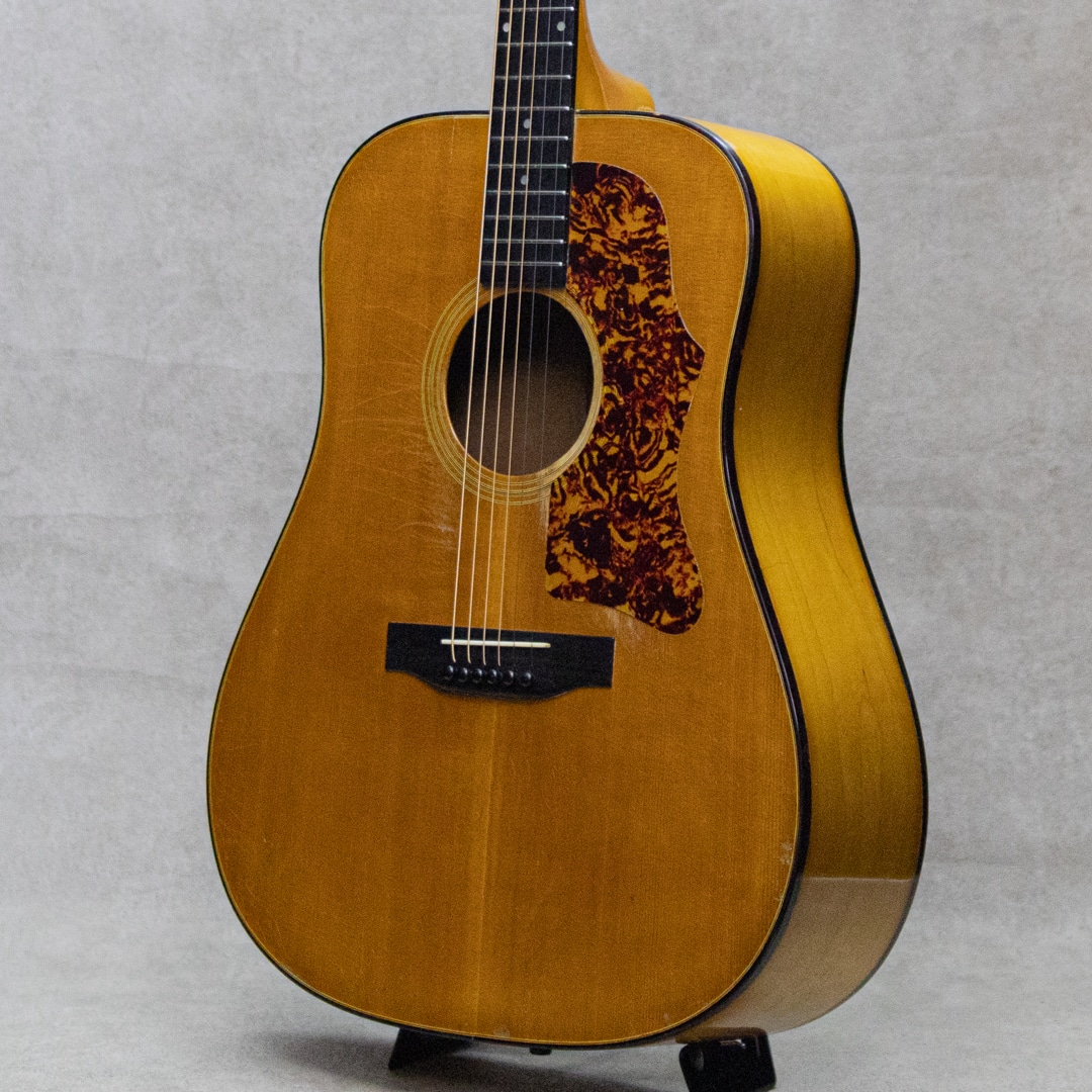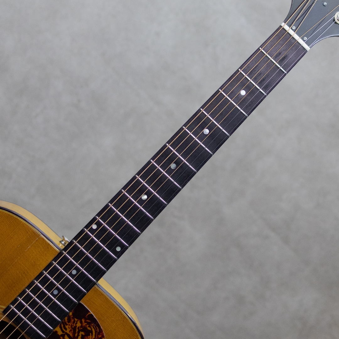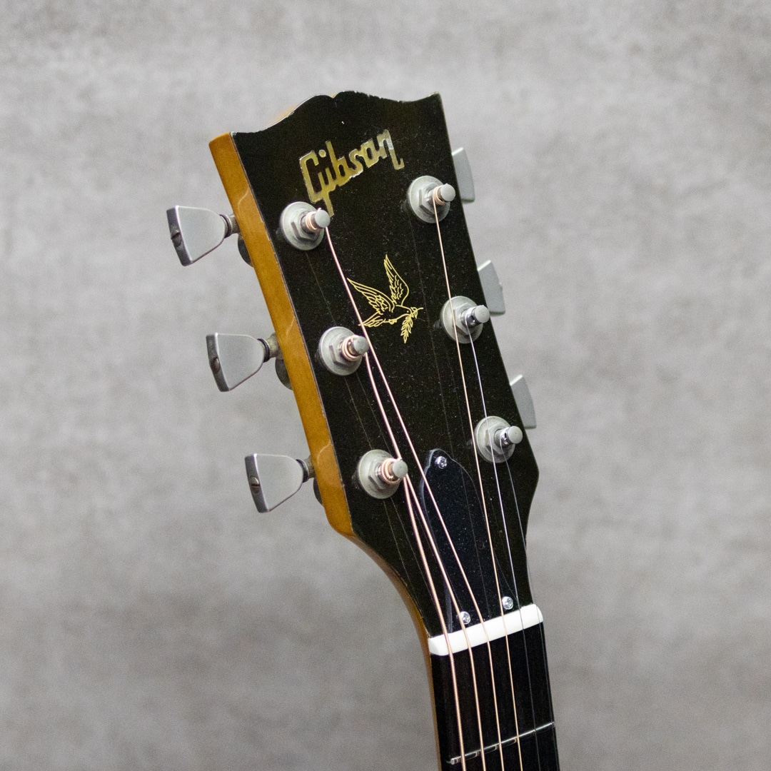スクエアショルダーボディにアーチバック構造を持つ”Gospel”。1973年から1979年までの7年間のみと言う短い期間に製造されていたレアモデルのひとつ。ミュージシャン使用もあり、根強い人気を持つモデルです。本器は、1974-75年頃製USED品。スプルーストップ、ラミネイトメイプルサイド&バック、メイプル3ピースネック、ローズウッド指板&ブリッジ、オリジナルグローバー"ミルクボトル"ペグ、ドット指板インレイ、ポインッテッドラージピックガード、セルロイドバインディング。ゴスンっと響くアーチバックメイプルからなる分厚くパンチのあるロックなサウンドの本器。かき鳴らしたくなる迫力のあるサウンドで、倍音あふれる音量感のある1本です。この時期のセルロイドバインディングはボロボロになりやすく、本器ではキレイに巻き直しがされていますので安心してご使用いただけます。また、トップ指板まわり6弦側にヘアラインクラックとサウンドホール部のクラックが見られますが、いずれもパッチを当てて丁寧にリペアされています。しっかりと弾き込まれており、ピッキングウェアが見られますが、汚らしい印象は受けず貫禄の外観の本器。この年代のギブソンならではの少し高めのアクションですが、ネックコンディションは良好でサドルマージンも少し余裕が残されています。なかなか出回りのない”Gospel”。この機会に要チェックください。ハードケース付属。