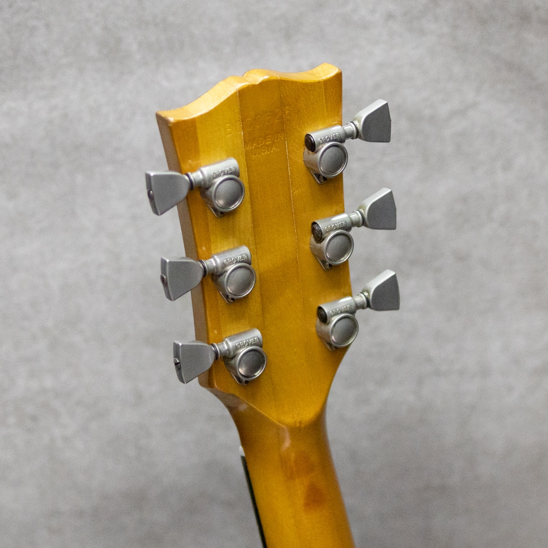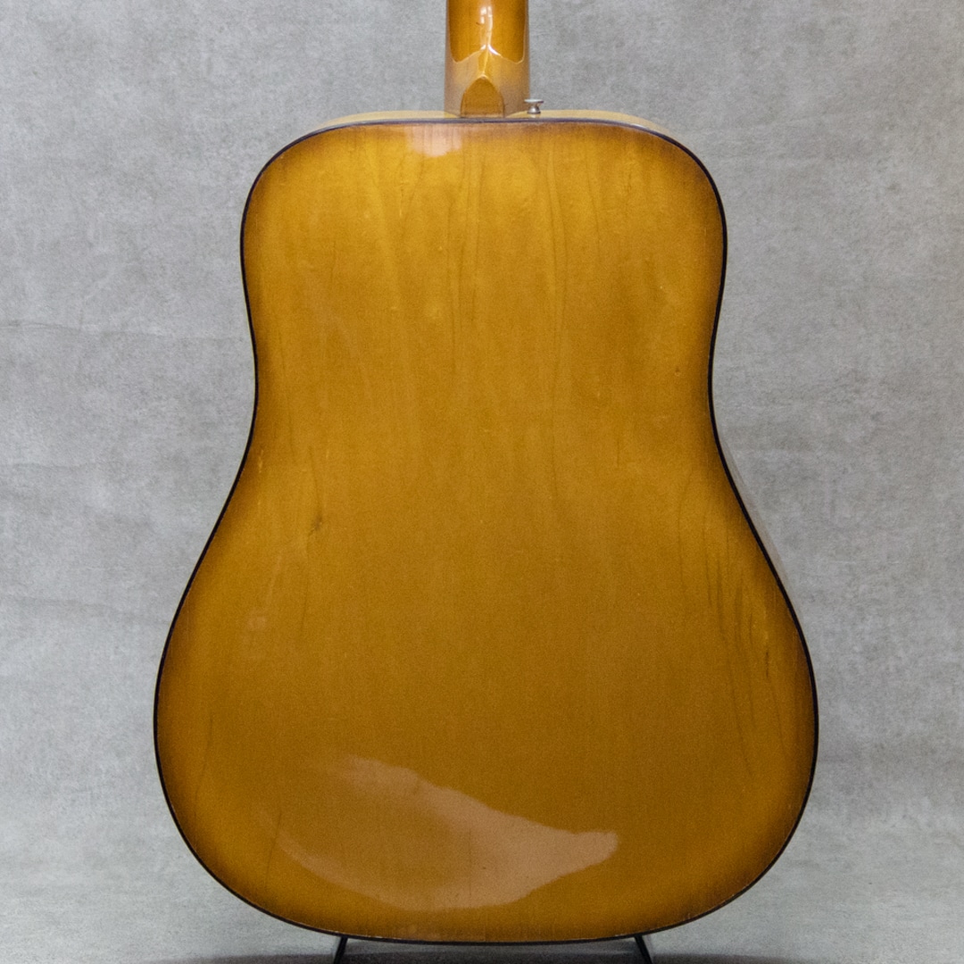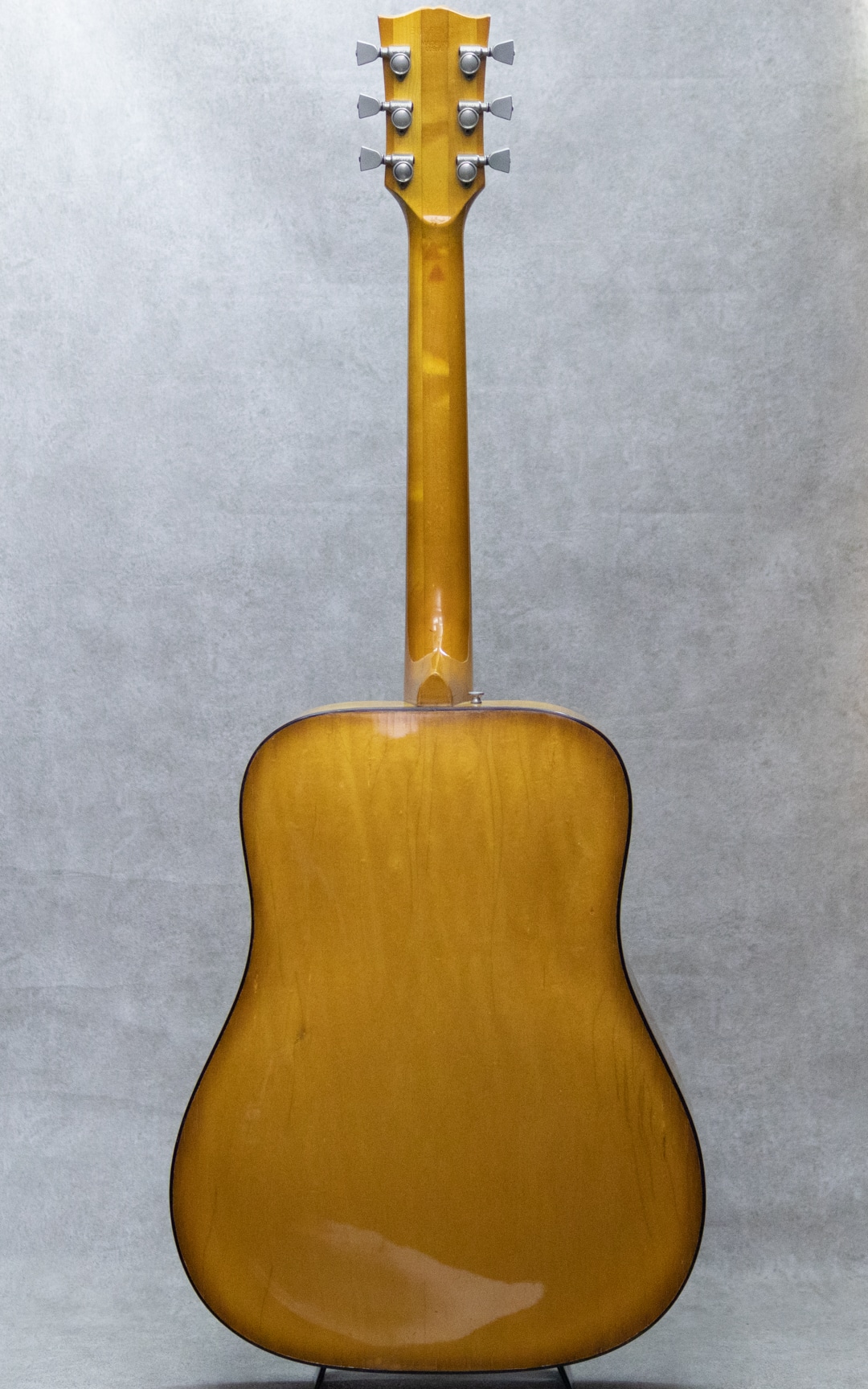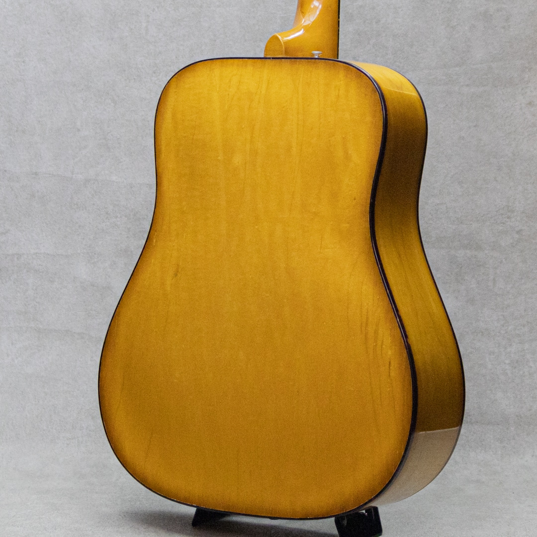 スクエアショルダーボディにアーチバック構造を持つ”Gospel”。1973年から1979年までの7年間のみと言う短い期間に製造されていたレアモデルのひとつ。ミュージシャン使用もあり、根強い人気を持つモデルです。本器は、1974-75年頃製USED品。スプルーストップ、ラミネイトメイプルサイド&バック、メイプル3ピースネック、ローズウッド指板&ブリッジ、オリジナルグローバー"ミルクボトル"ペグ、ドット指板インレイ、ポインッテッドラージピックガード、セルロイドバインディング。ゴスンっと響くアーチバックメイプルからなる分厚くパンチのあるロックなサウンドの本器。かき鳴らしたくなる迫力のあるサウンドで、倍音あふれる音量感のある1本です。この時期のセルロイドバインディングはボロボロになりやすく、本器ではキレイに巻き直しがされていますので安心してご使用いただけます。また、トップ指板まわり6弦側にヘアラインクラックとサウンドホール部のクラックが見られますが、いずれもパッチを当てて丁寧にリペアされています。しっかりと弾き込まれており、ピッキングウェアが見られますが、汚らしい印象は受けず貫禄の外観の本器。この年代のギブソンならではの少し高めのアクションですが、ネックコンディションは良好でサドルマージンも少し余裕が残されています。なかなか出回りのない”Gospel”。この機会に要チェックください。ハードケース付属。