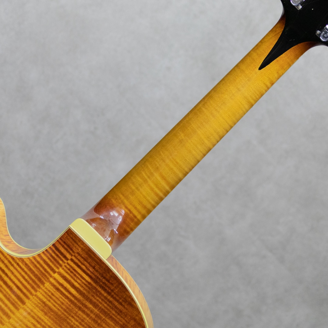 テキサス州オースティンにて生み出されるハイエンドブランド "コリングス"。フラットトップでは独自のアイデアと技術でマーチンファンまでも魅了するマーチンレプリカの代表格であり、フラットトップで培った技術を生かしたアーチトップギター、マンドリンやエレクトリックに至るまで、この上なく上質で完成された楽器造りに余念なく、世界中から支持されるブランドとなっています。ブランドの成長にこだわらず、常に"もっとも素晴らしい弦楽器を作ること"に取り組み続けたビル・コリングスは、現在のように工場を持つ以前は個人規模で製作していました。本器は氏がギターの製作を始めた初期の作品。18インチのワイドボディを持った7弦アーチトップギター。1981年製USED品。ミュージシャンから楽器店、そして世界へと、その名を広める足掛かりとなる貴重なギターの1つ。スプルーストップ、キルテッドメイプルサイド&バック、メイプルネック、エボニー指板&ブリッジ、エボニーピックガード&テールピース、アイボロイドバインディング、淡く渋いサンバーストカラー。手にして弦を弾くだけで、コリングスの卓越した技術力を感じることができます。分離の良い明瞭な音像に、上品な倍音を纏ったトーン。18インチのワイドボディから繰り出されるワイドレンジなサウンドには明確な芯があり、決してブレないバランス感が魅力。塗装の引けやチェッキングなどの経年感はもちろん見られるものの、木の歪みも無く高いプレイコンディションを保つネックには、現在のコリングスに通じるものがあります。氏の哲学、高品質なものを造りたいという意思。特に個人規模で造られたものだからこそ窺えるギター造りに対する愛情、ぜひお確かめください。ハードケースが付属。