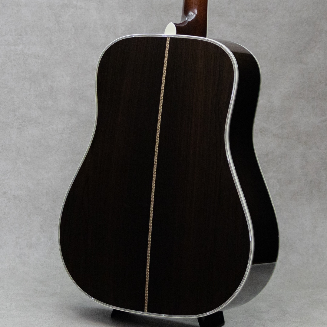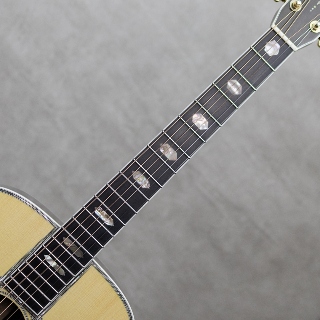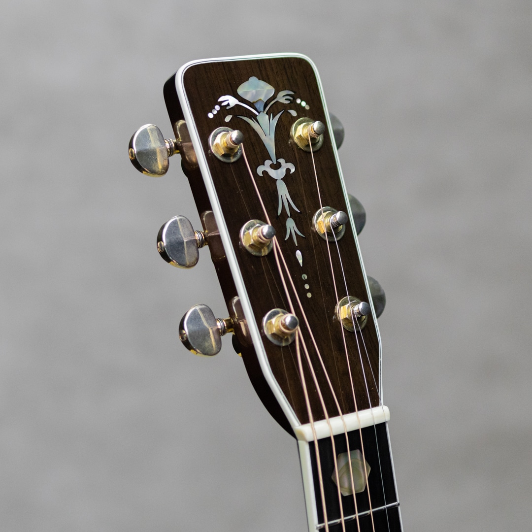 四国/愛媛はエム・シオザキ弦楽器工房の塩崎雅亮氏。日本におけるビンテージギター研究家・製作家の先駆け的存在とも呼べる巨匠ながら、今なおその研究熱心な姿勢に陰りを見せない進化する国内有数・ベテランルシアー。これまであらゆる年代の特徴を忠実に再現したMartin Guitarレプリカの製作や、自身の解釈や発展を大きく取り入れたオリジナルモデルの製作など多岐にわたえる作品を産み出しています。本器は、1968年製スタイル45にフォーカスした"D-5 1968 German Spruce/Jacaranda“。特徴的な構造はもちろん、使用マテリアルやネック形状や外観に至る細部までこだわり抜かれた1本。色白で美しい面持ちで杢目がゆらめく極上ジャーマンスプルーストップ、しっかりと柾目を配した黒々とした極上ハカランダサイド&バック、ワンピースマホガニーネック、エボニー指板&ブリッジ、グローバーミルクボトルゴールドペグ(オールドストックパーツ)、ヘキサゴン指板インレイ(オリジナルオールドシェル)、アバロンロゼッタ&トリム、メイプルスモールブリッジプレート、モザイクバックストリップ、ハカランダヘッドプレート / アバロントーチインレイ、アンダーフィニッシュのブラックピックガード、スクエアロッド、ノンスキャロップドXブレイシング。楽器の顔付きを決める指板のヘキサゴンインレイには73年製のオリジナルオールドシェルを使用した、限定的にしか製作し得ないリアルパーツを取り入れた究極の1本。角が丸く厚みのあるヘッドや、ボックスエンドグラフト、オールドストックの70sミルクボトルグローバ、塗装下の塗り込みピックガードなど、当時のスペックへのこだわりが随所に見られます。楽器全体が振動し放たれる広いレンジ感のサウンド。ノンスキャロップは鳴らないと言うのは間違いだと確信させてくれる音量とトーン。コシとパンチがあり、力強くもゴージャスな68サウンド。倍音構成も見事に再現された至高の逸品に仕上げられています。とてもキレイに大切に使用されている本器。大きく目立つ傷はおろか、使用感さえ伺いにくい極上コンディション。ネックまわりもパーフェクト、しっかりとサドルマージンを残し弾きやすいアクションです。 現代の巨匠が作り上げた究極のレプリカモデル。芯のあるロングサスティンと、装飾類をまとった上位機種ならではのきらびやかさも持ち合わせ、この上ないスペックと高い当時再現度を誇る至高の1本。是非お手元でご体感ください。オリジナルハードケース付属