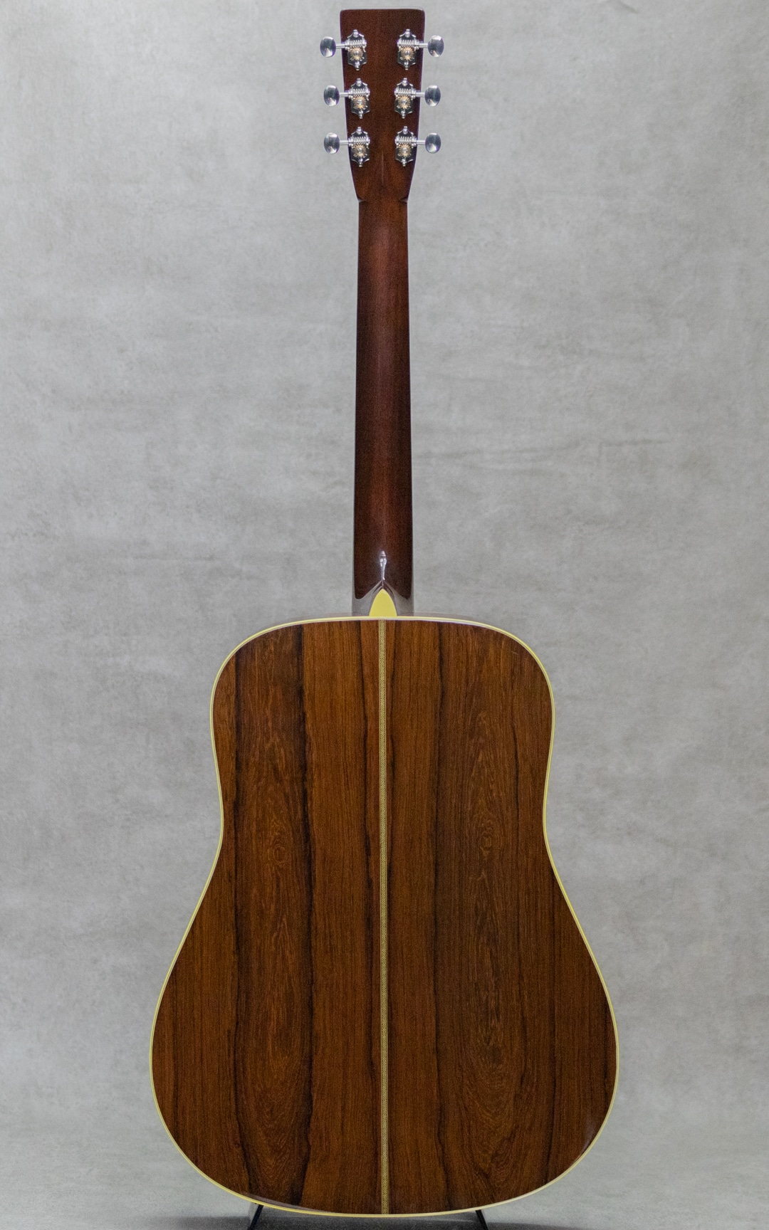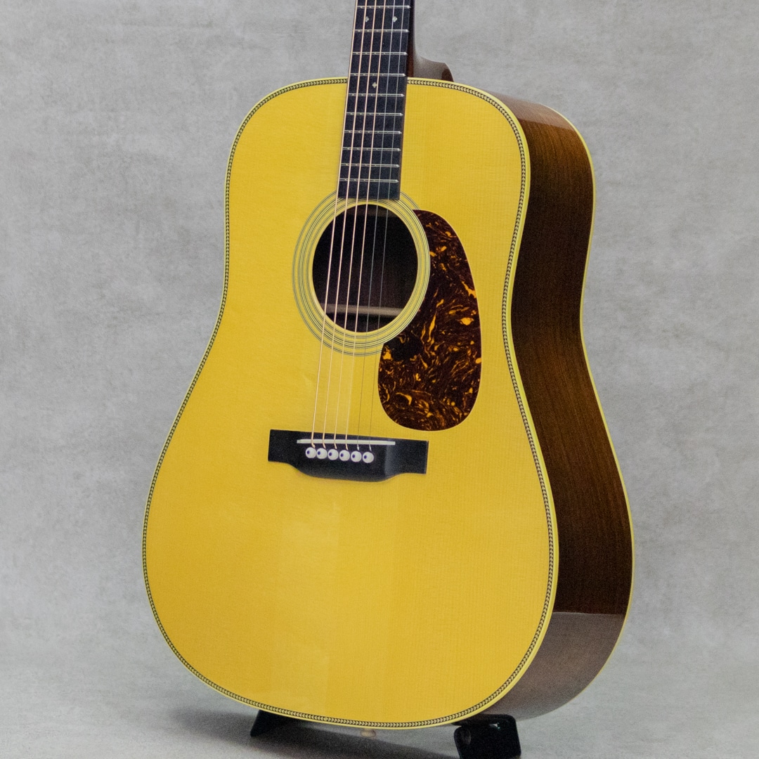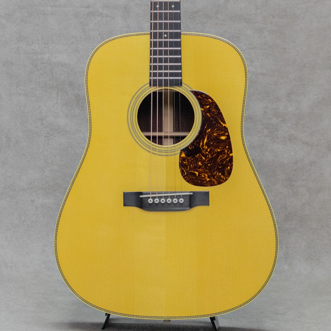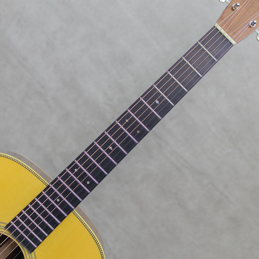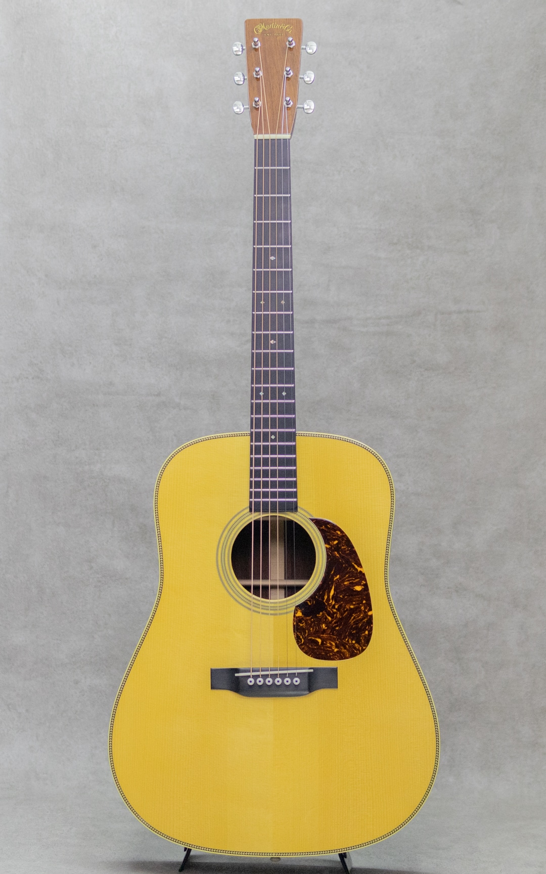 いつの時代も変らない憧れ『Martin Guitar』。今なおヴィンテージギターとして愛され続けるマーティンギターは、近年の優れた技術により数々のモデルが復刻されてきました。その中でも抜群の完成度を誇り近年注目を集めるのが『Authentic Series』。本器は、1941年製の"D-28"を忠実に復刻した"D-28 Authentic 1941”。Xブレイシング配置位置がフォワードシフトより変更になり、ナットワイドも細くなった1941年製をフィーチャーした本モデルは、ナロウネック&リアワードシフテッドXブレイス最終期の14fジョイント仕様。2013年製極上USED品。うっすらとベアクロウ杢が揺らめく美しいアディロンダックスプルーストップ、ハカランダ杢がとても美しいマダガスカルローズウッドサイド&バック、ジニュインマホガニーネック、エボニー指板&ブリッジ、オーバルウェバリーオープンバックペグ、マダガスカルローズウッド化粧板、スロッテッドダイアモンド指板インレイ、塗り込みデルマーピックガード、ヘリンボーントリム、アイボロイドバインディング、ジグザグバックストリップ、スチールTバーロッド、ニカワ接着、トップ構造は1941年式のリアワードシフテッドスキャロップドXブレイシング。ヘッドの厚みやバックストリップ、指板の厚み、側板の割れ止め、指板エンドとブリッジ形状など、細部に渡るまでが忠実に復刻されています。シリアルスタンプも当時そっくりにデザインされたマニアックなリメイクギター。肉厚でありながら歯切れ良く分離の良いプリウォーサウンド。とてもバランスが良く、扱いやすいサウンドです。内部構造、使用材、塗装、ピックガード、接着剤など、当時の製造工程を研究し、ゴールデン・エラと呼ばれる時期のニッパチを完全な手作りで再現した1本です。ごくごく僅かな小傷は見られるものの、割れなどなく経年感を伺いにくい良好なコンディションの本器。ネック周りも良好で弾きやすいアクションをしっかりと保っています。マーチンギターの進歩を分かりやすく堪能できる完成度の高い1本。オールドスタイルのニッパチをお探しの方は、是非この機会に。オリジナルハードケース付属