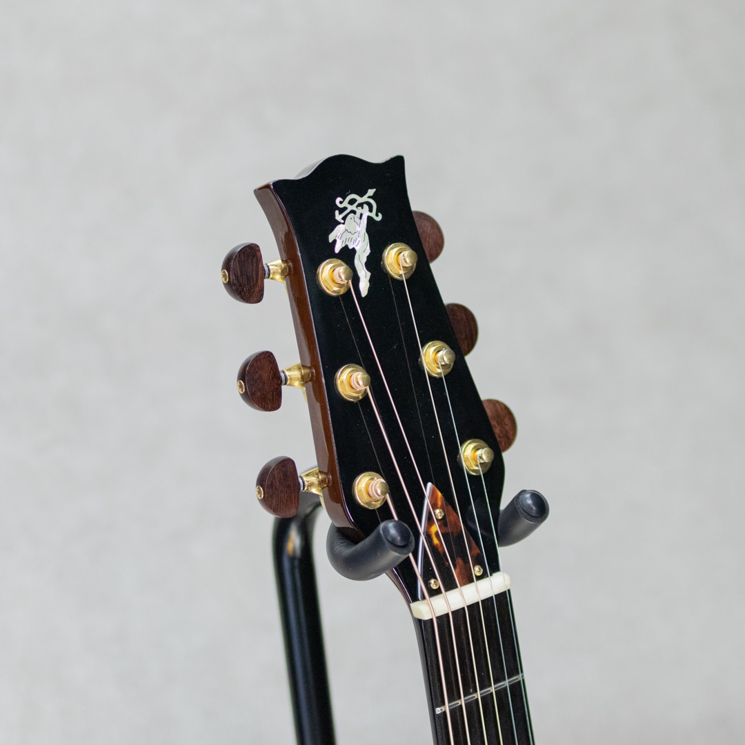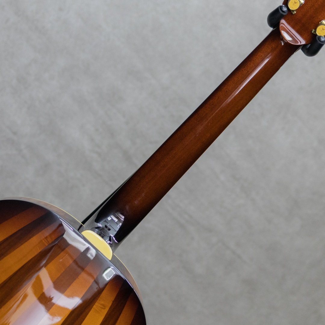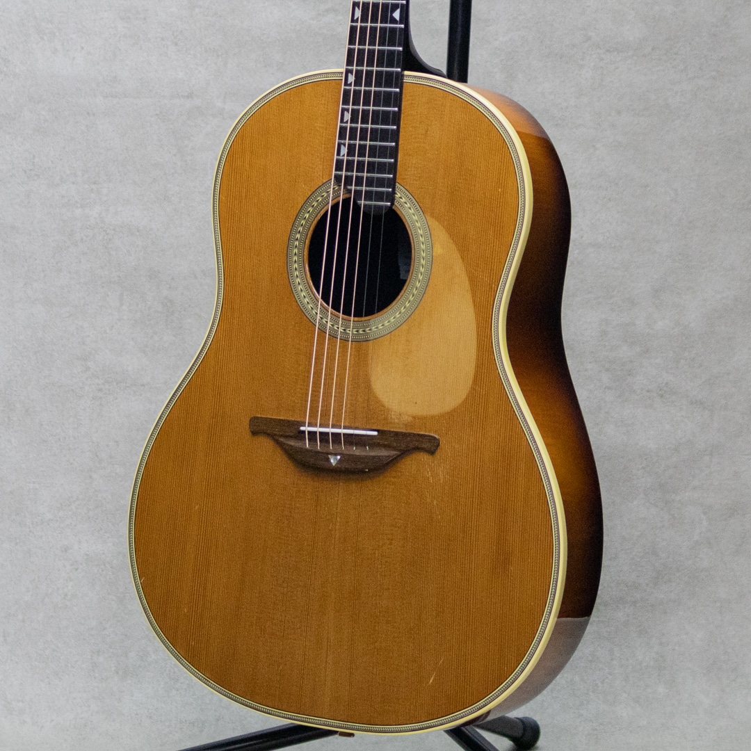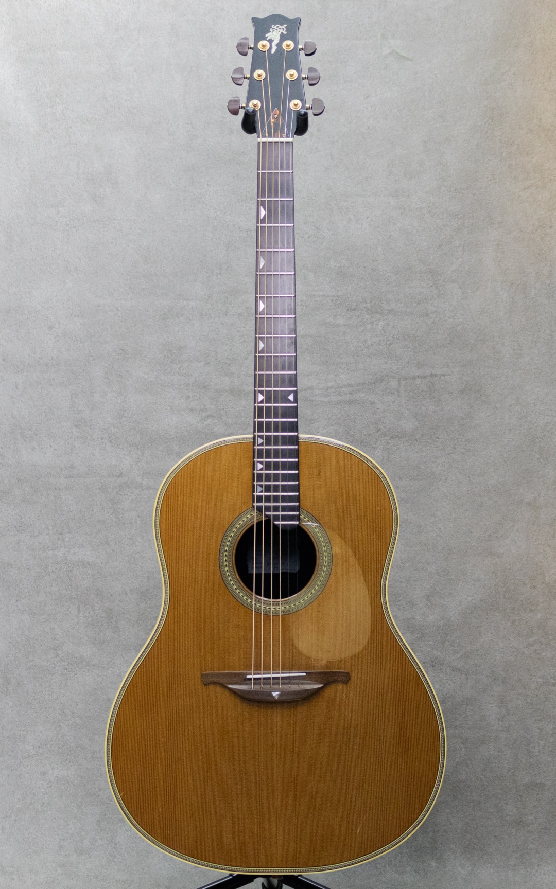 岐阜県可児市にて製作されるヤイリギター。大規模な機械化は抑え、職人による手作業を中心に30名ほどの少人数で一日に約20本程度の本数を製作しています。木工精度も高く国産ならではの安心感から高い評価を得る純国産ブランド。本器は、高い木工技術で組み込まれた木製ラウンドバックの”RR-10E”。2004年製USED品。シダートップ、メイプル&ウォルナットサイド&バック、マホガニーネック、エボニー指板、ハカランダブリッジ、クリアーピックガード。リラコード樹脂のボウルバックギターが流行った時代に、同スタイルを木製で組み上げたモデルをリバイバルイシューした本器。クリアで澄んだ響き。ラウンドバックの影響で指向性が集約された響きで、唯一無二のサウンドです。若干の小傷は見られますが、大きくえぐるような傷はなく良好なコンディション。ネックまわりもとても良好で、弾きやすいアクションをしっかりと保っています。また、イントネーションを補正するためにサドル溝の掘り直しがされています。なかなか見かけないK.ヤイリのラウンドバックモデル。お手元のコレクションにどうぞ。。オリジナルハードケース付属。