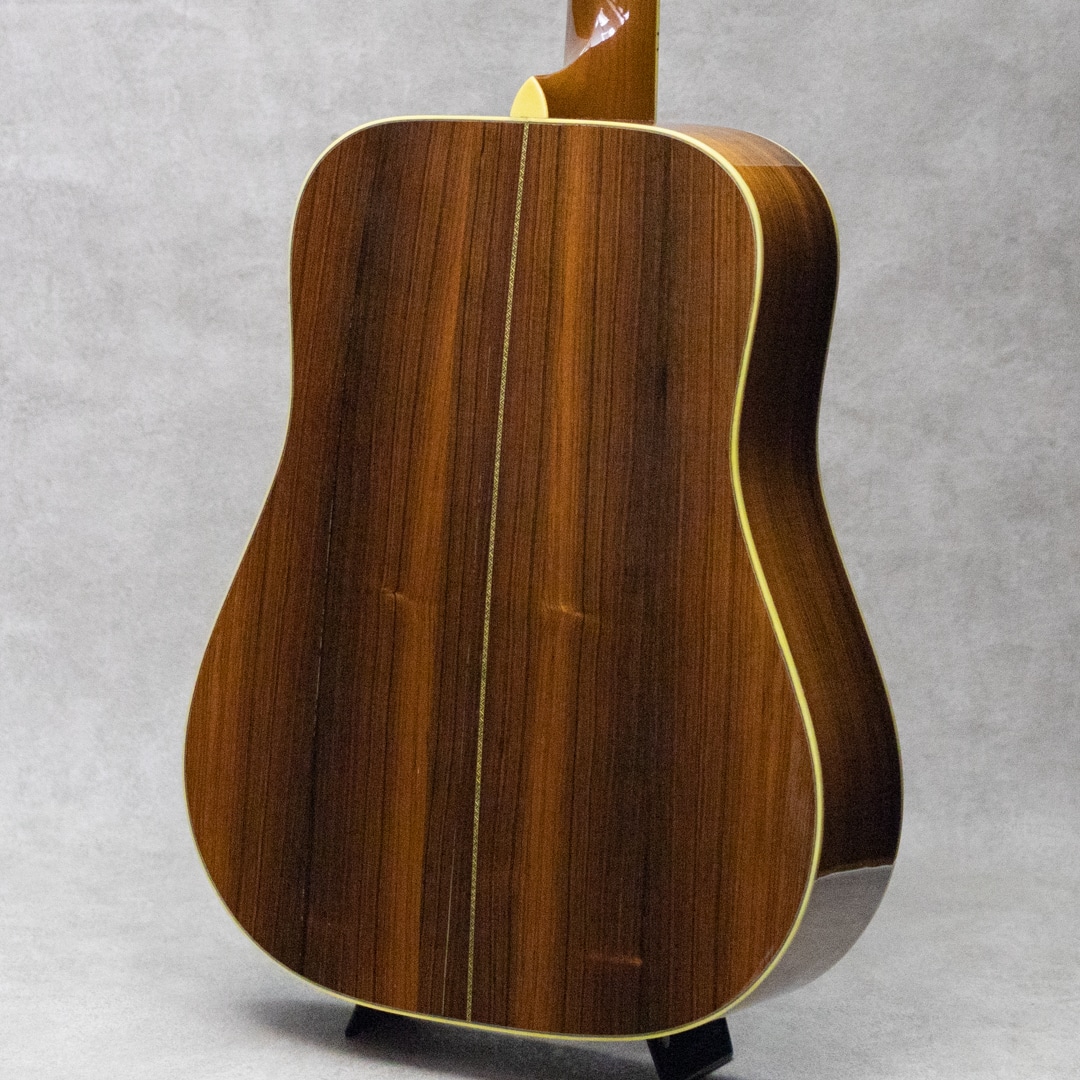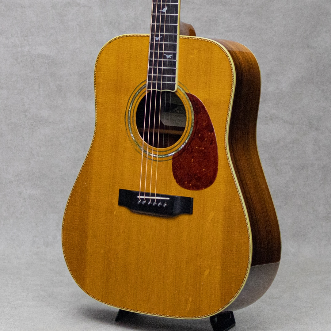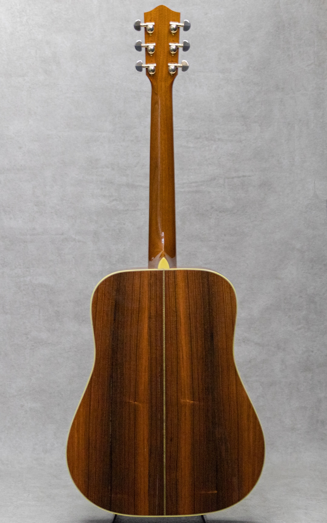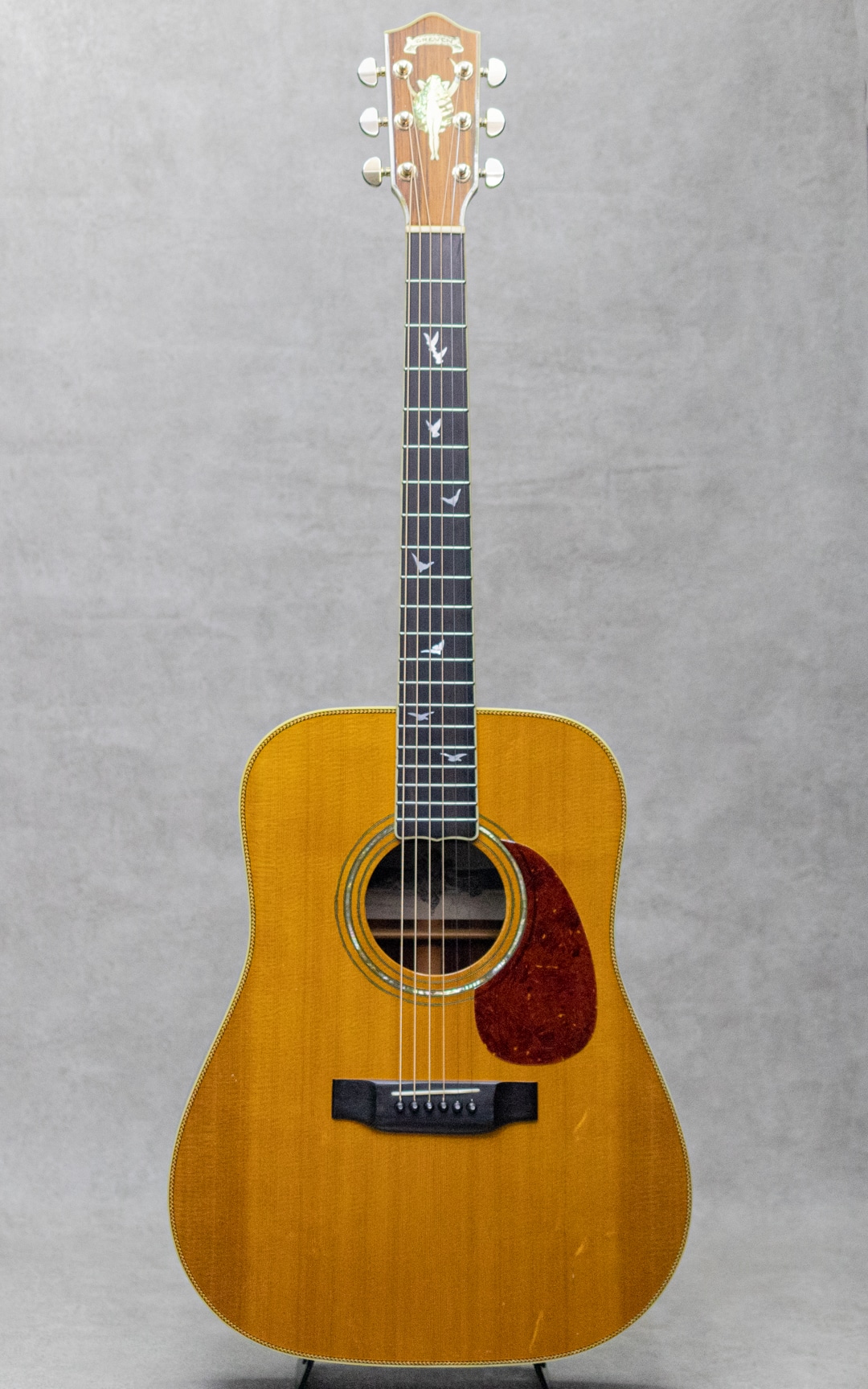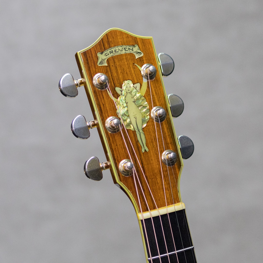 巨匠ジョン・グレーベン作のドレッドノウトモデル。本器はインディアナ州ナッシュビル時代に製作された"D Herringbone Deluxe Jacaranda"。1986年製USED品。ケースの中に手紙(写し)が残されており、製作当時の所有者からの質問へ返答したと思われる返信が記されています。トップには1981年頃に採取したアラスカン・シトカ・スプルースを使用、サイド&バックには1937年に採取されたハカランダを使用。ウォルナットネック、マッカーサーエボニー指板、エボニーブリッジ、ヘリンボーントリム&アバロンロゼッタ、セルロイドピックガード、フライング・バード指板インレイ、ホワイトレディヘッドインレイ。書面の内容と実器の特徴が一致しており、本器について記されていると思われます。書面によると、プリウォーマーチンを改良したスキャロップブレイシングが採用されており、またライニング材には当時色々な試行錯誤をしていた様子で、本器には蛇腹タイプのものではなくソリッドライナーが使用されています。実器を手元に見ても、トップのスプルースはベアクロウの浮き出た杢目の詰まった材で、ハカランダも30年代のマーチンなどと質感の似た柾目材で美しい材が使われています。往年のグレーベンの特徴を大きく反映された本器。色気の漂う貫禄の外観と艶やかなホワイトレディインレイ。ハカランダならではの力強くもくぐもりがなく大きな音量でガランと響いてくれる迫力のドレッドサウンド。フィンガータッチでも快活でサスティンの効いたトーンを魅せてくれます。ネックは45mm幅の少し広めのナット幅ですが、少し強めの指板Rと薄手の"C"シェイプネック。フィンガースタイルには持ってこいのイメージでしょうか。しっかりと弾かれている感じは見られますが、大きなダメージはなく、グッドコンディション。ネックまわりも良好で、弦高も弾きやすいアクションを保っています。ペグが過去に交換されており、現在はGrover102Gが搭載されています。インレイワークも美しい、憧れのグレーベン。人気が高く近年では流通も見られにくくなった本家グレーベンのドレッド・ハカランダモデル。是非、要チェックください。その他の詳細等はお問い合わせ下さい。