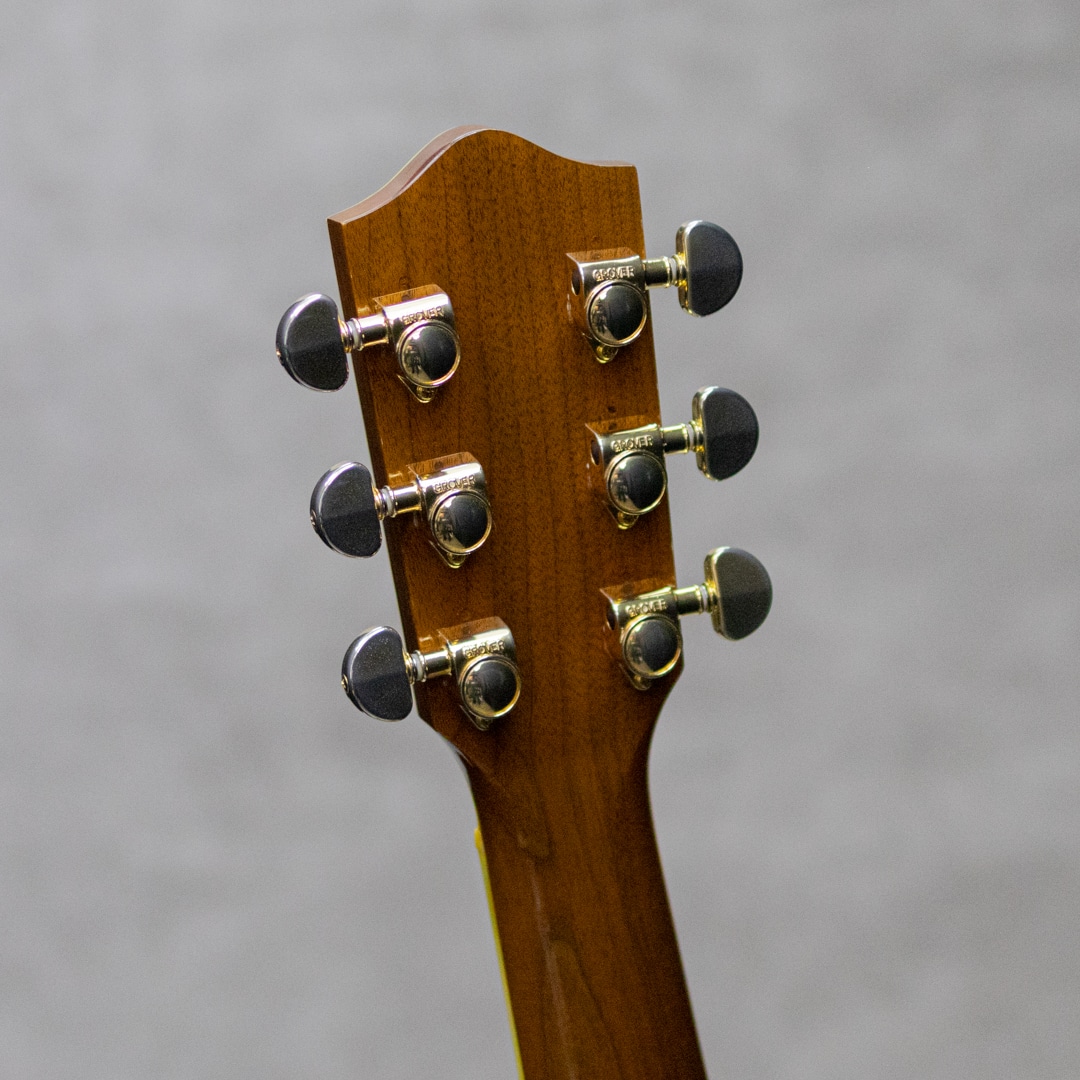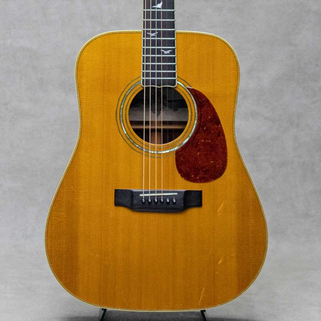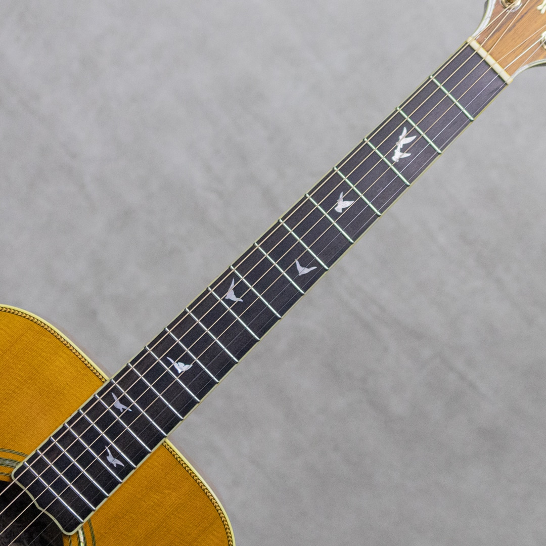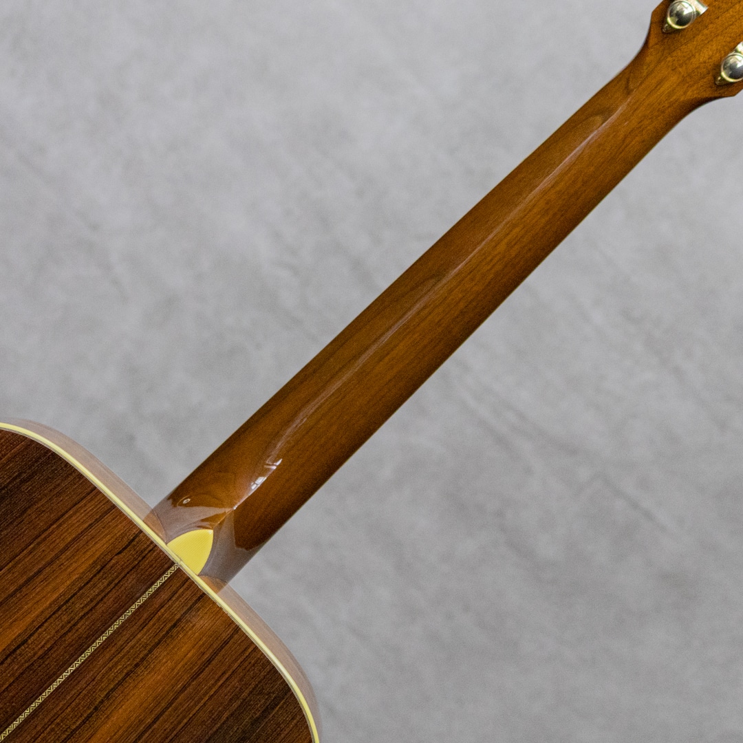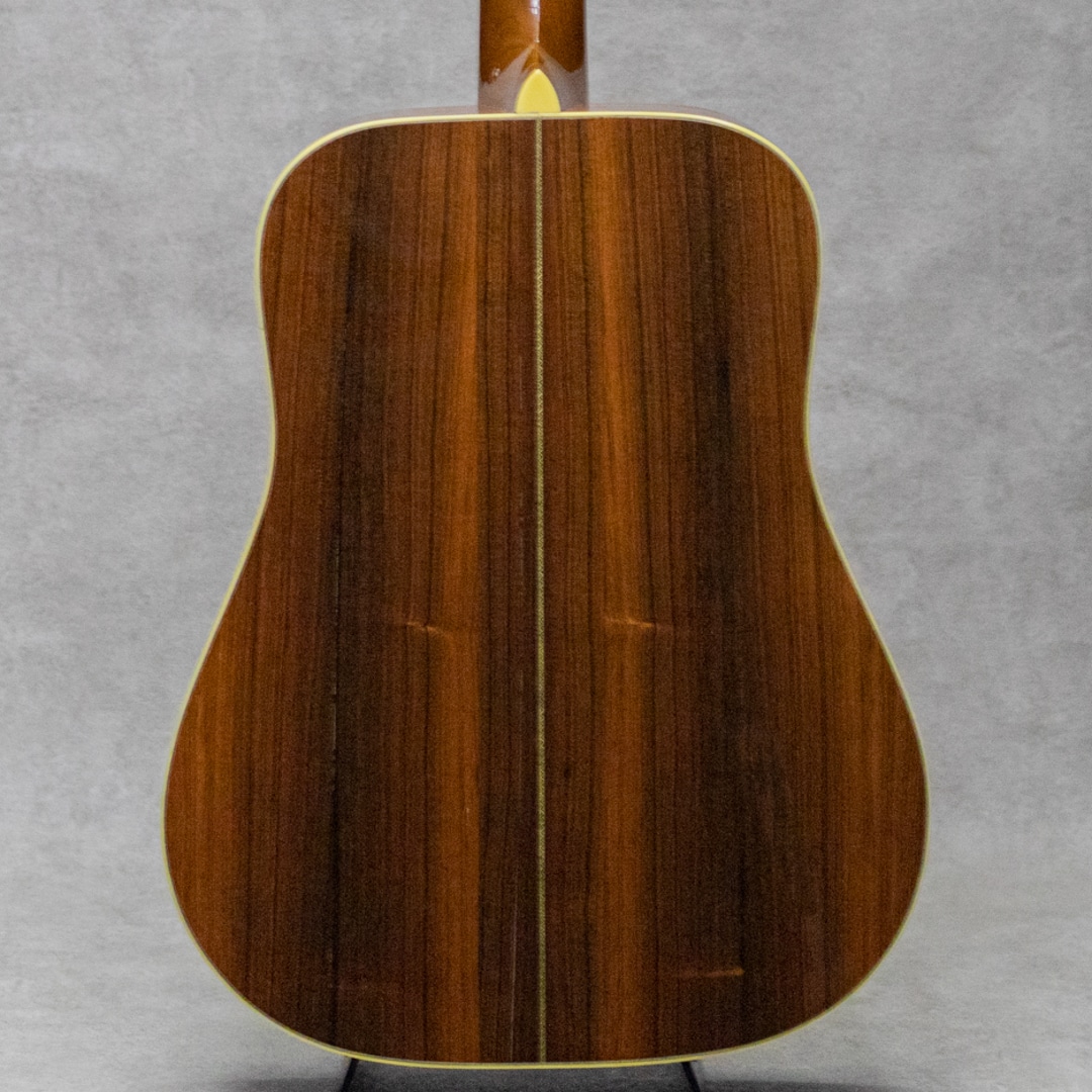 巨匠ジョン・グレーベン作のドレッドノウトモデル。本器はインディアナ州ナッシュビル時代に製作された"D Herringbone Deluxe Jacaranda"。1986年製USED品。ケースの中に手紙(写し)が残されており、製作当時の所有者からの質問へ返答したと思われる返信が記されています。トップには1981年頃に採取したアラスカン・シトカ・スプルースを使用、サイド&バックには1937年に採取されたハカランダを使用。ウォルナットネック、マッカーサーエボニー指板、エボニーブリッジ、ヘリンボーントリム&アバロンロゼッタ、セルロイドピックガード、フライング・バード指板インレイ、ホワイトレディヘッドインレイ。書面の内容と実器の特徴が一致しており、本器について記されていると思われます。書面によると、プリウォーマーチンを改良したスキャロップブレイシングが採用されており、またライニング材には当時色々な試行錯誤をしていた様子で、本器には蛇腹タイプのものではなくソリッドライナーが使用されています。実器を手元に見ても、トップのスプルースはベアクロウの浮き出た杢目の詰まった材で、ハカランダも30年代のマーチンなどと質感の似た柾目材で美しい材が使われています。往年のグレーベンの特徴を大きく反映された本器。色気の漂う貫禄の外観と艶やかなホワイトレディインレイ。ハカランダならではの力強くもくぐもりがなく大きな音量でガランと響いてくれる迫力のドレッドサウンド。フィンガータッチでも快活でサスティンの効いたトーンを魅せてくれます。ネックは45mm幅の少し広めのナット幅ですが、少し強めの指板Rと薄手の"C"シェイプネック。フィンガースタイルには持ってこいのイメージでしょうか。しっかりと弾かれている感じは見られますが、大きなダメージはなく、グッドコンディション。ネックまわりも良好で、弦高も弾きやすいアクションを保っています。ペグが過去に交換されており、現在はGrover102Gが搭載されています。インレイワークも美しい、憧れのグレーベン。人気が高く近年では流通も見られにくくなった本家グレーベンのドレッド・ハカランダモデル。是非、要チェックください。その他の詳細等はお問い合わせ下さい。