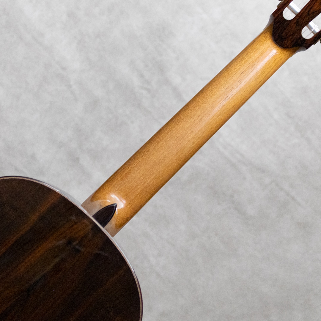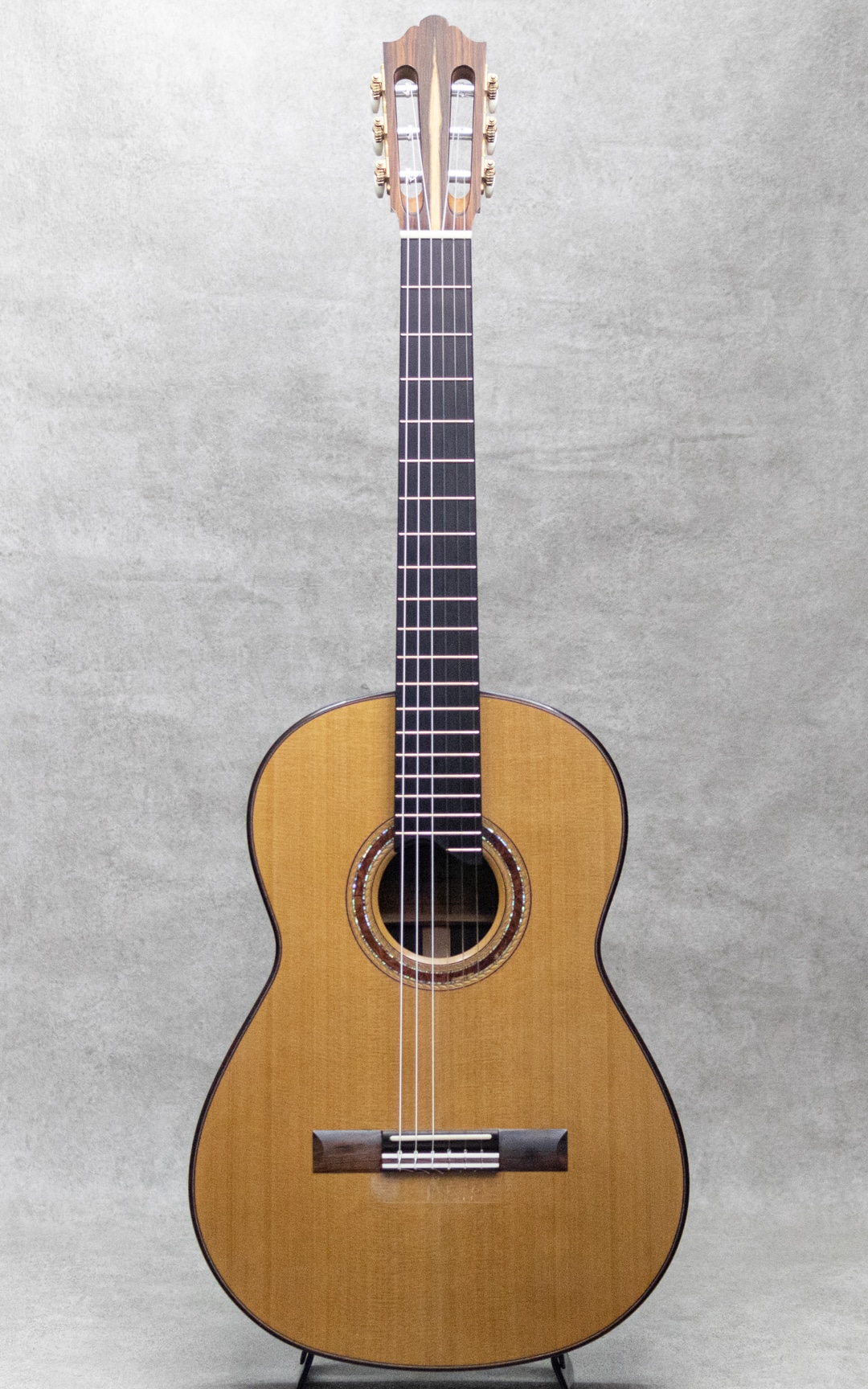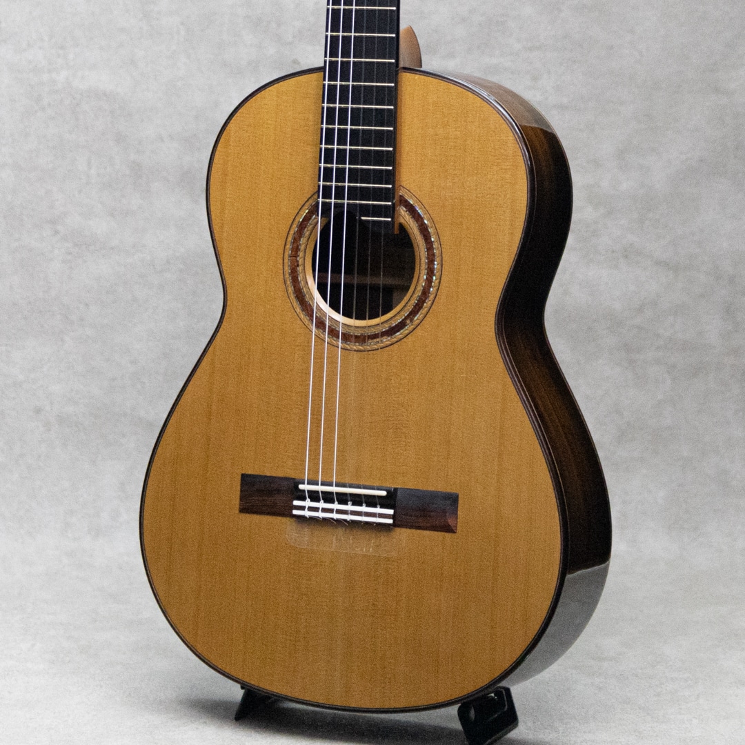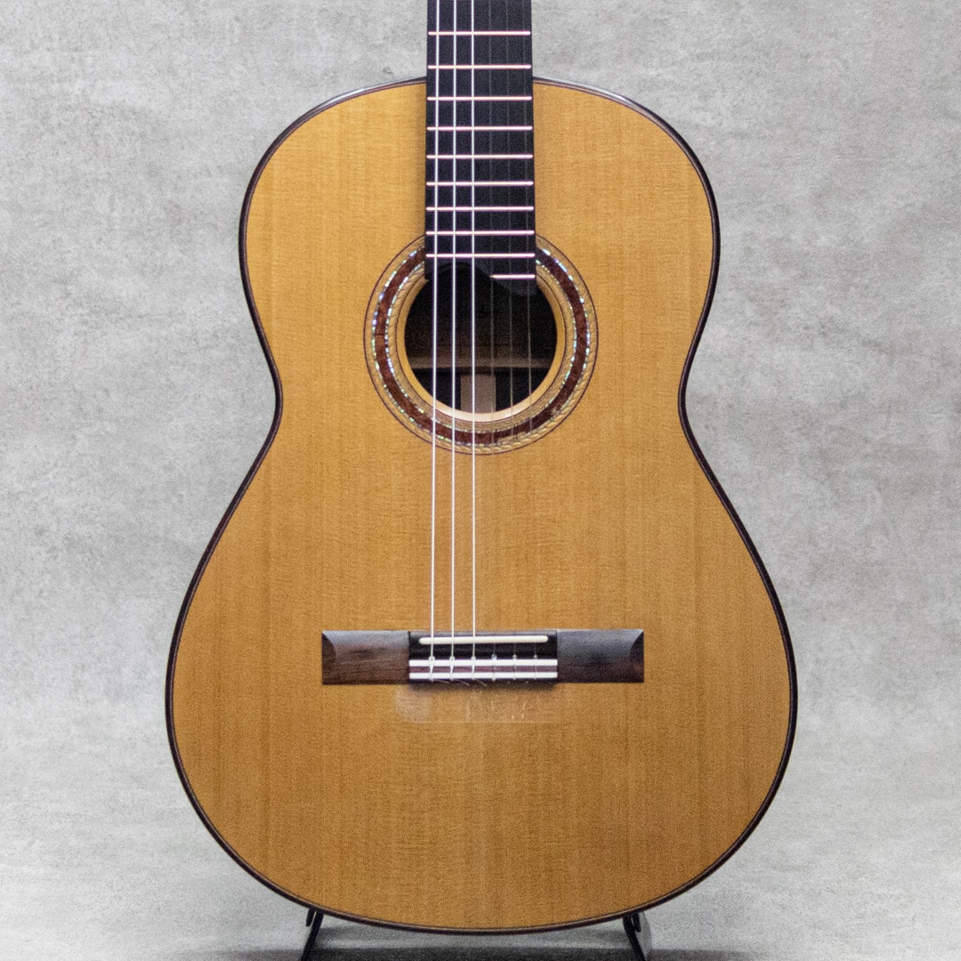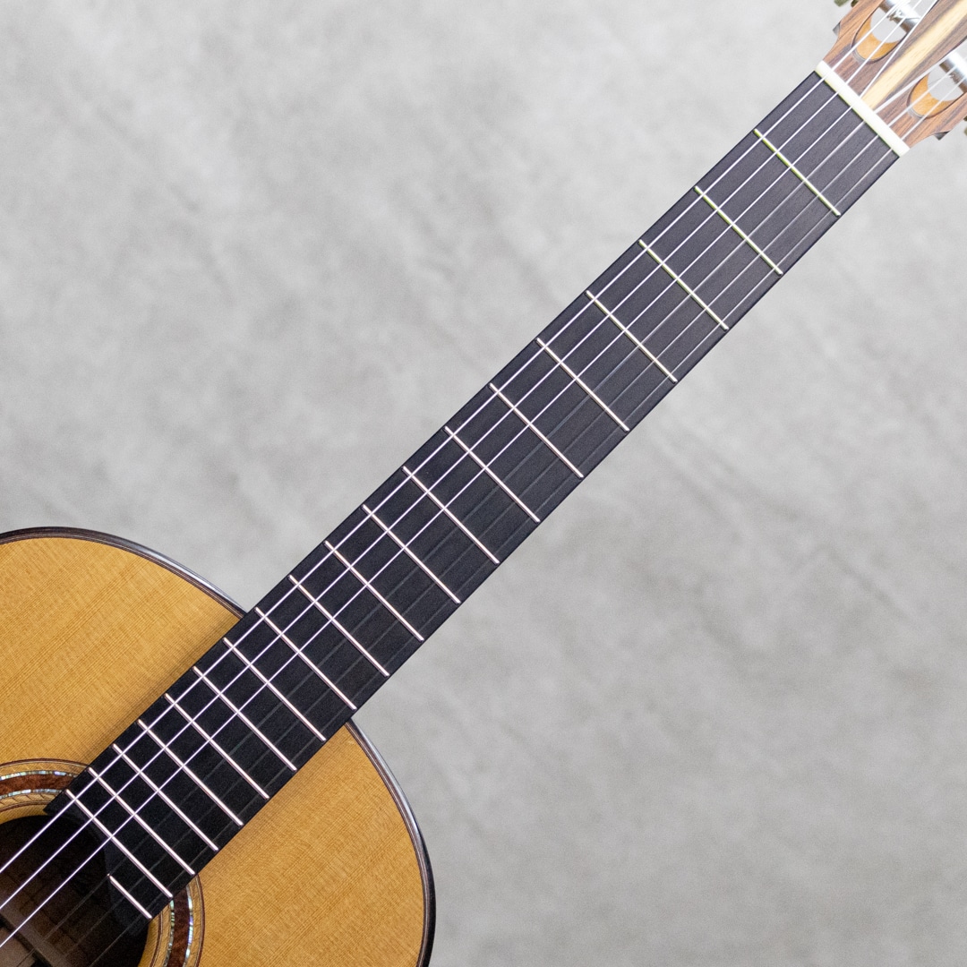 神奈川・相模原にて小林良輔氏により製作されるRyosuke Kobayashi Guitars。氏は数々の著名な作家を輩出しているロバート・ベン・スクールでギター製作を学び、スギクラフト・杉田健司氏に師事。その後カナダのマスタールシアー、サーゲ・デ・ヤングの所でさらに業を磨き、現在の工房を開設。さらなる高みを目指し日々実直に優れたギターの製作に勤しんでいます。本器はクラシックモデルの” Classical RF Jacaranda”。2020年製USED品。美しい端正な杢目のウエスタンレッドシダートップ、緑味の浮き出る毛柾杢の極上ハカランダサイド&バック、スパニッシュセダーネック、エボニー指板、ハカランダブリッジ、サップが美しく印象的なグラナディロヘッドトップ天神板、ゴトー510ペグ、アイボロイドノブ、アンボイナバール&アバロンロゼッタ&チップカービング、エボニーバインディング&積層ウッドパーフリング、サイドサウンドポート。ボディ塗装は小林ギターお得意、質の高いフレンチポリッシュ仕上げです。レイズドフィンガーボード仕様で、鉄弦のプレイヤーにも扱いやすい弦高にセットアップできるクロスオーバーのアクションを持ちながら、しっかりとクラシックアプローチで作られた力作の1本。しっかりと芯を響かせる極上のサウンド。最後まで音の芯を震わせながら長く紡がれるサスティン。そして絡み重厚に響く倍音。それに埋もれず立体的かつクリスタルに響き抜ける高音。決して高い弦テンション感ではないながら、ハリとコシのある立ち上がりを魅せ、和音のハーモニーをさまざまな表情で響かせてくれる頼り甲斐のある音色です。タッチに素直で正確に素早く反応する、プレイヤー冥利につきる本器。レイズドフィンガーボード仕様ならではの芳醇で肉厚な響きをお楽しみいただけます。しっかりと弾かれてきた本器。セラック塗装ならではの若干の小傷や弾き傷、弦飛び傷などのいくらかの使用痕は見られますが、大きく損なう傷や割れなどは見られない本器。ネックコンディションもとても良好で、低めのアクションでセットアップしていますが、サドルマージンもしっかりと残された理想的なコンディションです。過去にピックアップの搭載履歴がありますが現在は外されており、エンド部もウッドピンにて塞がれています。多くのミュージシャンの使用でも人気を伸ばしている小林良輔氏のKobayashi Guitars。“弦高のみクロスオーバー仕様のクラシックギター”と言った本器、鉄弦メインのプレイヤーにも自信を持ってオススメできる魅惑の1本です。そのこだわりと完成度を、是非お手元でお確かめください。 オリジナルハードケース付属