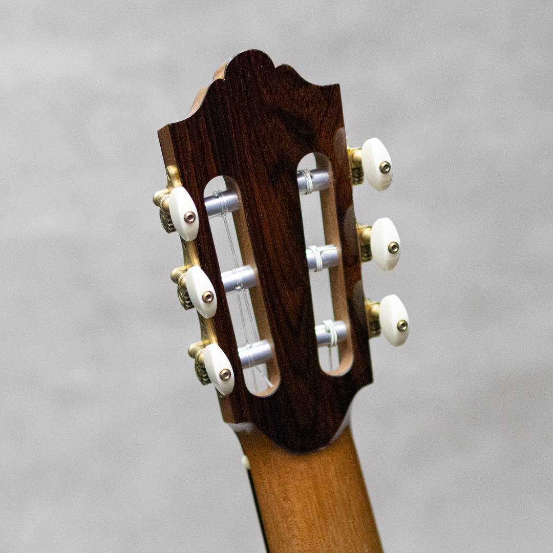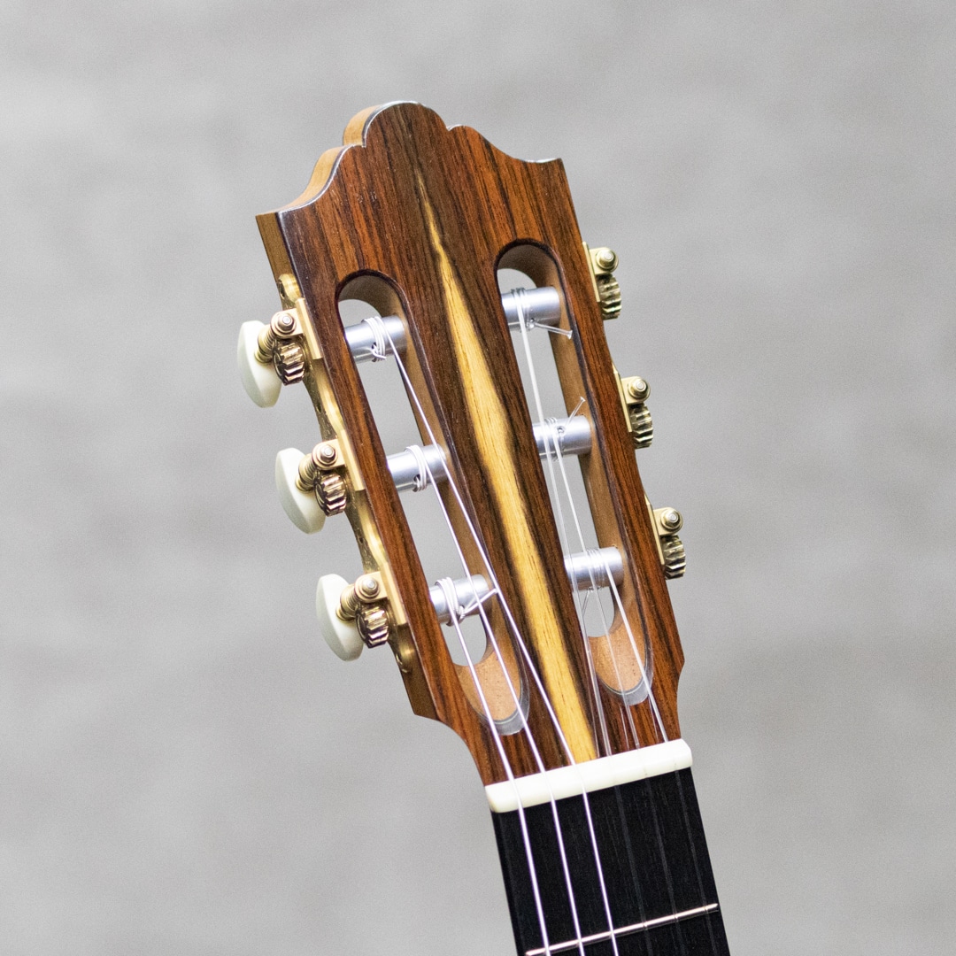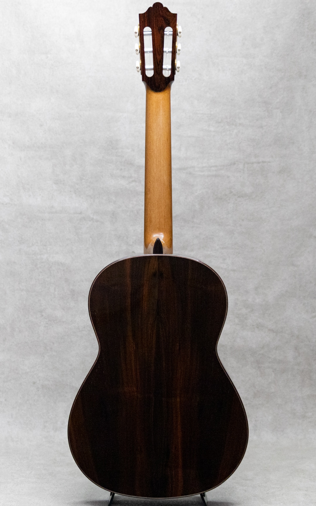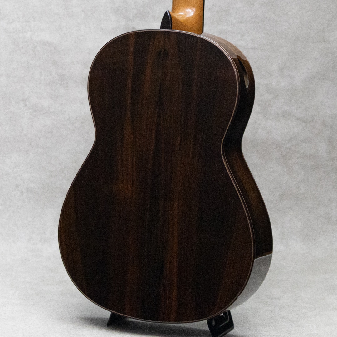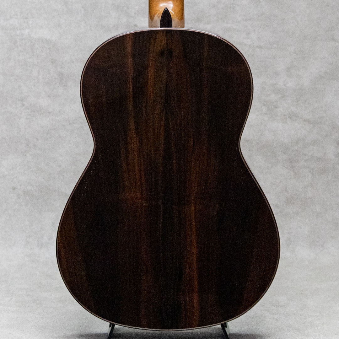 神奈川・相模原にて小林良輔氏により製作されるRyosuke Kobayashi Guitars。氏は数々の著名な作家を輩出しているロバート・ベン・スクールでギター製作を学び、スギクラフト・杉田健司氏に師事。その後カナダのマスタールシアー、サーゲ・デ・ヤングの所でさらに業を磨き、現在の工房を開設。さらなる高みを目指し日々実直に優れたギターの製作に勤しんでいます。本器はクラシックモデルの” Classical RF Jacaranda”。2020年製USED品。美しい端正な杢目のウエスタンレッドシダートップ、緑味の浮き出る毛柾杢の極上ハカランダサイド&バック、スパニッシュセダーネック、エボニー指板、ハカランダブリッジ、サップが美しく印象的なグラナディロヘッドトップ天神板、ゴトー510ペグ、アイボロイドノブ、アンボイナバール&アバロンロゼッタ&チップカービング、エボニーバインディング&積層ウッドパーフリング、サイドサウンドポート。ボディ塗装は小林ギターお得意、質の高いフレンチポリッシュ仕上げです。レイズドフィンガーボード仕様で、鉄弦のプレイヤーにも扱いやすい弦高にセットアップできるクロスオーバーのアクションを持ちながら、しっかりとクラシックアプローチで作られた力作の1本。しっかりと芯を響かせる極上のサウンド。最後まで音の芯を震わせながら長く紡がれるサスティン。そして絡み重厚に響く倍音。それに埋もれず立体的かつクリスタルに響き抜ける高音。決して高い弦テンション感ではないながら、ハリとコシのある立ち上がりを魅せ、和音のハーモニーをさまざまな表情で響かせてくれる頼り甲斐のある音色です。タッチに素直で正確に素早く反応する、プレイヤー冥利につきる本器。レイズドフィンガーボード仕様ならではの芳醇で肉厚な響きをお楽しみいただけます。しっかりと弾かれてきた本器。セラック塗装ならではの若干の小傷や弾き傷、弦飛び傷などのいくらかの使用痕は見られますが、大きく損なう傷や割れなどは見られない本器。ネックコンディションもとても良好で、低めのアクションでセットアップしていますが、サドルマージンもしっかりと残された理想的なコンディションです。過去にピックアップの搭載履歴がありますが現在は外されており、エンド部もウッドピンにて塞がれています。多くのミュージシャンの使用でも人気を伸ばしている小林良輔氏のKobayashi Guitars。“弦高のみクロスオーバー仕様のクラシックギター”と言った本器、鉄弦メインのプレイヤーにも自信を持ってオススメできる魅惑の1本です。そのこだわりと完成度を、是非お手元でお確かめください。 オリジナルハードケース付属