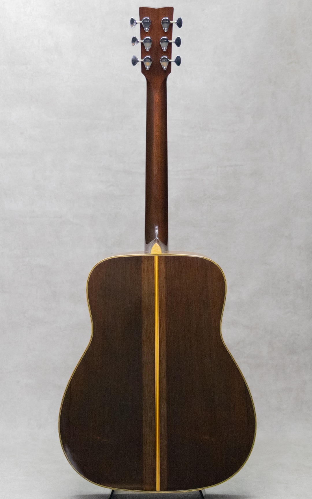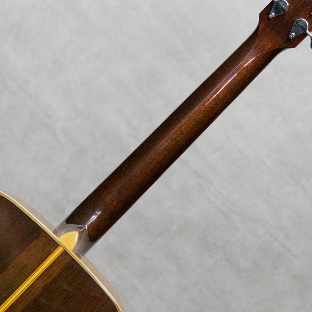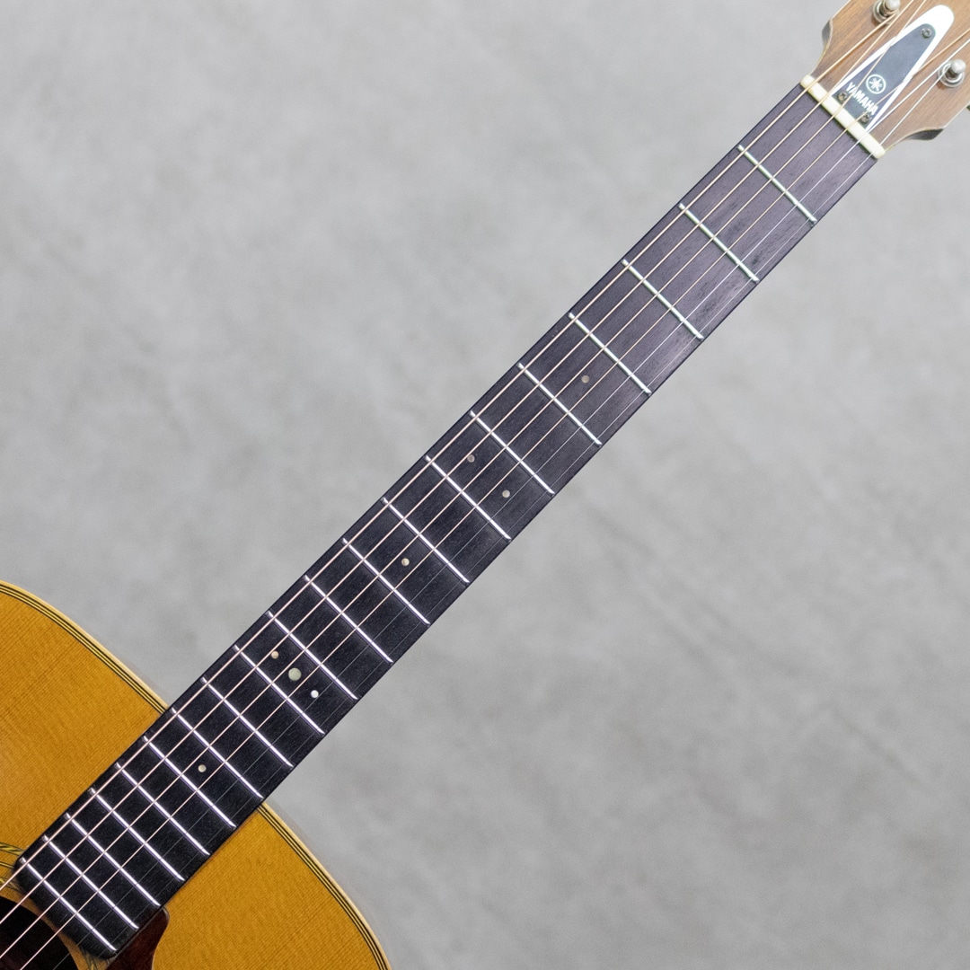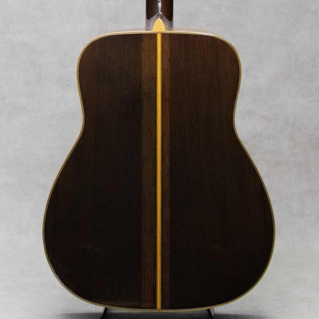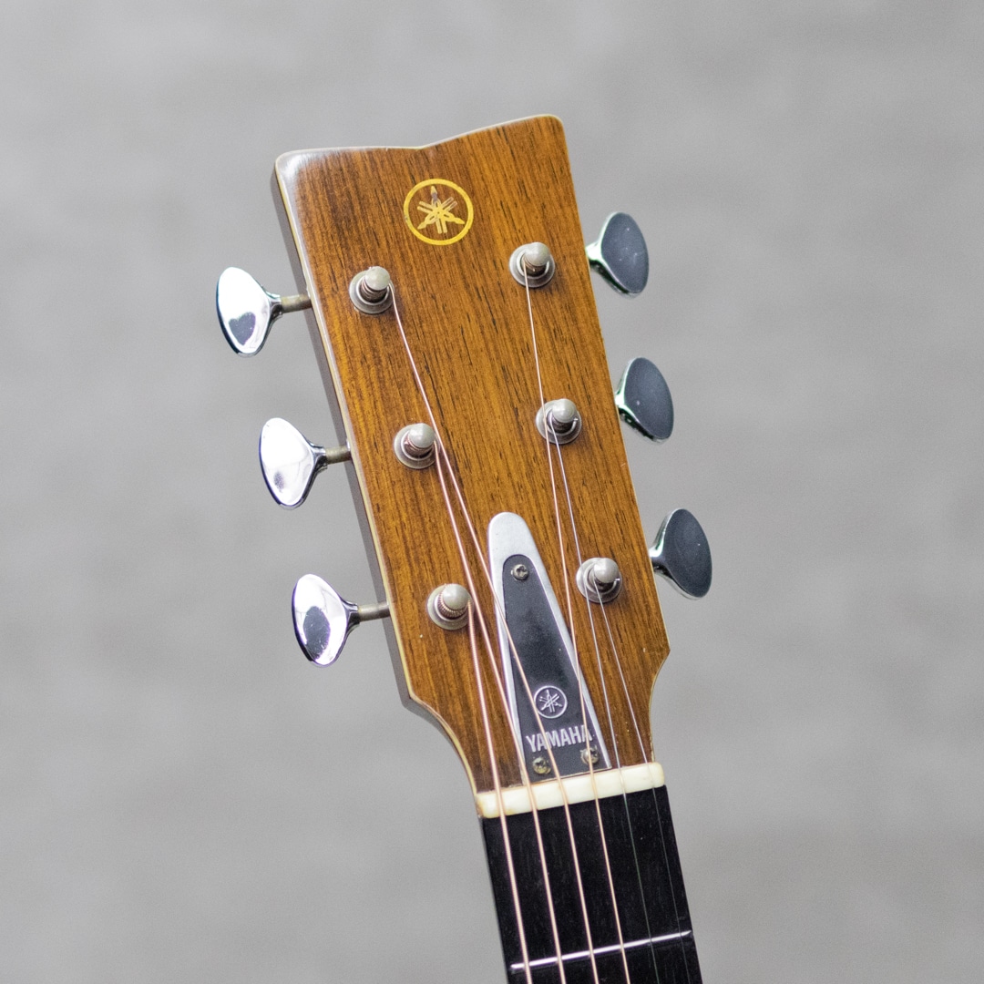 1969年から1972年までのおよそ3年間しか生産されなかったヤマハフォークギター"FG"シリーズの最上位モデルとして君臨した赤ラベル"FG-500"。FGとしては初の単板モデルとしてラインナップし、現在もヤマハファンの根強い支持を集める稀代の銘器です。本器は製造終了間近の1972年2月製造シリアルの1本。スプルーストップ、ハカランダサイド&バック。マホガニーネック、エボニー指板&ブリッジ、ヤマハシールドバックペグ、ハカランダ天神板、音叉ヘッドマーク、ロープロゼッタモザイク、ウッドパーフリング &バインディング、べっ甲柄ピックガード。トップ材とバック材は単板で、トップには目の細かなキレイな材とバックには全面に柾目を配したキレイな良材が使用されています。赤ラベルでボディ材に単板が使われているのはこの機種のみで、ほかの姉妹品にあるようなマイナーチェンジが生産開始から廃盤まで一切無いモデルです。ドスンとプレイヤーの腹に響くハカランダS&Bが繰り出す迫力のサウンド。しっかりと音量と厚みがありハカランダ独特の肉厚で歯切れのよい、あきらかに180とは異なるサウンドが魅力です。主だった傷みや補修履歴、パーツ交換の見られないストックコンディションでグッドコンディションの本器。若干の小傷こそ否めないですが、大きな傷もなくとても良いコンディションで保たれています。ネックまわりもコンディション良好で、弾きやすいアクションを保っています。またこのあたりのモデルでよく見られるブリッジを削る修理方法も見られず、ブリッジももとの肉厚な状態で残っております。コンディション良し、サウンド良しの極上コンディション”FG-500"。是非お見逃しなく。。ハードケース付属