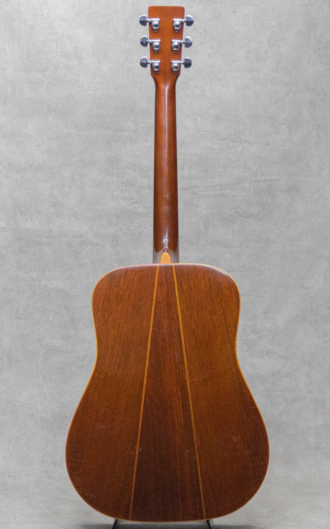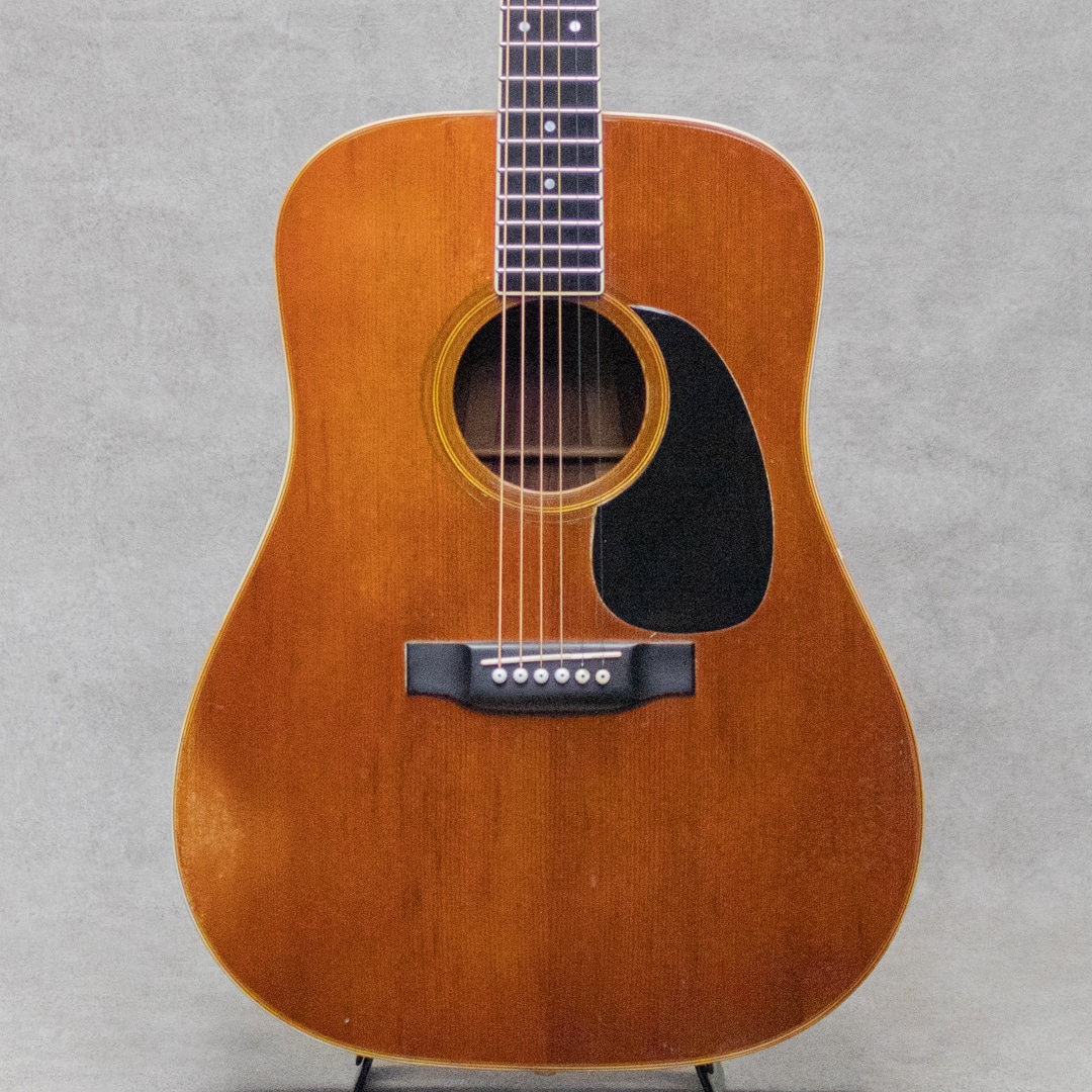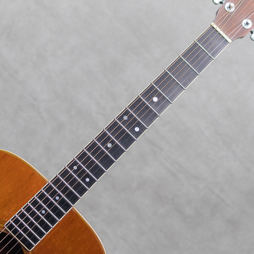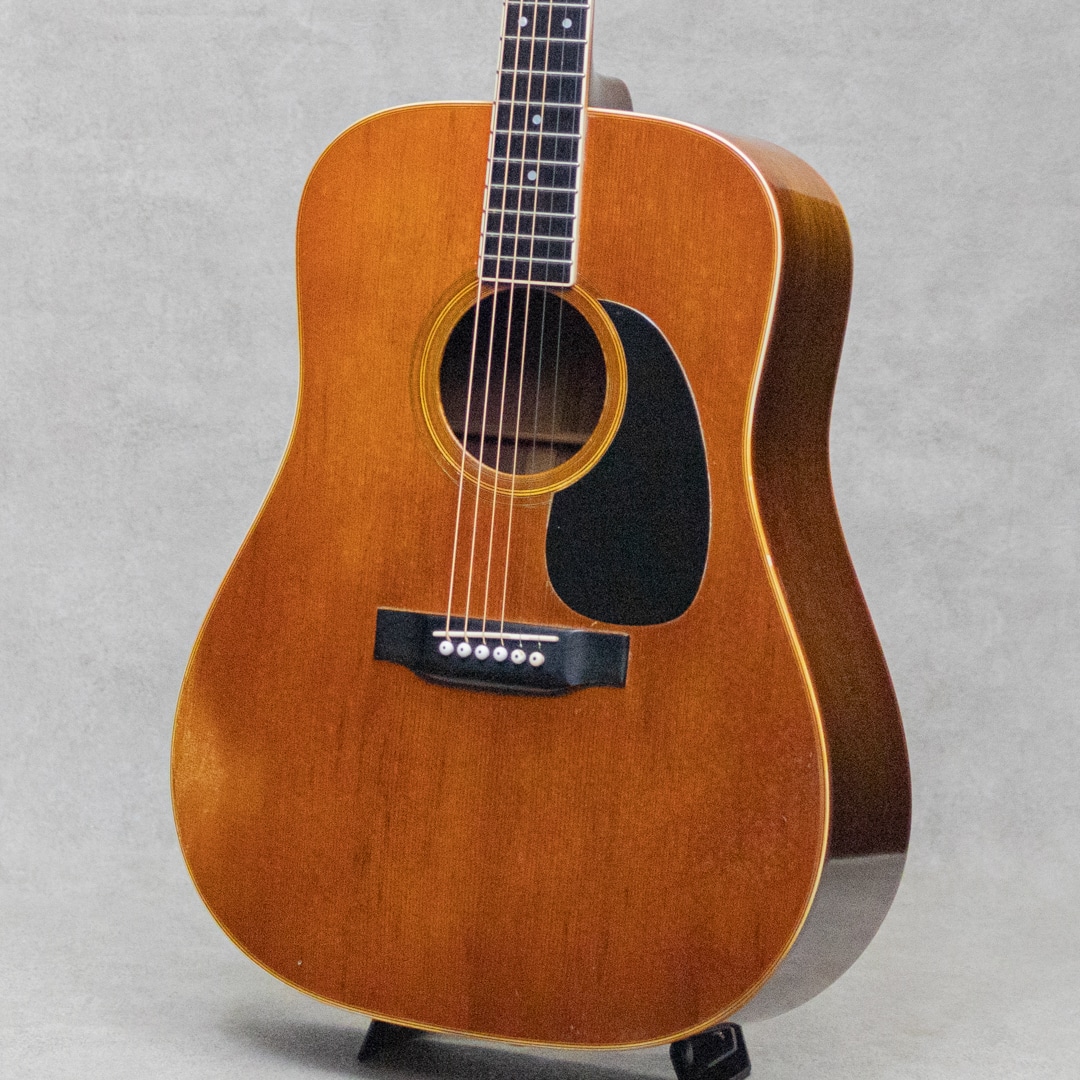 3ピースバックと言う当時としては革新的な構造を備えてラインナップされたマーチン”D-35”。1965年に登場したスタイル35はブラジリアンローズウッドの不足に端を発したモデルでしたが、その構造やルックス・サウンドは特別なファンを得て、今なお愛されるマーチン社を代表するモデルのひとつです。本器はしっかりと弾き込まれ貫禄を漂わす1974年製USED品。スプルーストップ、インディアンローズウッドサイド&バック、マホガニーネック、エボニー指板&ブリッジ、グローバーミルクボトルペグ、スクエアネックトラスロッド、ノンスキャロップドXブレイシング。しっかりと使われながら経年してきた本器。70sならではの濃厚で重心の低い低音感。35ですがしっかりと弾き込まれているおかげか、迫力の箱鳴り感を響かせてくれます。またそれに重なる高音は、しっかりと抜けが良くさわやかな響き。織りなすはまさにフォークサウンドのあの響きです。よく褪色外観と使用に伴う小傷は、腕の当たるロウワバウト部とエンドグラフト部の塗装剥がれ、マーチンクラックの補修は見られますが、その他大きく損なうエグるような傷や割れは見られず良好。ネックまわりも良好で、弾きやすいアクションをしっかりと保っています。オールドならではの貫禄の外観と経年のサウンドを楽しめる”D-35”。まだまだしっかりとお弾き頂きたい、弾きごろの1本です。是非ご堪能ください。ハードケース付属
