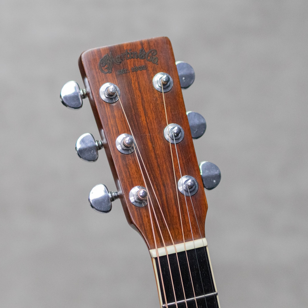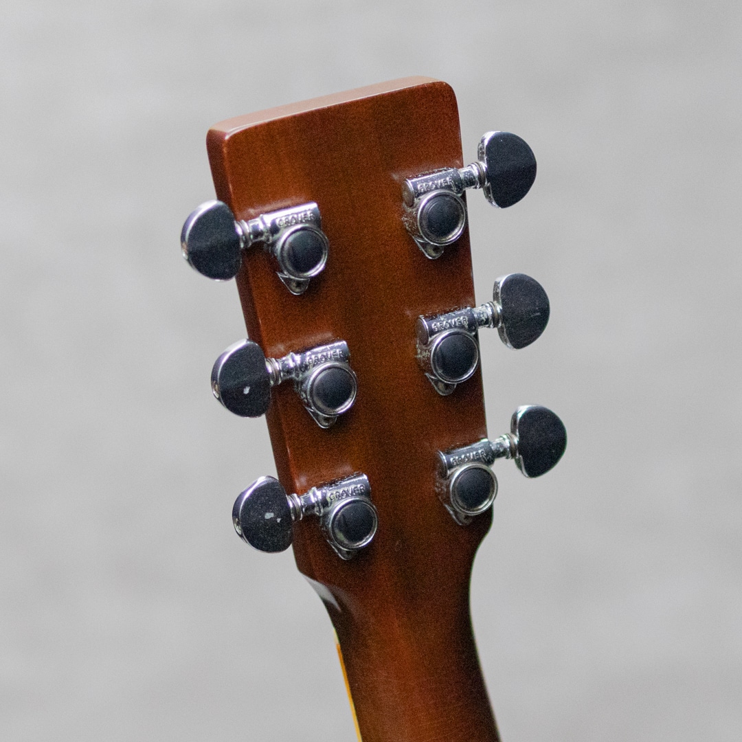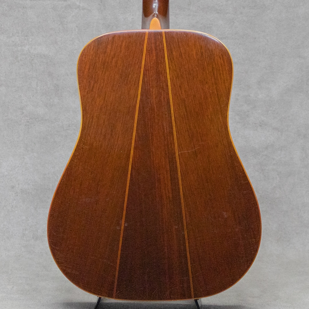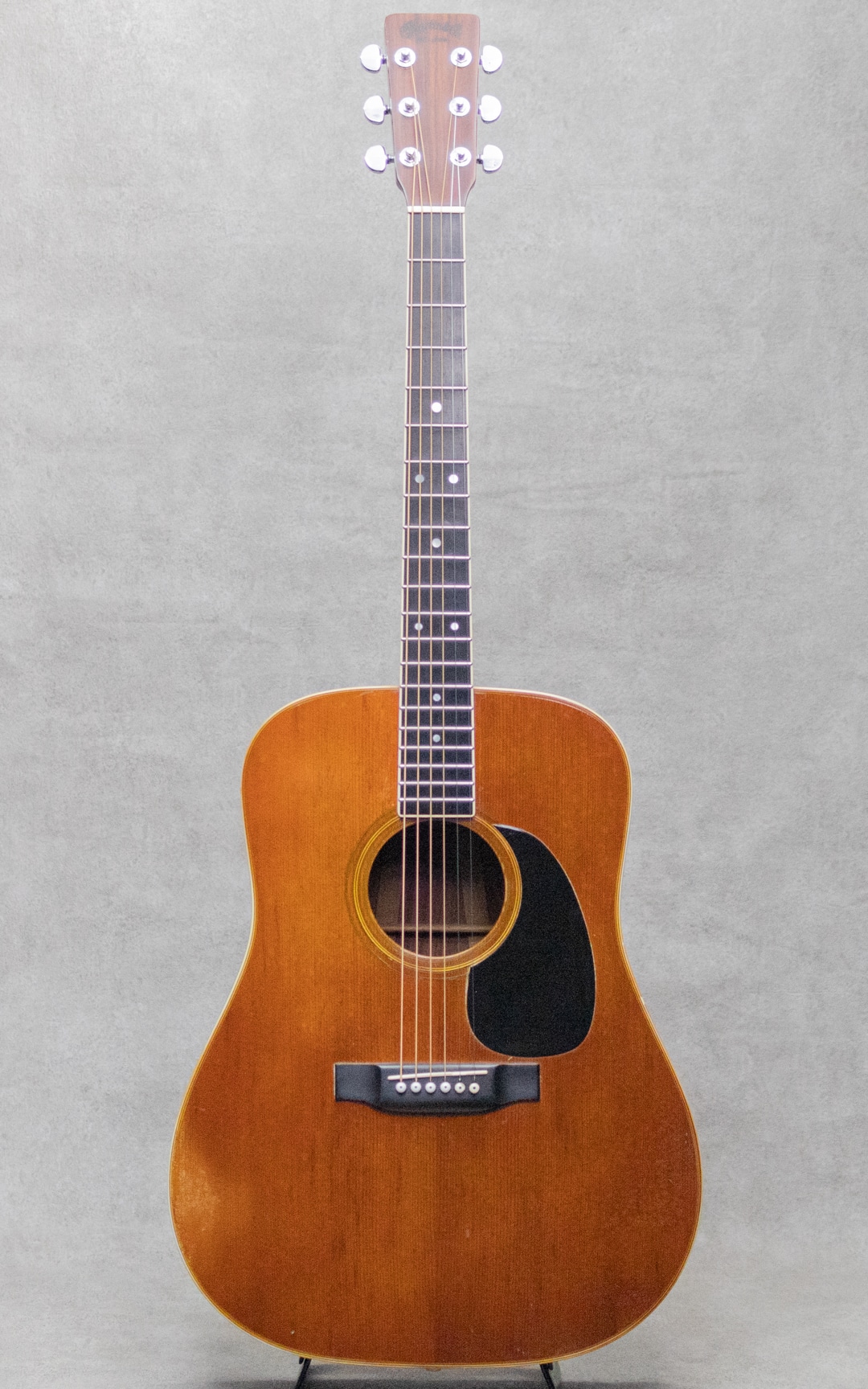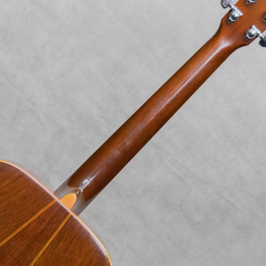 3ピースバックと言う当時としては革新的な構造を備えてラインナップされたマーチン”D-35”。1965年に登場したスタイル35はブラジリアンローズウッドの不足に端を発したモデルでしたが、その構造やルックス・サウンドは特別なファンを得て、今なお愛されるマーチン社を代表するモデルのひとつです。本器はしっかりと弾き込まれ貫禄を漂わす1974年製USED品。スプルーストップ、インディアンローズウッドサイド&バック、マホガニーネック、エボニー指板&ブリッジ、グローバーミルクボトルペグ、スクエアネックトラスロッド、ノンスキャロップドXブレイシング。しっかりと使われながら経年してきた本器。70sならではの濃厚で重心の低い低音感。35ですがしっかりと弾き込まれているおかげか、迫力の箱鳴り感を響かせてくれます。またそれに重なる高音は、しっかりと抜けが良くさわやかな響き。織りなすはまさにフォークサウンドのあの響きです。よく褪色外観と使用に伴う小傷は、腕の当たるロウワバウト部とエンドグラフト部の塗装剥がれ、マーチンクラックの補修は見られますが、その他大きく損なうエグるような傷や割れは見られず良好。ネックまわりも良好で、弾きやすいアクションをしっかりと保っています。オールドならではの貫禄の外観と経年のサウンドを楽しめる”D-35”。まだまだしっかりとお弾き頂きたい、弾きごろの1本です。是非ご堪能ください。ハードケース付属