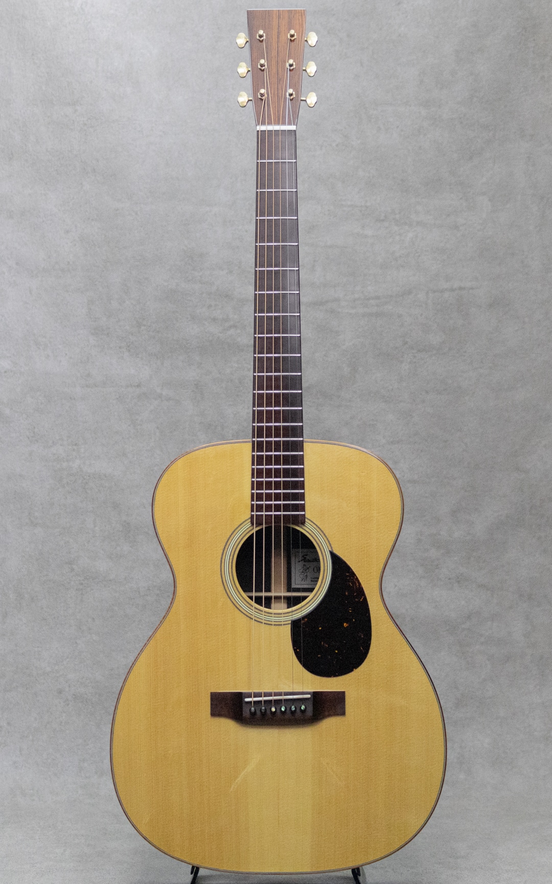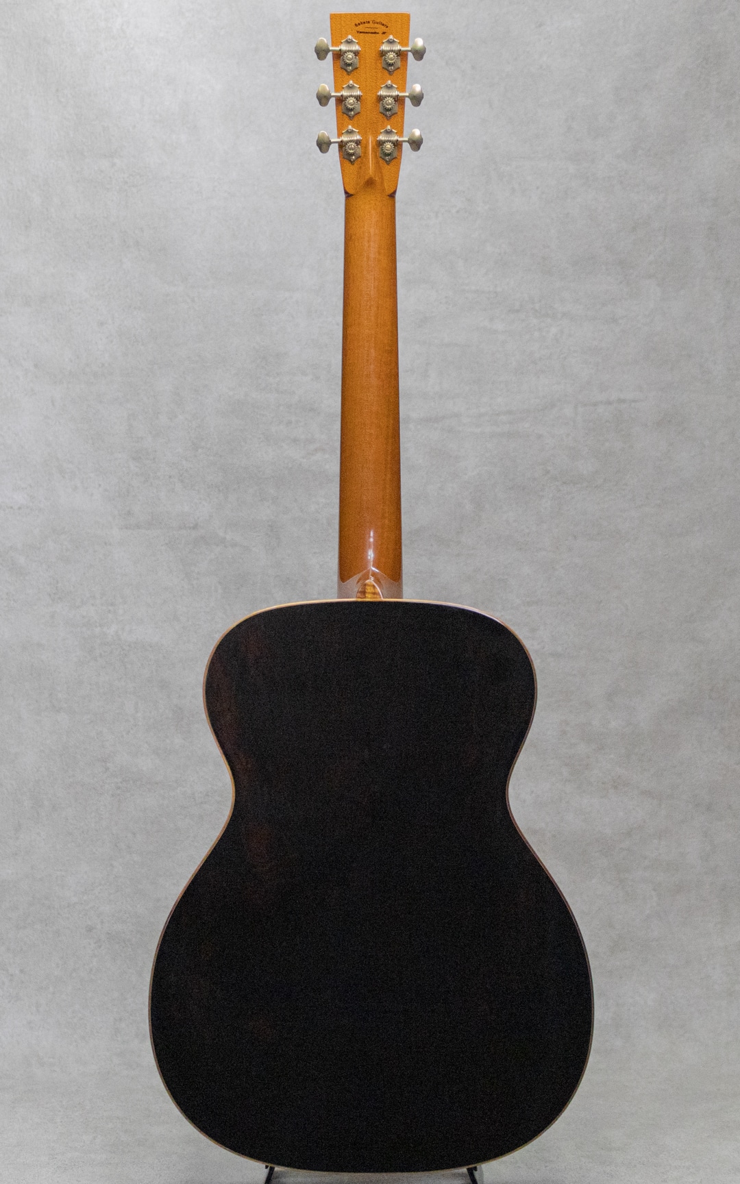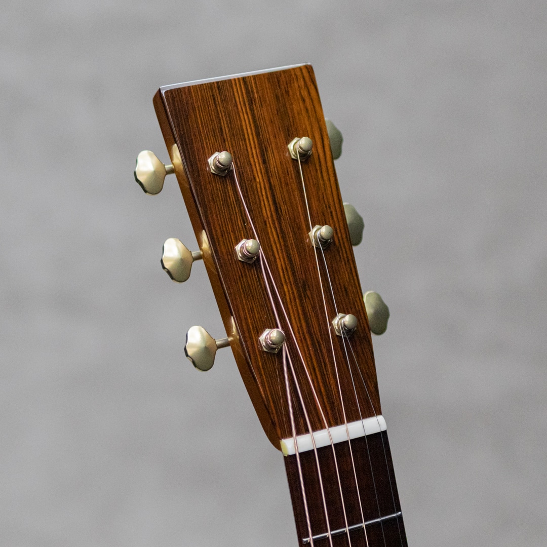 山梨県のルシアー、坂田久氏。伝統の名器を基に、最高の材、技巧を尽くし、”音楽”が表現できるギター創りを目指して創られる実直なギター。本器は、オーケストラモデル”OM-28A"。2019年製極上USED品。ベアクロウが浮き出る美しいジャーマンスプルーストップ、黒々としたワイルドな杢目のアフリカンブラックウッドサイド&バック、ホンジュラスマホガニーボルトオンネック、スネークウッド指板&ブリッジ、ゴトーオープンバックペグ、べっ甲柄セルロイドピックガード、フレイムハワイアンコアバインディング。トップブレイス構造はスキャロップXとノンスキャロップトーンバーのハイブリッド構造。ドスンと奥深く響きながらも、しっかりと埋もれないパンチのあるサウンド。坂田氏が得意とする音像感をしっかりと有するトーンとブラックウッドならではの重量感のある響きが、しっかりと大音量で轟く魅力的な1本。光にかざせばわかる程度の若干の小傷は見られますが、大きく目立つ傷や傷みはみられないグッドコンディション。ネックまわりもバッチリで、弾きやすいアクションをサドルマージンをしっかりと残しながら保っています。完成度の高い実力派が作る魅力的な1本。是非お手元で直にご体感ください。オリジナルハードケース付属