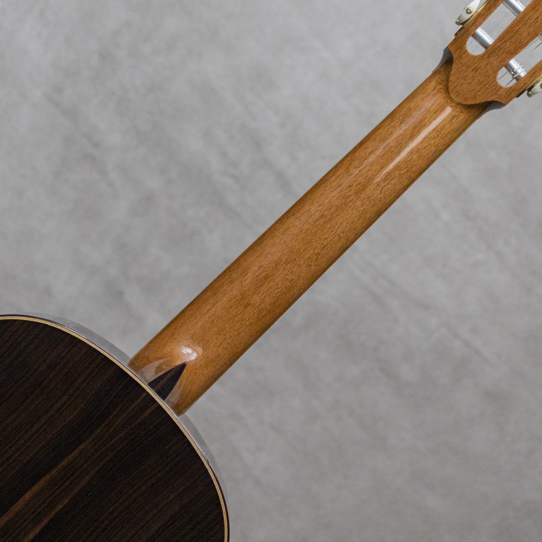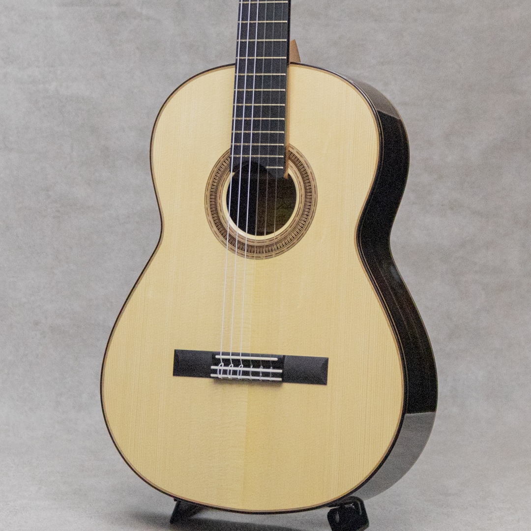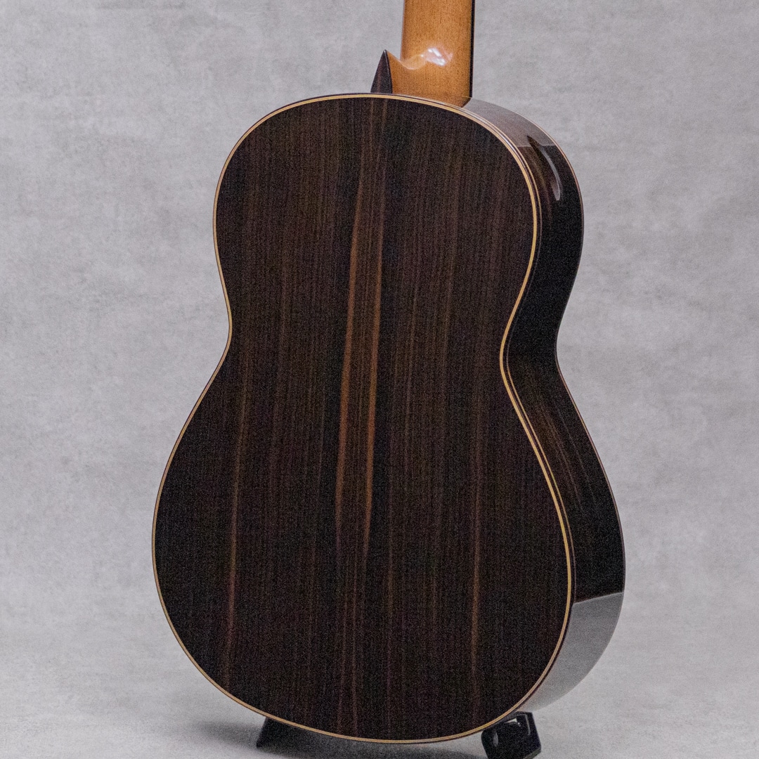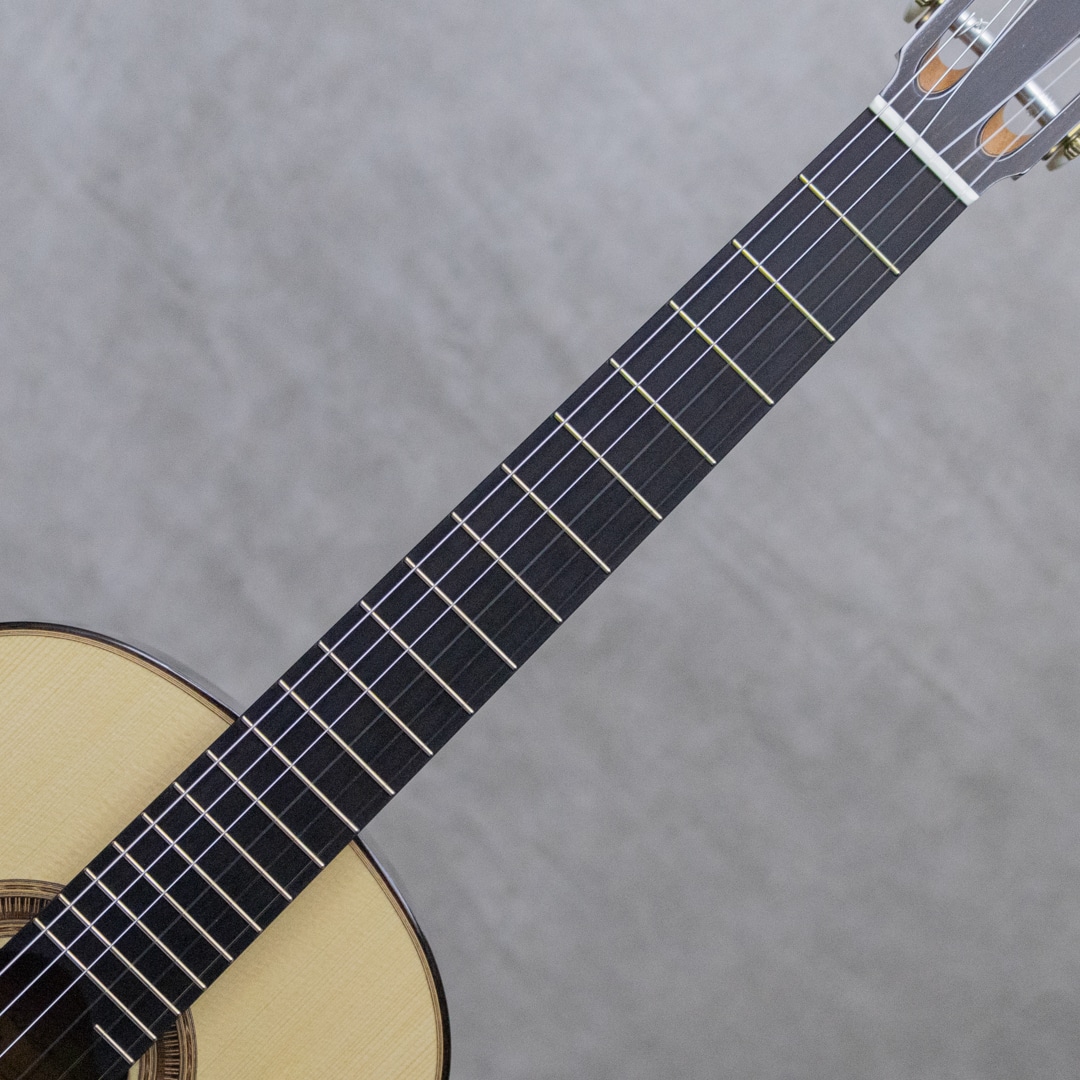神奈川・相模原にて小林良輔氏により製作されるRyosuke Kobayashi Guitars。氏は数々の著名な作家を輩出しているロバート・ベン・スクールでギター製作を学び、スギクラフト・杉田健司氏に師事。その後カナダのマスタールシアー、サーゲ・デ・ヤングの所でさらに業を磨き、現在の工房を開設。さらなる高みを目指し日々実直に優れたギターの製作に勤しんでいます。本器はクラシックモデルの” Classical RF German Spruce / Exotic Ebony”。弊社三木楽器株式会社の創立200周年を迎えるにあたり、氏が得意とする鉄弦フラットトップモデル、ナイロン弦クロスオーバーモデル、クラシックモデルの3本を特別モデルとしてオーダーさせていただいた記念モデル。本器はレイズドフィンガーボード仕様のクラシカルモデル。うっすらとベアクロウ杢の浮き出る美しいジャーマンスプルーストップ、明るい色味で真っ直ぐな杢目のエキゾチックエボニーサイド&バック、スパニッシュセダーネック、エボニー指板、中南米ローズウッドブリッジ、S&Bとマッチング材でのヘッドトップ天神板、ゴトー510ペグ、アイボロイドノブ、ラジアルモザイク&ヘリンボーンロゼッタ、エキゾチックエボニーバインディング&積層ウッドパーフリング、サイドサウンドポート。ボディ塗装は小林ギターお得意、質の高いフレンチポリッシュ仕上げです。レイズドフィンガーボード仕様で、本格的クラシックモデルの快作な1本。太くしっかりとした立ち上がり、エボニーS&Bですが、暗くなくモタつかずのクリアな響き。肉厚で重厚な箱鳴りとクイックで素直なレスポンスが同居する広いダイナミクスレンジを持ちながら、決して過敏ではなくまとまりの良いハイレベルな1本に仕上げられています。周年モデルと言うこともあり手間のかかる寄木細工のロゼッタの採用やまとまりのある外観など、小林氏の気合いのりも充分な1本。多くのミュージシャンの使用でも人気を伸ばしている小林良輔氏のKobayashi Guitars。そのこだわりと完成度を、是非お手元でお確かめください。 オリジナルハードケース付属