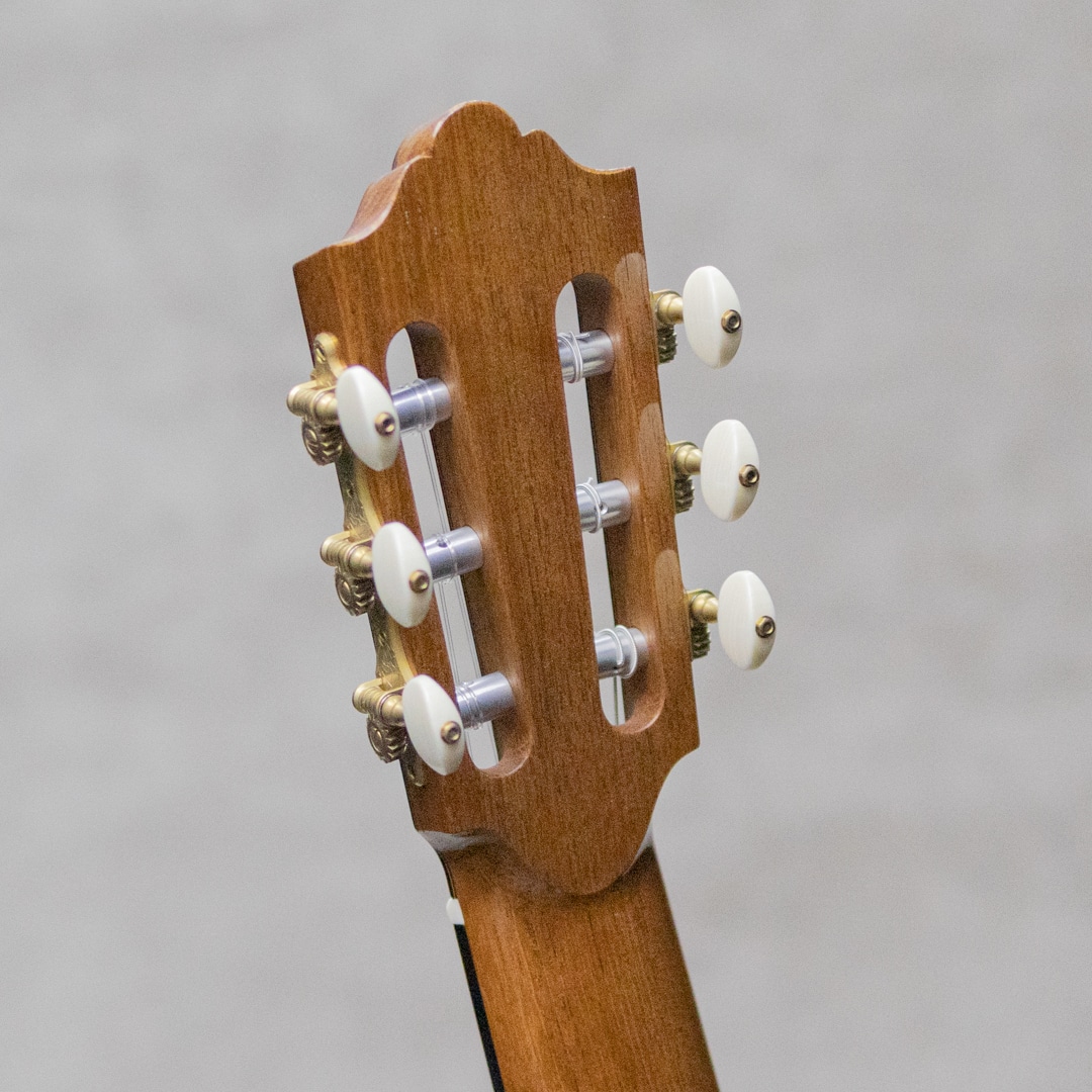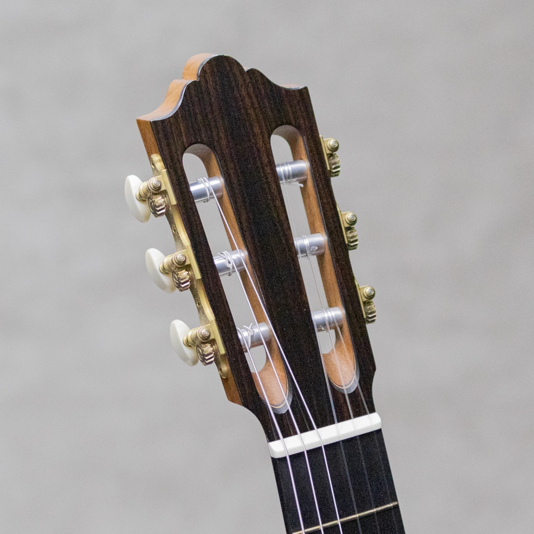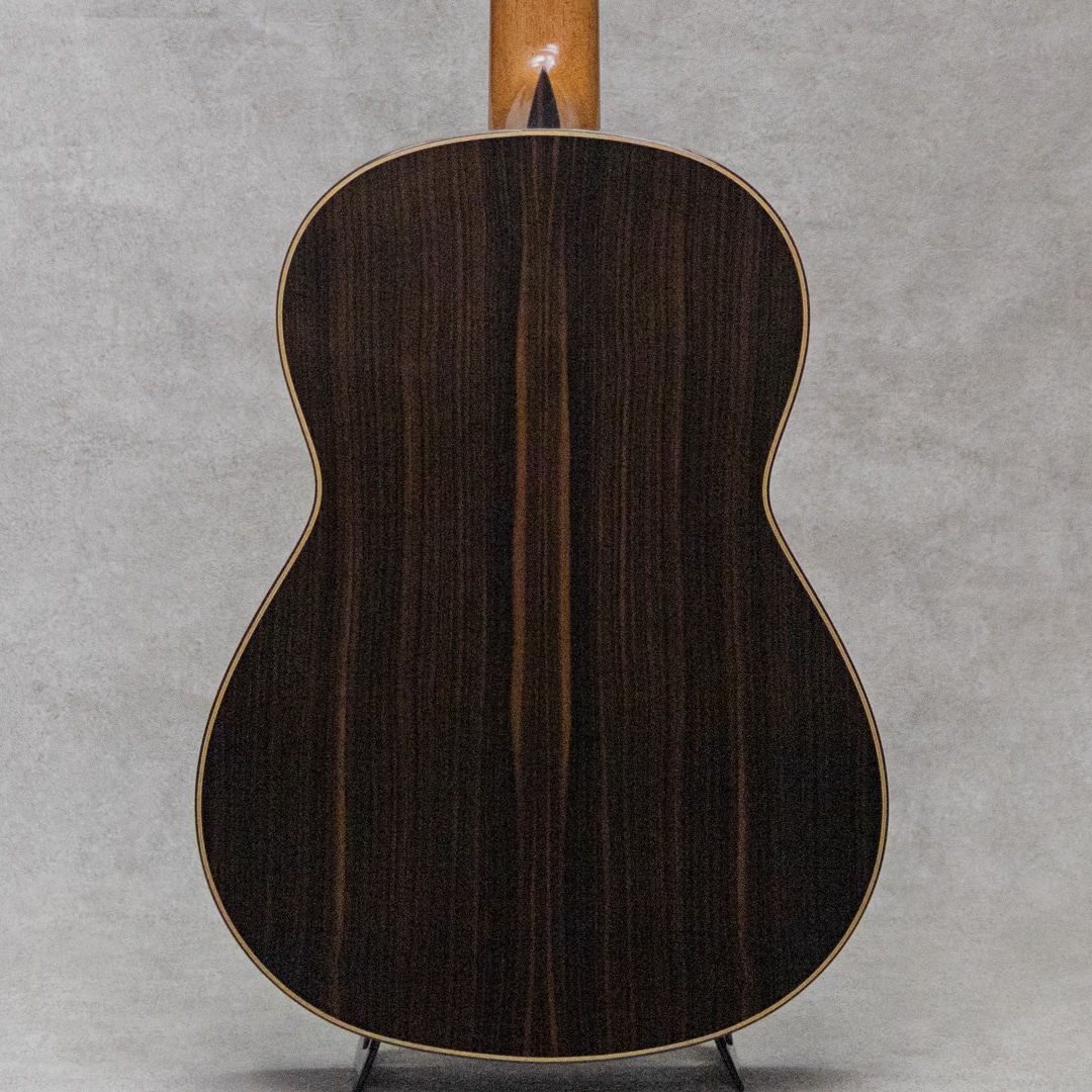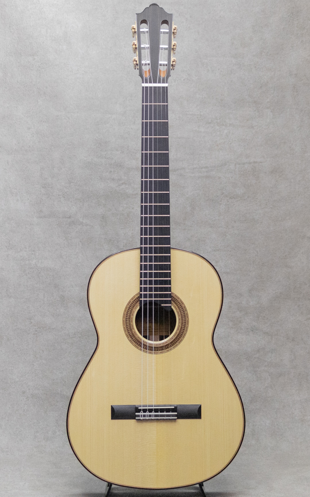 神奈川・相模原にて小林良輔氏により製作されるRyosuke Kobayashi Guitars。氏は数々の著名な作家を輩出しているロバート・ベン・スクールでギター製作を学び、スギクラフト・杉田健司氏に師事。その後カナダのマスタールシアー、サーゲ・デ・ヤングの所でさらに業を磨き、現在の工房を開設。さらなる高みを目指し日々実直に優れたギターの製作に勤しんでいます。本器はクラシックモデルの” Classical RF German Spruce / Exotic Ebony”。弊社三木楽器株式会社の創立200周年を迎えるにあたり、氏が得意とする鉄弦フラットトップモデル、ナイロン弦クロスオーバーモデル、クラシックモデルの3本を特別モデルとしてオーダーさせていただいた記念モデル。本器はレイズドフィンガーボード仕様のクラシカルモデル。うっすらとベアクロウ杢の浮き出る美しいジャーマンスプルーストップ、明るい色味で真っ直ぐな杢目のエキゾチックエボニーサイド&バック、スパニッシュセダーネック、エボニー指板、中南米ローズウッドブリッジ、S&Bとマッチング材でのヘッドトップ天神板、ゴトー510ペグ、アイボロイドノブ、ラジアルモザイク&ヘリンボーンロゼッタ、エキゾチックエボニーバインディング&積層ウッドパーフリング、サイドサウンドポート。ボディ塗装は小林ギターお得意、質の高いフレンチポリッシュ仕上げです。レイズドフィンガーボード仕様で、本格的クラシックモデルの快作な1本。太くしっかりとした立ち上がり、エボニーS&Bですが、暗くなくモタつかずのクリアな響き。肉厚で重厚な箱鳴りとクイックで素直なレスポンスが同居する広いダイナミクスレンジを持ちながら、決して過敏ではなくまとまりの良いハイレベルな1本に仕上げられています。周年モデルと言うこともあり手間のかかる寄木細工のロゼッタの採用やまとまりのある外観など、小林氏の気合いのりも充分な1本。多くのミュージシャンの使用でも人気を伸ばしている小林良輔氏のKobayashi Guitars。そのこだわりと完成度を、是非お手元でお確かめください。 オリジナルハードケース付属