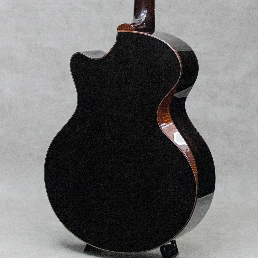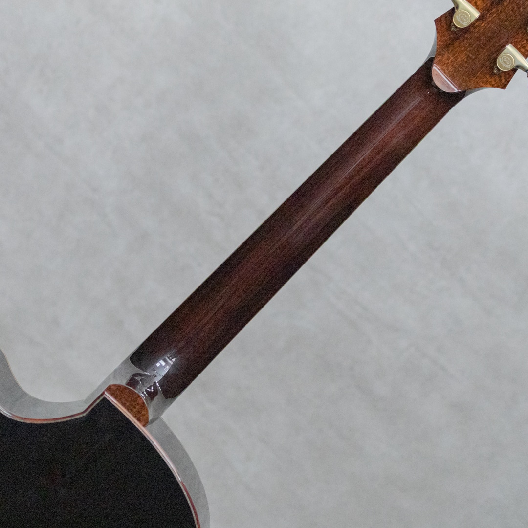 東京都小平市にて工房を構える西恵介氏が製作する"Keystone Stringed Instruments (要石弦楽器工房) “。製作理念、構造理論などを学ぶためにアーヴィン・ソモギ氏の一番弟子として有名なMario Beauregard(マリオ・ボーラガー)氏に師事。5年におよぶ日米での修行の後に自身の工房を2007年立上げ、日々更なる深化を求め製作に勤しんでいます。本器は、OMとSJの中間ほどのボディサイズを持つ”Coraje Cutaway German Spruce / African Blackwood w/Ogawa Inlay Craft works “Bouquet”"。弊社三木楽器株式会社の創立200周年を迎えるにあたり、2本の特別モデルをオーダーさせていただいた記念モデル。新潟・十日町にてハンドカットに拘ったインレイクラフトを勤しむ”Ogawa Inlay Craft”小川 貴之氏とのタッグモデルで、2本それぞれにコンセプトインレイを施してもらっています。本器は美しいマテリアルを贅沢に使用した”Coraje”に、美しい花束”Bouquet”のインレイワークが眩く彩る1本。トップには全面に浮き出る柾目痕と縮み杢が美しい極上のジャーマンスプルース、サイド&バックにはしっかりと柾目杢で採られた黒々とした極上のアフリカンブラックウッドを使用。ワンピースインディアンローズウッドネック、エボニー指板、スネークウッドブリッジ、スネークウッドヘッドトップ&バック天神板、ゴトー510ペグ、スネークウッドノブ、スネークウッド3Dロゼッタ、スネークウッドリブレスト、スネークウッドバインディング、3Dベネティアンカッタウェイ。ヘッドと指板12Fには、精巧に施されたセンスの光”Bouquet”のインレイワーク。ホワイトパール、ゴールドパール、ブラックパール、ブロンズパール、リコンストーン、スタビライズドウッドなどなどの様々なマテリアルを組み合わせ、花びらの1枚1枚はもちろん、花蕊の1本1本に至るまで緻密に作り込まれており、弊社周年を彩るためにデザインされた美しすぎる仕上がりです。サウンドの方も素晴らしく、西さんらしいきらびやかで反応の良いトーンと絡みつき折り重なる倍音が、重厚で肉厚な美しい響きを魅せてくれます。またローズウッドネックのお陰で得られるロングサスティンは、さまざまなタッチのニュアンスを克明に再生してくれます。名実ともに充実期を迎える国内実力派ルシアーのタッグ作、周年モデルと言うこともあり、サウンド・ビジュアル共にこちらの期待を大きく上回る至極の逸品に仕上がった本器。是非、お手元でゆっくりと、愛でて、弾いて、楽しんでください。オリジナルハードケース付属