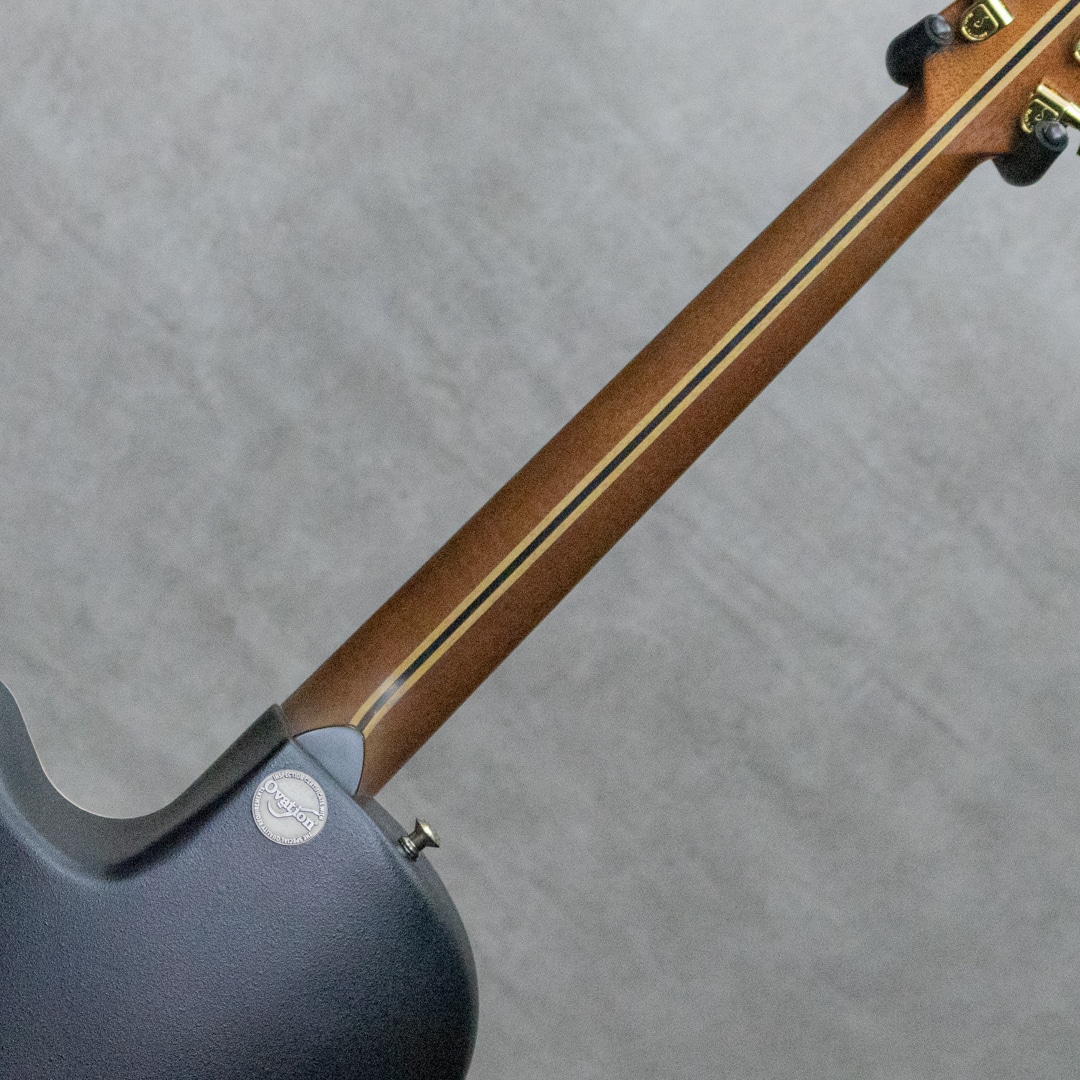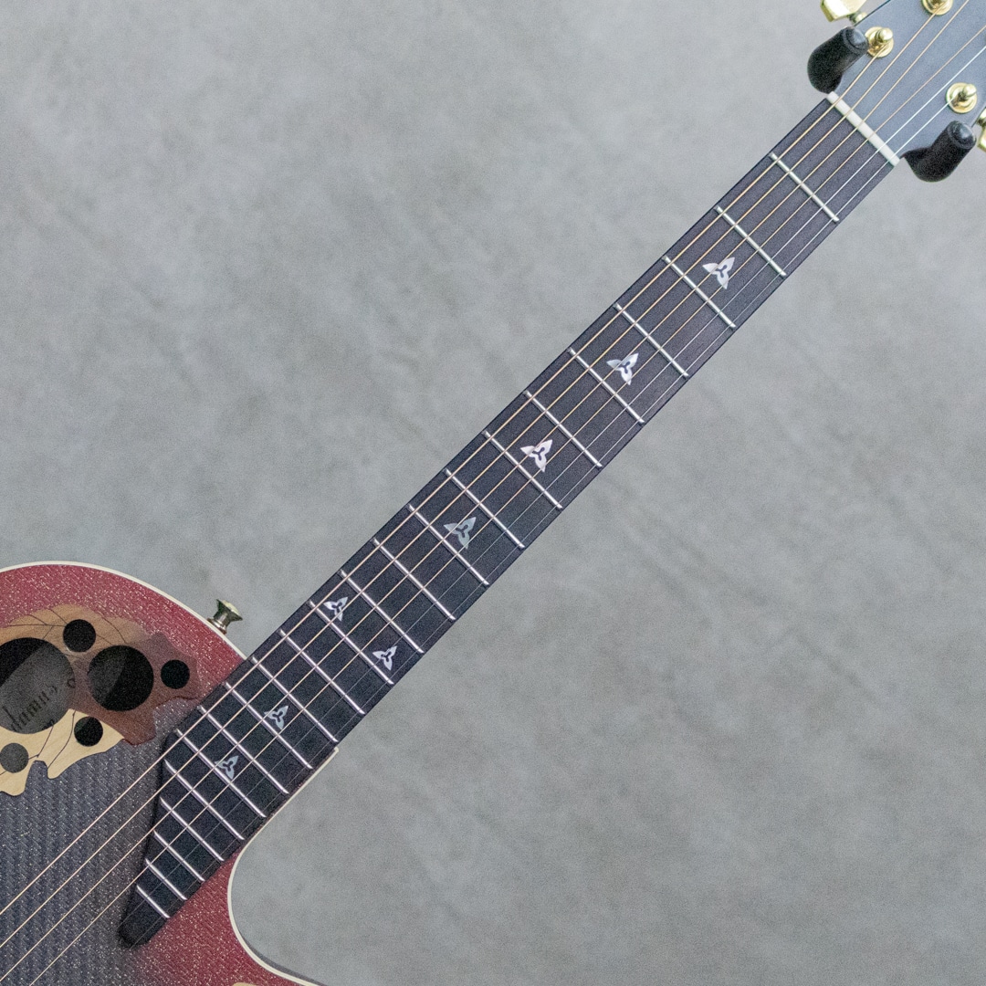 1966年、ヘリコプターの製造会社の社長であり、有名なギタリストでもあったチャールズ・カーマンによって設立されたオベーションは航空機の技術をギターに活かしたエレクトリックアコースティックギターを発売。保守的なミュージシャンにも受け入れられ、エレアコの代名詞的ブランドへと成長します。オべーション創始者チャーリー・カマンの生音へのさらなる探究心から1976年に誕生したアダマス。1976-77年にプロトタイプを多く生産し、1978年頃から今も残るスタイルのモデルを製造してきました。本器は、2000年に新しいアダマスラインナップとして発売された"Adamas CVT W597”。クロスウェーブ(交叉織)カーボントップのCVT、ユニディレクショナル(一方向性)カーボントップのSMTがラインナップされ、それぞれのカーボントップとウッドマテリアルを組み合わせたトップ構造を持つ新しいアダマスとして発売されました。本器はリバースレッドバーストカラーの2002年製USED品。クロスウェーブカーボンファイバーの外装でポプラ材をサンドイッチし構成される一般的なウッドトップの約4分の1の薄さのカーボントップ、リラコード樹脂ミッドデプスボウル、マホガニー積層ネック、エボニー指板&ブリッジ、ゴールドシャーラーペグ、MOP指板インレイ、マルチプルエポーレットサウンドホール、OPTIMAプリアンプ搭載、カッタウェイ仕様。ふくよかで奥深く、かつ明瞭でパンチのあるサウンド。歯切れ良くかつ響きの溢れるアダマスサウンドで、ラインサウンドを含め使い勝手の良い1本。ノッチフィルターを備えた”OPUTIMA”は使いやすくラインサウンドも安定し人気を博した人気プリアンプです。しっかりとグッドコンディションが保たれた本器。トップの変形もほとんど見られず良好。若干の小傷が見られる程度と良いコンディションで、ネック周りも良好で弾きやすいアクションをしっかりと保っています。まだまだしっかりと弾いて使えるアダマスCVT。要チェックください。オリジナルハードケース付属