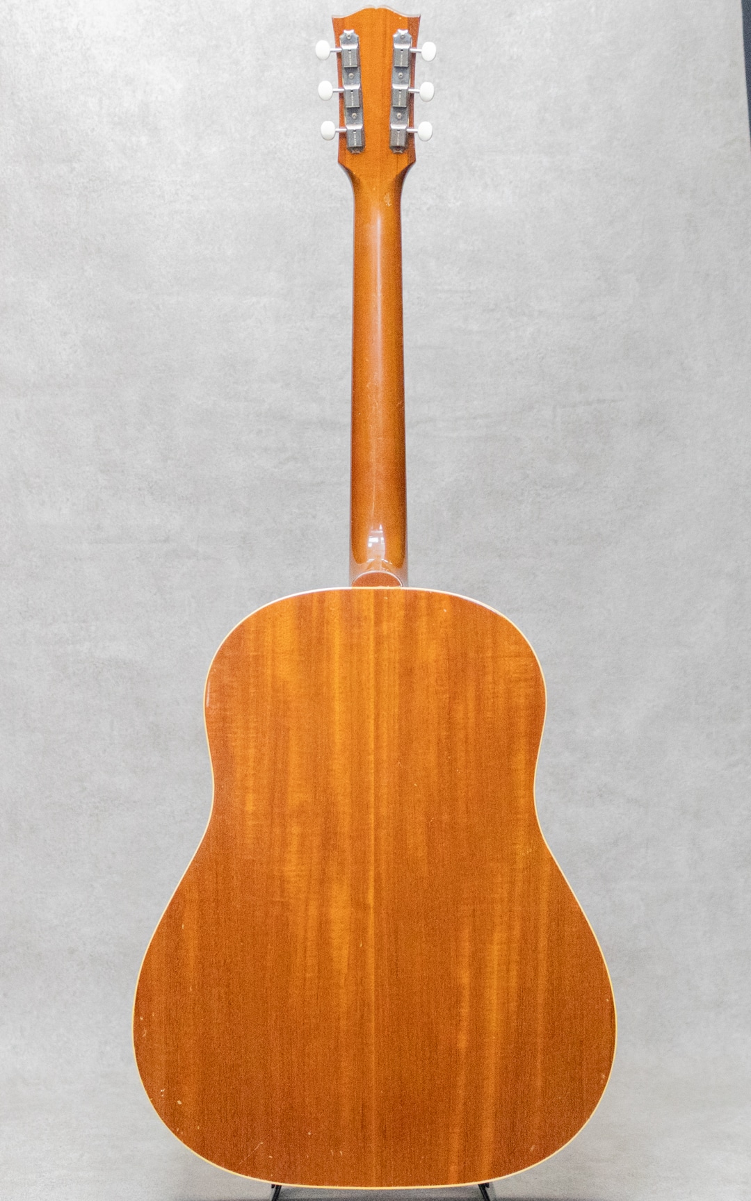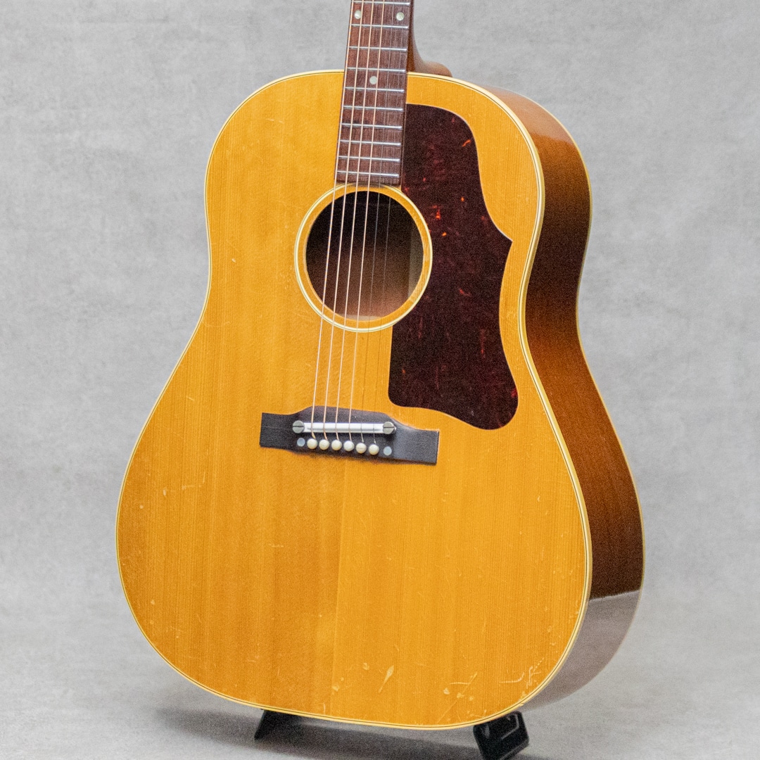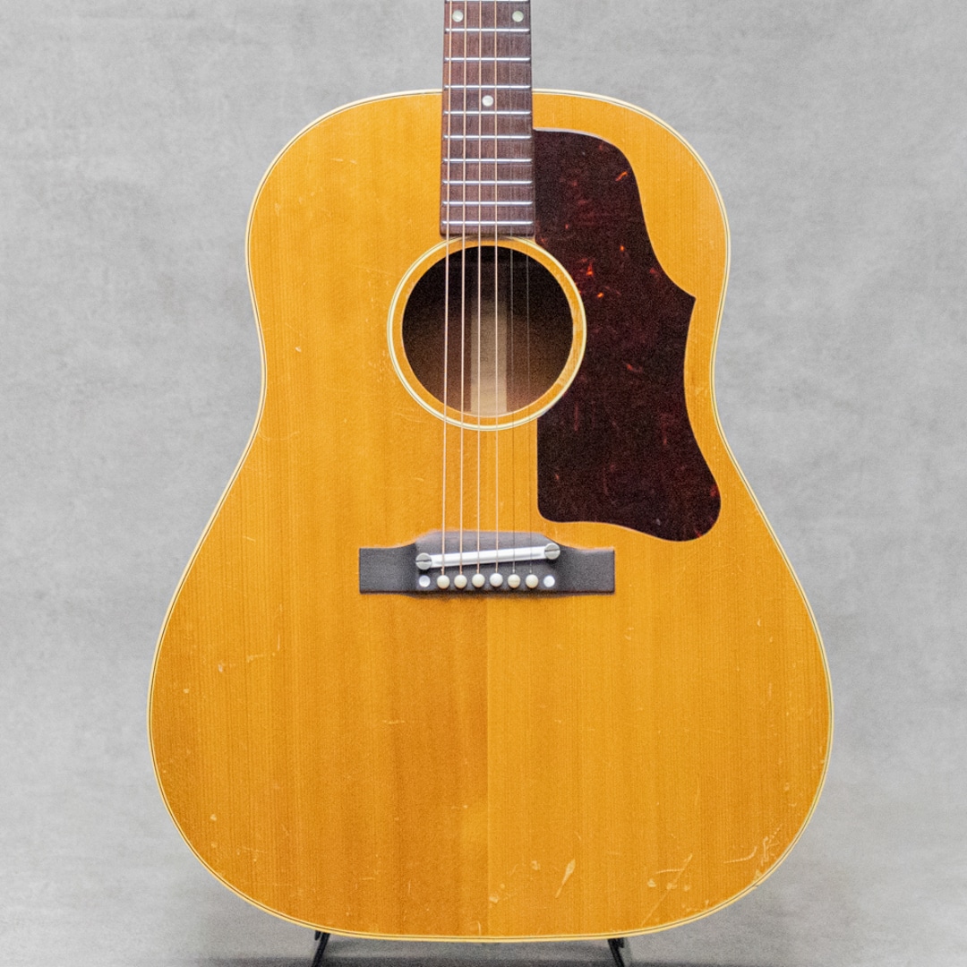 ギブソンフラットトップの顔、ワーキングホース"J-45"。ギブソンを代表する45と対をなす存在のナチュラルトップラウンドショルダーボディのジャンボモデルが本器”J-50"です。"J-45”を追う形で1947年に登場した”J-50”。ナチュラルトップが故に良材を選定し使用され別型番として登場。その後は”J-45”と対をなし共に歴史を歩みます。本器は1959年製の1本。スプルーストップ、マホガニーサイド&バック、マホガニーネック、ハカランダ指板&ブリッジ、セラミックアジャスタブルサドル、シングルライン3連クルーソンペグ、シングルリングロゼッタ、ポインテッドシンラージガード、ノンスキャロップド・Xブレイシング。握り心地がありながら太すぎない、特に人気の高い59ネックシェイプ。良い経年感で、まとまりかんのある乾いた独特の響きを持つ1本。ドシっと太いレスポンスに軽快な響き。オリジナルビンテージならではの泥臭いサウンドは、掻き鳴らせばロックに、爪弾けばノスタルジックに聴かせてくれます。この年代特有の少し大きめのアジャスタブルサドルビスも健在。しっかりと弾いてこられながらグッドコンディションが保たれた本器。細かな傷やサウンドホール縁のピッキングウェアは否めませんが、大きくえぐるような傷や割れなどはなく良好。ネックまわりも良好で弾きやすいアクションをしっかりと保っています。雰囲気満点、貫禄のナチュラルトップを魅せる”J-50”。本物の質感を、是非お手元でお楽しみください。ハードケース付属