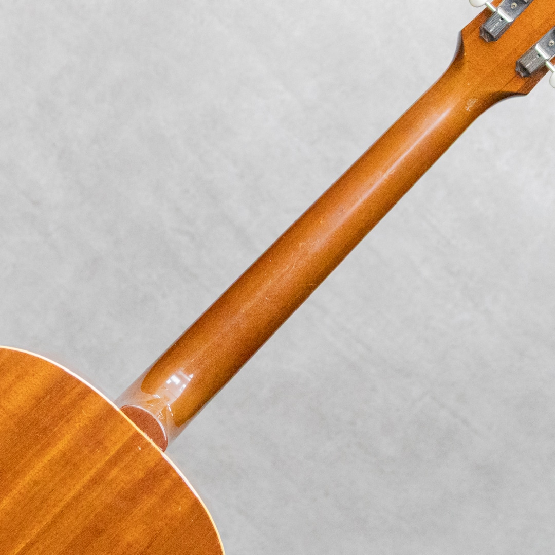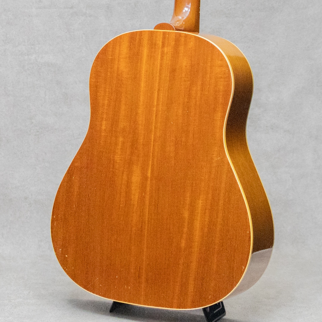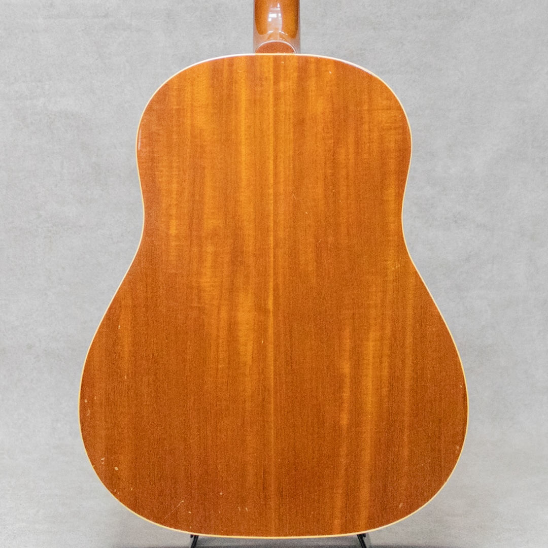 ギブソンフラットトップの顔、ワーキングホース"J-45"。ギブソンを代表する45と対をなす存在のナチュラルトップラウンドショルダーボディのジャンボモデルが本器”J-50"です。"J-45”を追う形で1947年に登場した”J-50”。ナチュラルトップが故に良材を選定し使用され別型番として登場。その後は”J-45”と対をなし共に歴史を歩みます。本器は1959年製の1本。スプルーストップ、マホガニーサイド&バック、マホガニーネック、ハカランダ指板&ブリッジ、セラミックアジャスタブルサドル、シングルライン3連クルーソンペグ、シングルリングロゼッタ、ポインテッドシンラージガード、ノンスキャロップド・Xブレイシング。握り心地がありながら太すぎない、特に人気の高い59ネックシェイプ。良い経年感で、まとまりかんのある乾いた独特の響きを持つ1本。ドシっと太いレスポンスに軽快な響き。オリジナルビンテージならではの泥臭いサウンドは、掻き鳴らせばロックに、爪弾けばノスタルジックに聴かせてくれます。この年代特有の少し大きめのアジャスタブルサドルビスも健在。しっかりと弾いてこられながらグッドコンディションが保たれた本器。細かな傷やサウンドホール縁のピッキングウェアは否めませんが、大きくえぐるような傷や割れなどはなく良好。ネックまわりも良好で弾きやすいアクションをしっかりと保っています。雰囲気満点、貫禄のナチュラルトップを魅せる”J-50”。本物の質感を、是非お手元でお楽しみください。ハードケース付属