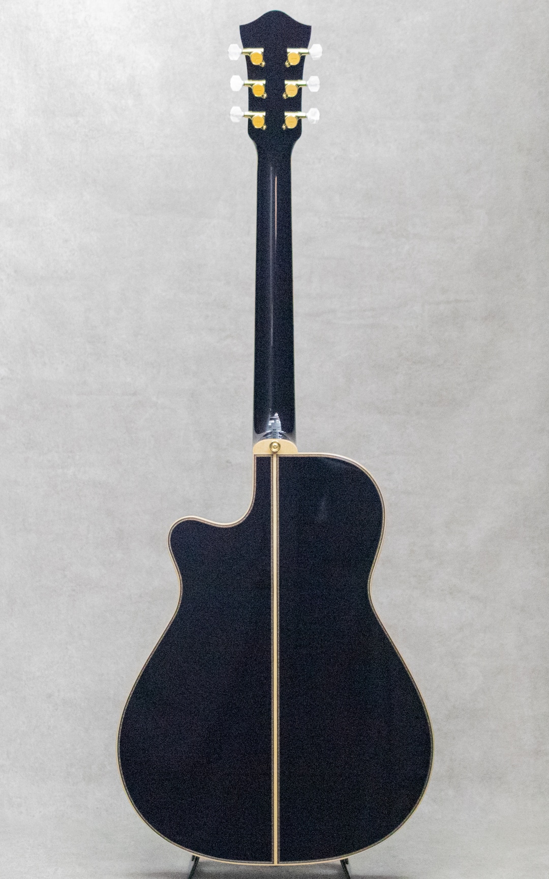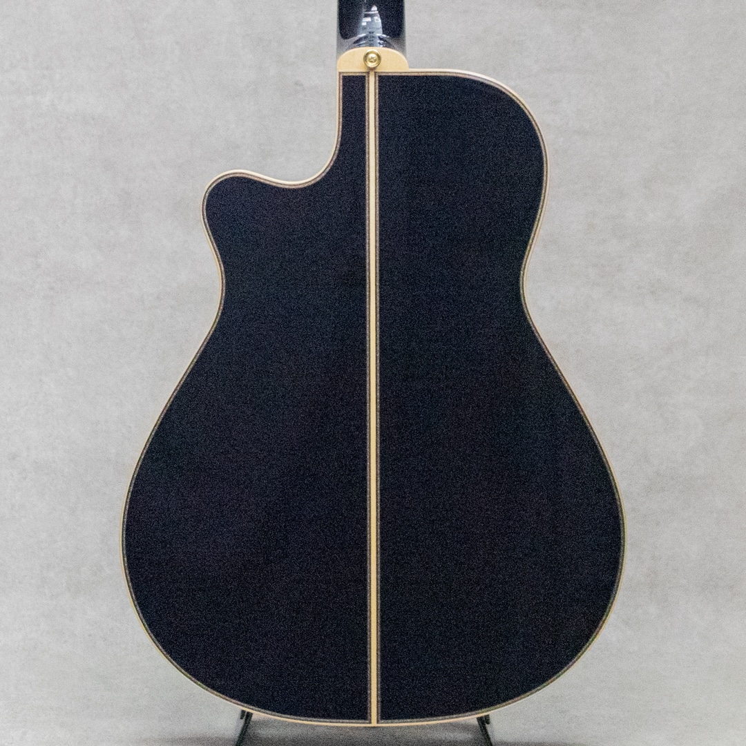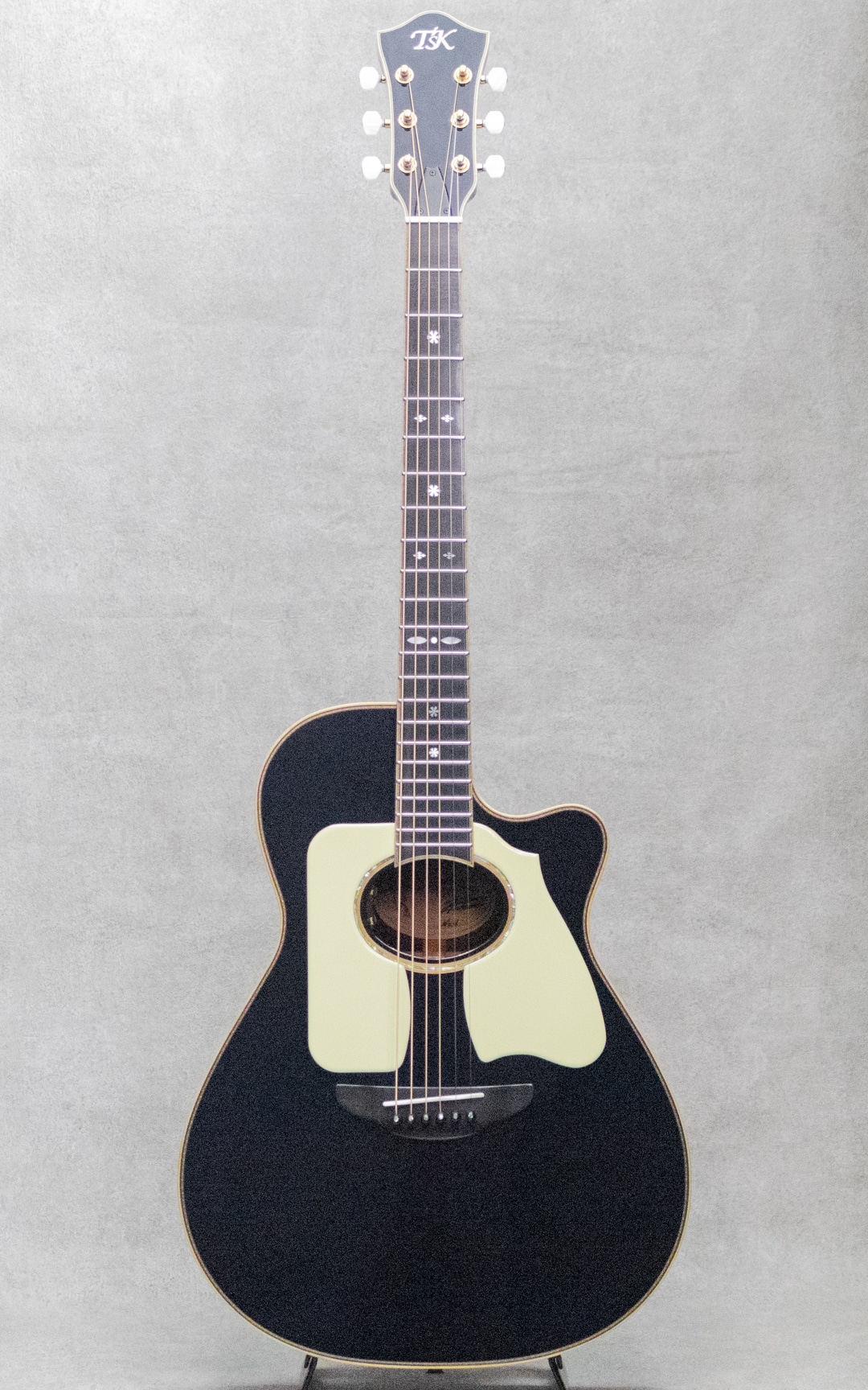 日本にカスタムギターを根付かせた最大の功労者"テリー中本”と、日本を代表するアーティストでありギタリストである"THE ALFEE 坂崎幸之助"がプロデュースするブランドTSK。本器はブランドリニューアル第2弾モデルで登場した"TSK-Midnight Navy"。深みのある濃紺色にホワイトWピックガードを配したコントラストの美しい1本。2017年製極上USED品。シトカスプルーストップ、インディアンローズウッドサイド&バック、ホンデュラスマホガニーネック、エボニー指板&ブリッジ、ゴトーゴールドペグ/パーロイドノブ、TSKスノウフレイクス指板インレイ、ホワイトWピックガード、アバロンロゼッタ、木象嵌トリム&メイプルバインディング、ベネチアンカッタウェイ。坂崎幸之助氏が所有する"Terry's Terry"のシリアルナンバーNo.21をデザインベースとしたモデル。氏の不動のメインギター"No.8"同様の薄胴シェイプながらに豊かな倍音と音量を実現した本器。取回しの良いボディサイズでストレートアコースティックの良さを存分に味わえる仕上がりになっています。テリーズブランド直系のきらびやかな高音としっかりとした造りを継承する1本。使用に伴う目立つ傷などもなく、とても良いコンディションを保った本器。ネックまわりも良好でとても弾きやすいアクションをしっかりと保っています。ネックヒール部にストラップピン増設。後付けにて坂崎氏も愛用するL.R.Baggs Element VTCピックアップが取付搭載されています。なかなか出回りも少ないTSKモデル。美しい外観と、素晴らしいサウンドを是非、そのお手元でお確かめください。オリジナルハードケース付属