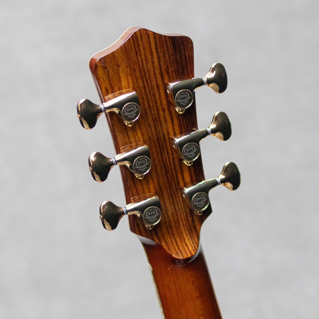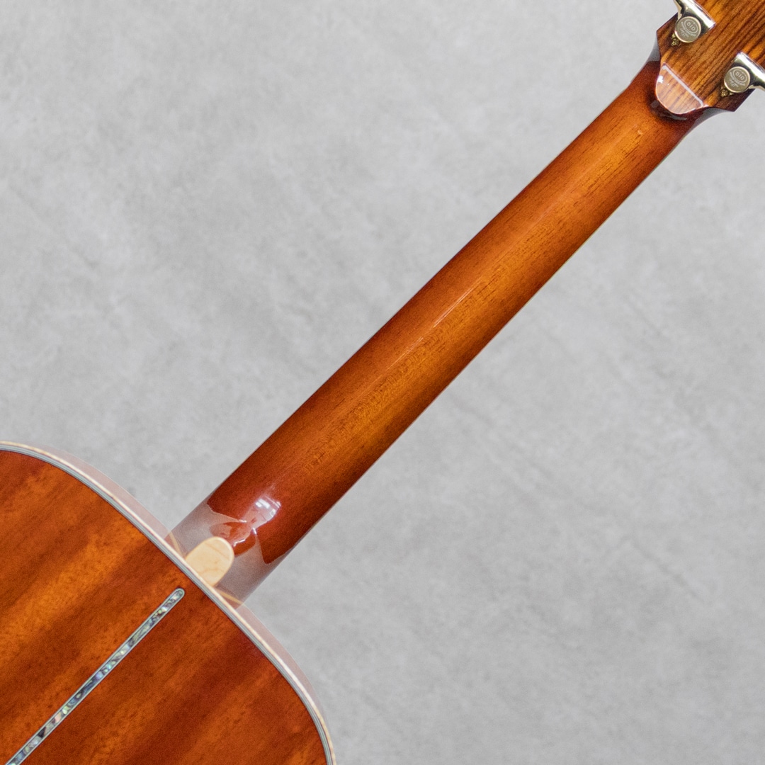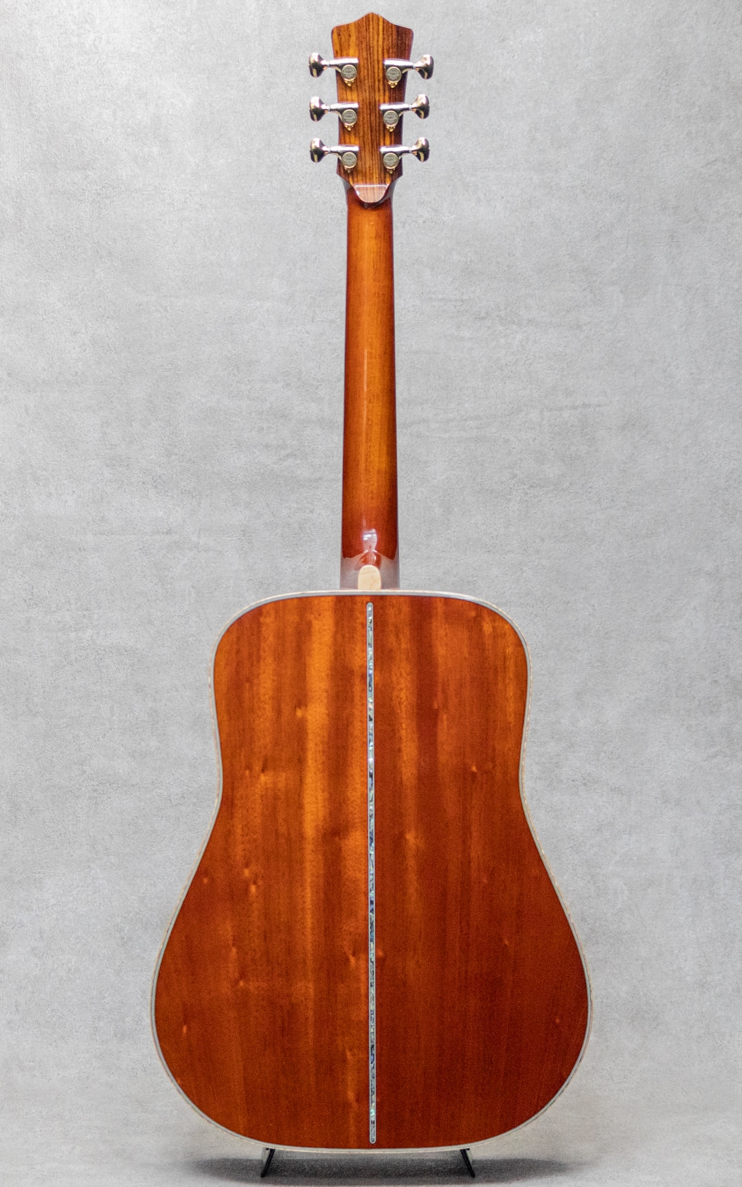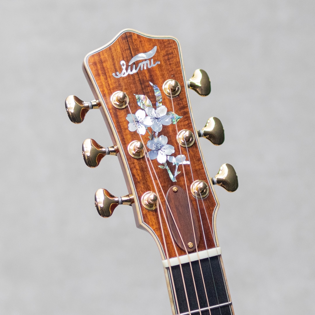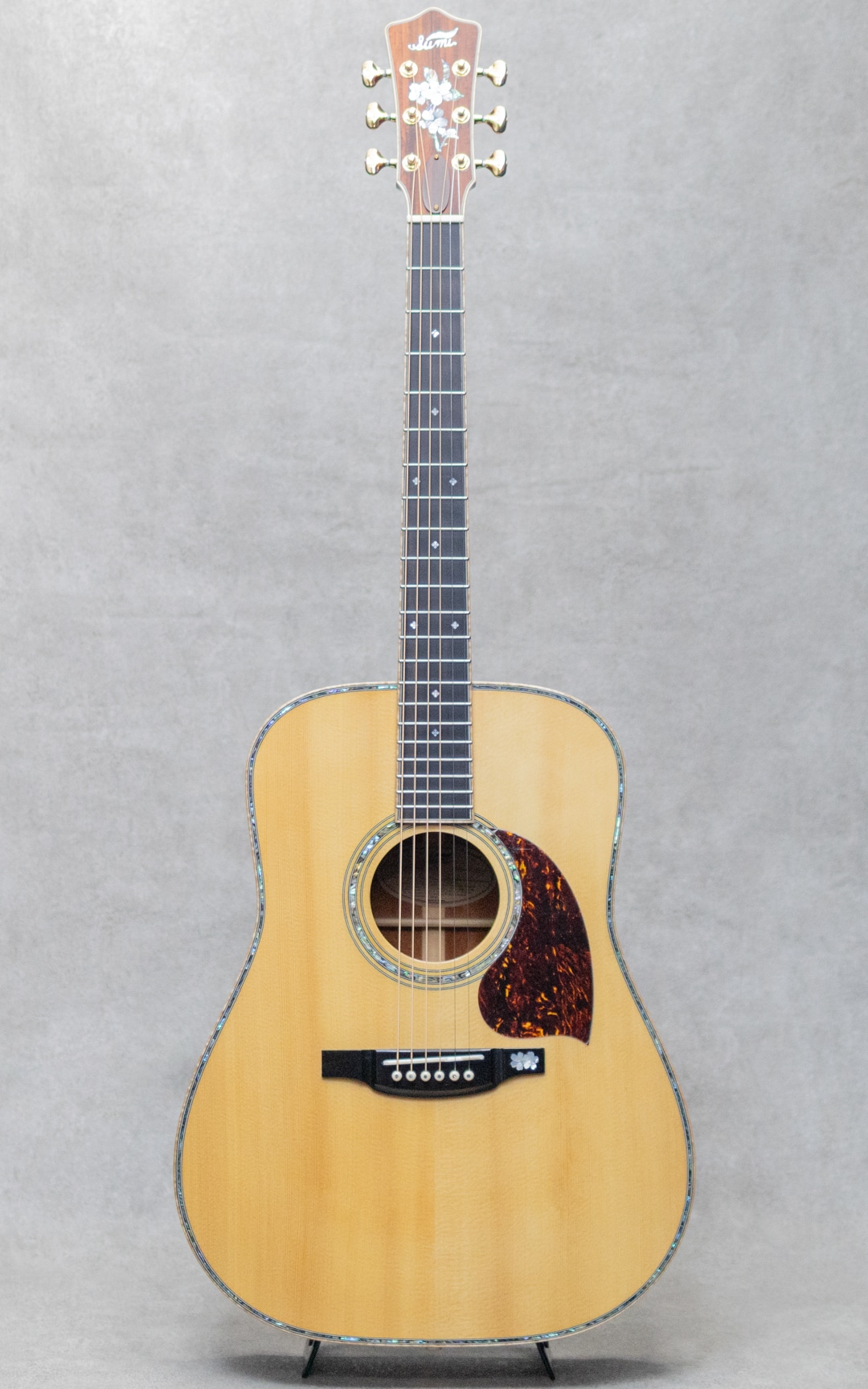 アコースティックギター、ウクレレ、マンドリンなど、あらゆる弦楽器作りにおいて評価が高く、キャリア40年を誇る長野県のベテラン製作家”鷲見英一”氏。本器は美しい桜インレイで彩られた岡崎倫典モデルの”S-DM-Rynten”。奥深く響きながら澄んだ優しい音色の2024年製極上USED品。柾目痕が立体的に揺らめくエゾ松トップ、リボン杢がホログラムのようにゆらめくホンジュラスマホガニーサイド&バック、ワンピースマホガニーネック、エボニー指板&ブリッジ、ゴトー510Zゴールドペグ、べっ甲柄セルロイドピックガード、フィギュアドメイプルバインディング、アバロンロゼッタ、アバロンボディトリム&バックストリップインレイ、ヘッド&下駒の桜インレイ。ウッドバインディングで統一されアバロンインレイと桜が映える上品な佇まいの1本。ドレッドらしく重厚に奥深く響きながら、どこかドライで分離が良く響く本器。低音はローズ系のそれとは異なり、奥深いながら澄んだ爽やかな音色を聴かせてくれ、金属質でなく耳馴染みの良い高域が優しく折り重なり響き渡ってくれます。フィンガータッチでもしっかりと反応しながらピーキーでなく弾きやすいレスポンスを持っており、ゆったりとしっかりとプレイフィールを支えてくれます。生楽器ならではのダイナミクス感を確保しながら整えられたトーンは鷲見氏ならでは。使用感すら伺いにくい極上コンディションの本器。元々塗膜の薄いSumiギターですが傷も見受けられず、早くも塗装引けが見られる程度。もちろんネックまわりも良好で、弾きやすいコンディションをしっかりと保っています。ドレッドスタイルで軽やかに、時に激しく重厚に、そして優しく美しく。。心地よいメロディを奏でていただくのにオススメ度大の1本です。お見逃しなく。オリジナルハードケース付属