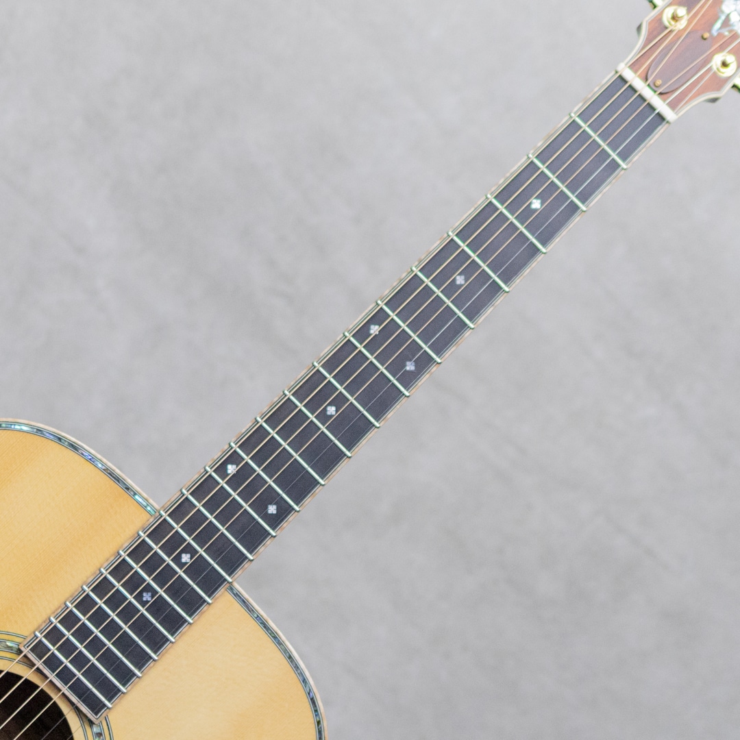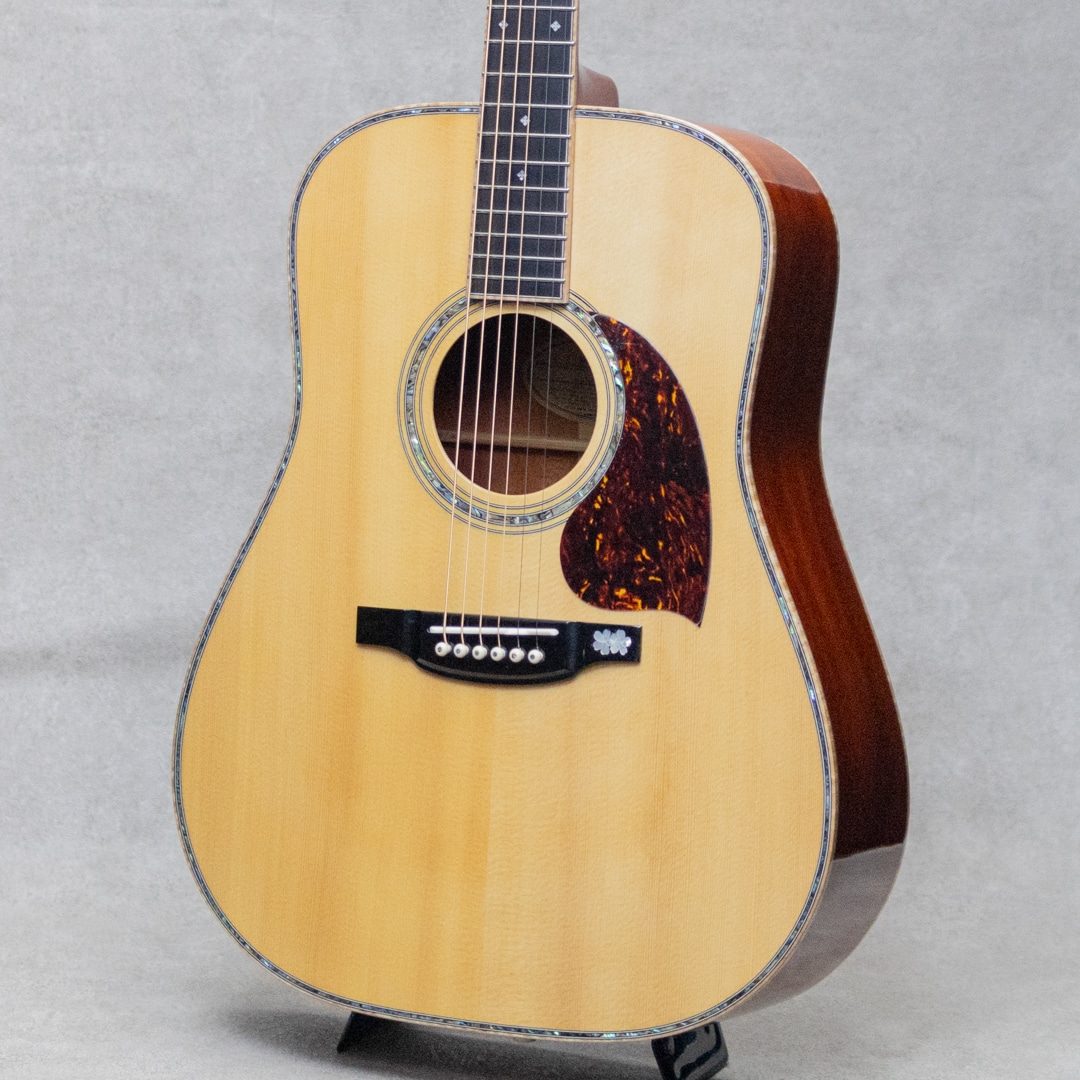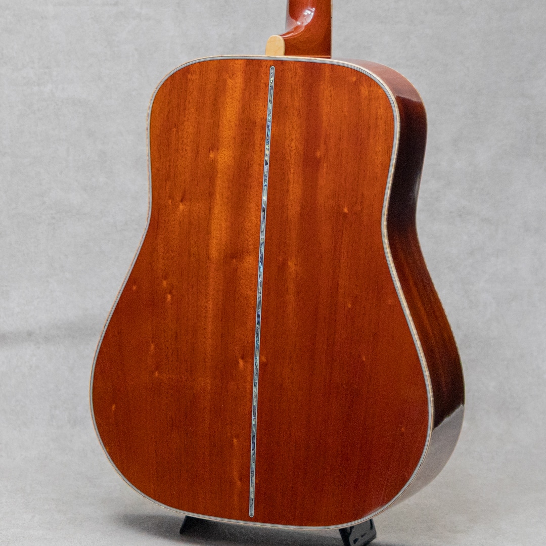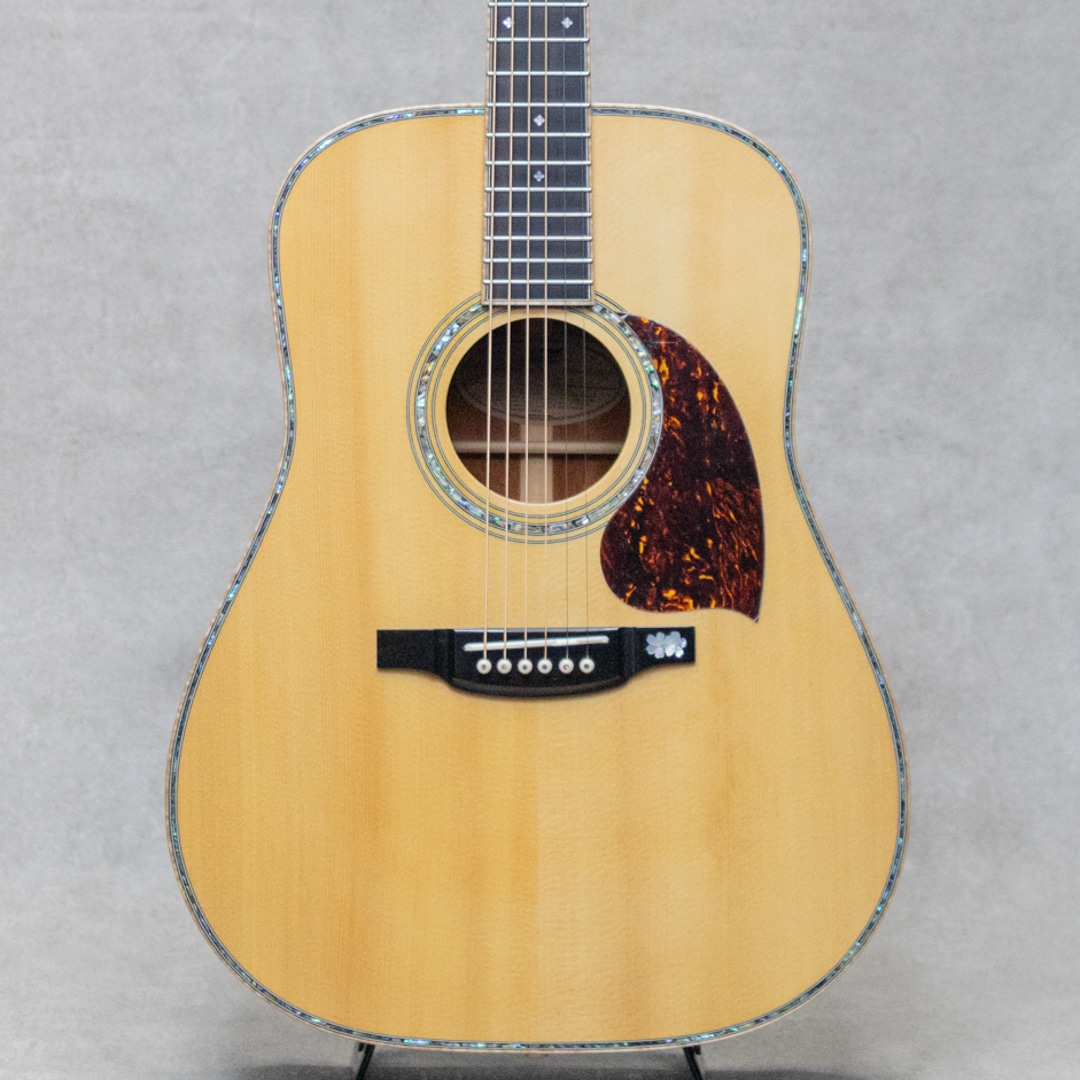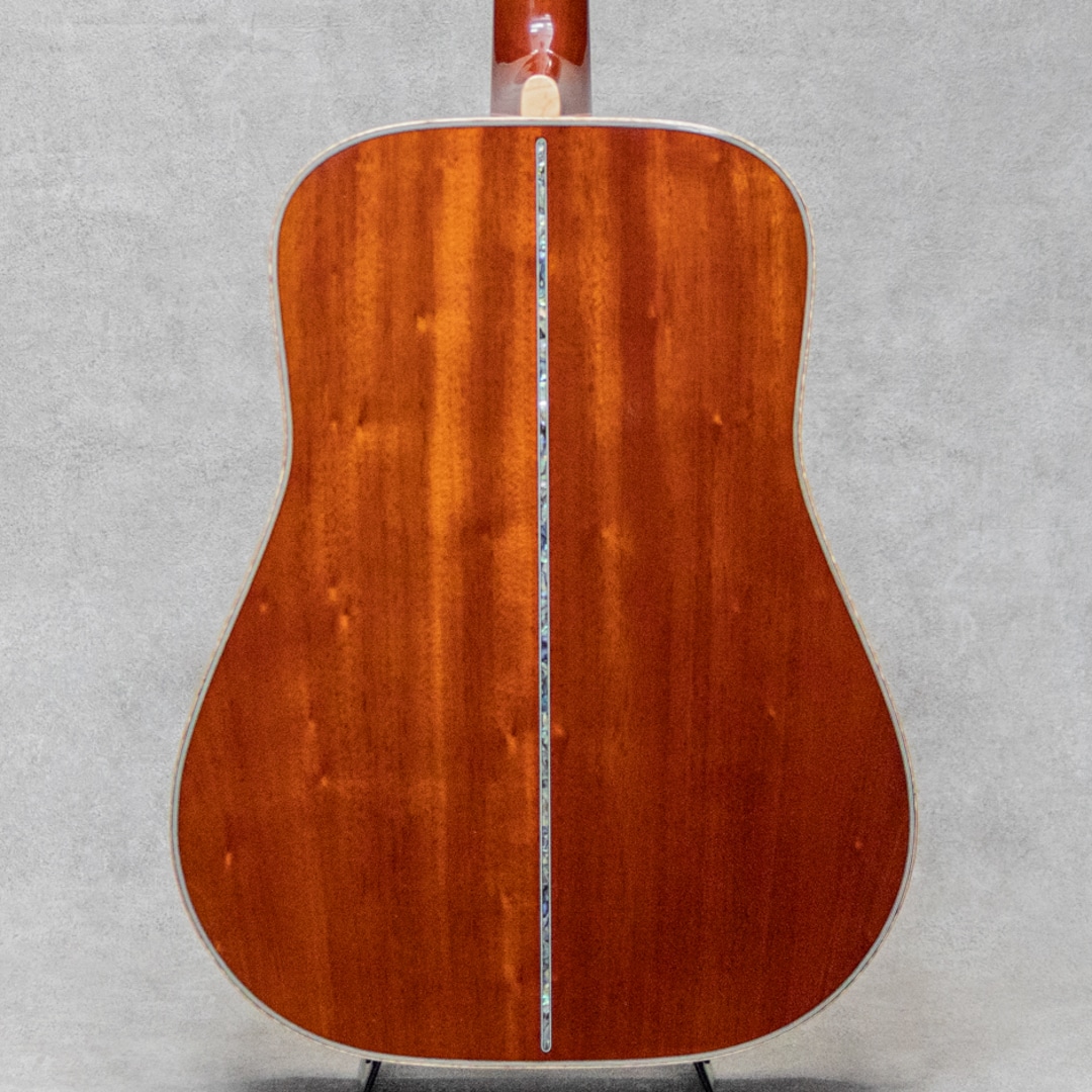 アコースティックギター、ウクレレ、マンドリンなど、あらゆる弦楽器作りにおいて評価が高く、キャリア40年を誇る長野県のベテラン製作家”鷲見英一”氏。本器は美しい桜インレイで彩られた岡崎倫典モデルの”S-DM-Rynten”。奥深く響きながら澄んだ優しい音色の2024年製極上USED品。柾目痕が立体的に揺らめくエゾ松トップ、リボン杢がホログラムのようにゆらめくホンジュラスマホガニーサイド&バック、ワンピースマホガニーネック、エボニー指板&ブリッジ、ゴトー510Zゴールドペグ、べっ甲柄セルロイドピックガード、フィギュアドメイプルバインディング、アバロンロゼッタ、アバロンボディトリム&バックストリップインレイ、ヘッド&下駒の桜インレイ。ウッドバインディングで統一されアバロンインレイと桜が映える上品な佇まいの1本。ドレッドらしく重厚に奥深く響きながら、どこかドライで分離が良く響く本器。低音はローズ系のそれとは異なり、奥深いながら澄んだ爽やかな音色を聴かせてくれ、金属質でなく耳馴染みの良い高域が優しく折り重なり響き渡ってくれます。フィンガータッチでもしっかりと反応しながらピーキーでなく弾きやすいレスポンスを持っており、ゆったりとしっかりとプレイフィールを支えてくれます。生楽器ならではのダイナミクス感を確保しながら整えられたトーンは鷲見氏ならでは。使用感すら伺いにくい極上コンディションの本器。元々塗膜の薄いSumiギターですが傷も見受けられず、早くも塗装引けが見られる程度。もちろんネックまわりも良好で、弾きやすいコンディションをしっかりと保っています。ドレッドスタイルで軽やかに、時に激しく重厚に、そして優しく美しく。。心地よいメロディを奏でていただくのにオススメ度大の1本です。お見逃しなく。オリジナルハードケース付属