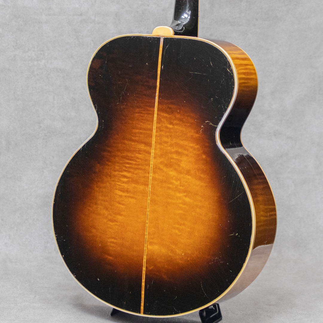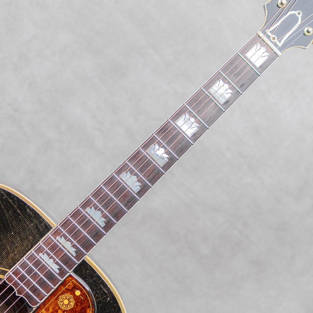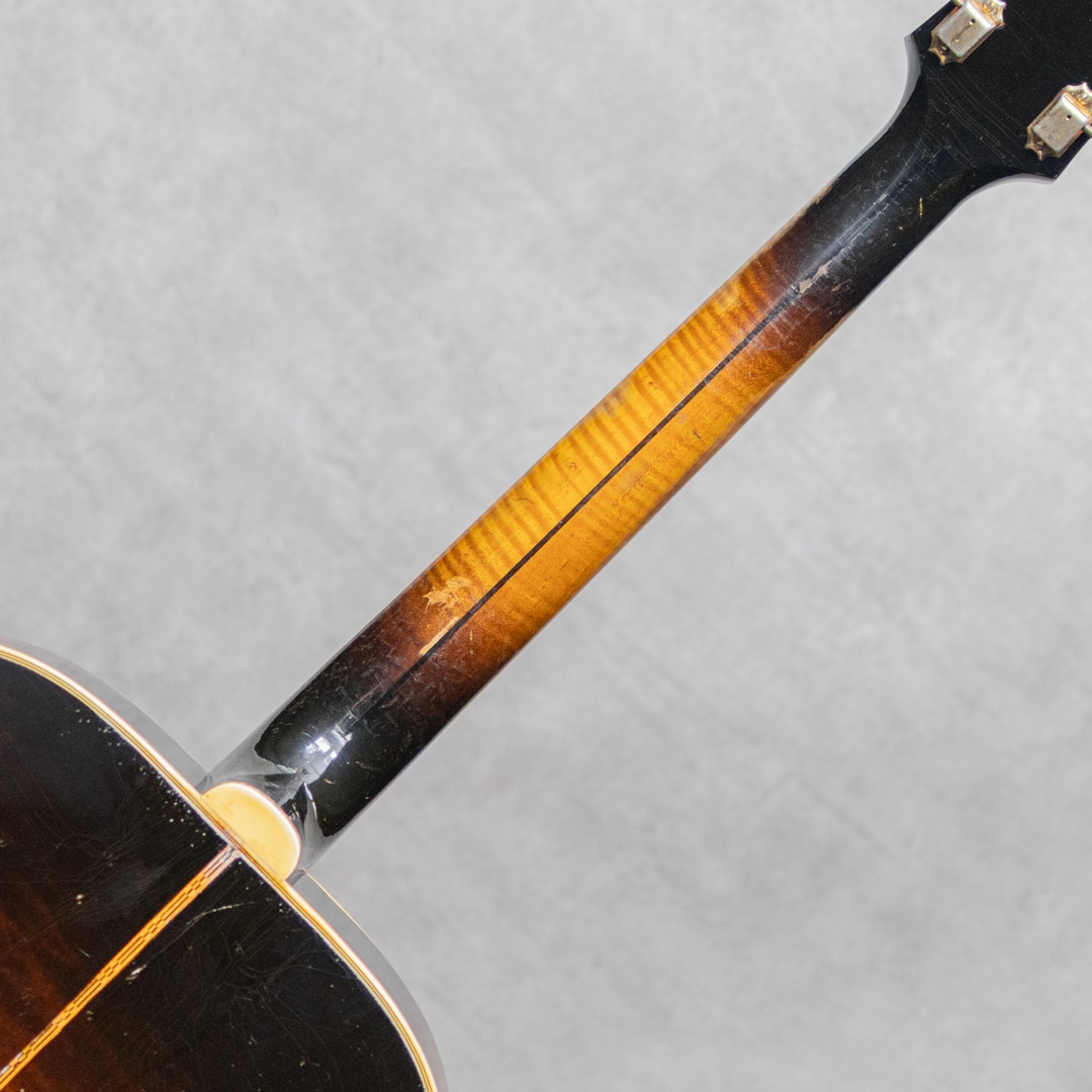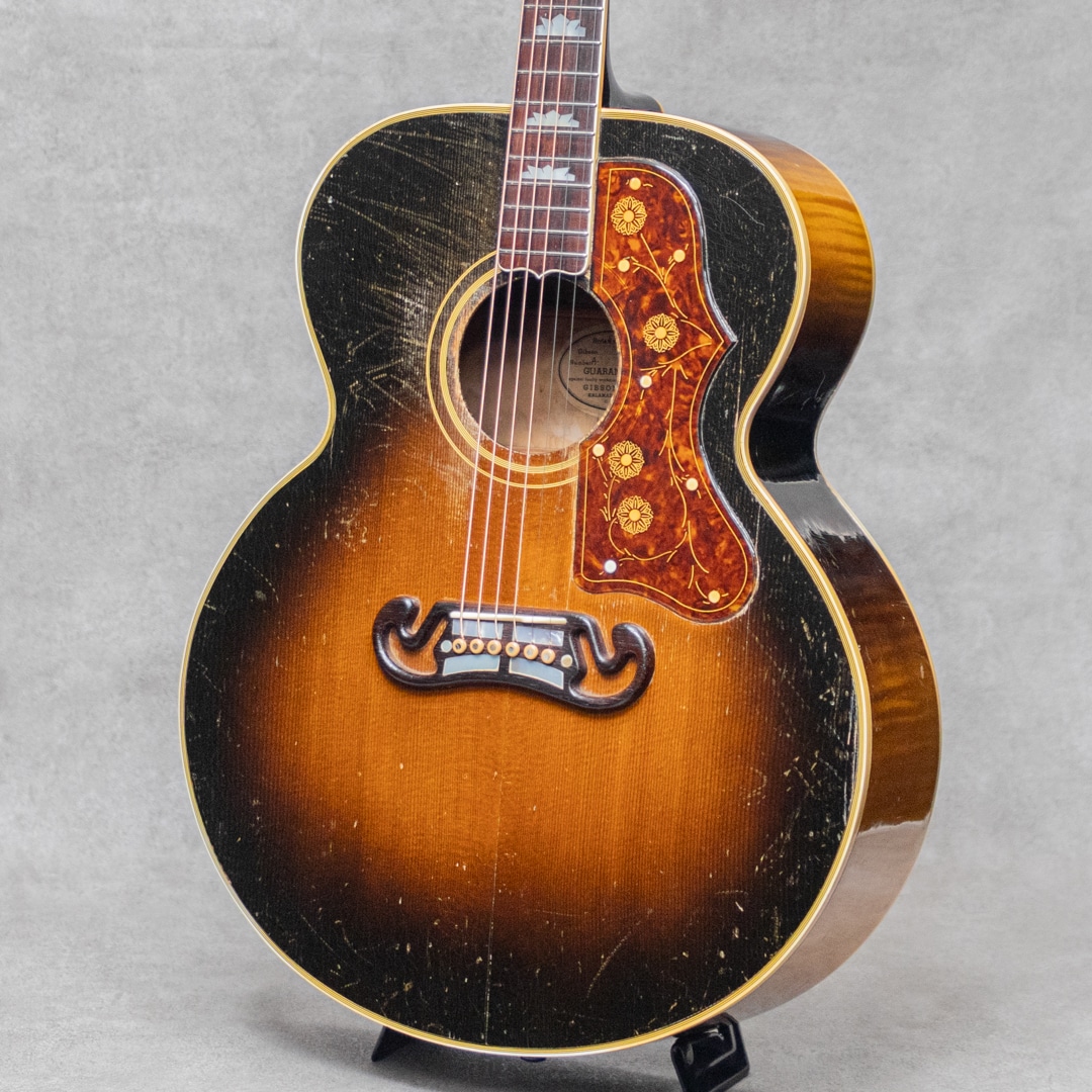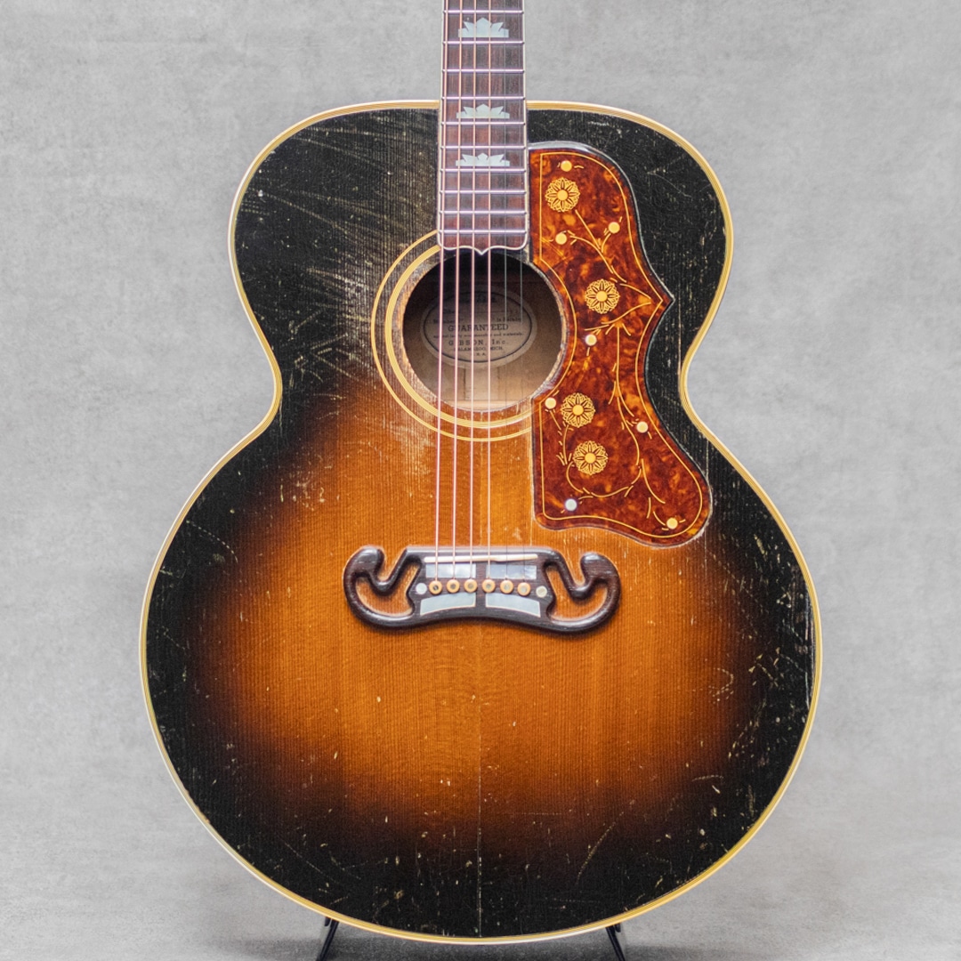 キング・オブ・フラットトップとまで言われるギター"SJ-200"。大音量が求められていたその頃の流れに乗って1937年に製造が開始されたギブソンの最高級モデルです。本器は、希少なオリジナルホワイトインナーラベル期サンバーストカラーの1本。1952年製Vintage品で、Aシリアルは1953年出荷レンジです。1952年に仕様変更された4 7/8"深ボディ仕様。スプルーストップ、メイプルサイド&バック、メイプルネック、オリジナルクルーソンデラックスゴールドペグ、ハカランダ指板、パールインレイオープンムスタッシュブリッジ、ライン入りベッコウセルピックガード、クラウンヘッドロゴ&指板インレイ。ブリッジピンはタスク製に交換されています。ドライでワイルドな響き。パンチがありザクっ!と切り裂く明瞭な響き。使用傷こそあれどもオリジナルフィニッシュならではのザ・キング・オブ・フラットトップサウンド。ピッキングウェア・小傷やウェザーチェッキングは貫禄すら伺えます。"SJ-200”は構造上、グッドコンディションものが少ないですが、本器はクラック補修こそあれどプレイコンディション含めなかなかのグッドコンディションを保っています。トップの膨らみはほとんどなく、ネック、サドル高などのプレイ環境は理想的で将来性もあり、経年を考えればプレイコンディションに関わる程度はすこぶる良いコンディションです。トップセンターシーム、指板両サイド、6弦側サイド板に1箇所、それぞれ杢目に沿ったクラックの補修が見られますが、いずれも丁寧に補修されています。PGまわりやリムまわりに杢目に沿った塗装亀裂が見られますが、現状クラックまでは至っていません。過去にエンド部が12mmに加工されており、現在はコンバージョンピンを装着しています。なかなか出回らないスーパージャンボモデル。コレクションはもちろん、そのオリジナルサウンドに浸ってください。その他の詳細もお気軽にお問い合わせ下さい。オリジナルブラウンケース付属