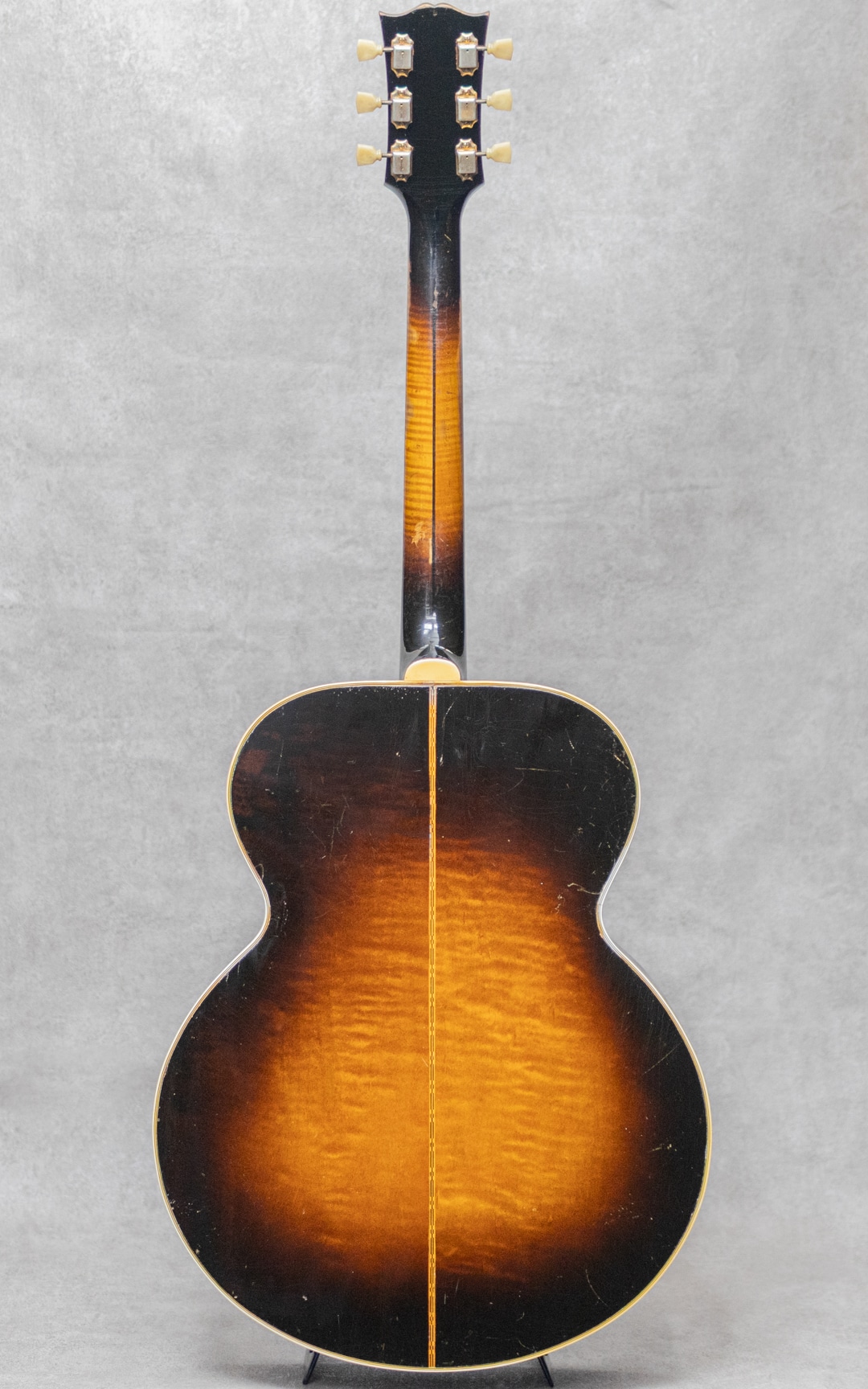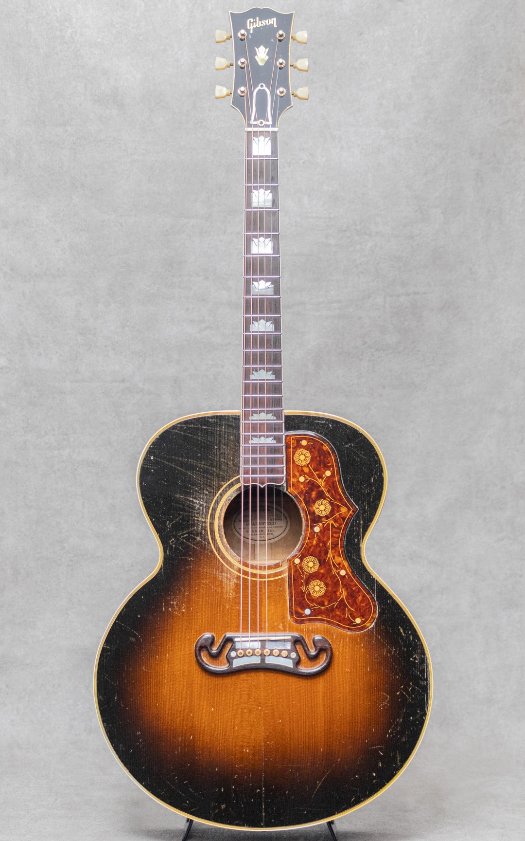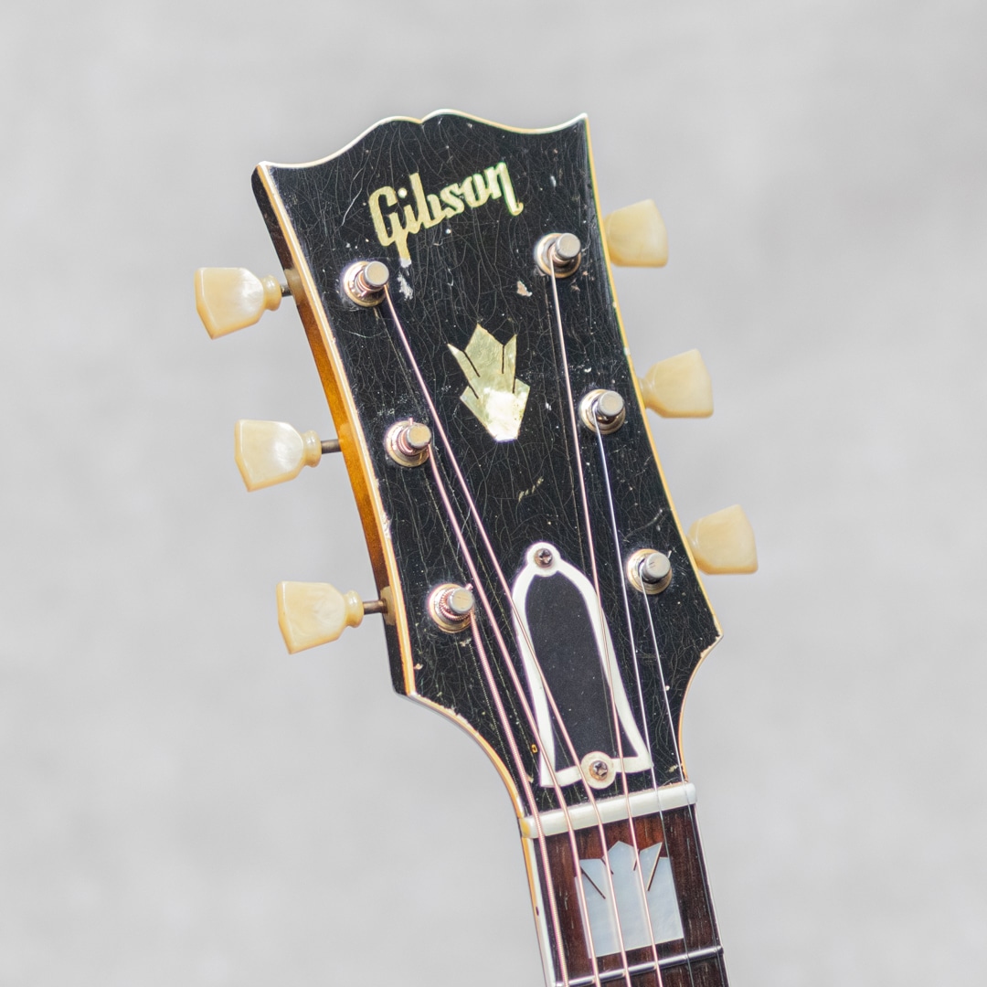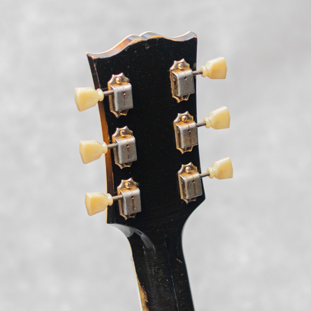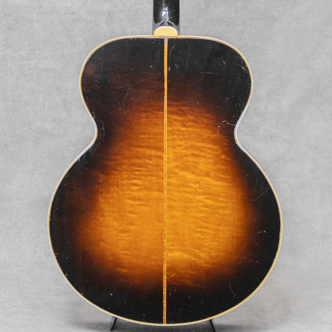 キング・オブ・フラットトップとまで言われるギター"SJ-200"。大音量が求められていたその頃の流れに乗って1937年に製造が開始されたギブソンの最高級モデルです。本器は、希少なオリジナルホワイトインナーラベル期サンバーストカラーの1本。1952年製Vintage品で、Aシリアルは1953年出荷レンジです。1952年に仕様変更された4 7/8"深ボディ仕様。スプルーストップ、メイプルサイド&バック、メイプルネック、オリジナルクルーソンデラックスゴールドペグ、ハカランダ指板、パールインレイオープンムスタッシュブリッジ、ライン入りベッコウセルピックガード、クラウンヘッドロゴ&指板インレイ。ブリッジピンはタスク製に交換されています。ドライでワイルドな響き。パンチがありザクっ!と切り裂く明瞭な響き。使用傷こそあれどもオリジナルフィニッシュならではのザ・キング・オブ・フラットトップサウンド。ピッキングウェア・小傷やウェザーチェッキングは貫禄すら伺えます。"SJ-200”は構造上、グッドコンディションものが少ないですが、本器はクラック補修こそあれどプレイコンディション含めなかなかのグッドコンディションを保っています。トップの膨らみはほとんどなく、ネック、サドル高などのプレイ環境は理想的で将来性もあり、経年を考えればプレイコンディションに関わる程度はすこぶる良いコンディションです。トップセンターシーム、指板両サイド、6弦側サイド板に1箇所、それぞれ杢目に沿ったクラックの補修が見られますが、いずれも丁寧に補修されています。PGまわりやリムまわりに杢目に沿った塗装亀裂が見られますが、現状クラックまでは至っていません。過去にエンド部が12mmに加工されており、現在はコンバージョンピンを装着しています。なかなか出回らないスーパージャンボモデル。コレクションはもちろん、そのオリジナルサウンドに浸ってください。その他の詳細もお気軽にお問い合わせ下さい。オリジナルブラウンケース付属