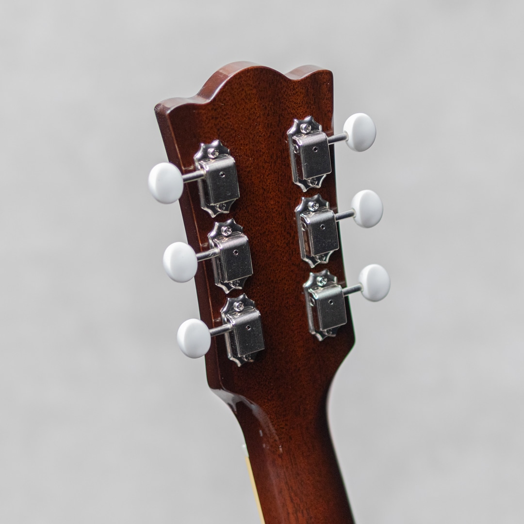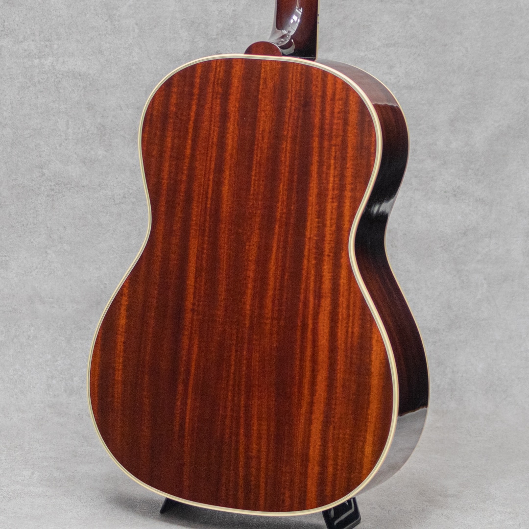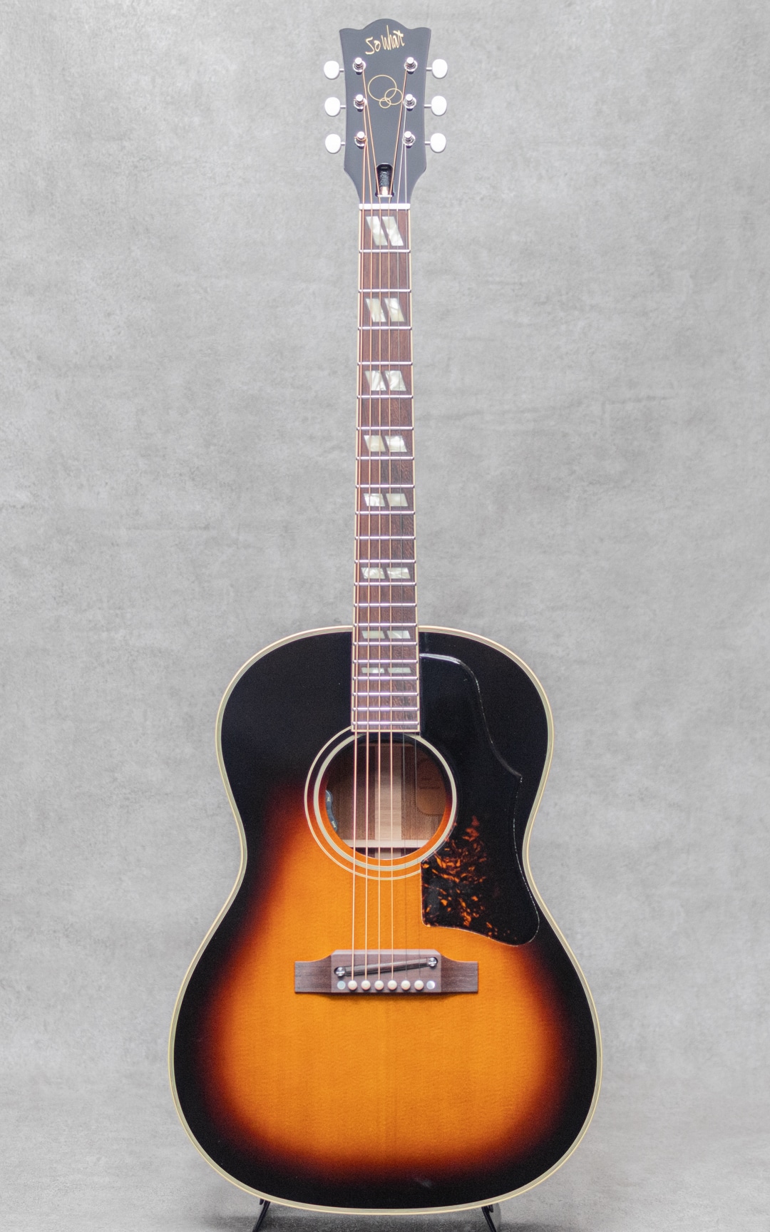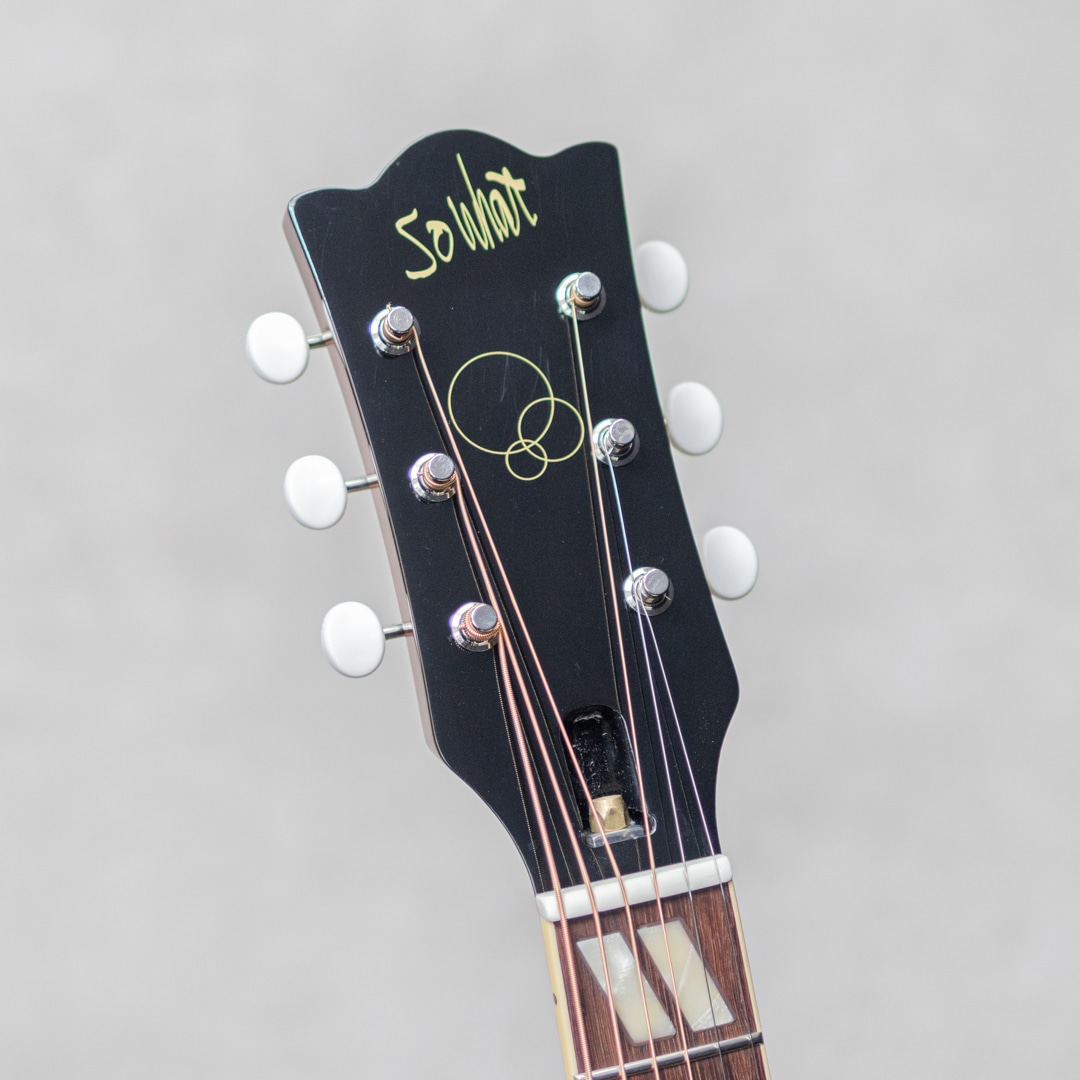 大阪に拠点を構えるリペア、製作工房"八弦小唄"。ヴィンテージショップを中心とした顧客から受ける膨大な量のリペアで得た知識と、セットアップに関する独自の解釈が反映される楽器はヴィンテージ通をも唸らせる仕上がりで知られます。そんな"八弦小唄”がプロデュースするブランド”So What”から、遊び心を隠しきれなかった小柄なアコースティックモデル”ウエスタン スモール”の登場です。ニカワ接着やマテリアルなど、こだわりの詰まった即戦力モデル。スプルーストップ、マホガニーサイド&バック、マホガニーネック、ローズウッド指板&ブリッジ、ダブルパラレログラム指板インレイ、積層バインディング、アンダーフィニッシュセルロイドラージピックガード、Gotoh製SD-90ペグ、ナット幅43mm、ノンスキャロップドXブレイシング、ニカワ接着。50年代後半にこんなモデルがあったらなぁ〜と妄想を詰め込んだ1本。アジャスタブルサドル仕様で、セラミックサドルとローズウッドサドルの2種が付属いており、サウンドと気分で換装可能です。指板ラジアスはアコギでは珍しく305R(約12.0")-350R(約13.8")のコンパウンドラジアスを採用。またコンタクトピエゾタイプのL.R.Baggs Hi-Fiを搭載しており、お部屋で爪弾くのはもちろん、ライブからレコーディングまで幅広く活用いただけます。しっかりと輪郭を帯びるドライでパーカッシブな響き。倍音をしっかりとまといながらラウドな響きからノスタルジックな響きまで、幅広くプレイを彩ってくれます。カラーラインナップは本器のサンバーストの他に、ブラスパウダーを使用した本格的なゴールドトップ、ネック&ボディトップ&バックを統一カラーにしたピンクゴールドの3カラーをラインナップ。遊び心あふれる本気のラインナップになっています。ルックスはもちろん、ポテンシャルも高い本気の小柄なアメリカンスタイルアコースティックモデル。是非お手元でご活用ください。オリジナルソフトケースが付属します。
